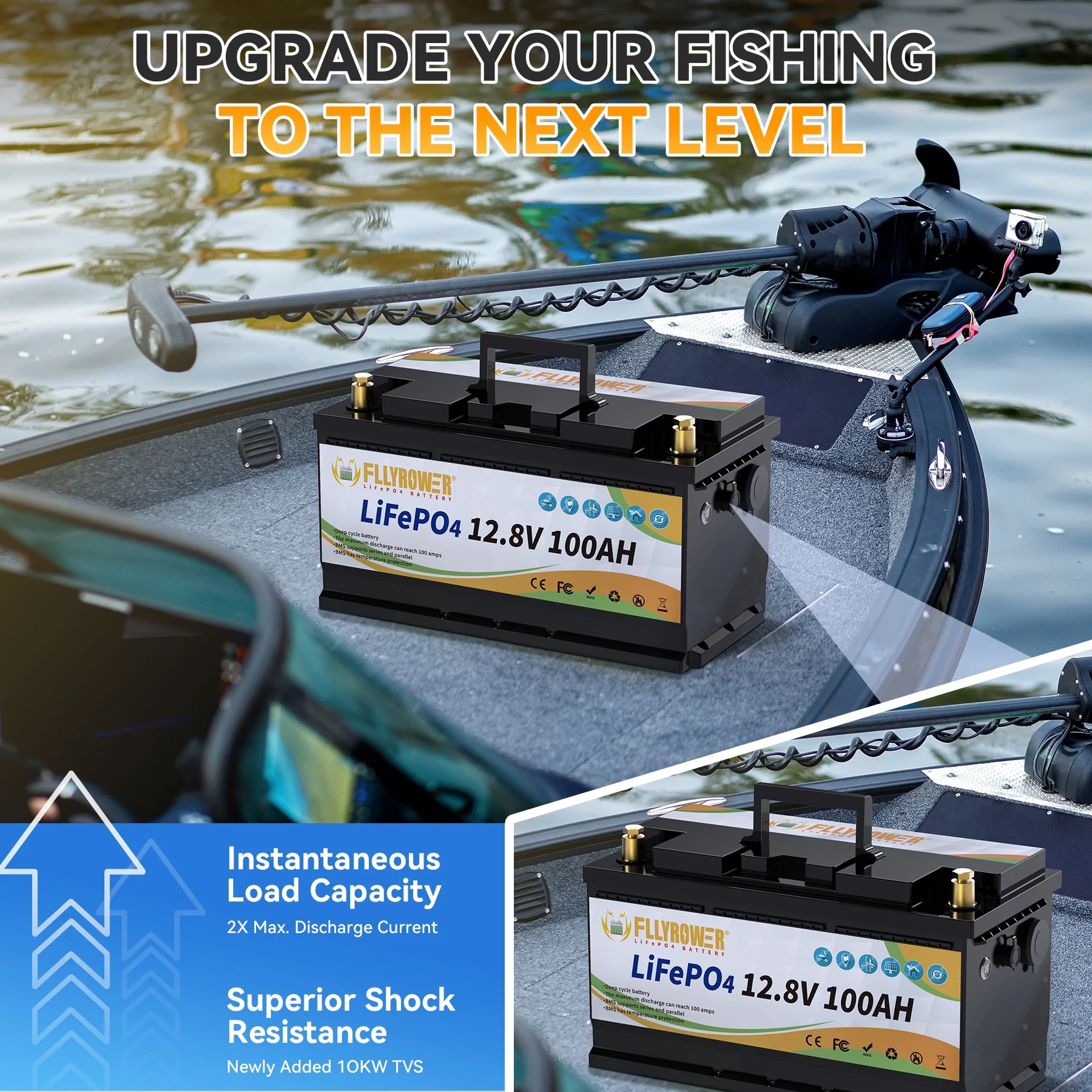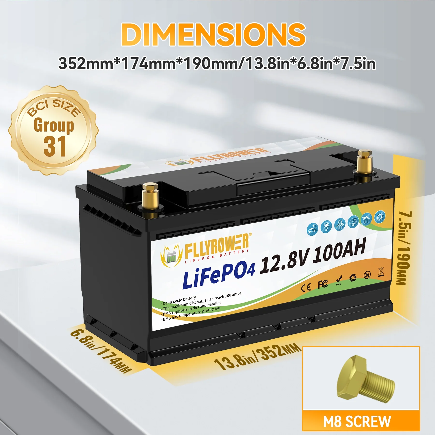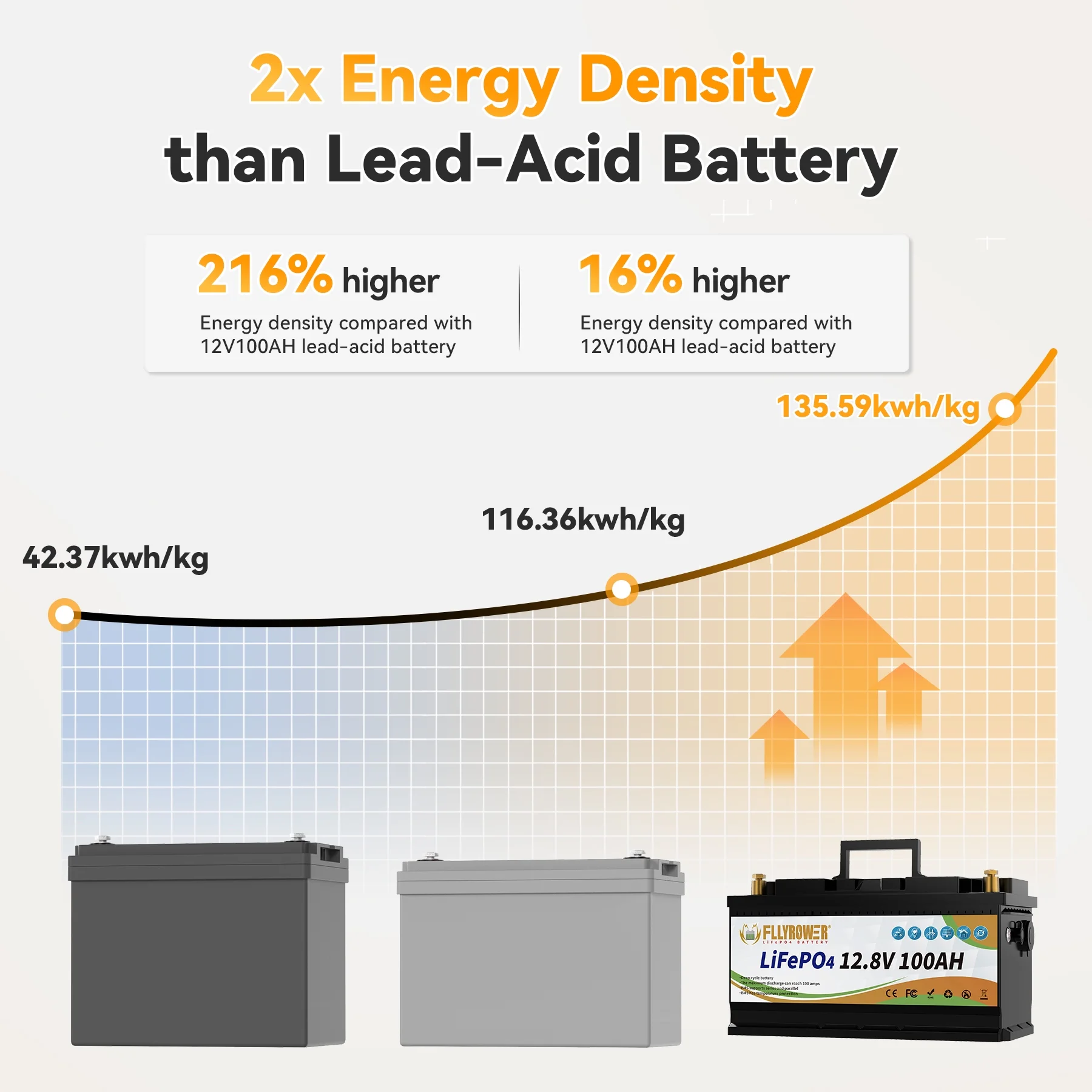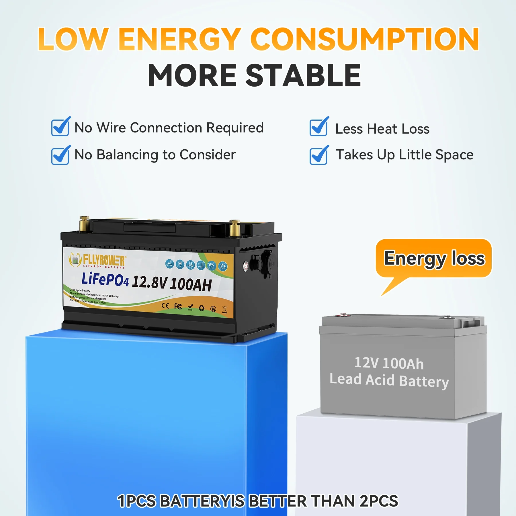 - ��Deep Cycles Battery ��FLLYROWER 12.8V 100AH LiFePO4 battery uses Grade A LiFePO4 Cells, which gets low self discharge rate and provides 5000~15000 cycles and 10-year lifetime. while the lead acid batteries with only 200~500 cycles & 3-year lifetime. and lifepo4 battery is more eco-friendly than lead acid batteries.