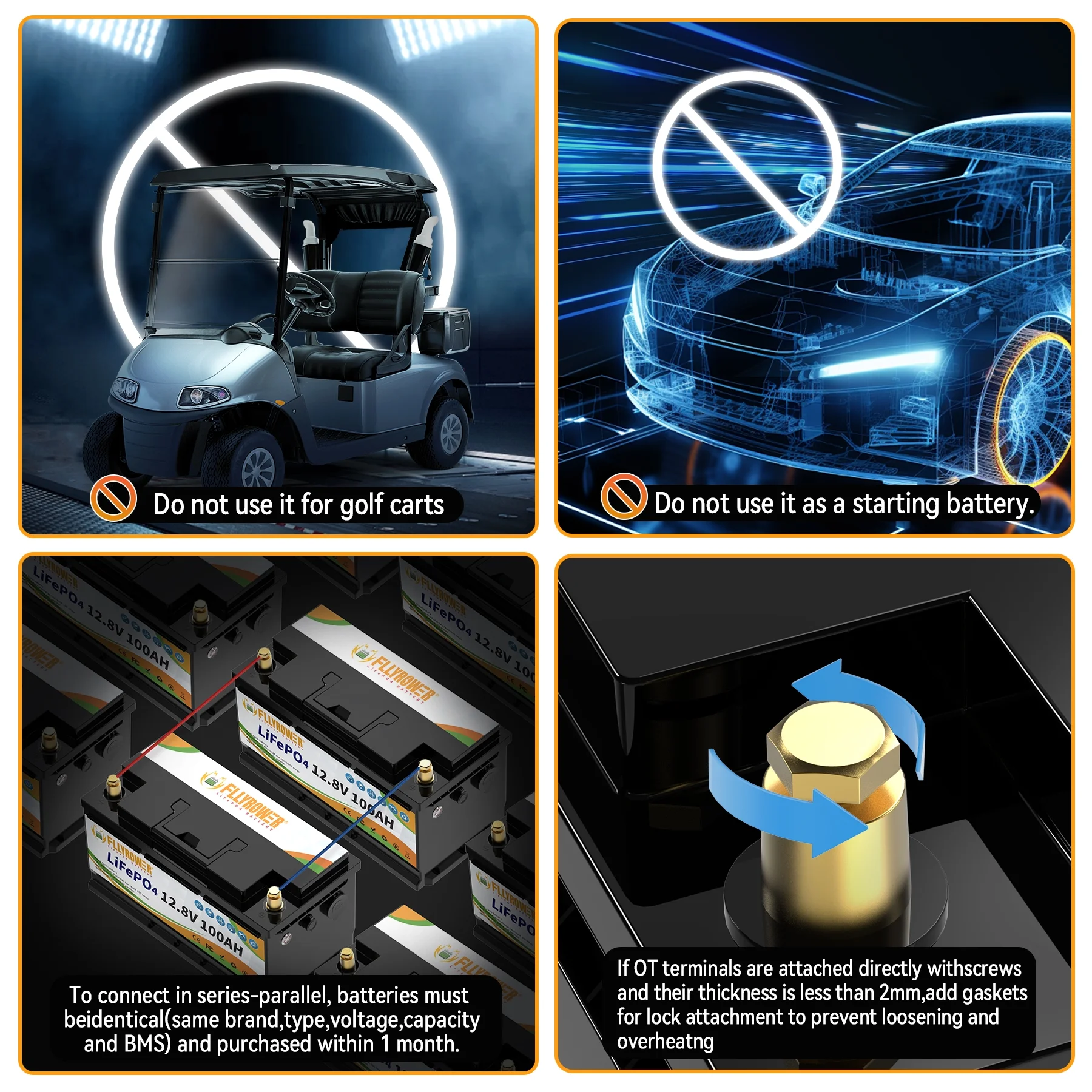 - Note: The LiFePO4 battery is intended for use as an energy storage purpose, Please do not use this battery as starting batteries, golf cart batteries, or jacks. Voltage And Current May Deviate By 1%~5%. Charge/Discharge Battery Once Every 6 Months To Prevent Damage From Disuse.Please Feel Free To Contact Us If You Encounter Any Problems During Use.