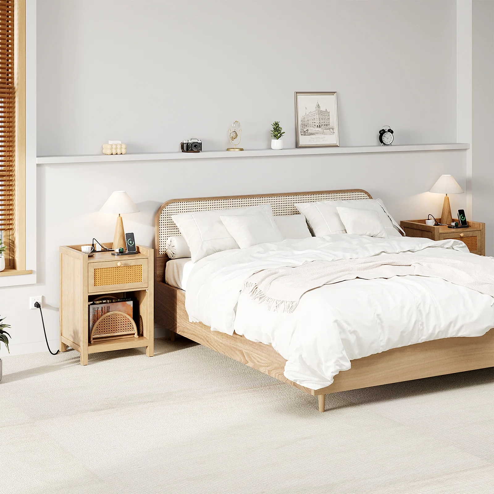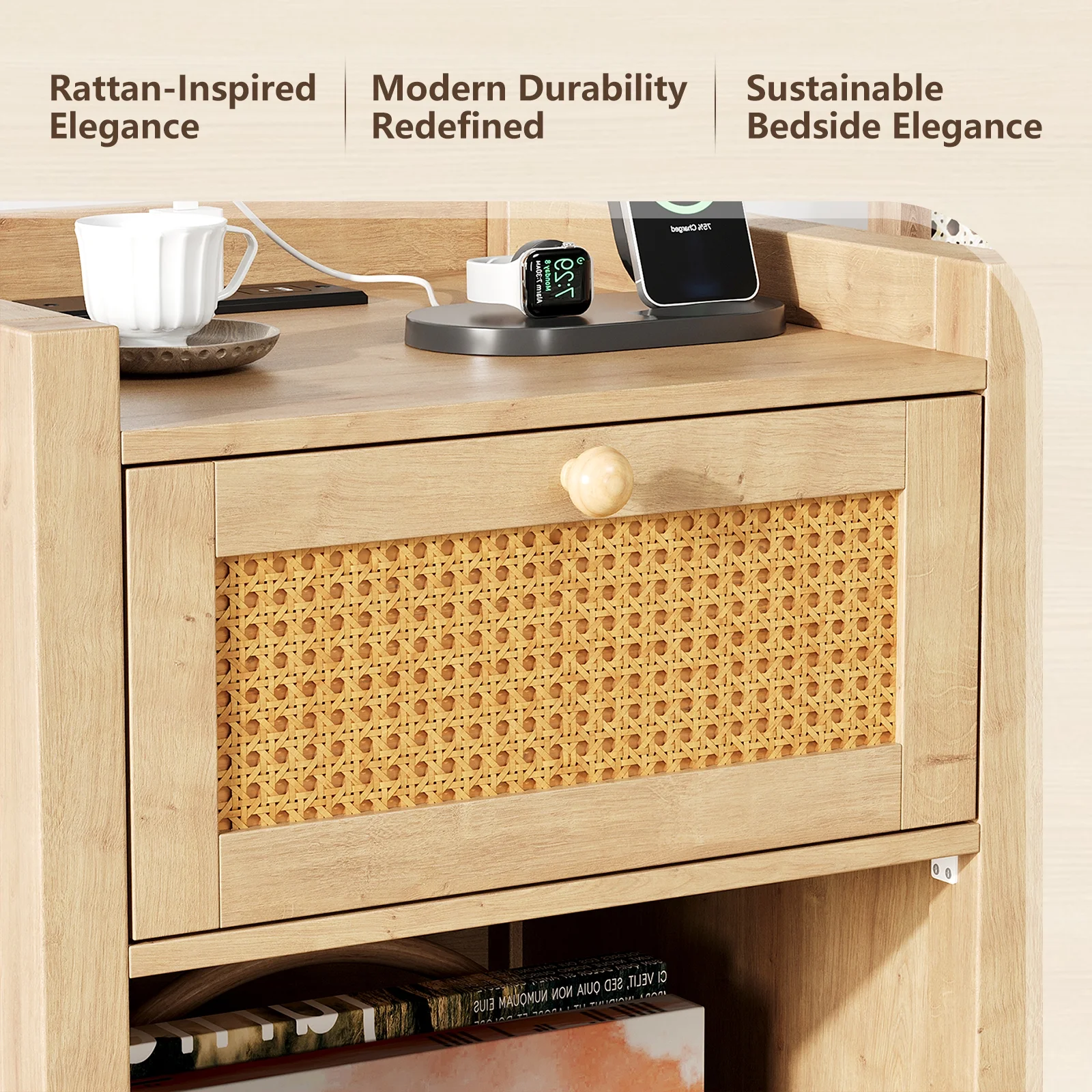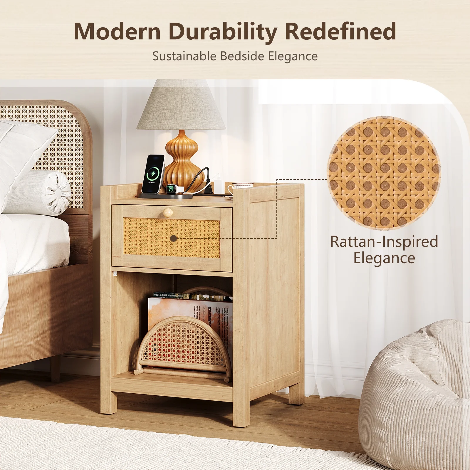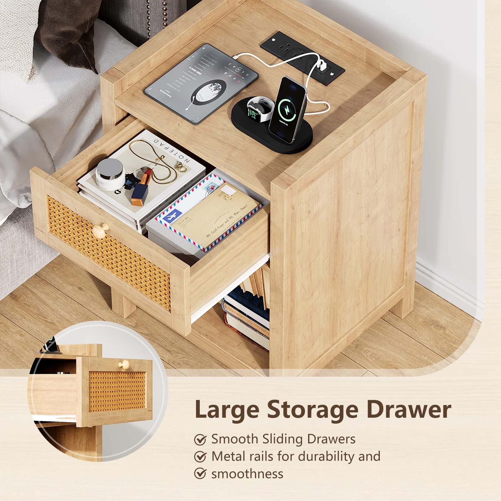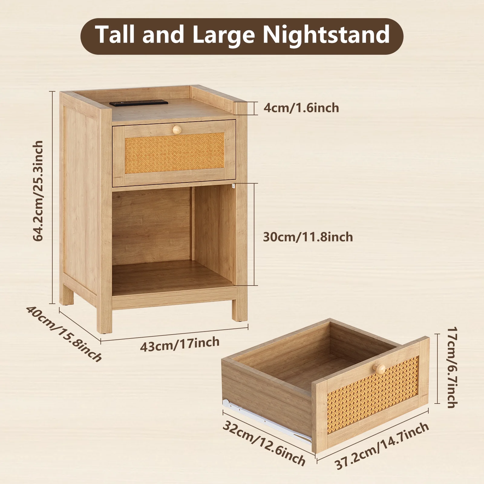 LGHM Rattan Nightstand Set of 2 with Charging Station, Farmhouse Bedside Tables Night Stands with Drawer, Boho Side Tables for Bedroom, Living Room