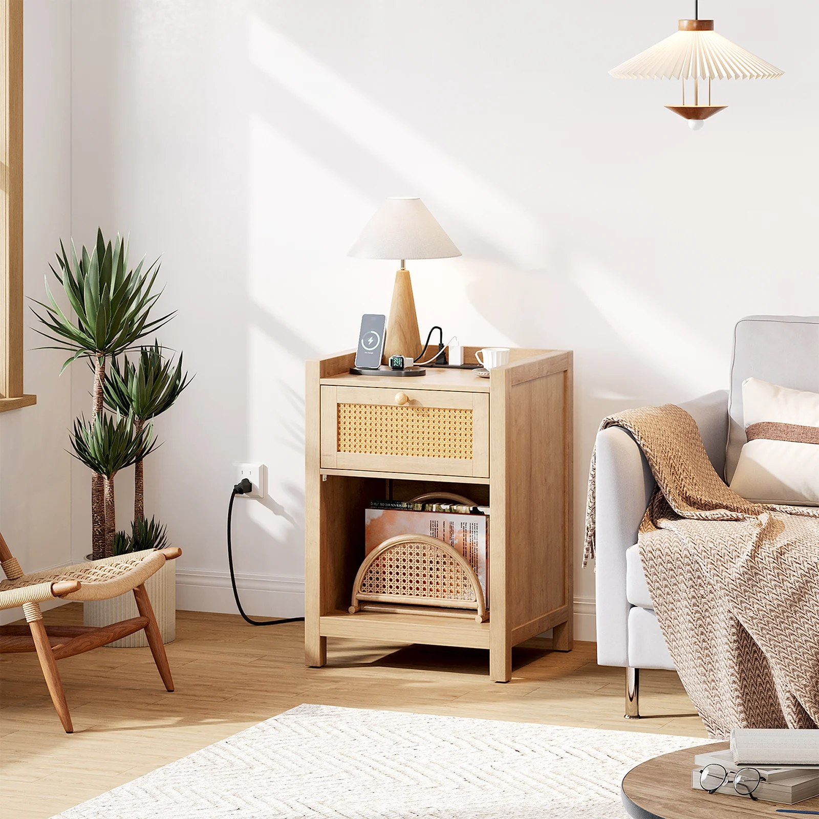 The chest of drawers provides a comfortable height to place lamps, books, cell phones within arm��s reach. The drawer can glide out mostly, fits normally folded shirts into it, also you can stack jeans and socks, keep them neat and tidy. Rattan patterns made from plastic, not real rattan, there will be no worry about insects and molds.The combination of the drawer and open shelf ensures convenient and secure storage, allowing for easy access to items while keeping them safe from children and pets. Plus, with the built-in charging station, you can easily charge your devices overnight without having to worry about messy cords or tangled wires.This versatile bedside table is not only perfect as a bedside table in bedrooms but also serves as an ideal end table in living rooms.