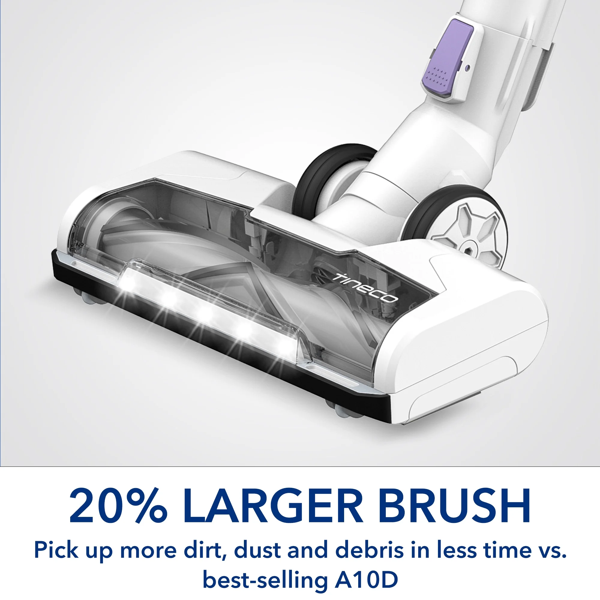 - Maneuverability: Lightweight and easy to handle, it navigates tight corners and different surfaces with powerful, consistent suction. Enhanced Cleaning Experience: Includes a built-in trigger lock for extended cleaning sessions and an Edge-Guard front bumper to protect furniture while cleaning. Effective Filtration System: The 4-stage fully sealed filtration system purifies the air, capturing 99.9% of allergens, for a cleaner home environment. Available at Walmart: Experience the next level of clean with Tineco A10-D Plus, where powerful performance meets practical design.
