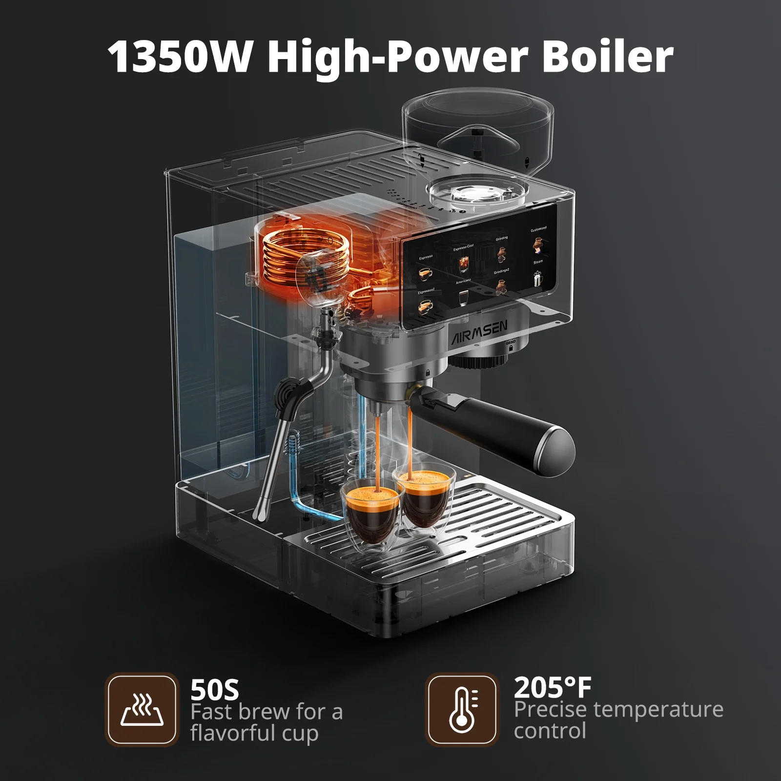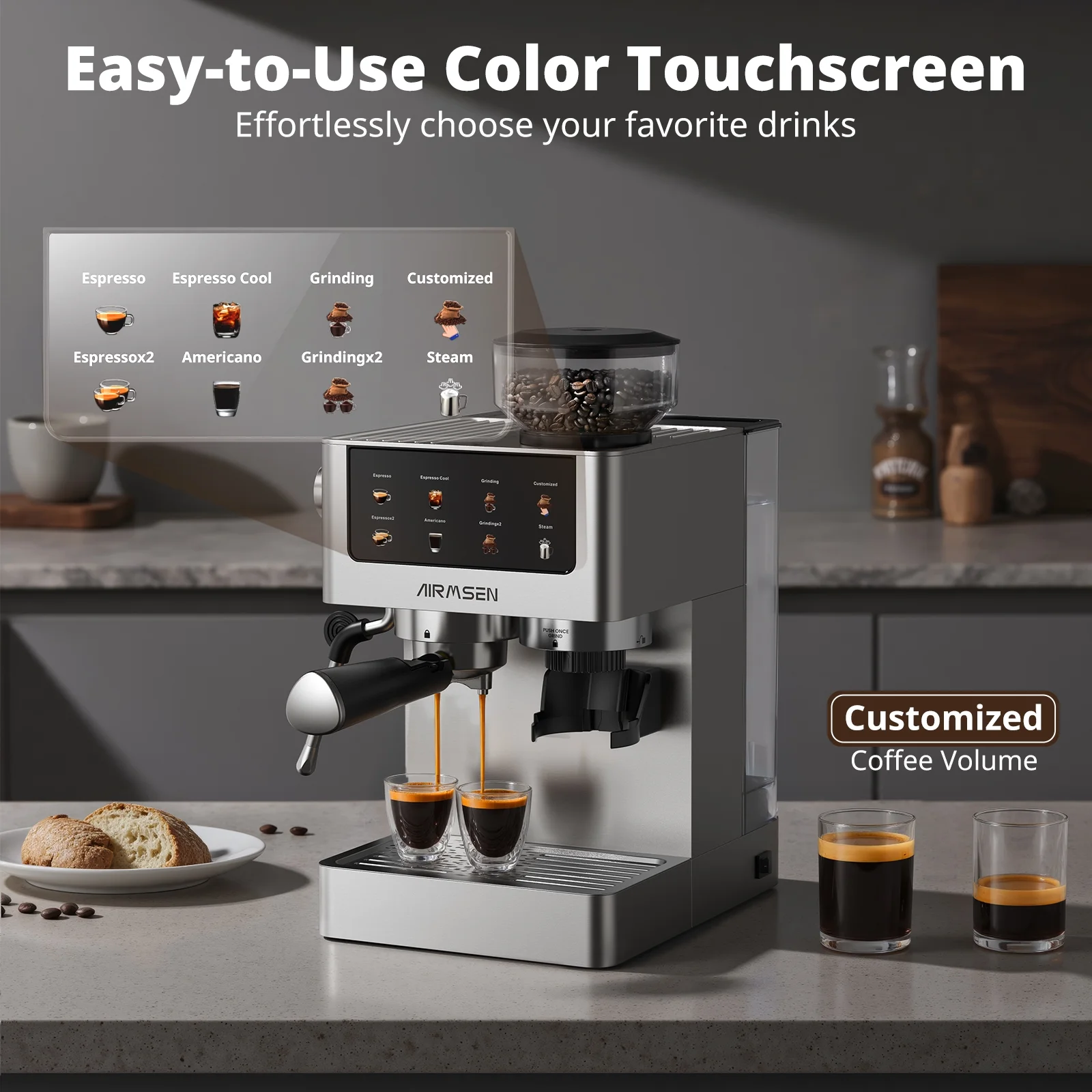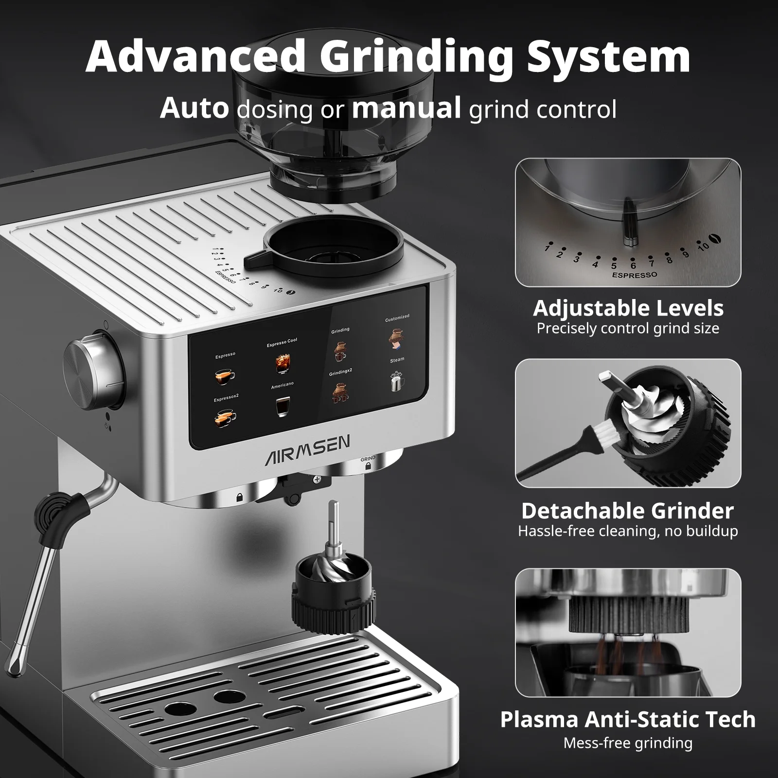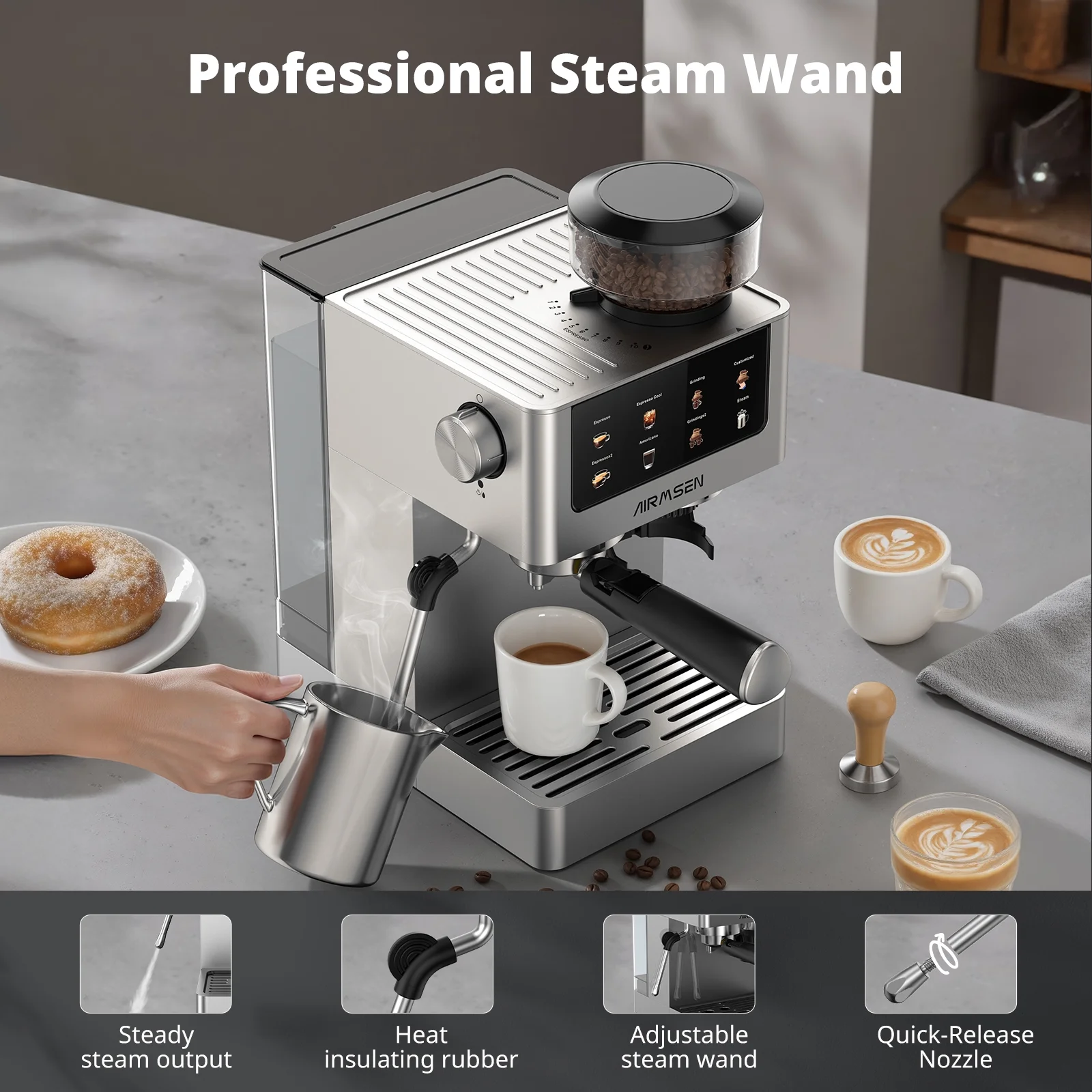 AIRMSEN Espresso Machine with Grinder, Espresso Coffee Machine with Customized Grind Amount & Coffee Volume, Cold Brew Coffee Maker for Cappuccino Latte Americano, Brushed Stainless Steel
