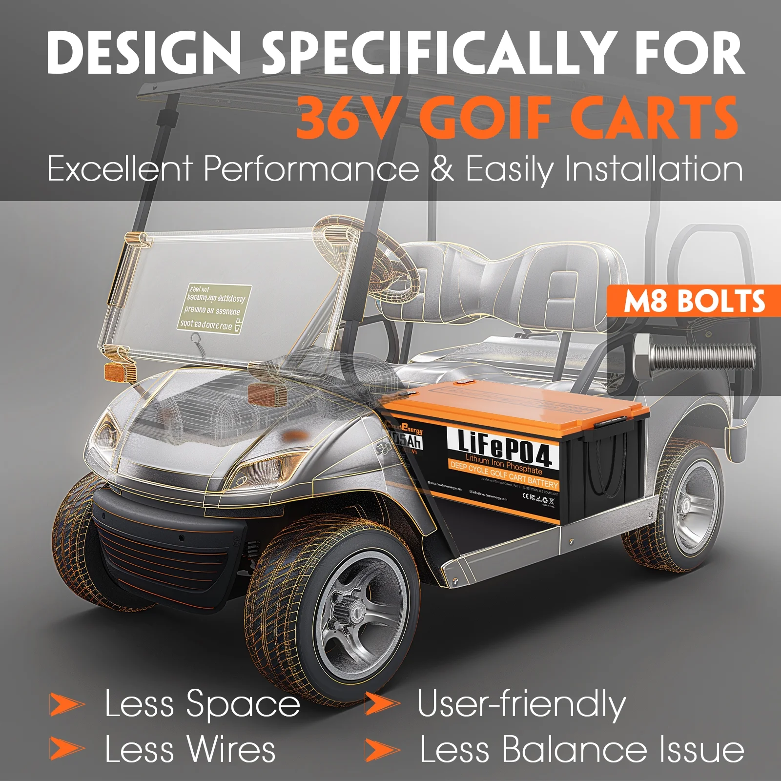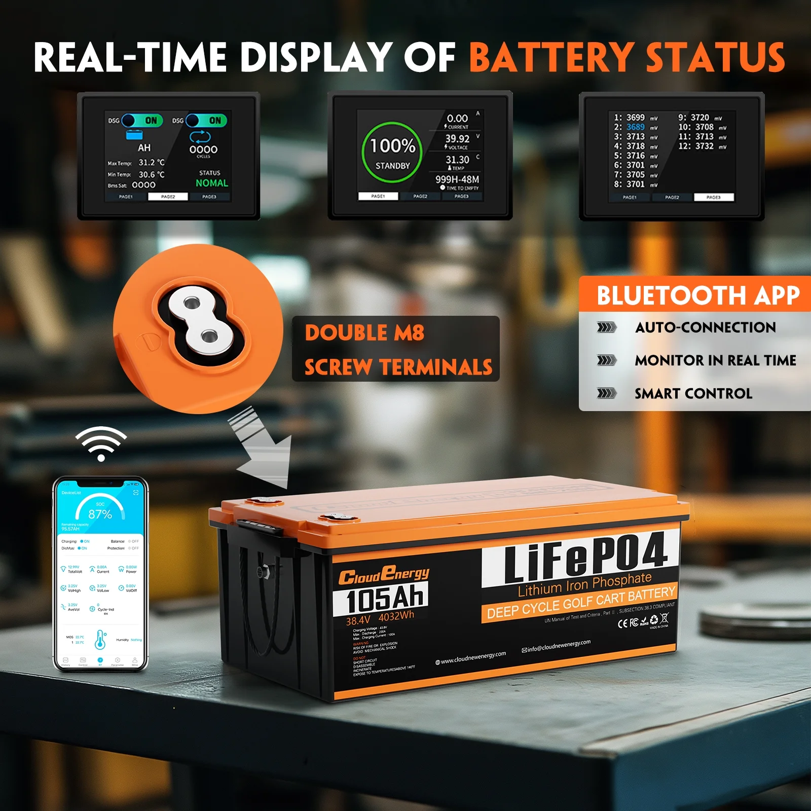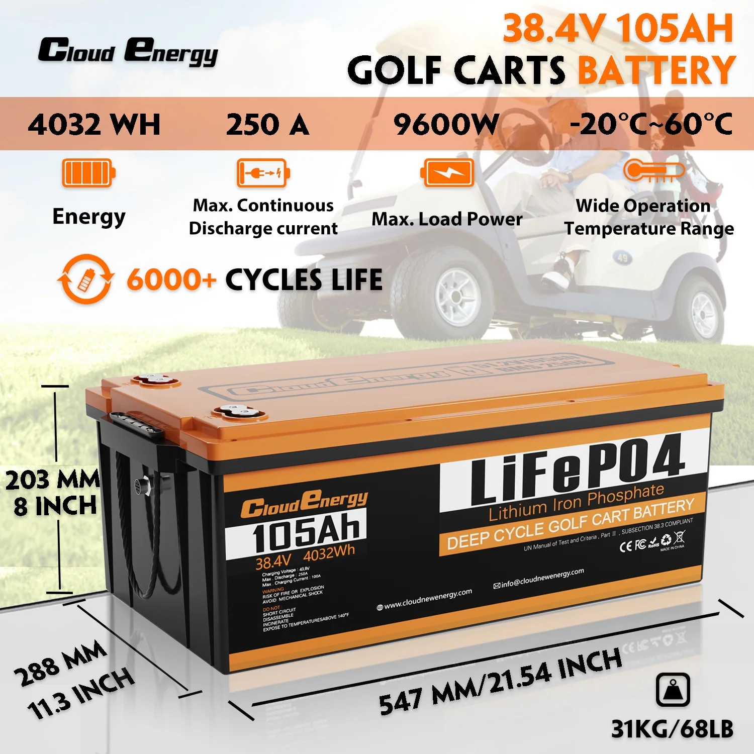 - ��4-in-1 Package��Cloudenergy 36V (38.4V) 105Ah Lithium Ion Golf Cart Battery comes with everything in the kit! Comes with a high performance 43.8V 20A Li-Ion fast charger, a 2.8-inch LCD touch screen with screen holder, charger extension cable and a 78.74-inch battery mounting strap to make battery installation easier and safer!