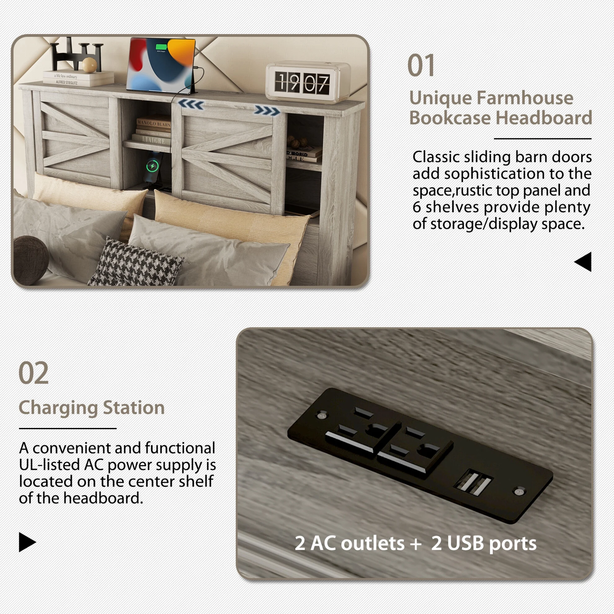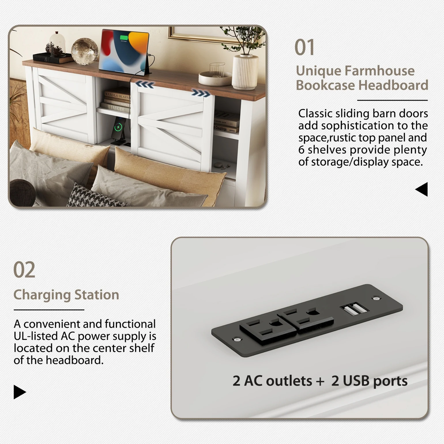 - ??��Smart Headboard with Charging Station��??The upholstered headboard features a built-in charging station with AC outlets and USB ports, allowing you to power devices right from bed. Dual sliding doors reveal hidden storage compartments, ideal for stashing books, glasses, or remotes to keep surfaces tidy.