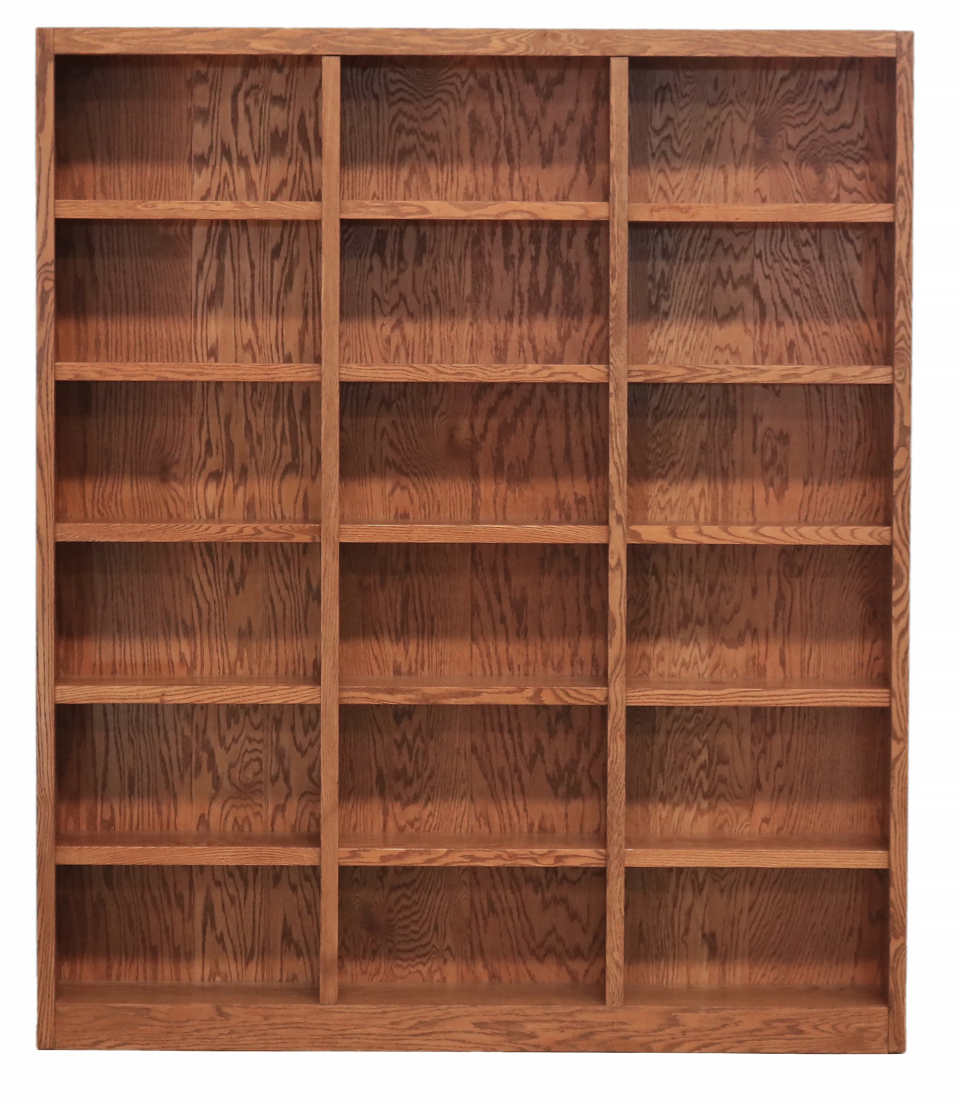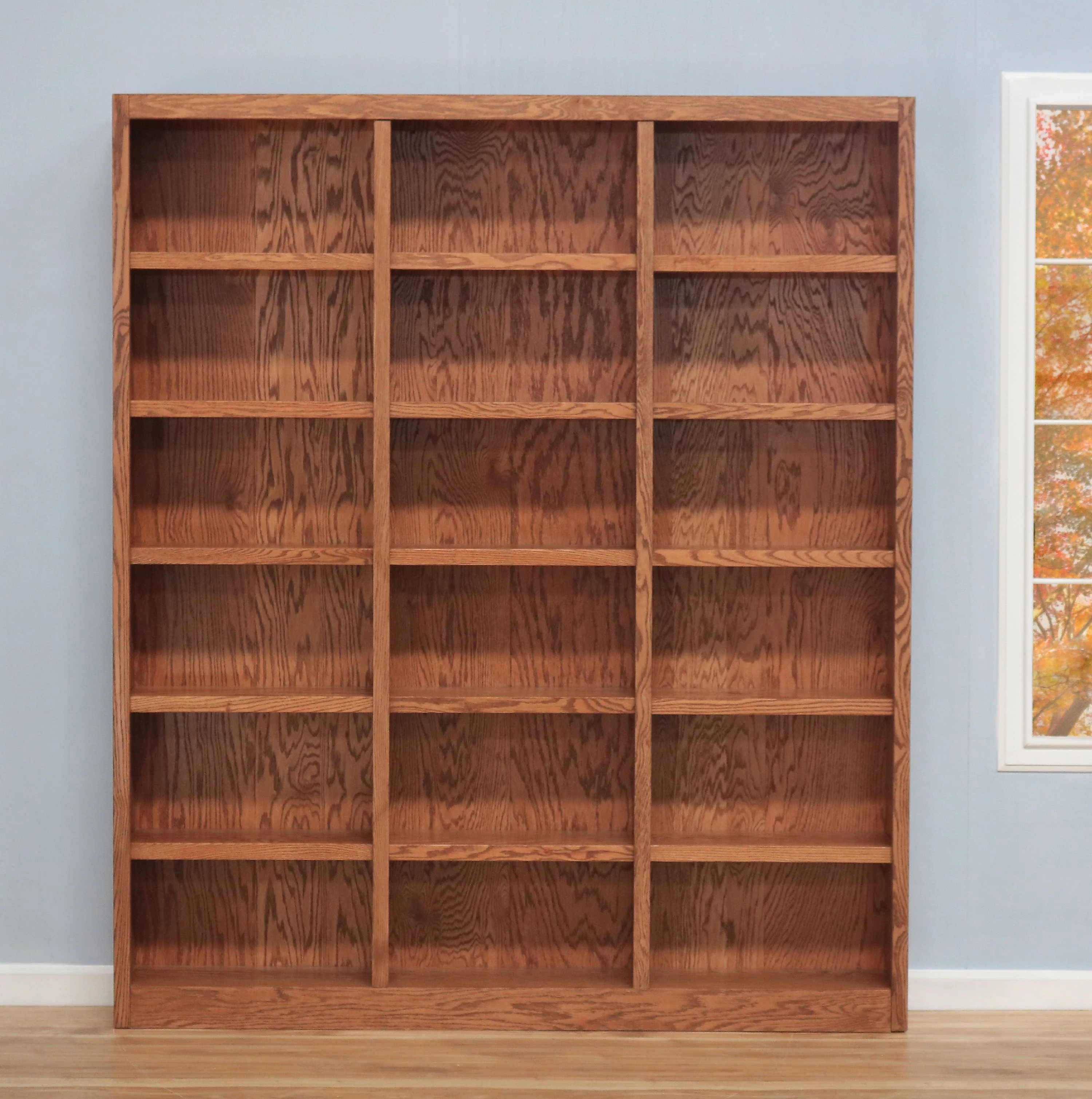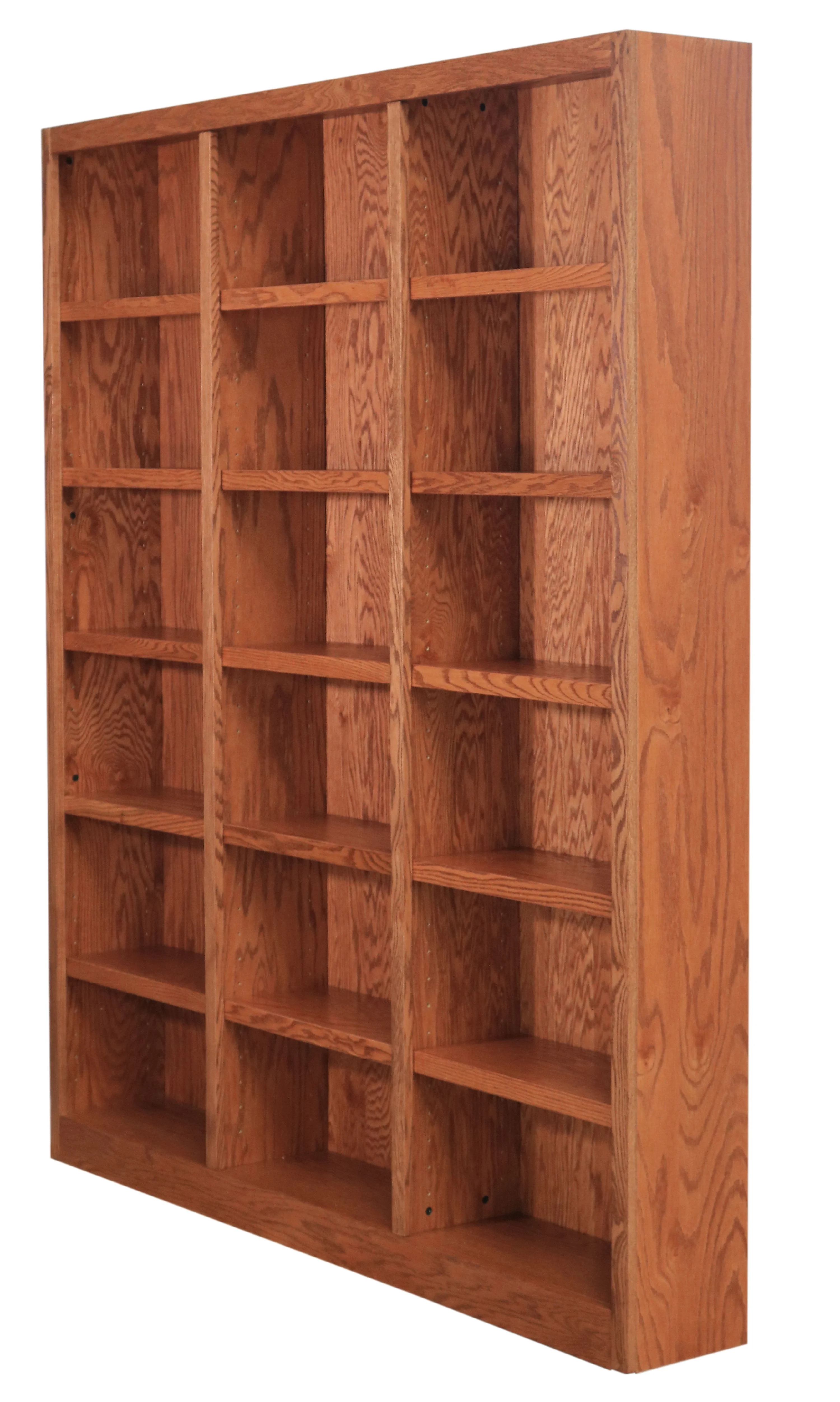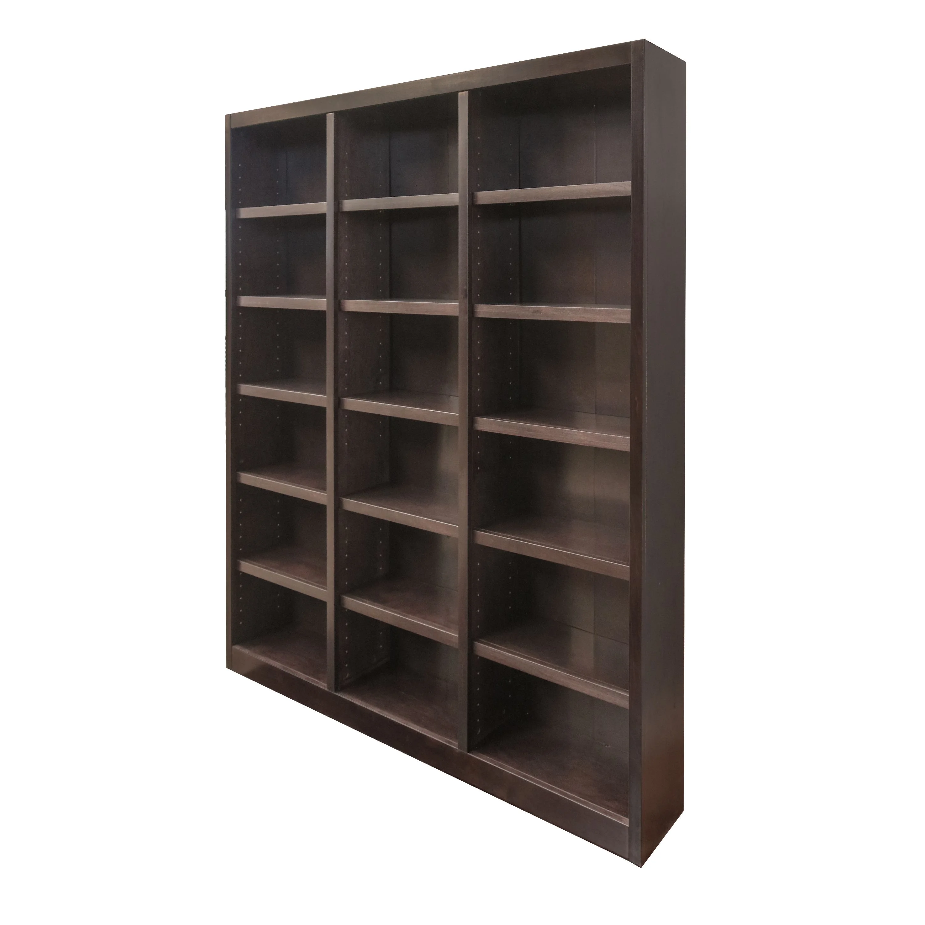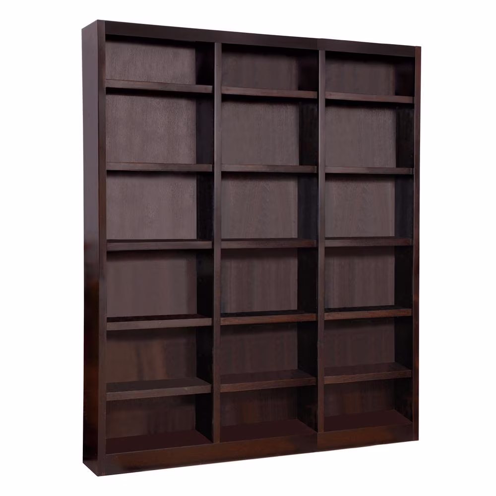 The Concepts in Wood 18 shelf triple wide Bookcase has a beautiful 10 step finish on wood veneer that really sets this bookshelf apart from the rest and utilizes an environmentally friendly zero VOC emissions finish process. This is a piece of furniture using solid wood trim pieces and wood veneer panels versus all the paper laminate varieties out there. Very durable with 70lb. weight capacity per shelf. 15 adjustable shelves allow you to customize the storage space to accommodate a variety of book sizes and 3 fixed shelves provide structural reinforcement. A dowel and cam lock assembly design ensures a strong durable bookcase. Wood elements are sourced in the USA and assembled in Mexico. This versatile storage bookcase is ideal for home or office use, laundry, bedroom, kitchen, garage or any other room. Ready for assembly.
