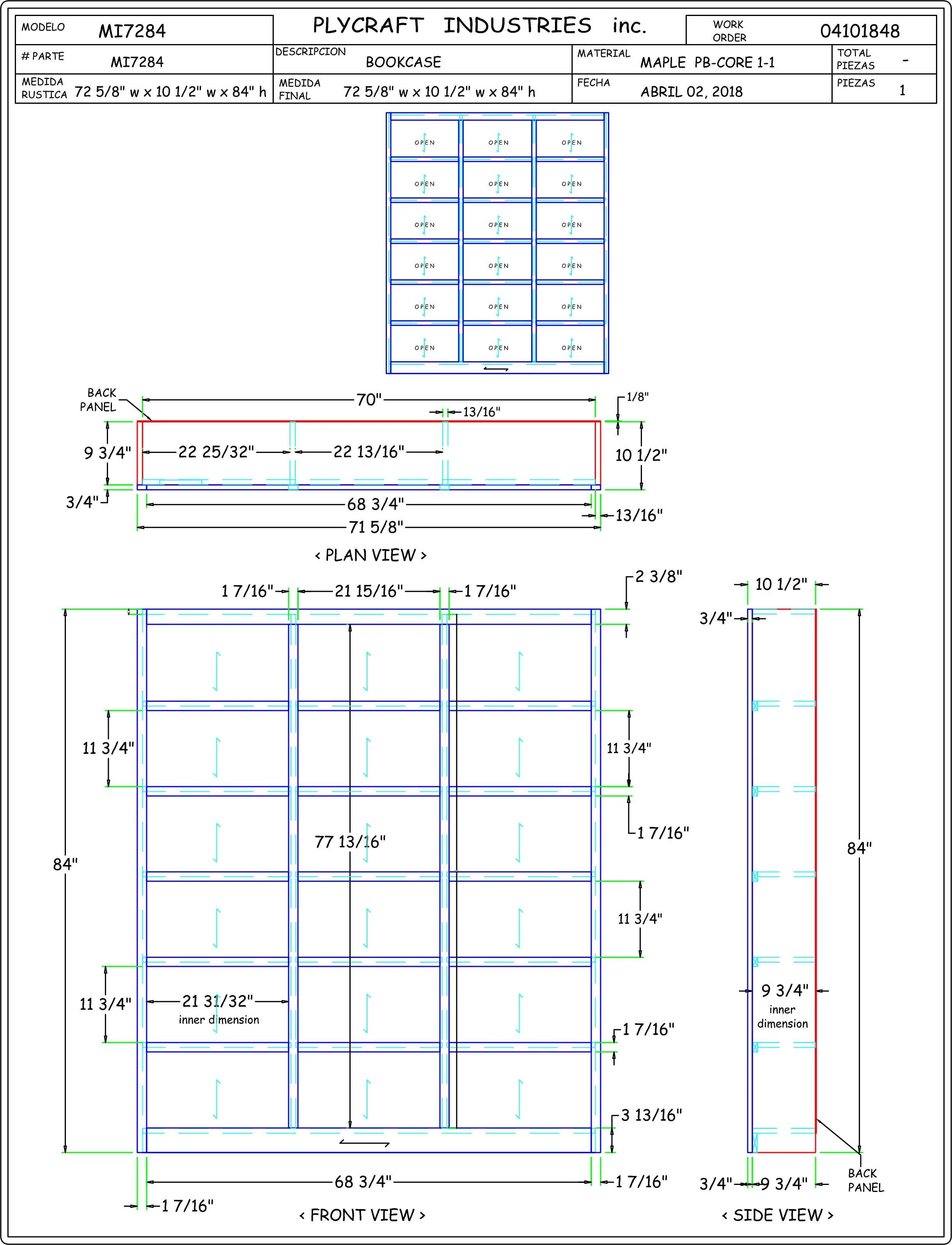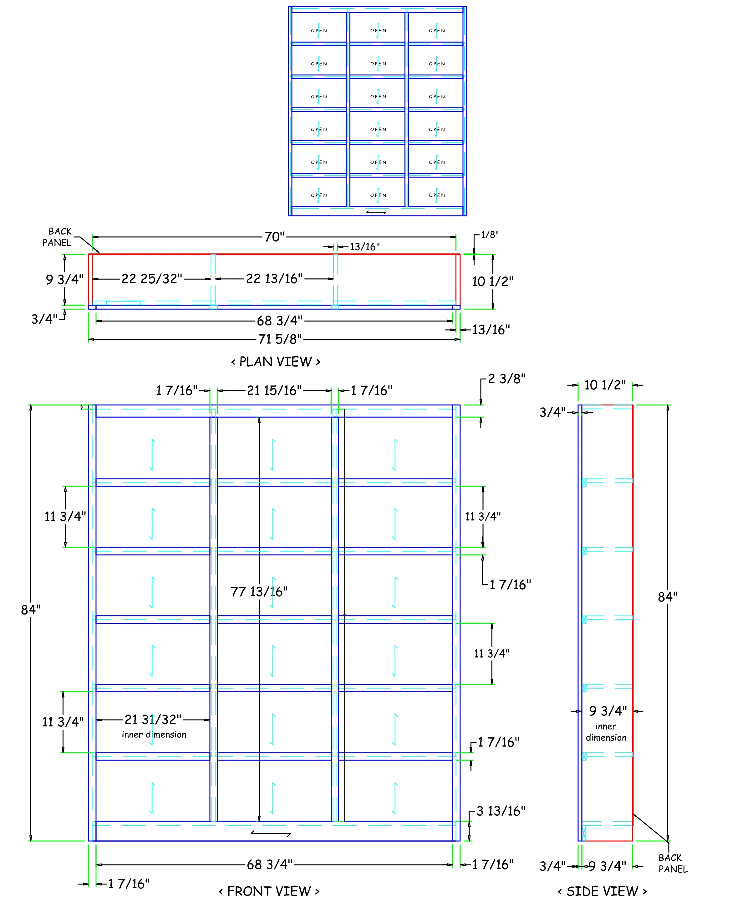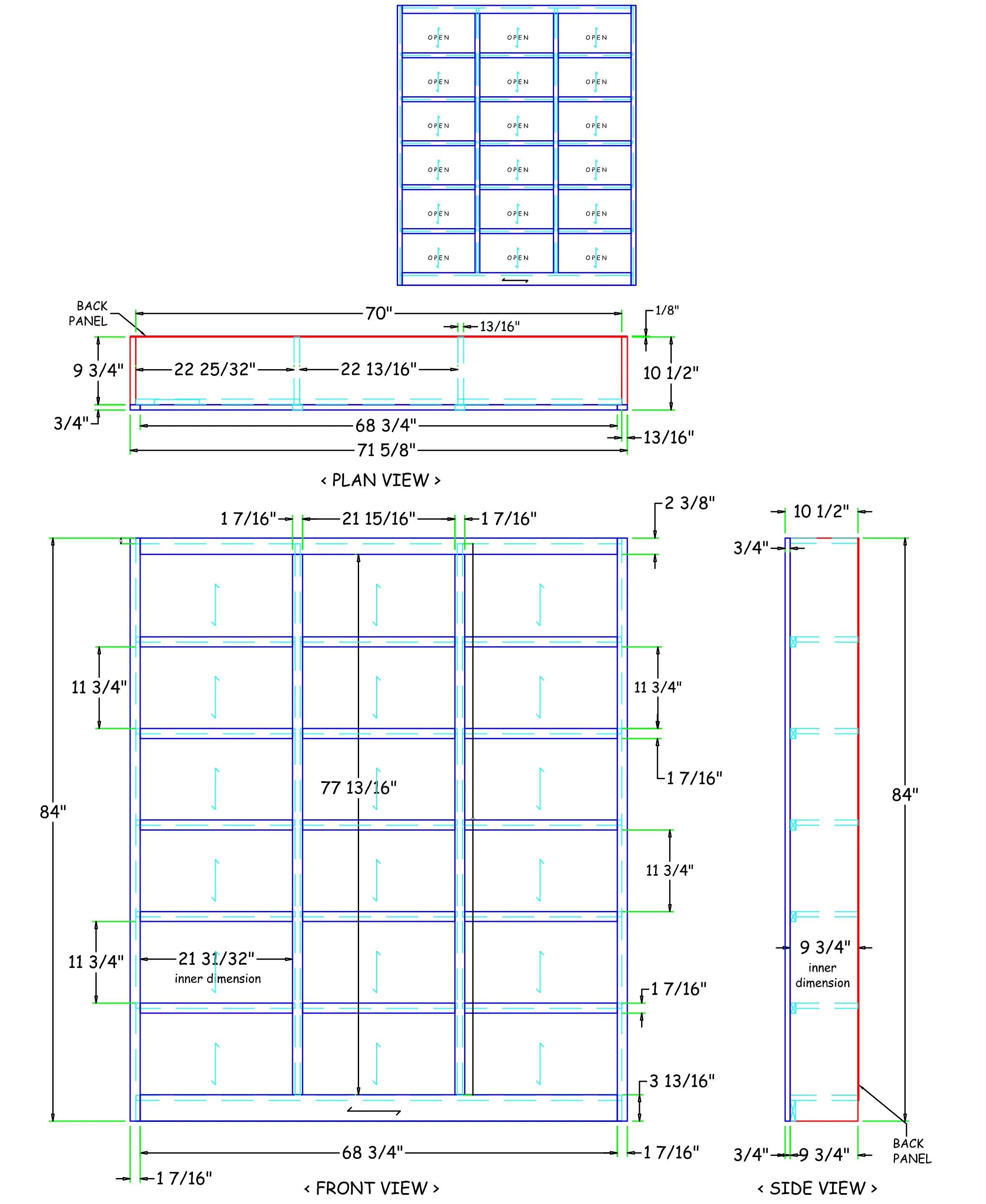 - 15 adjustable shelves to allow for maximum storage, 3 fixed shelves, Dimensions: 84" H x 72" W x 10.625" D