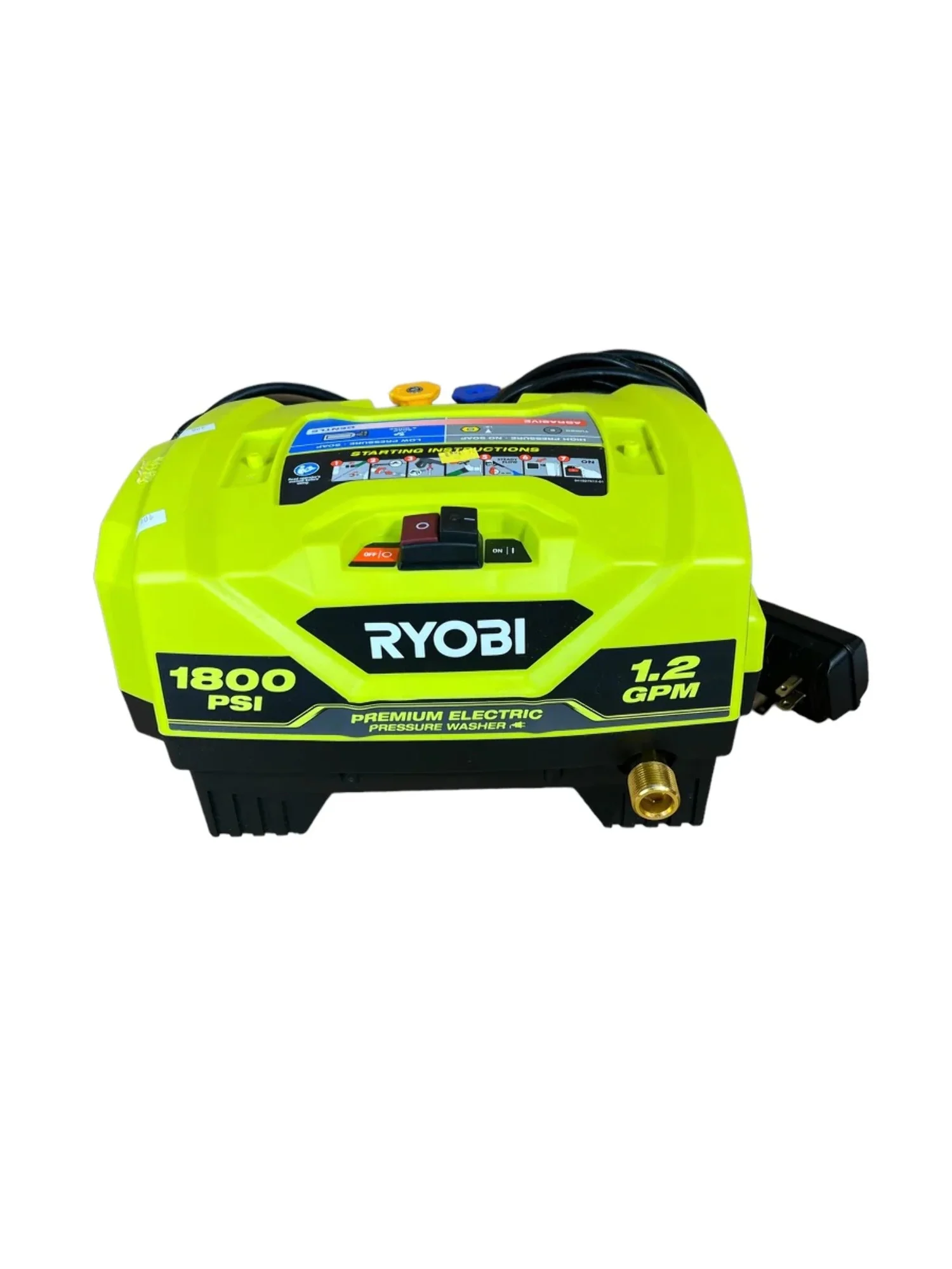 The RYOBI 1800 PSI 1.2 GPM Electric Pressure Washer is the perfect powerful yet portable option to get the job done. This pressure washer is ideal for light duty applications like cleaning small driveways, sidewalks, decks, windows, patio furniture, campers, bikes, boats, and many other recreational applications. This unit comes with a 15�� nozzle and turbo nozzle, which cleans up to 50% faster than a standard nozzle. Not only is the pressure washer lightweight and portable, but the included 20 ft. ultra flex hose is 50% lighter, reducing fatigue and allowing for easy maneuverability. Attach the soap applicator for a deeper clean when detergent is needed on tough messes. The spray wand and nozzles use 1/4" quick-connect. The compact design allows for convenient storage in smaller spaces.
