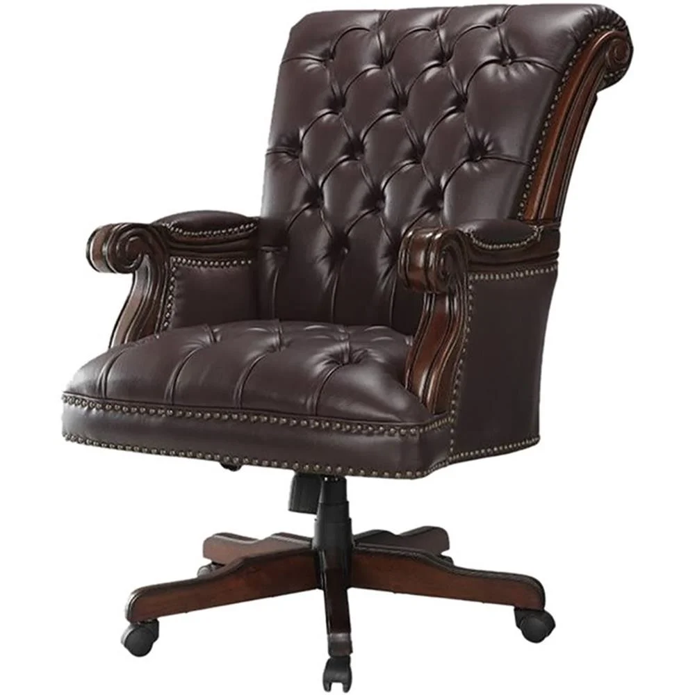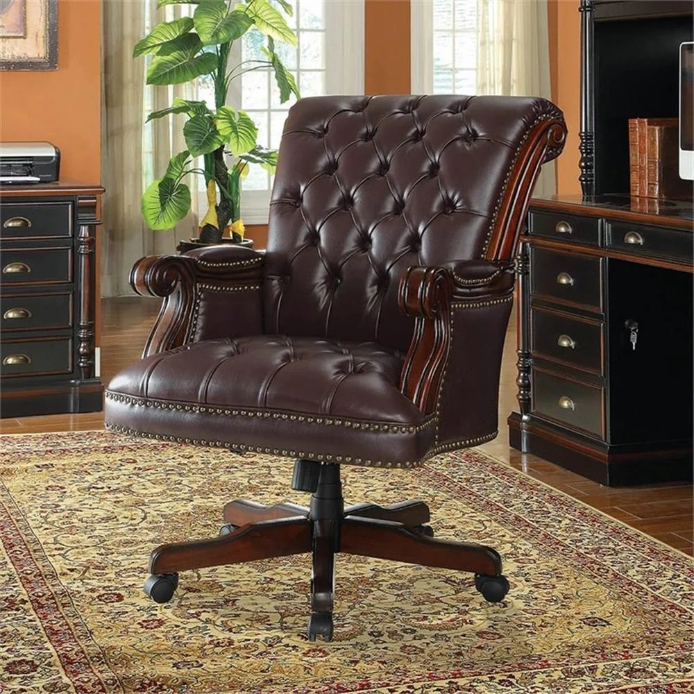 Supreme elegance makes a home or business office a royal setting. This delectable office chair is built for pleasure and style, as well as ergonomic excellence. Upholstered in dark brown leatherette, its care is simple. Embrace design upgrades including carved solid wood detailing, tufting on its seat and seat back, and ornate rolled edges and arms. A wooden caster wheel base and adjustable seating finish a list of desirable features.
