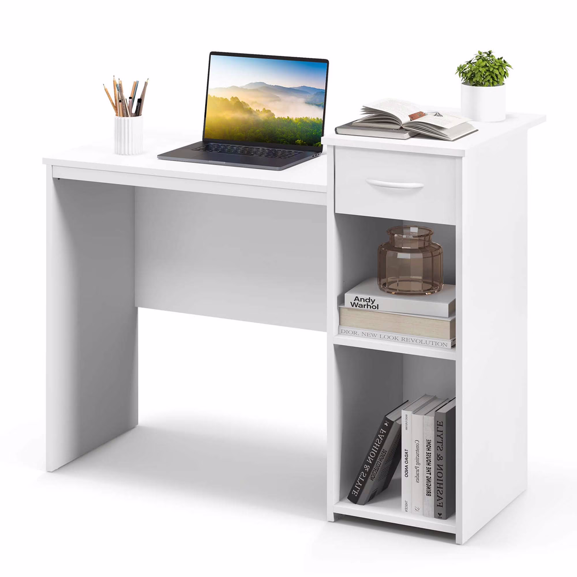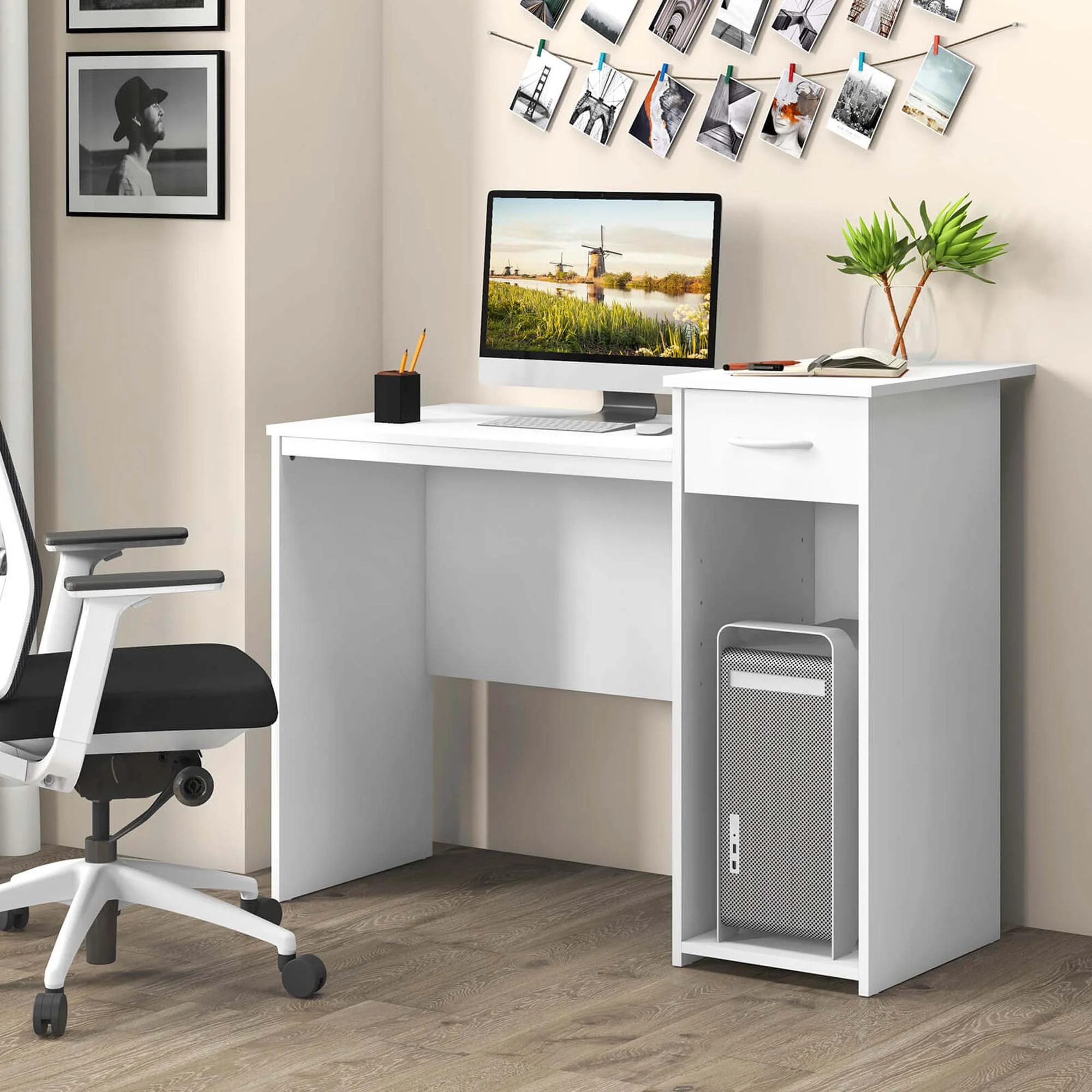 Featuring a wide tabletop and slide-out drawer, this laptop PC desk is designed to meet all of your workspace needs. Moreover, the adjustable shelf can be tailored to fit your unique storage needs, providing customized storage space for various items. The cable management hole is also a user-friendly element that is sure to impress, which is superior to others without back panels and without cable management hole. The study desk has a sturdy construction that ensures reliable support and long-lasting use. The computer desk offers versatile functionality for both work and leisure activities, making it a practical addition to any home or office space.
