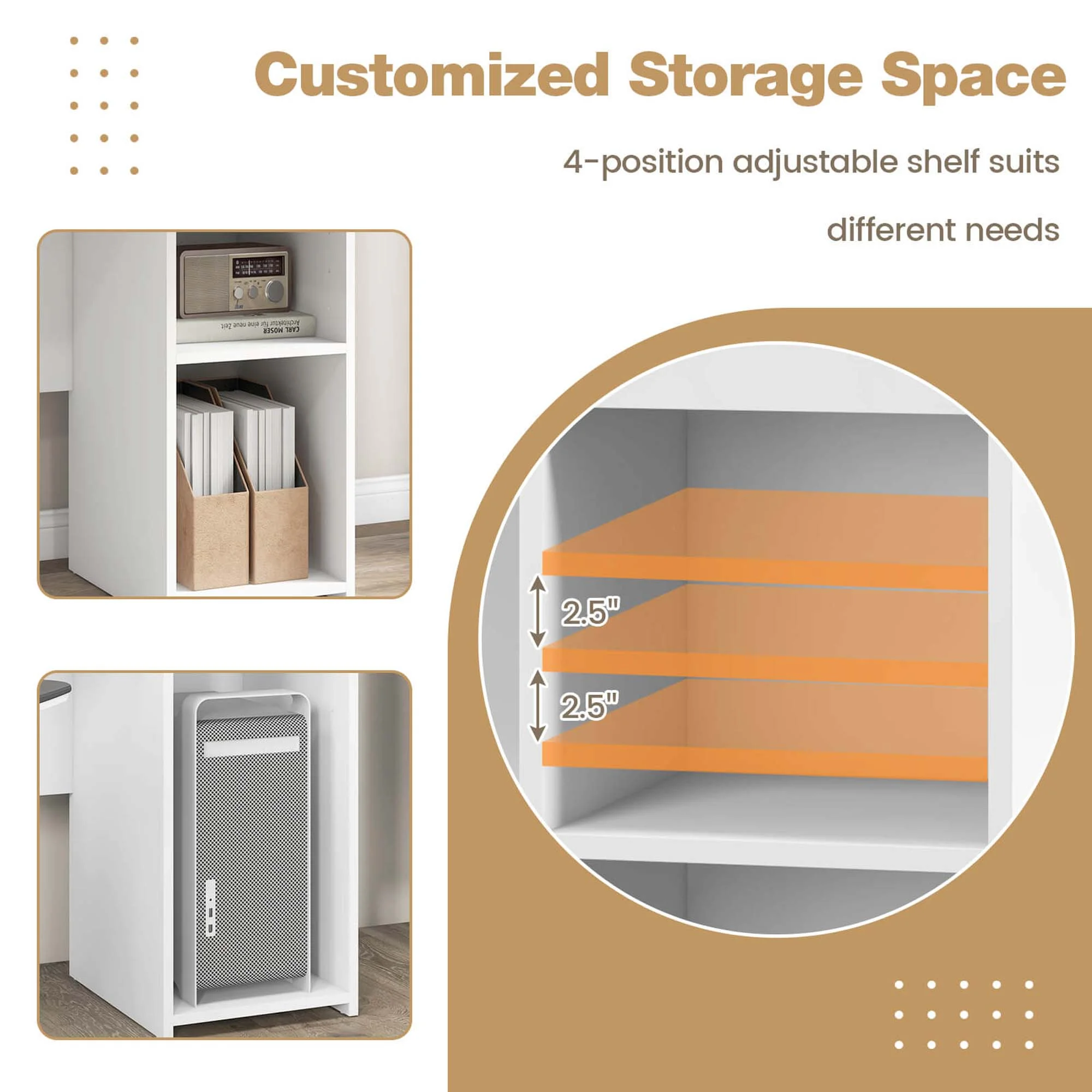 - Adjustable Shelf: This laptop PC desk offers versatility with its 4-position adjustable shelf, allowing you to customize the storage space to suit your needs. Additionally, you can adjust or remove the shelf to create a larger partition for a computer tower.