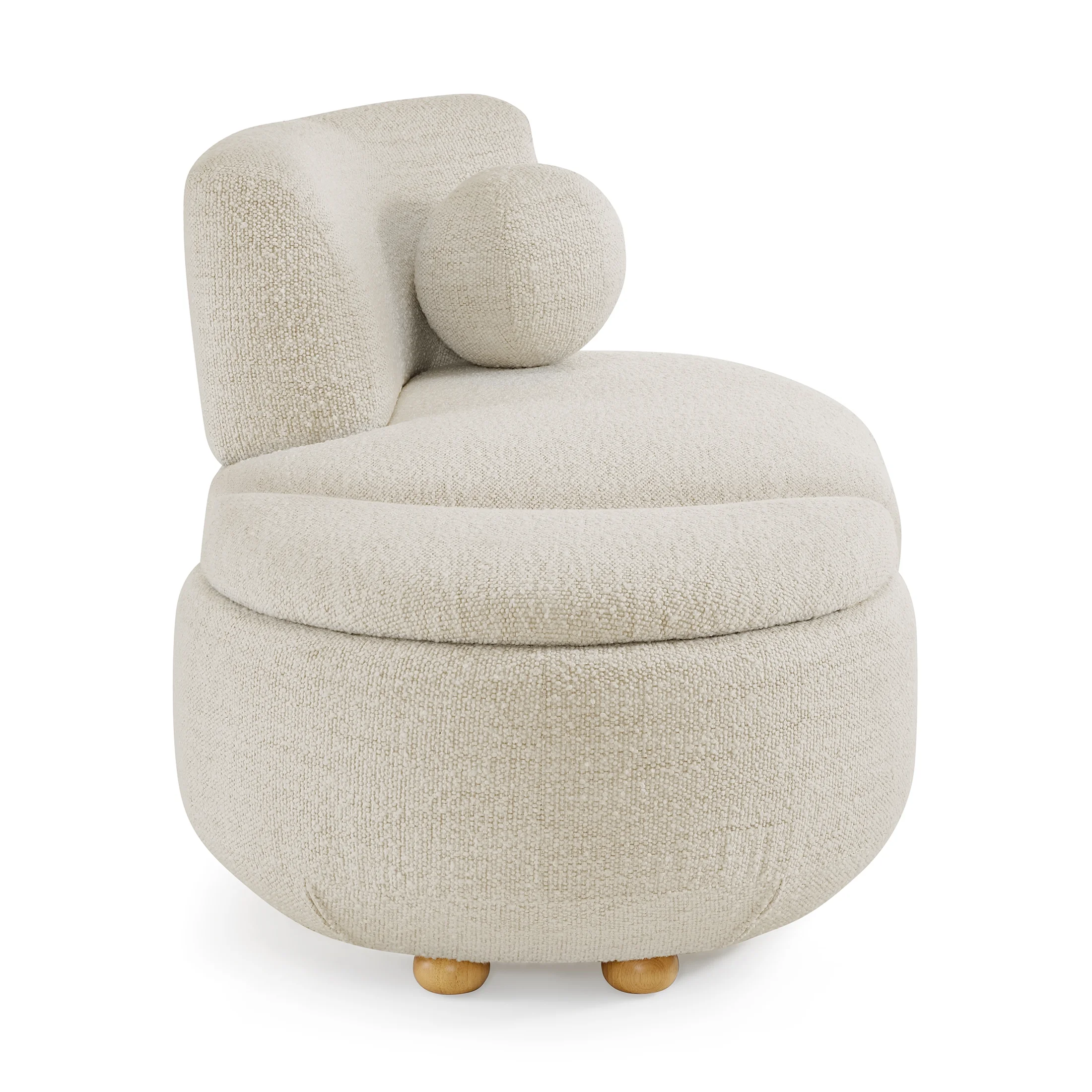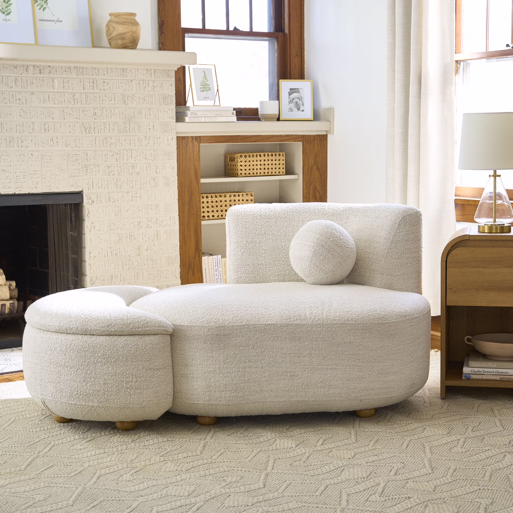 The Better Homes & Gardens Juliet Modern Boucle Chaise & Storage Ottoman set in Pearl Boucle is a fusion of style, comfort, and functionality. This elegant, contemporary chaise lounge and ottoman set is designed to cater to your relaxation needs while adding a touch of sophistication to your living space. Crafted with a sturdy, hardwood frame and draped in a plush, ivory boucle upholstery, the Juliet living room chaise provides a luxurious lounging experience. The fabric chaise features a sleek, curved design that contours to your body, along with a matching crescent moon shaped ottoman for added comfort. The ottoman is versatile, serving as a footrest, additional seating, or even as a makeshift coffee table when needed. Both pieces are accented with wooden legs, offering a modern aesthetic that seamlessly blends with any home decor. Ideal for reading, relaxing, or indulging in a quick afternoon nap, the Better Homes & Gardens Juliet Modern Boucle Chaise & Storage Ottoman set makes a stylish yet practical addition to your home.