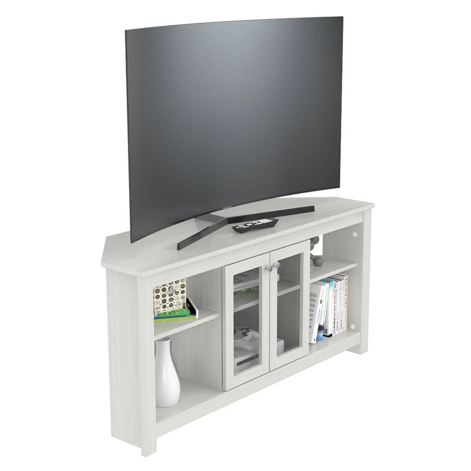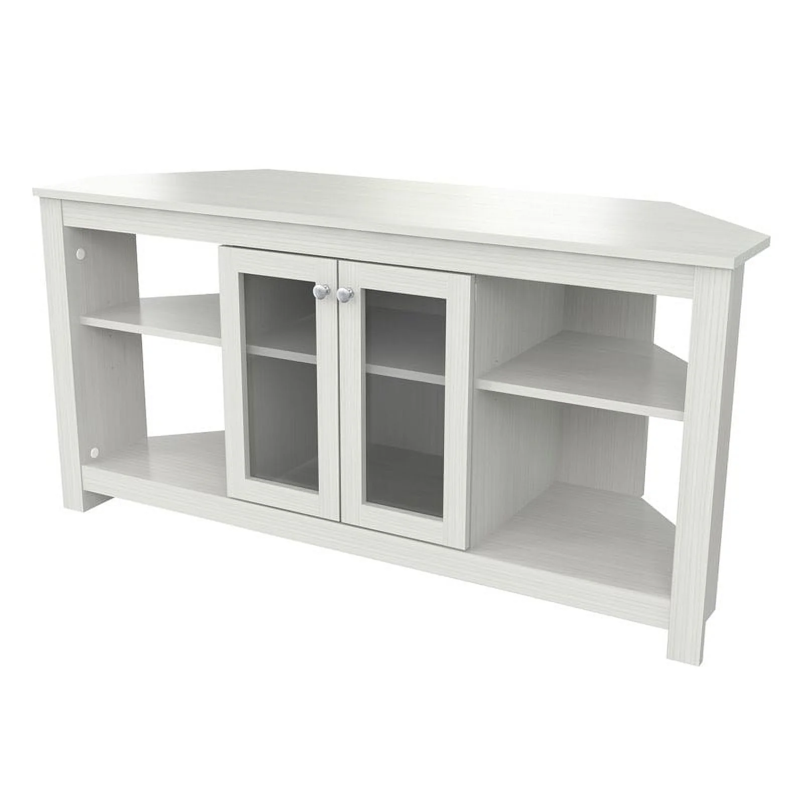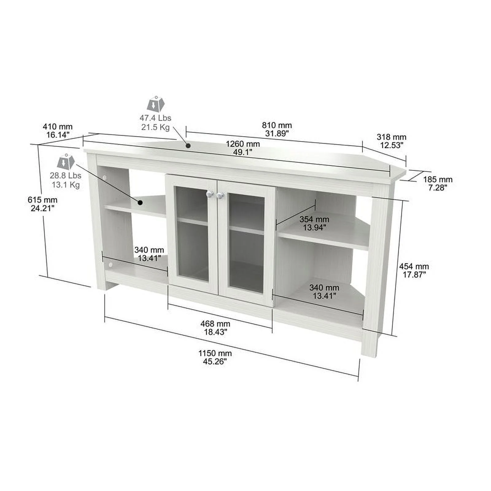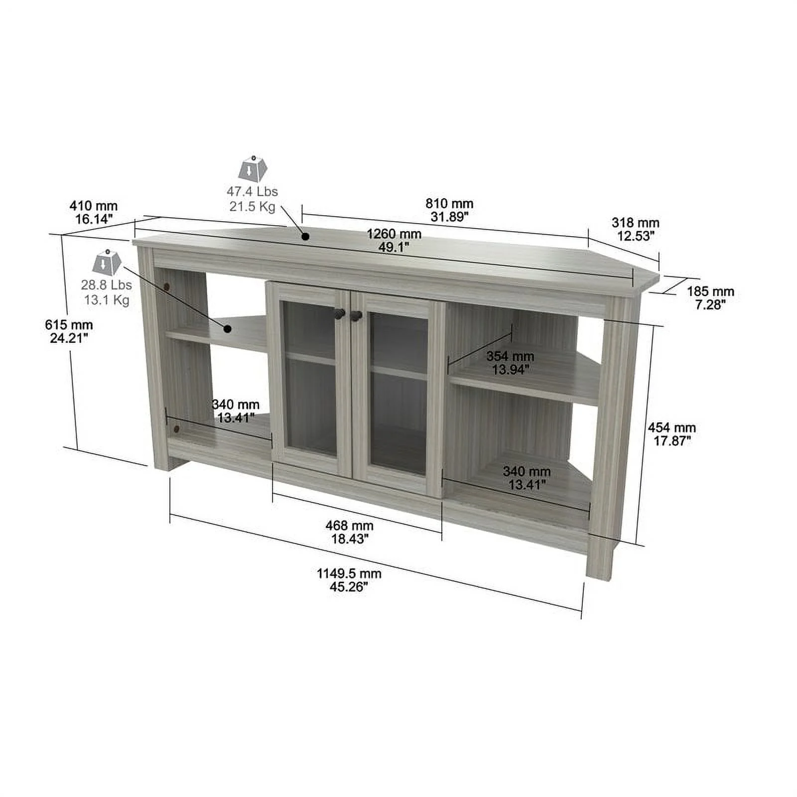 The corner laminate 60" tv stand by Inval is finished in a rich washed oak laminate with durable melamine which is stain, heat, and scratch resistant. This modern tv stand elevates any living space and has a functional design to accent your home decor. It accommodates up to 60" flat-screen TVs with a maximum tv weight of 60 lbs. The unit features two (2) versatile open storage areas to showcase you're A/V equipment. It also has two (2) storage compartments with adjustable shelves which are concealed by glass doors with brushed metal knobs. This unit features a cable pass-through for easy cable management.