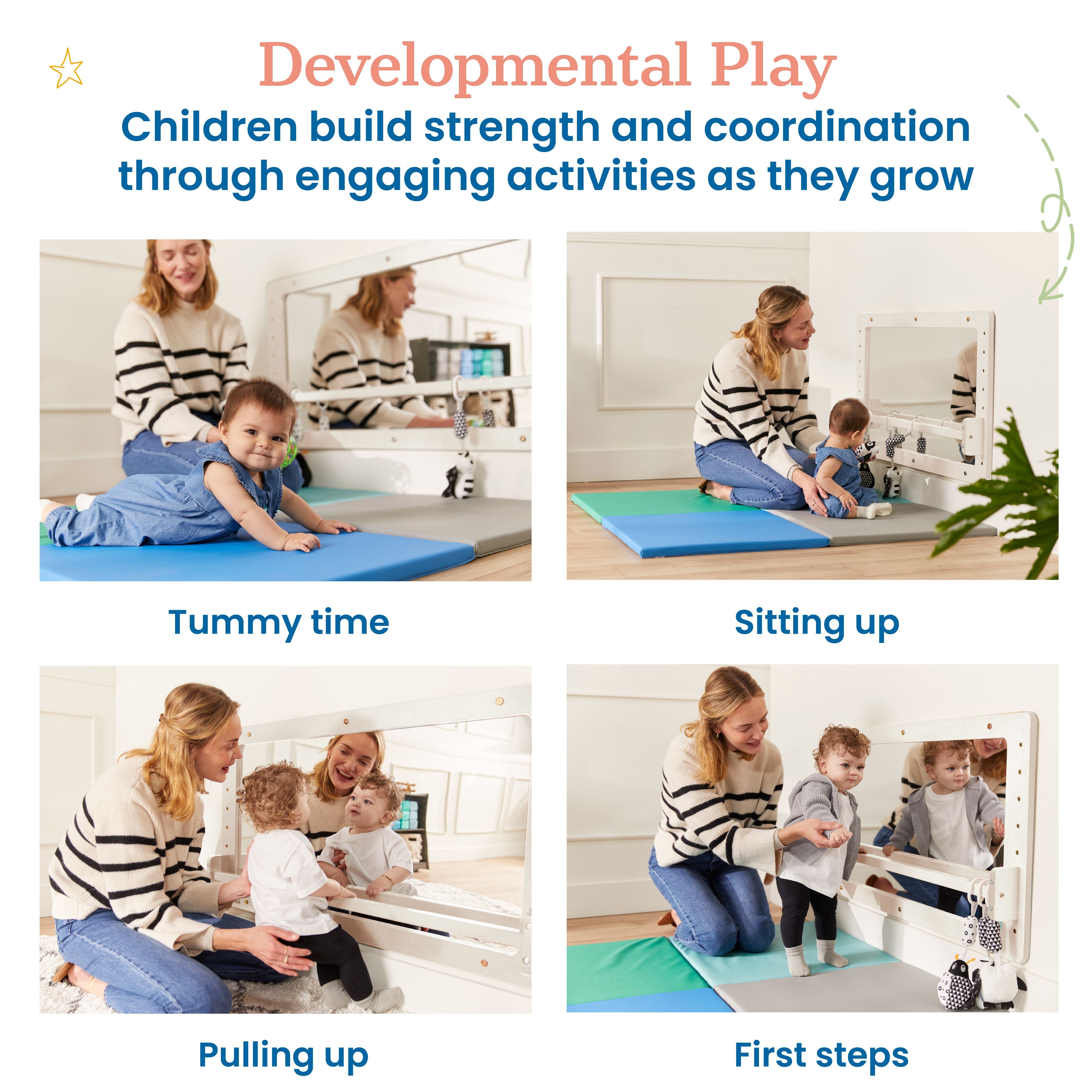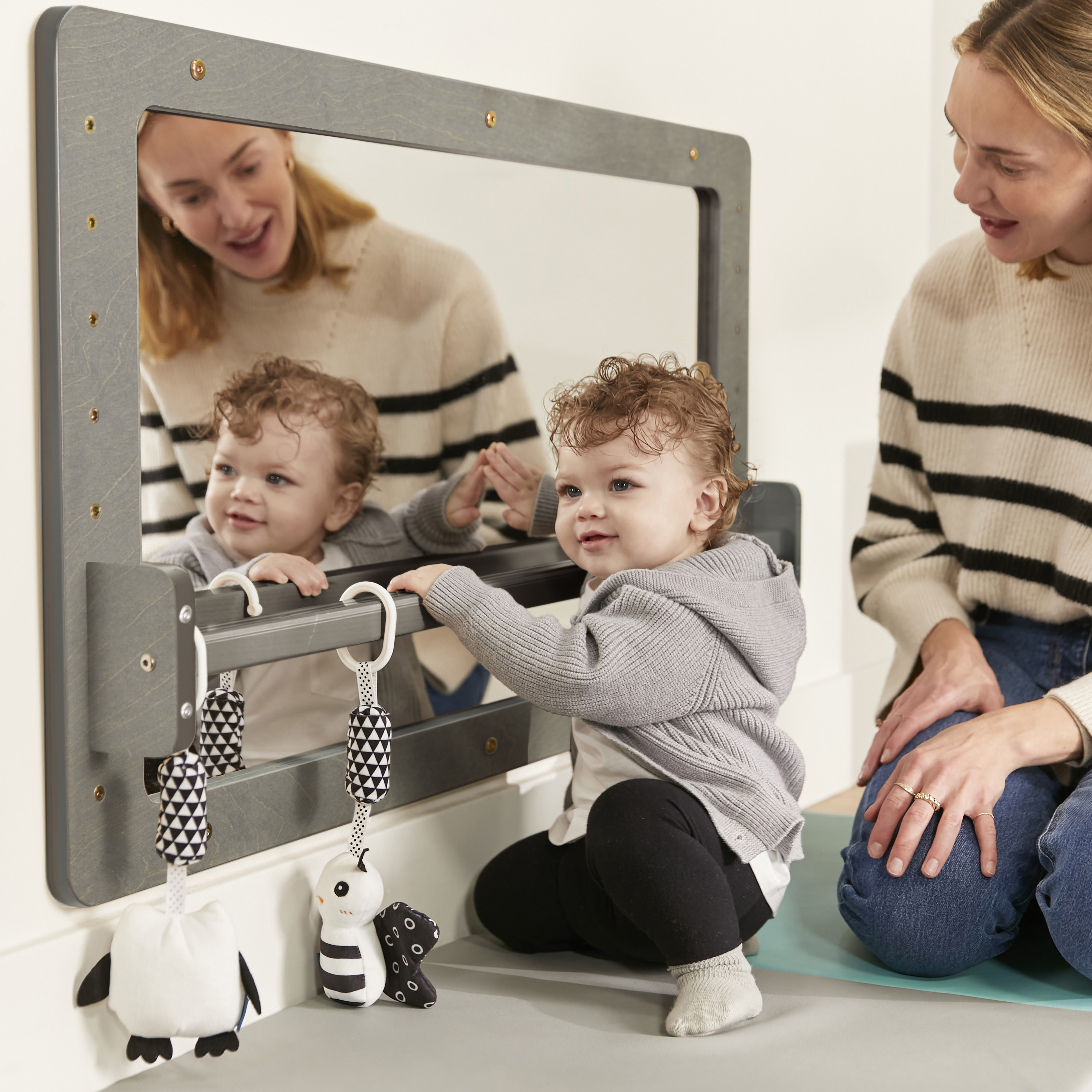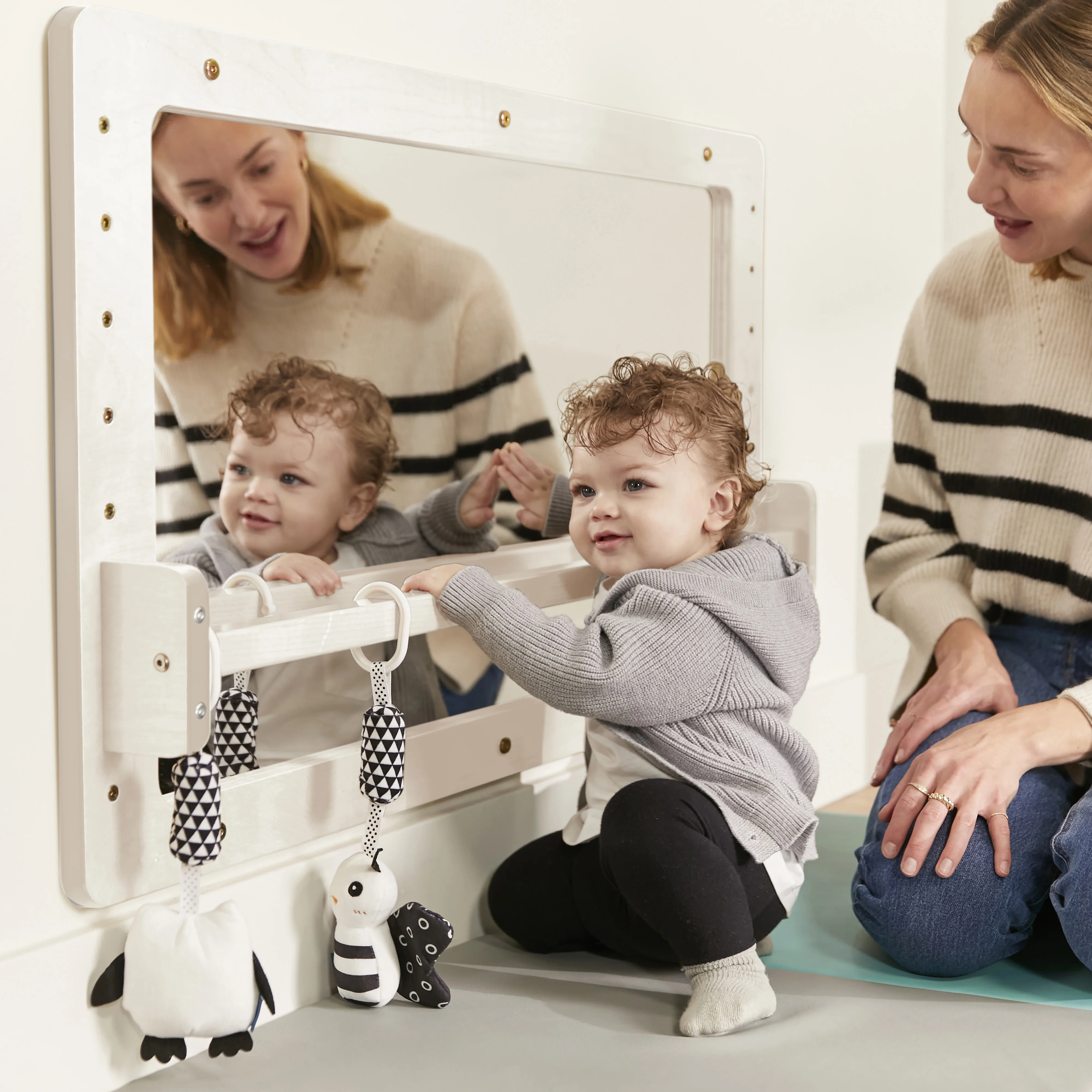 - Self-Discovery Mirror: Foster sensory exploration and motor skill development with the wall-mounted mirror and adjustable pull-up bar