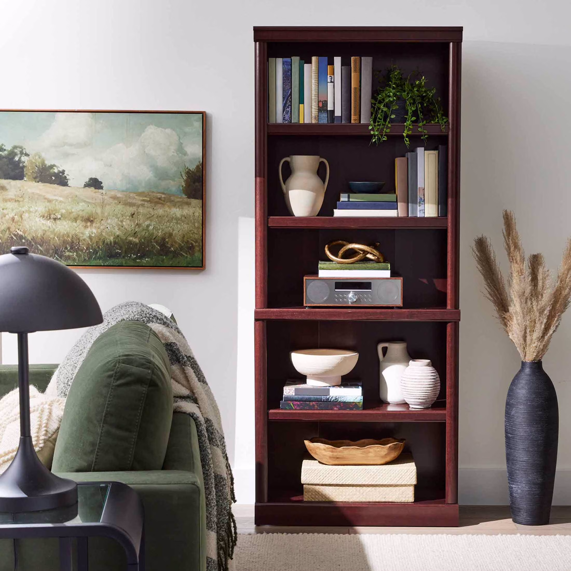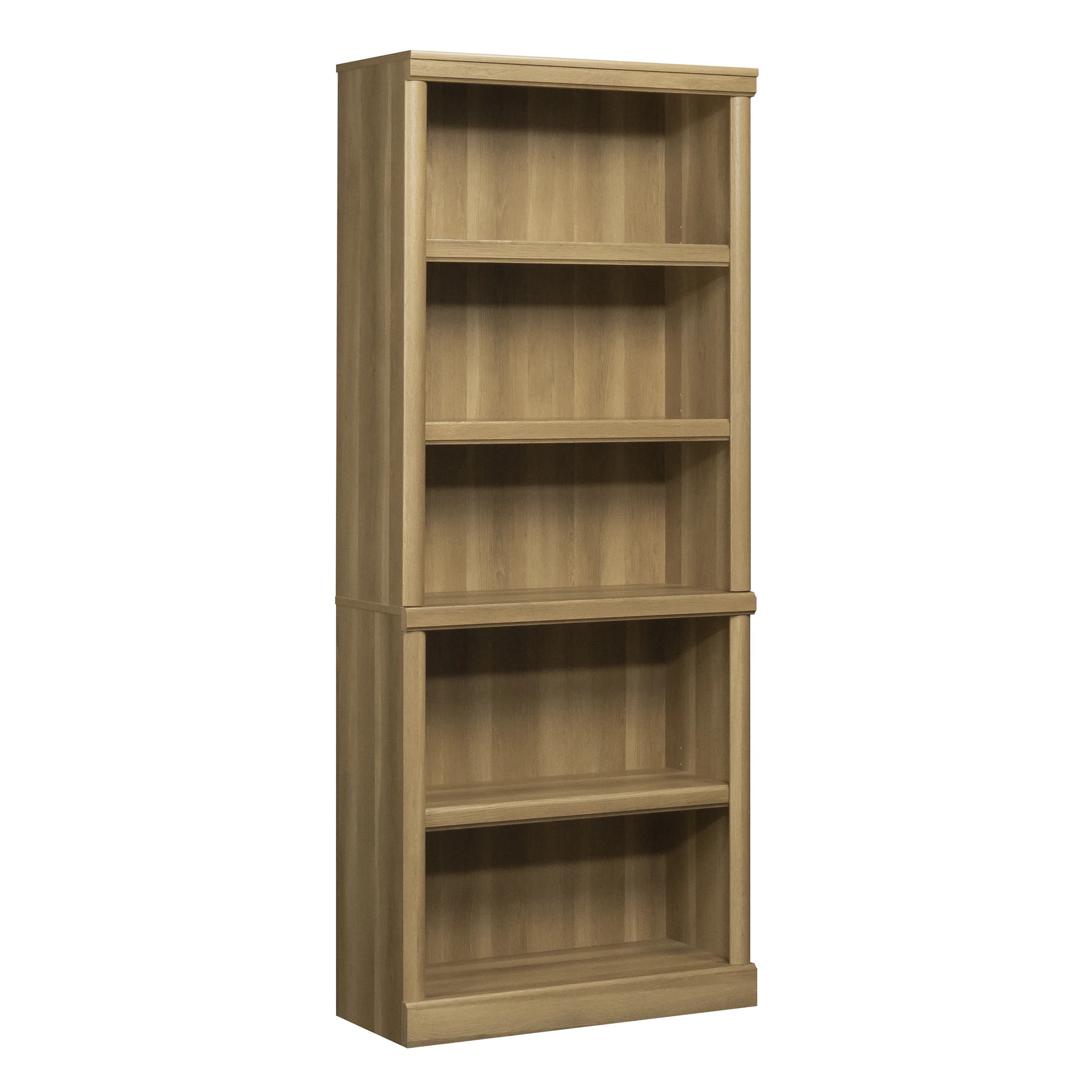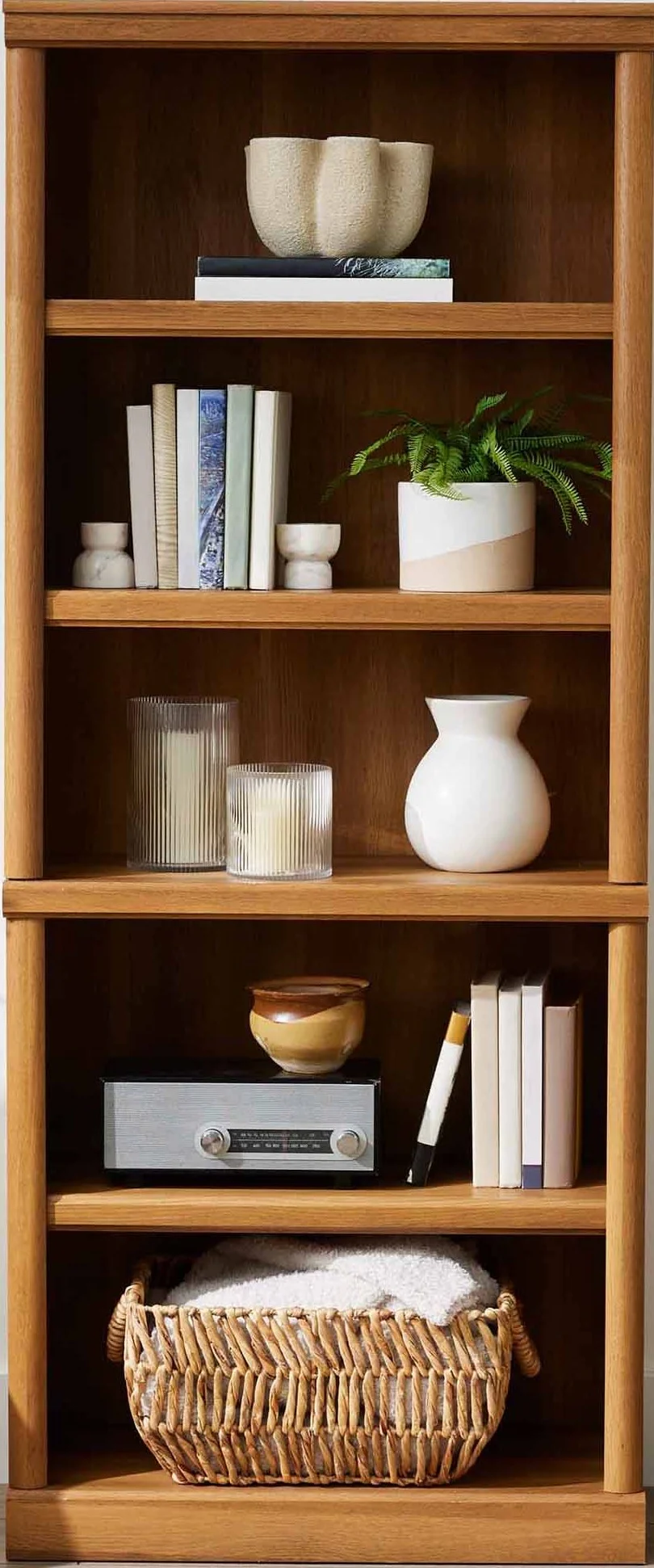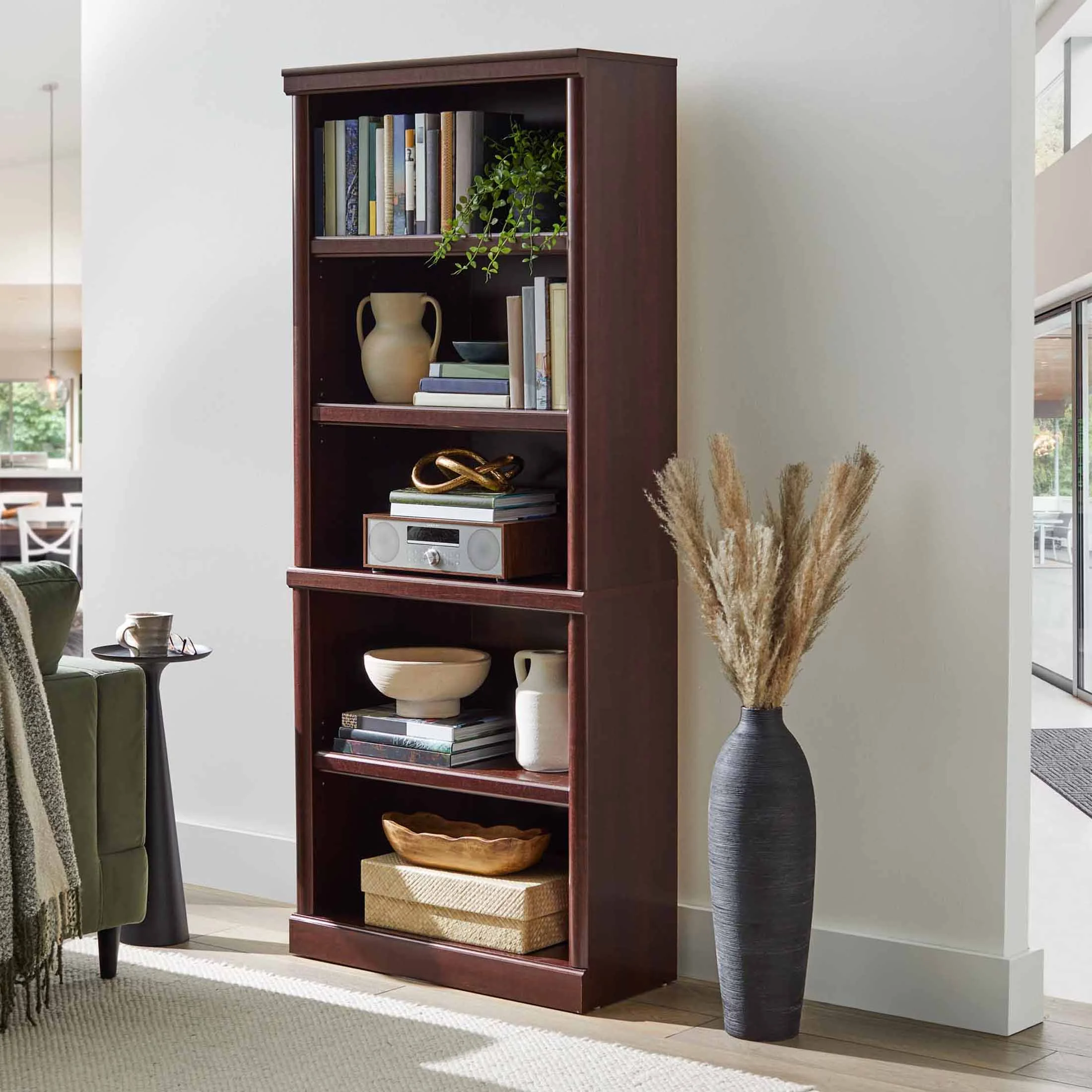 - Spacious shelves hold books, binders, framed photos, collectibles, and more