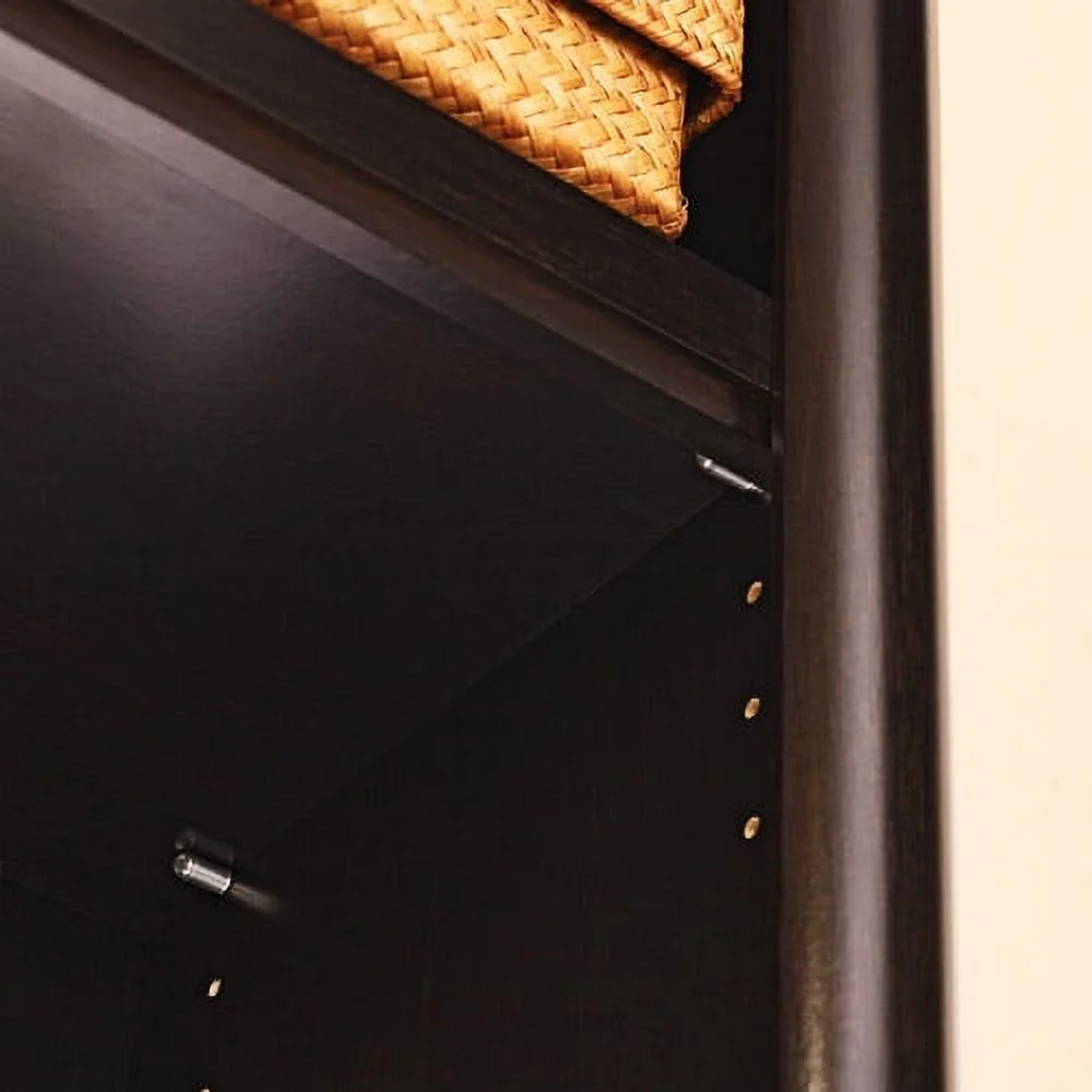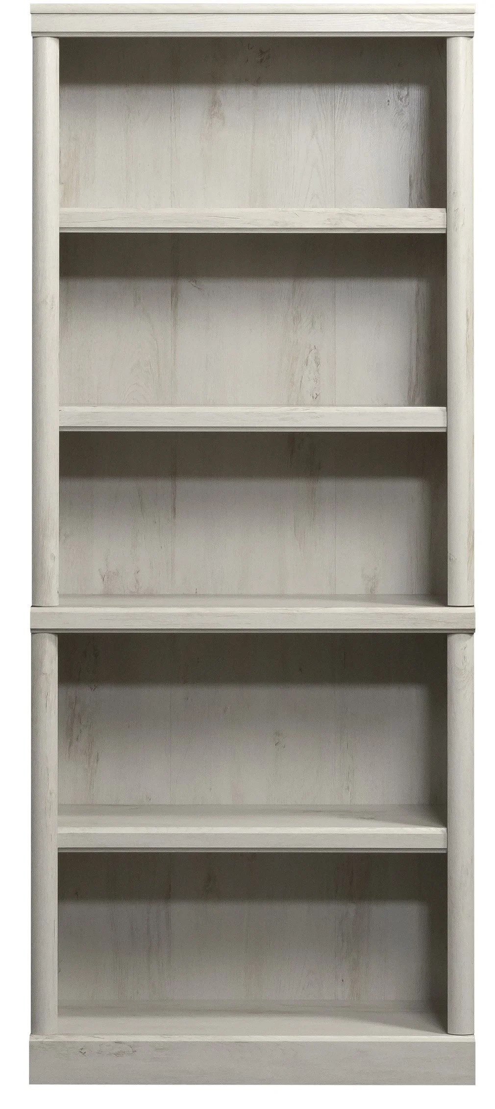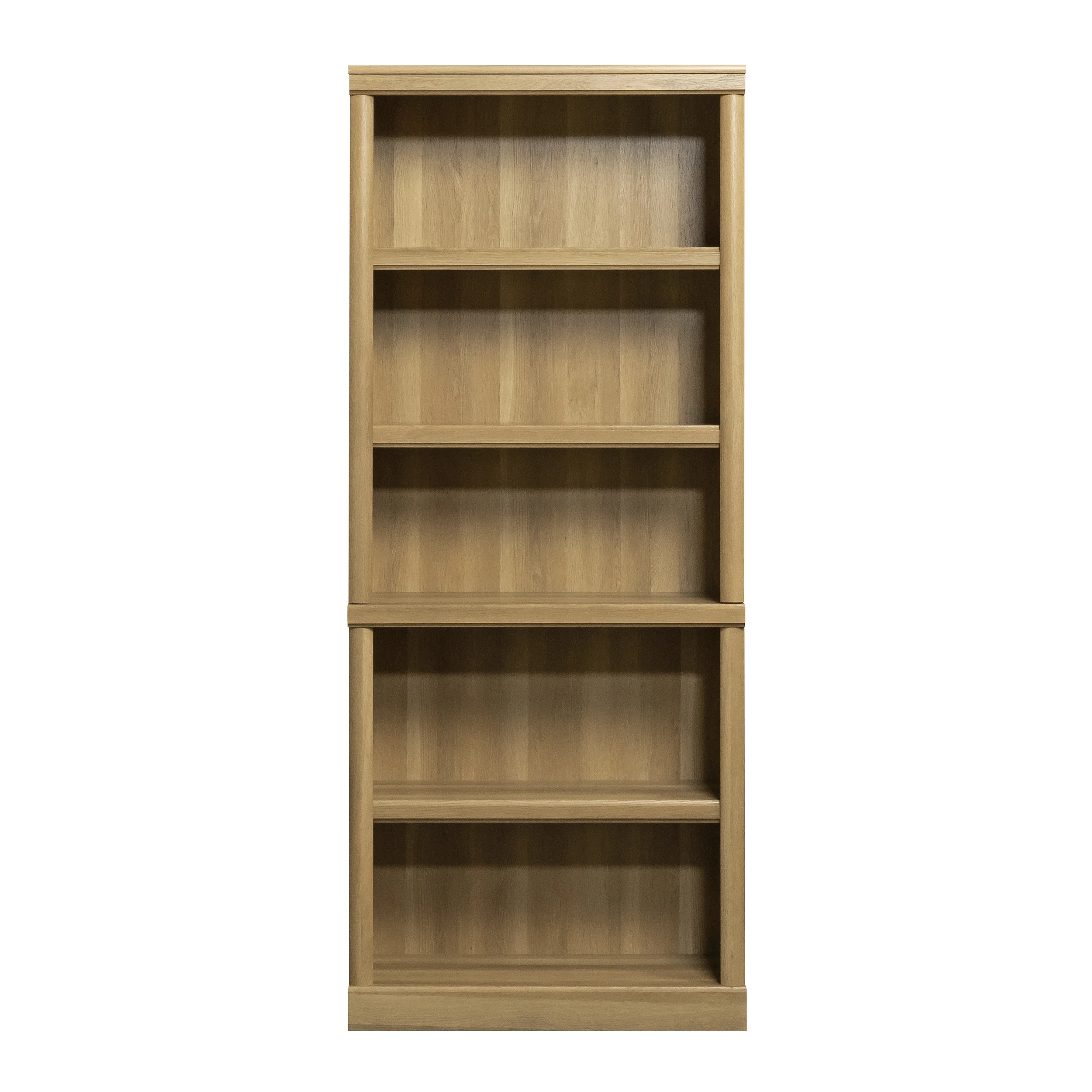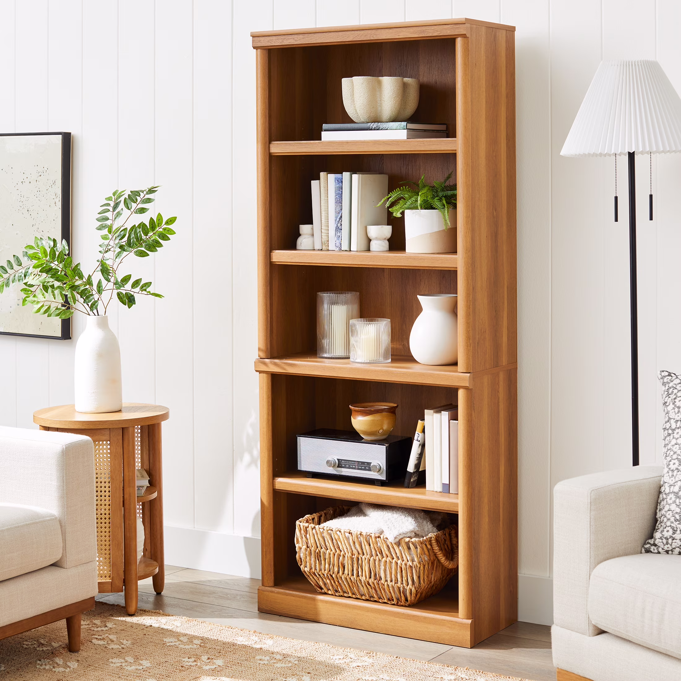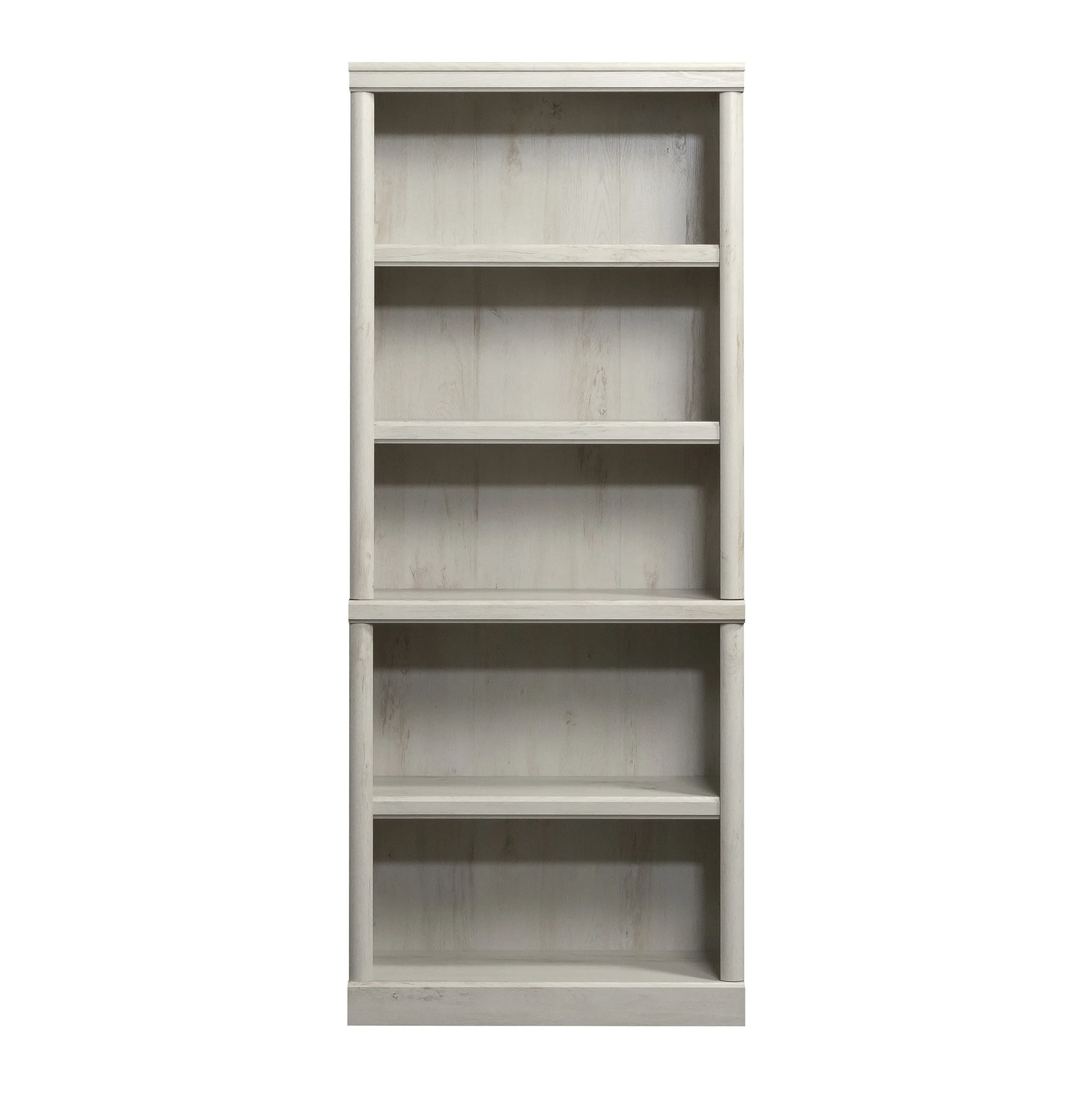 - Spacious shelves hold books, binders, framed photos, collectibles, and more