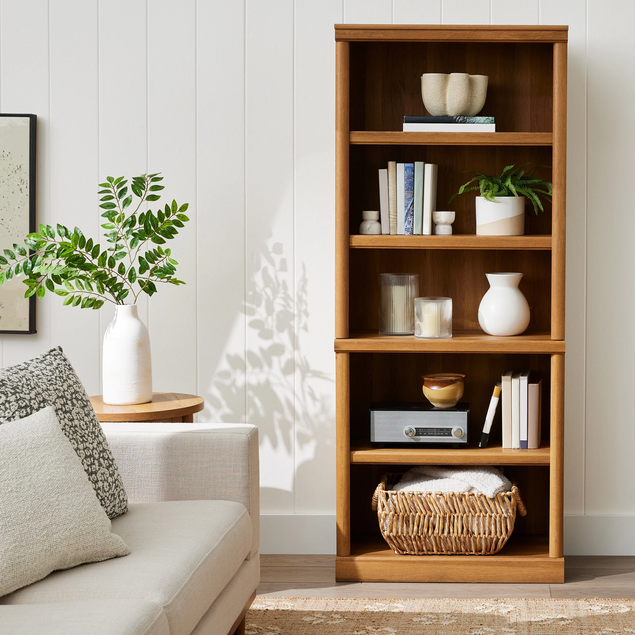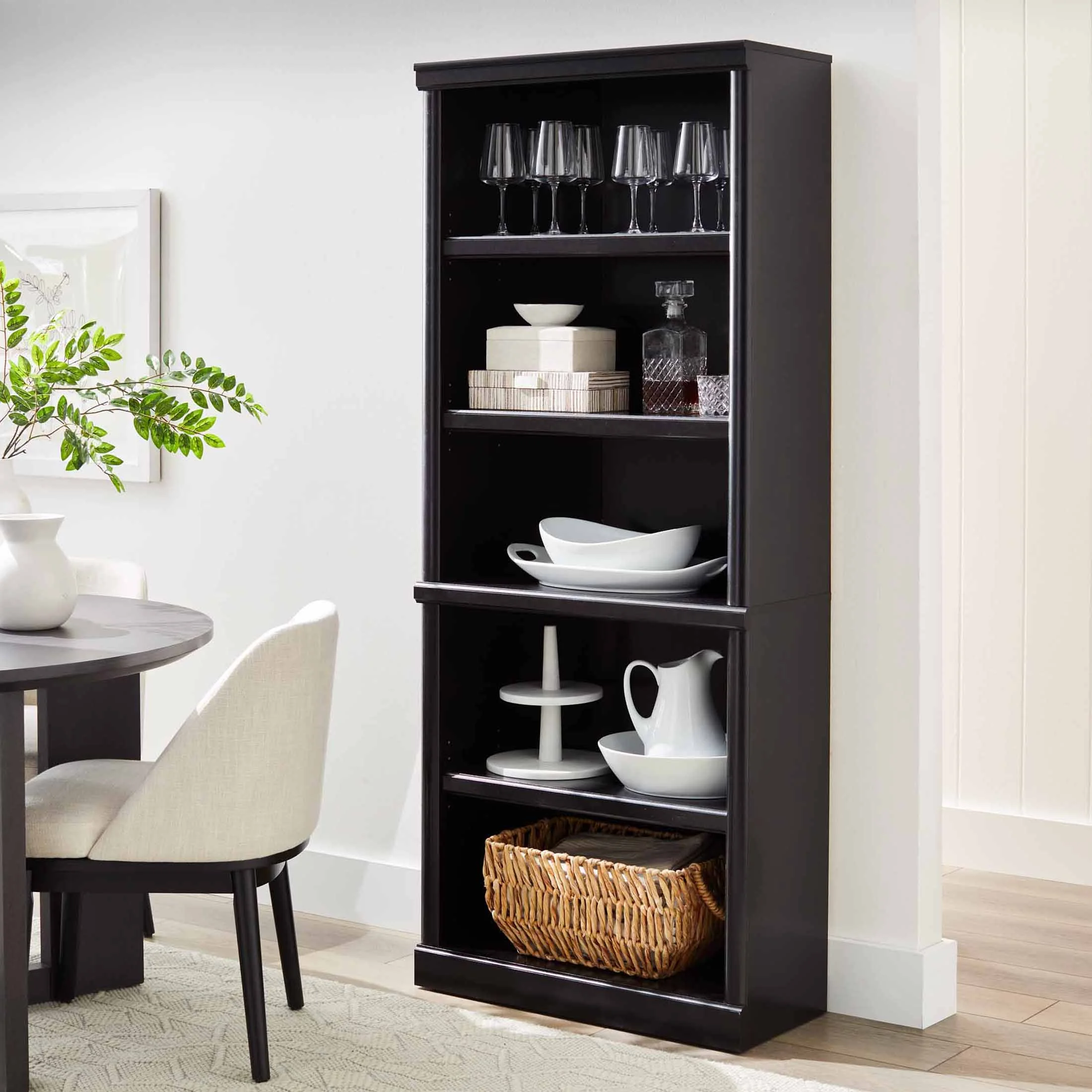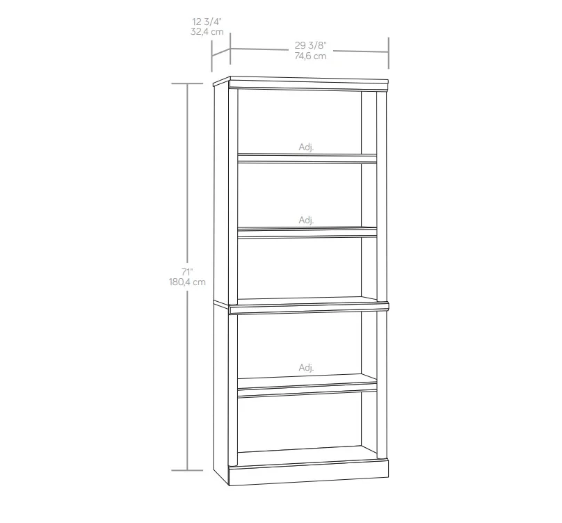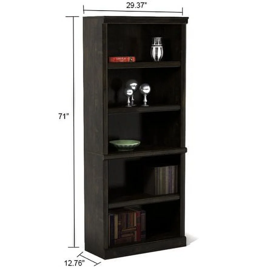 Store it high or stack it low. This 5 shelf bookcase from the Better Homes & Gardens Ashwood Road collection is the perfect storage solution for you! Its five spacious shelves are ideal not just for storage, but for display of your home decor items too. Showcase all of your awards and most prized possessions or your collection of kick-knacks and pictures of the family. It has room for it all! It features three adjustable shelves to give you all the room you'll need for all your books, bins, decor and more! The Ashwood Road 5 shelf bookcase also has decorative moldings that simply slide on for easy and simple assembly. Available in Black finish, this stylish library will be a great addition to any room in your home. This bookcase stands tall at 71" and is sure to be a great fit for your home. Be sure to check out the better homes & Gardens Ashwood Road collection for more great items!