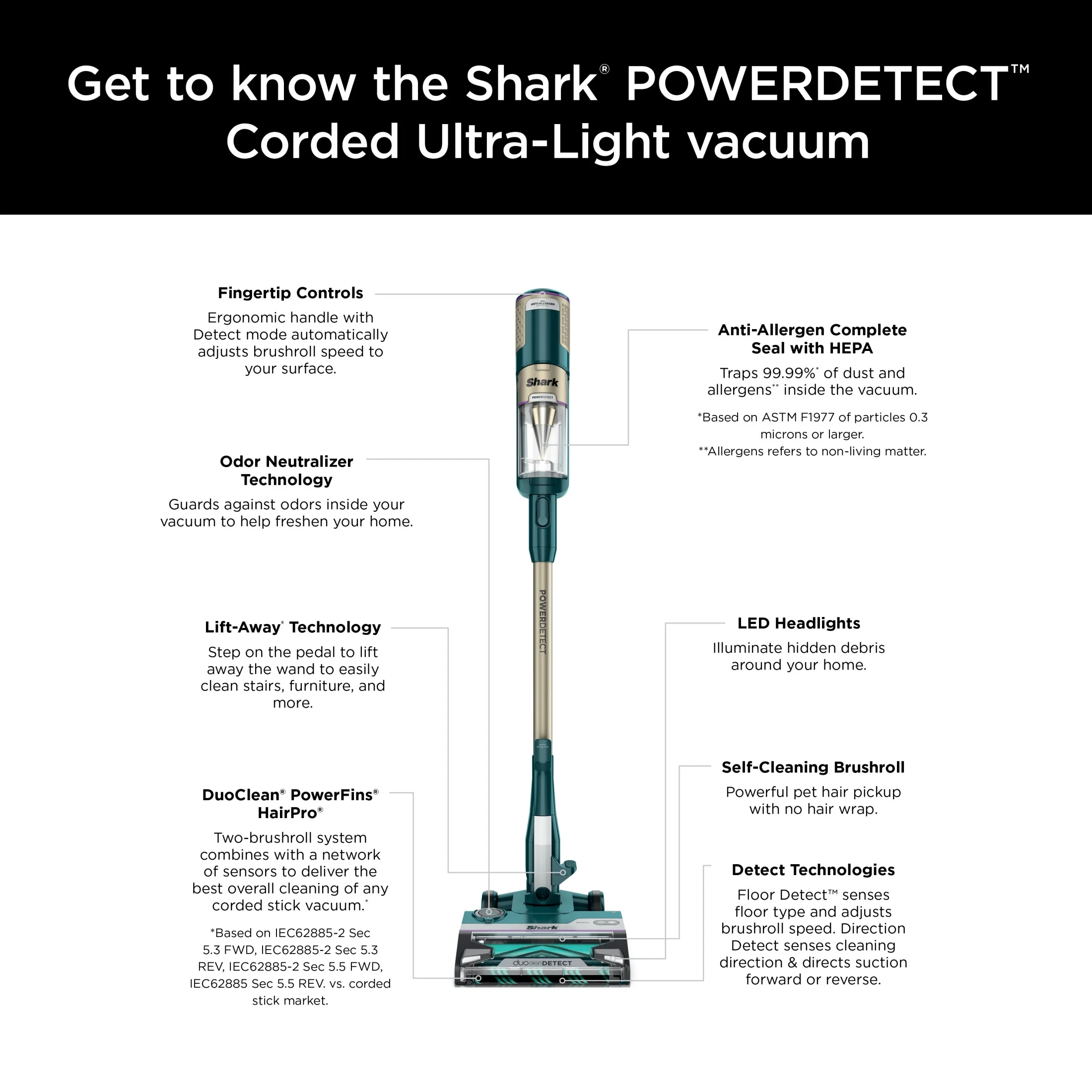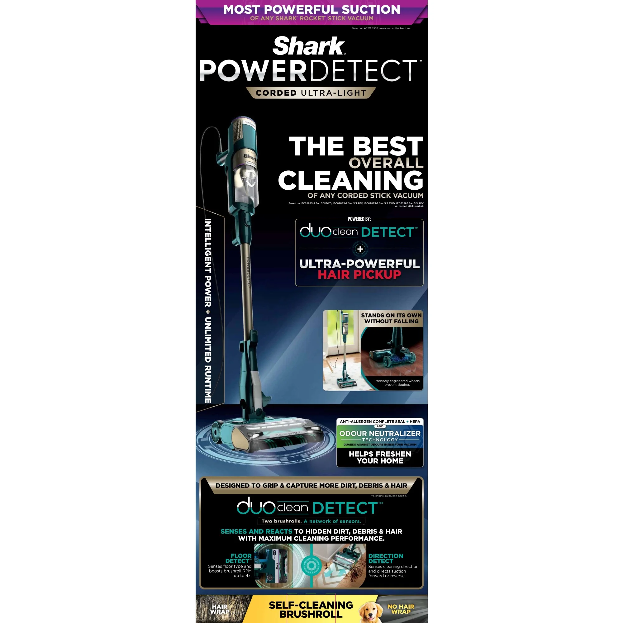 - THE BEST OVERALL CLEANING OF ANY CORDED STICK*: The POWERDETECT corded stick vacuum combines powerful suction with cutting-edge DuoClean Detect technology. *Based on IEC62885-2 Sec 5.3 FWD, IEC62885-2 Sec 5.3 REV, IEC62885-2 Sec 5.5 FWD, IEC62885 Sec 5.5 REV vs. corded stick market