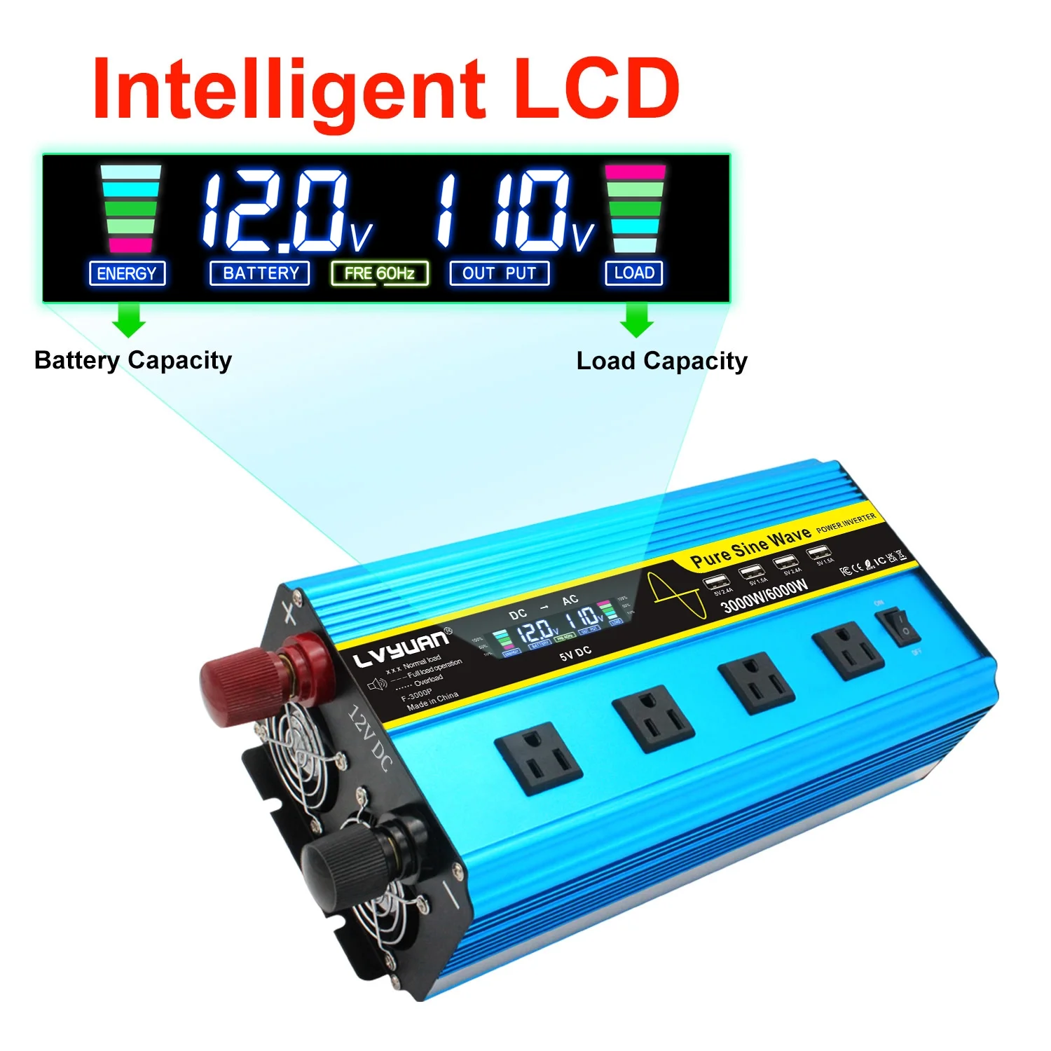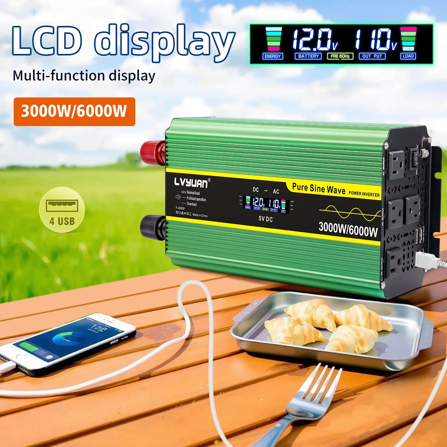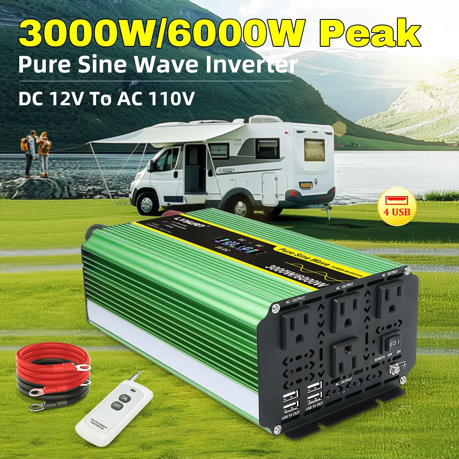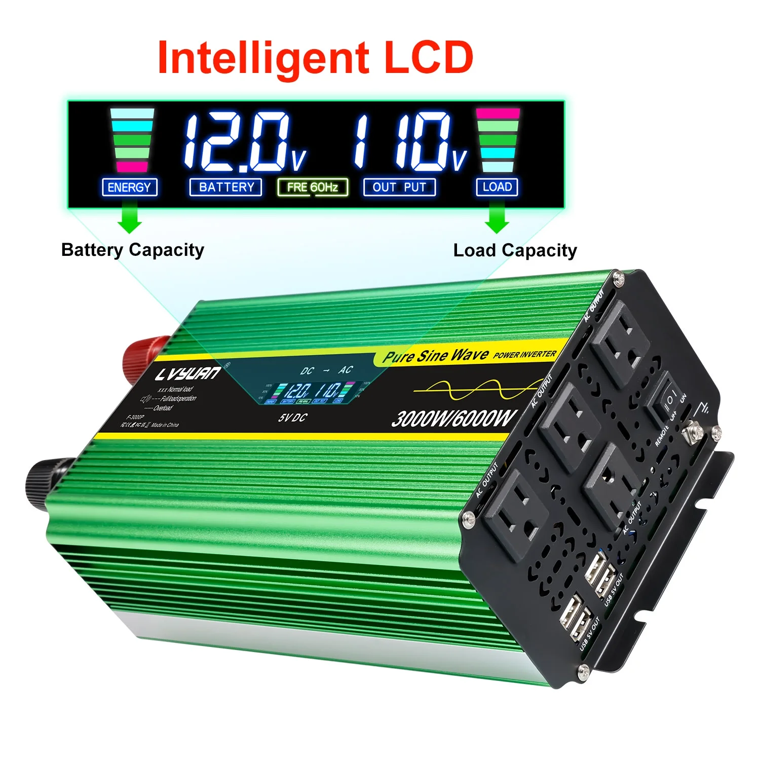 LVYUAN 3000W Pure Sine Wave Power Inverter - DC 12V to AC 110V/120V inverter with LCD Display, Remote Control, 4 AC Outlets, 4 USB Ports.