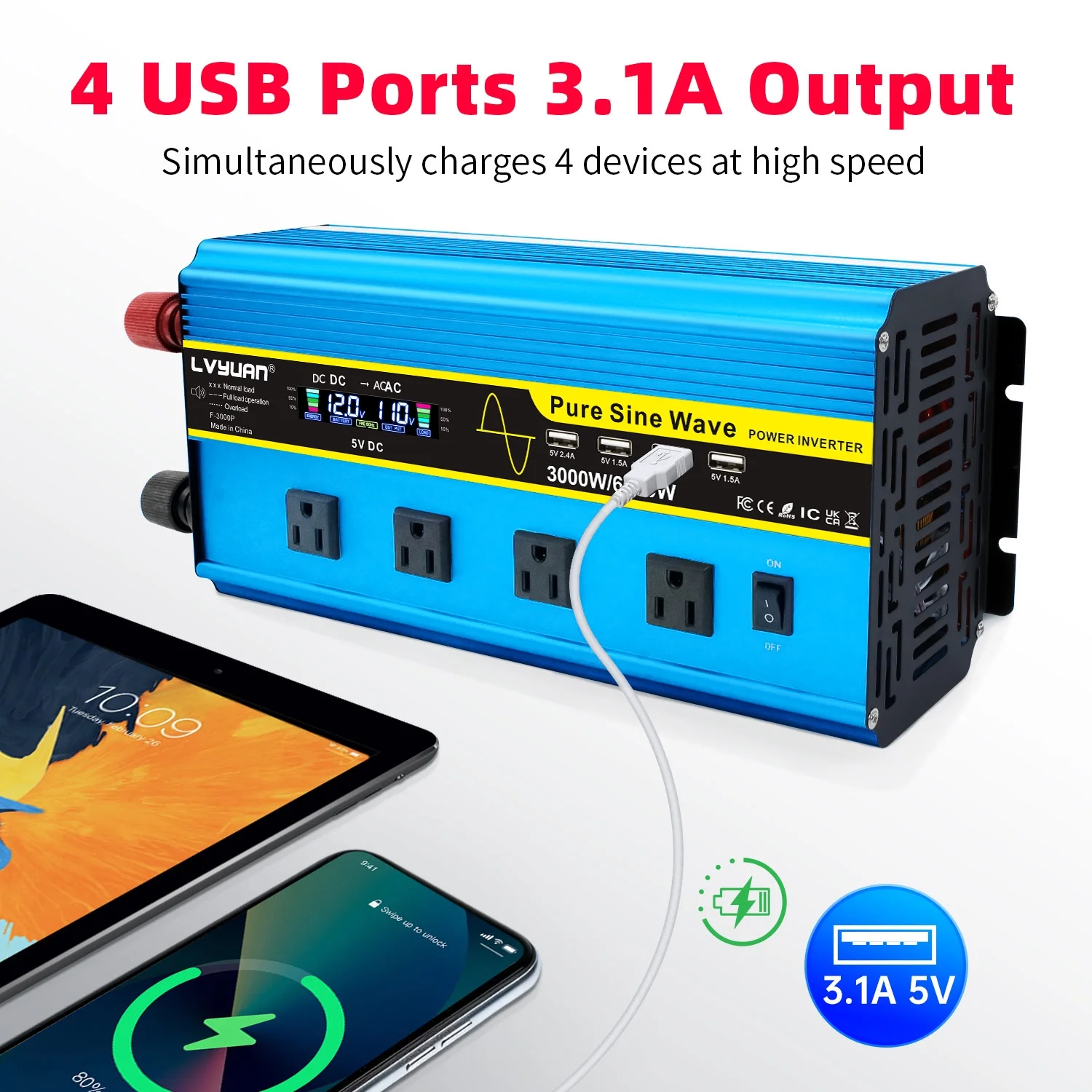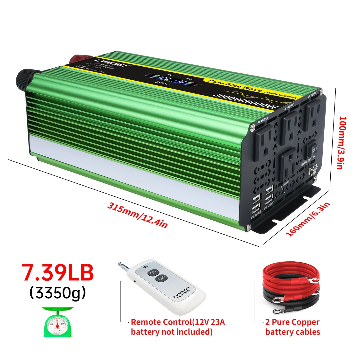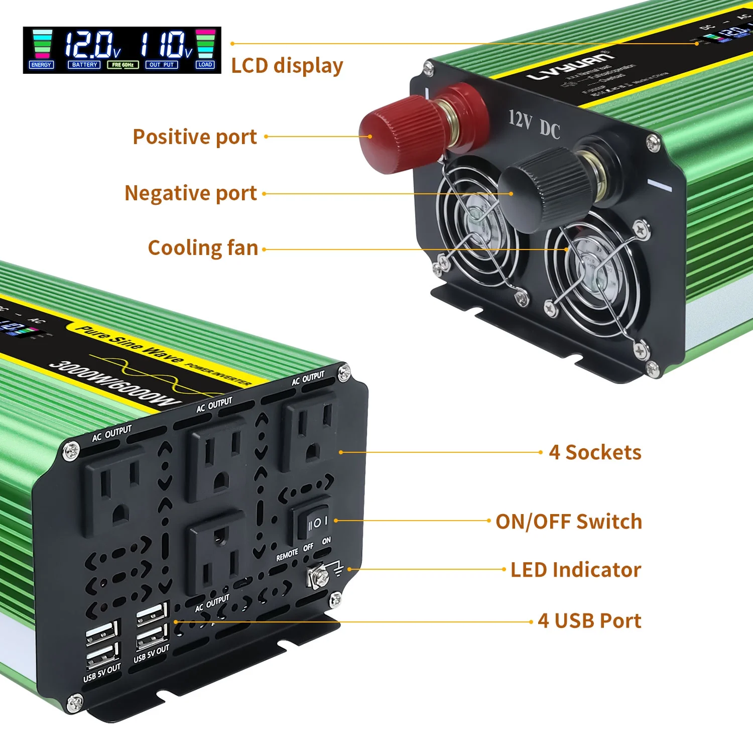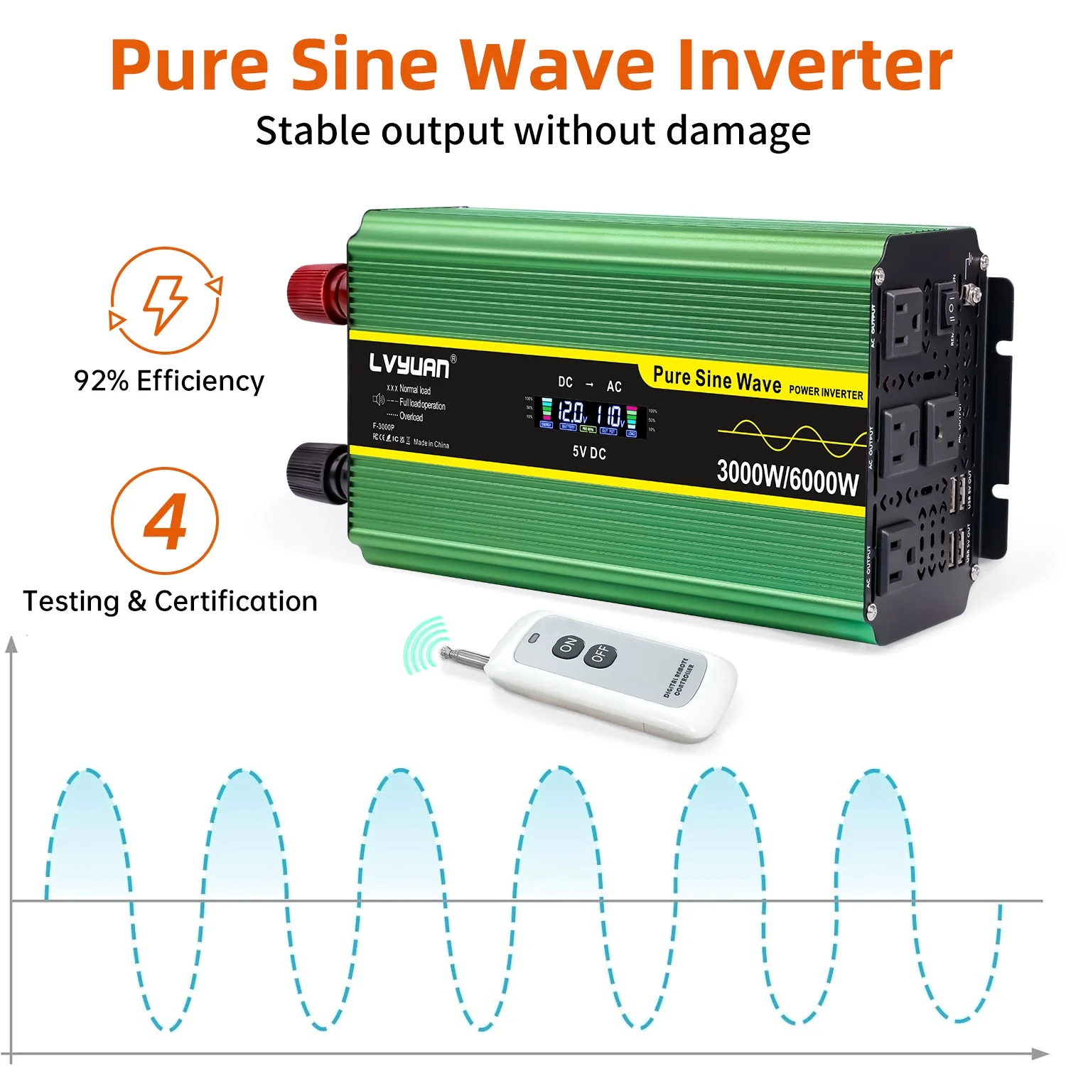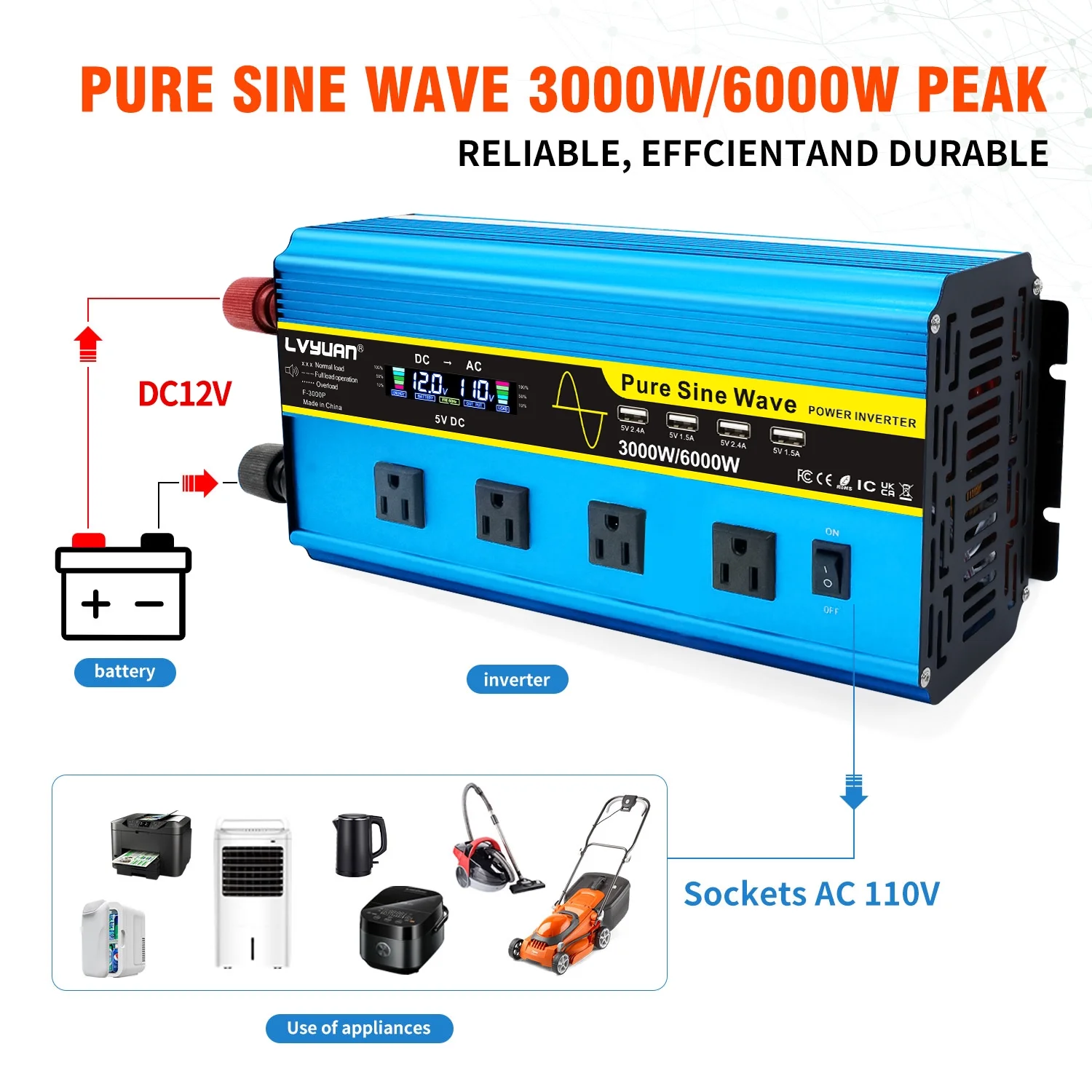 LVYUAN 3000W Pure Sine Wave Power Inverter - DC 12V to AC 110V/120V inverter with LCD Display, Remote Control, 4 AC Outlets, 4 USB Ports.