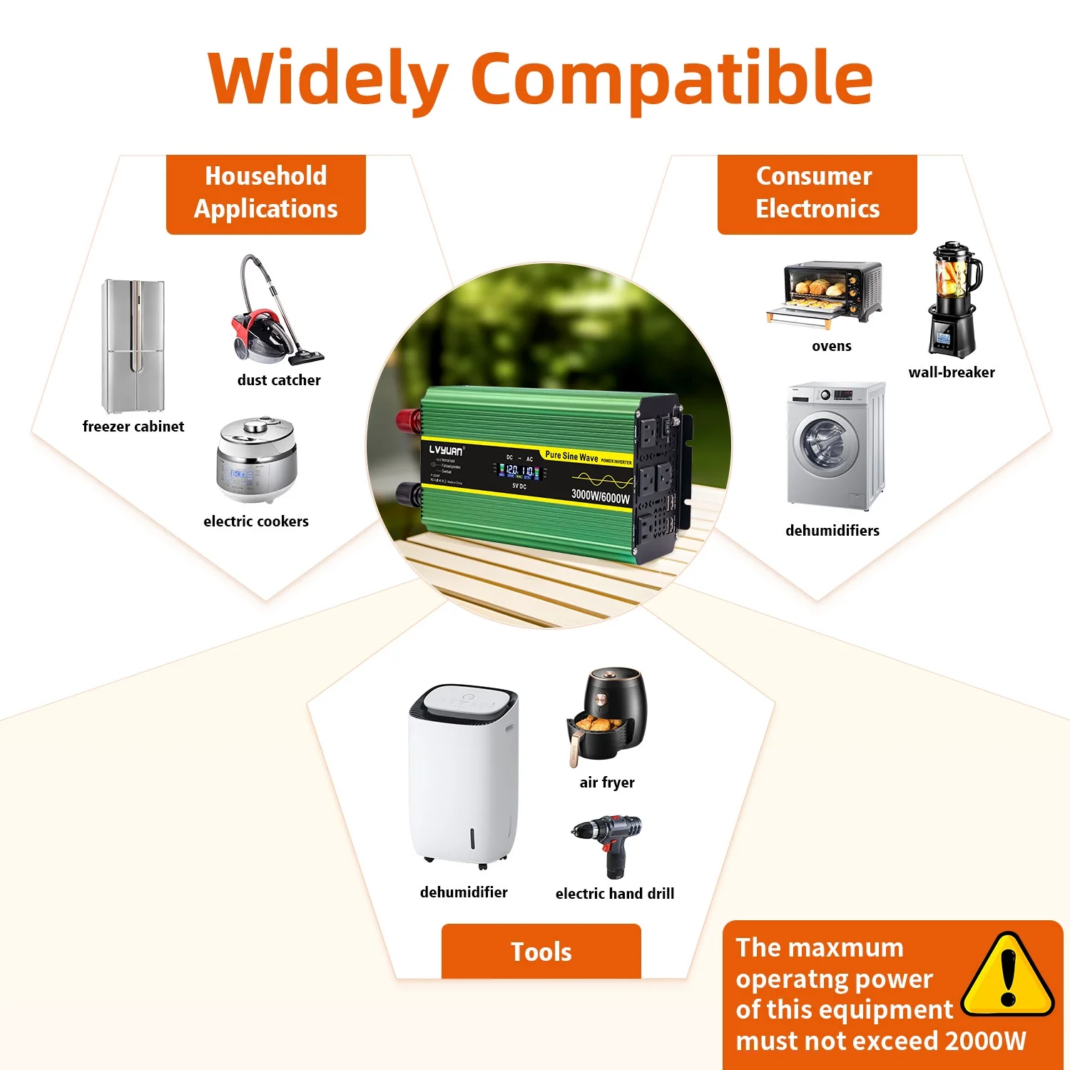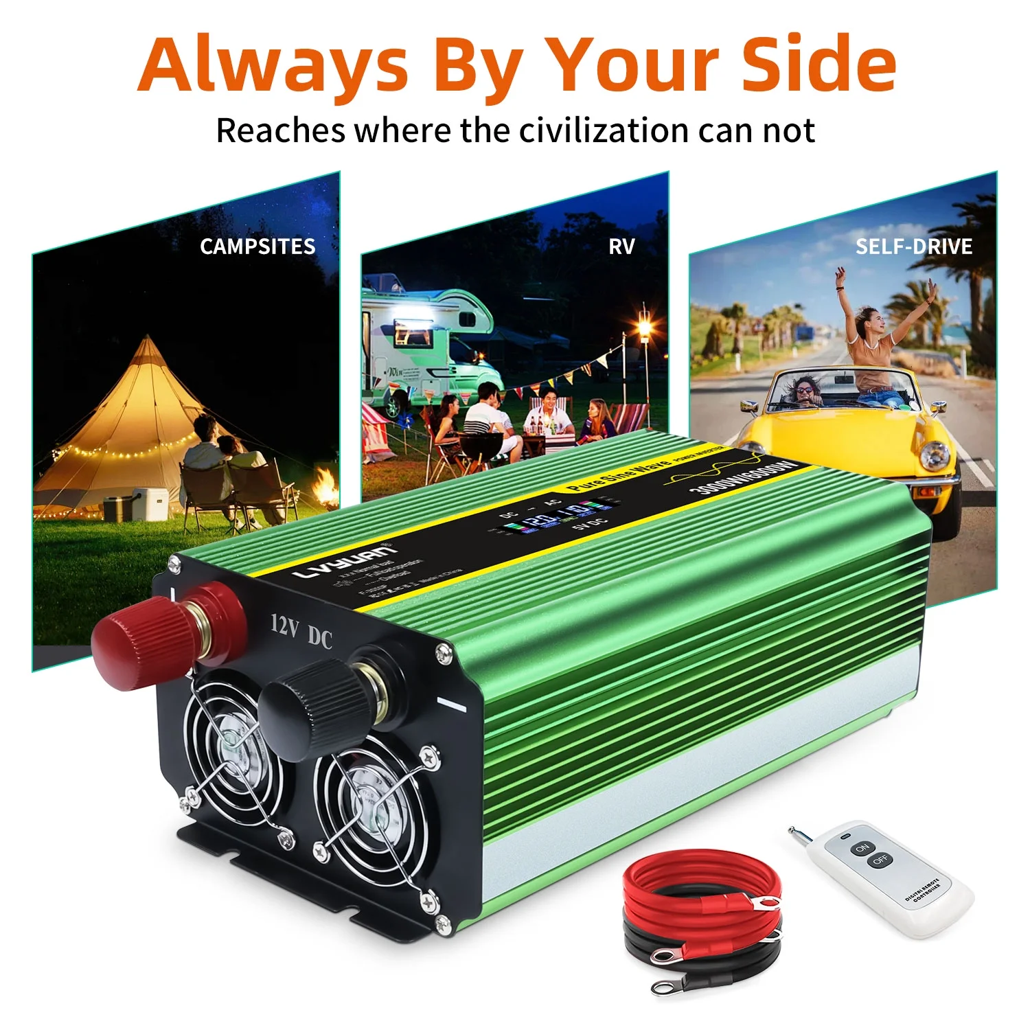 The LVYUAN 3000W Pure Sine Wave Power Inverter provides reliable and efficient power conversion from DC 12V to AC 110V/120V. This 3000W inverter is perfect for powering electronics, appliances, and tools during camping trips, road trips, or as an emergency backup solution at home. With a peak power capacity of 6000W, it can handle high startup loads of motors and compressors. The built-in LCD display ensures easy monitoring of input and output voltages, battery capacity, and load capacity, while comprehensive safety and temperature controlled cooling fan features protect against various issues. It is very suitable for a wide range of uses, including travel, outdoor activities, camping, boating, RV trips, and more, emergency preparedness, backup power during outages.