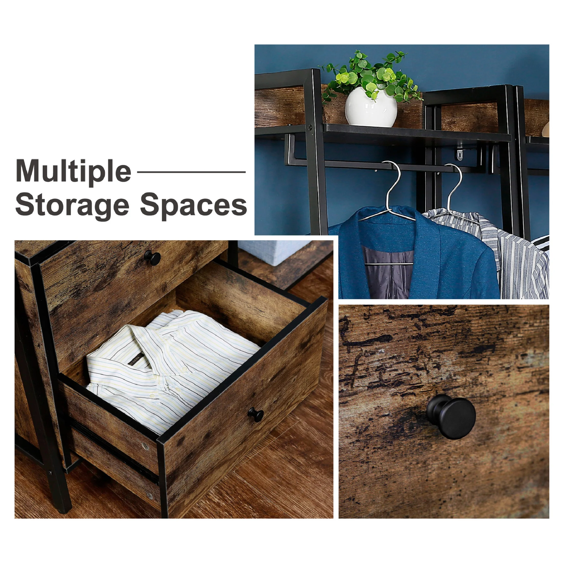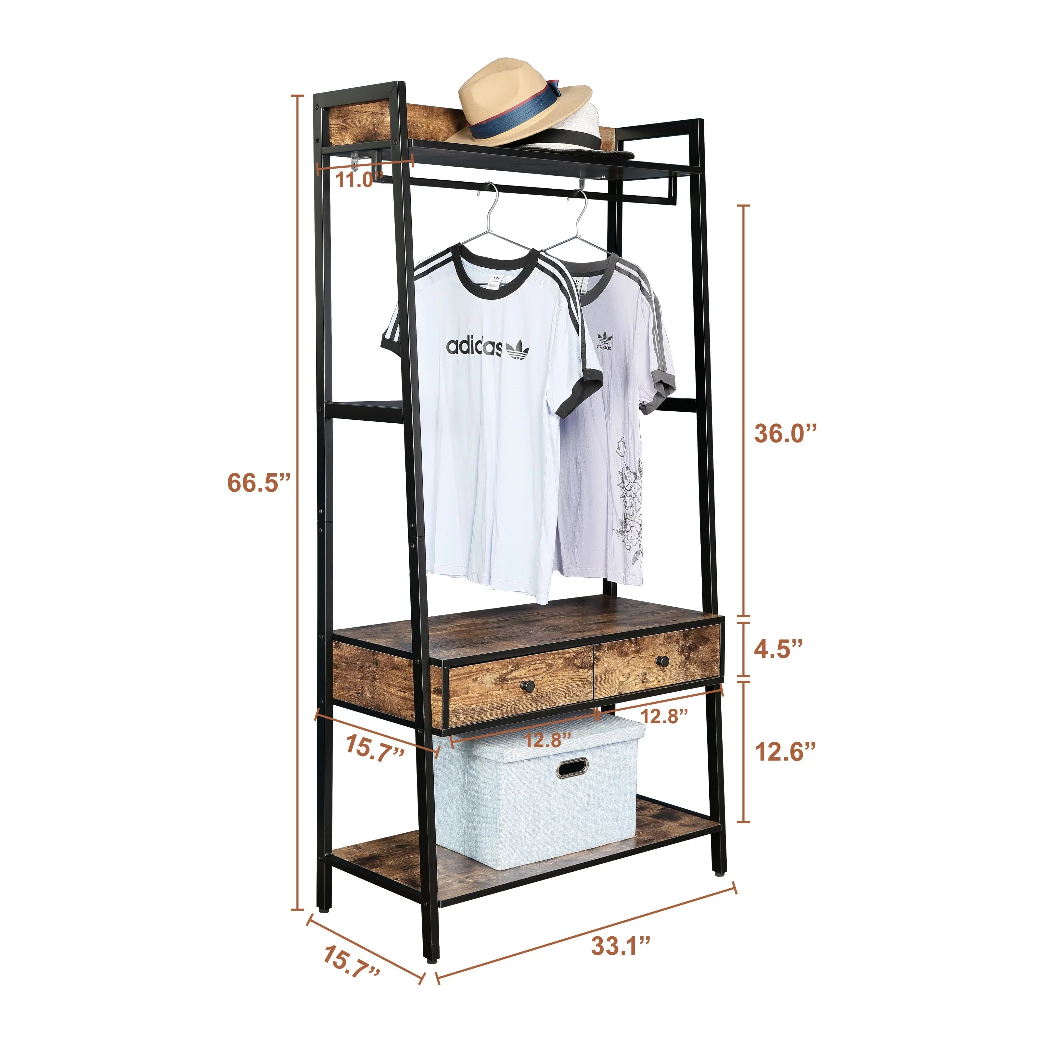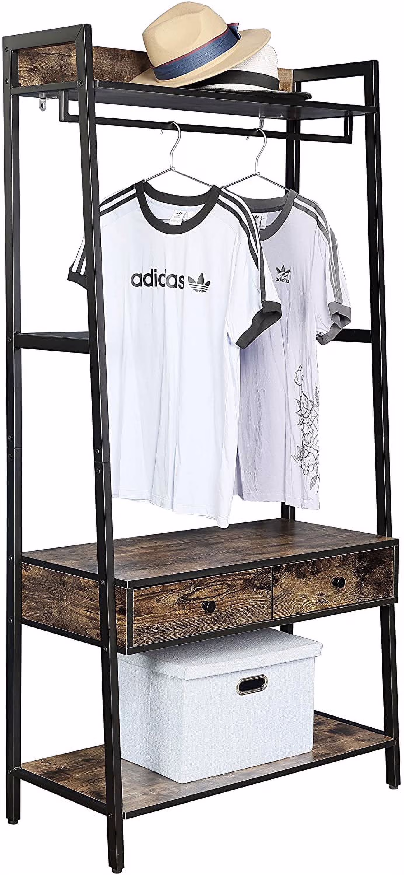 • JJS 33" Entryway Coat Rack, Industrial Rustic Hall Tree Shoe Bench with Storage Drawers and Shelf for Hallway, Wood Look Accent Furniture with Metal Frame, Rustic Brown