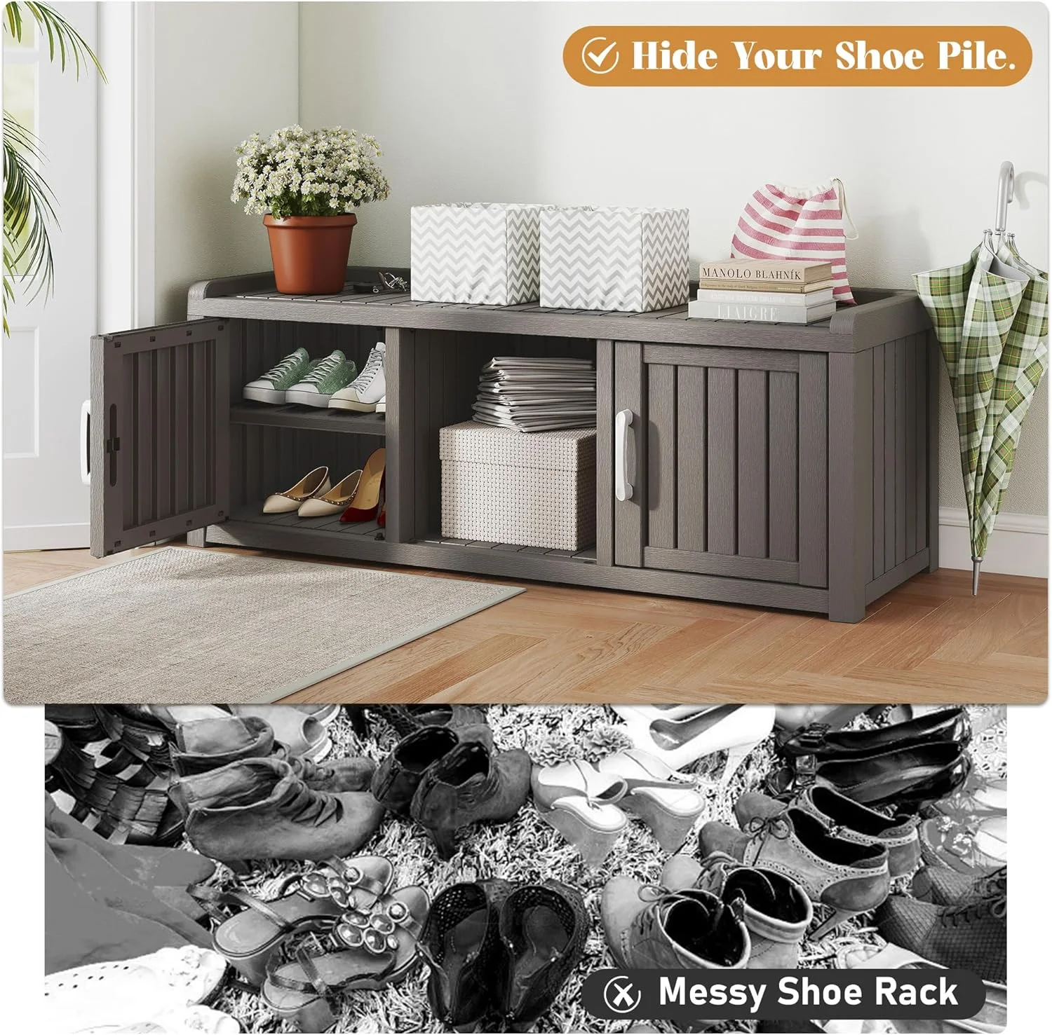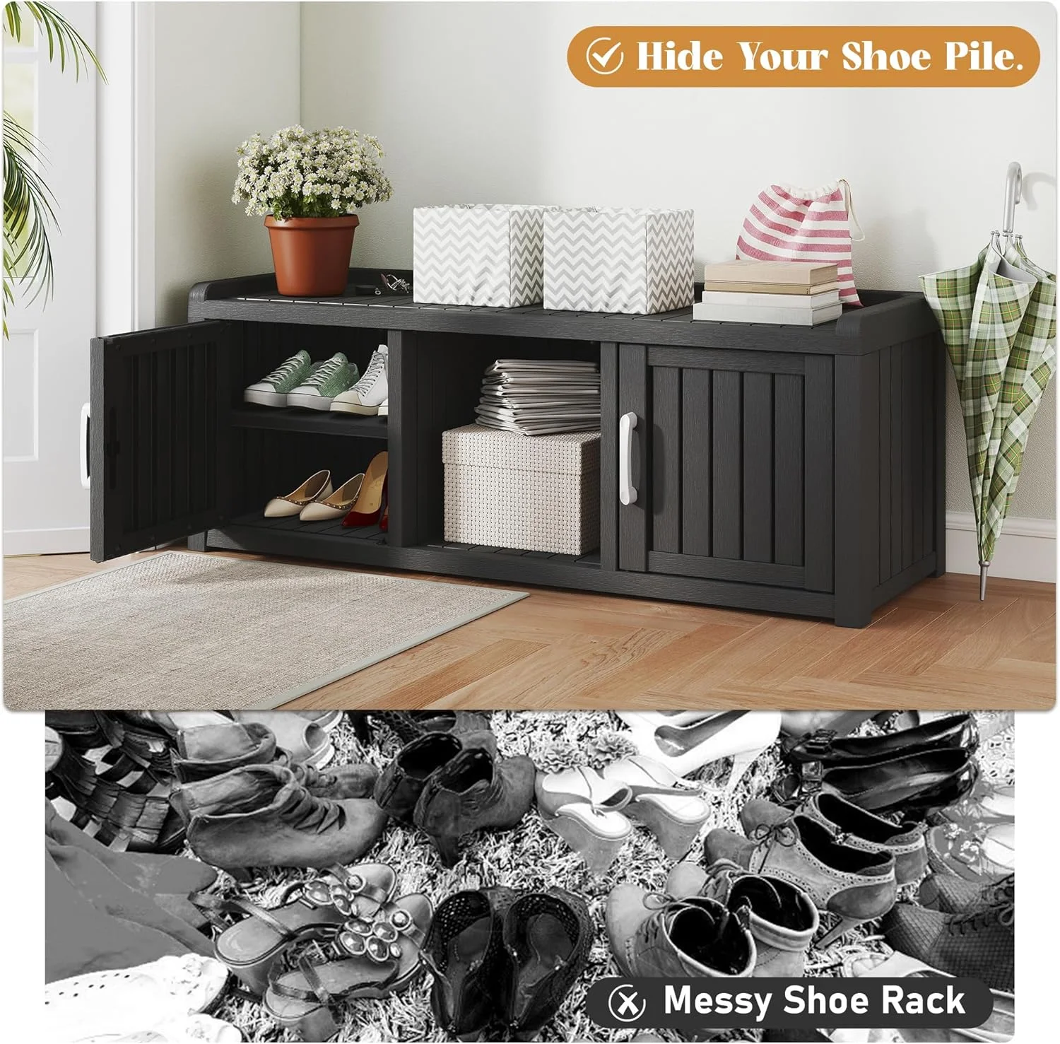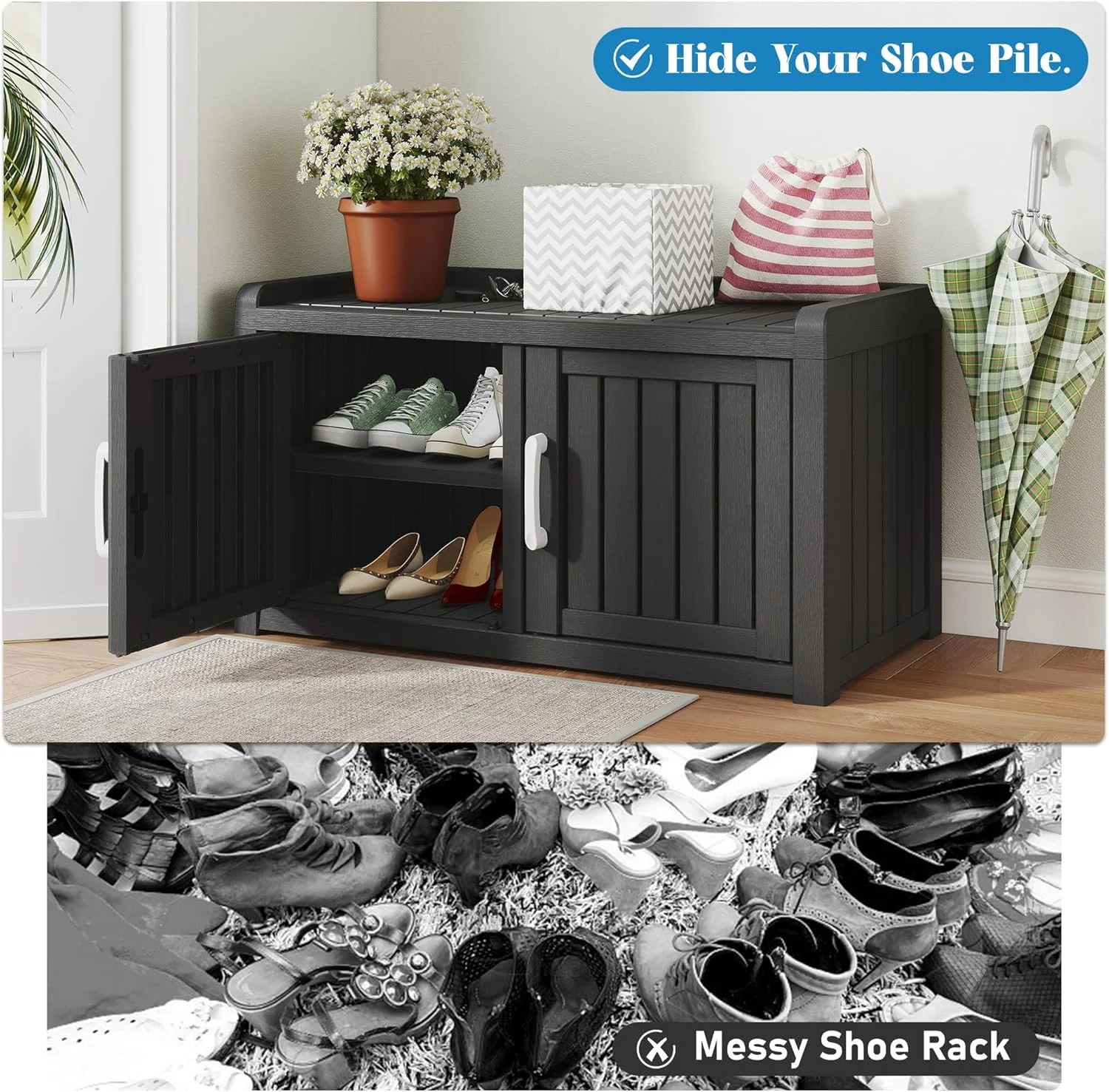 - ?Multi-Functional Storage Bench: More than just shoe storage! This versatile cabinet securely organizes hats, scarves, or household items. Its sturdy, stable construction safely doubles as a bench for putting on shoes.