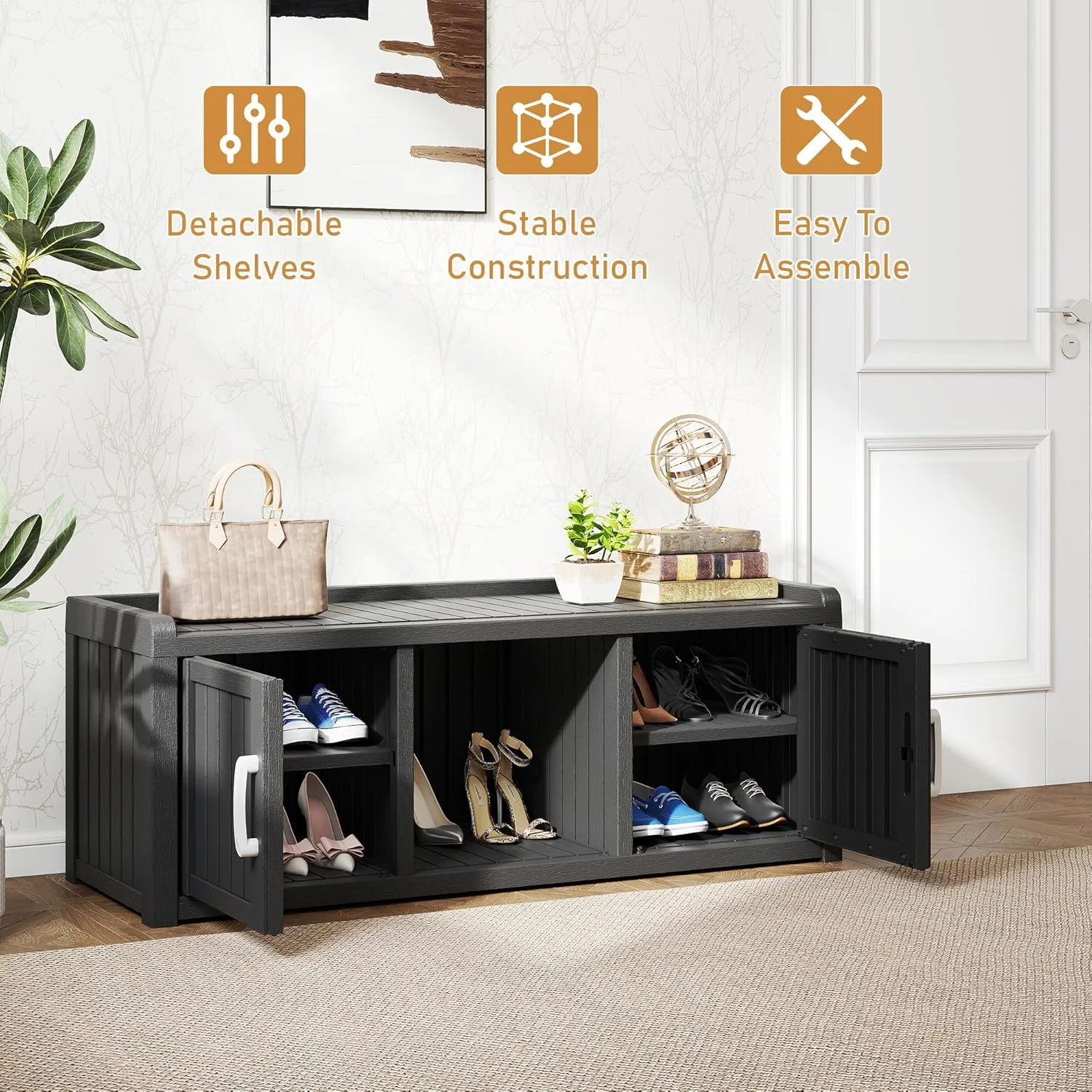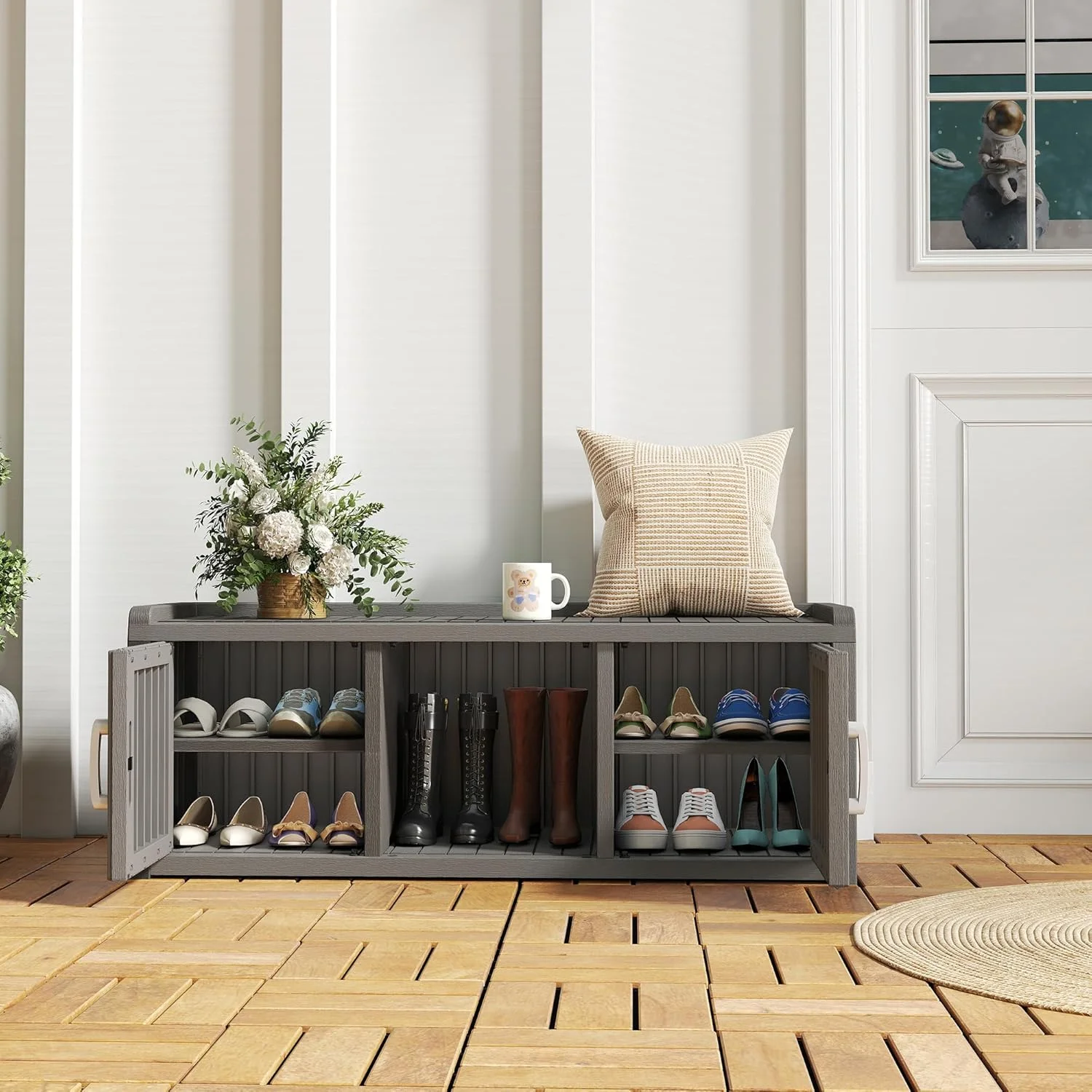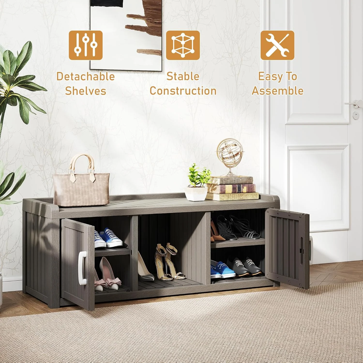 - ?Multi-Functional Storage Bench: More than just shoe storage! This versatile cabinet securely organizes hats, scarves, or household items. Its sturdy, stable construction safely doubles as a bench for putting on shoes.