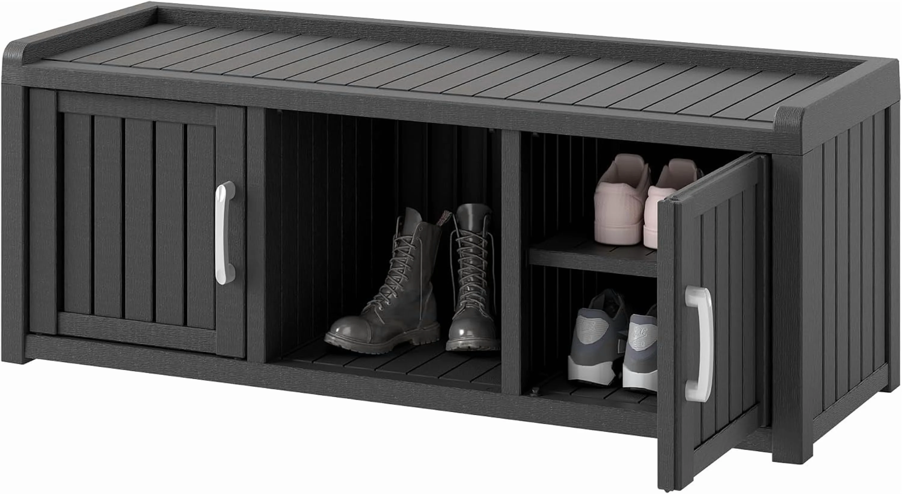KAMABOKO Outdoor Shoe Storage Cabinet, Waterproof UV - Resistant Entryway Storage Bench Indoor Outdoor with 2 Barn Doors, Adjustable Shelves for Entryway, Bedroom, Hallway, Living Room(Black)