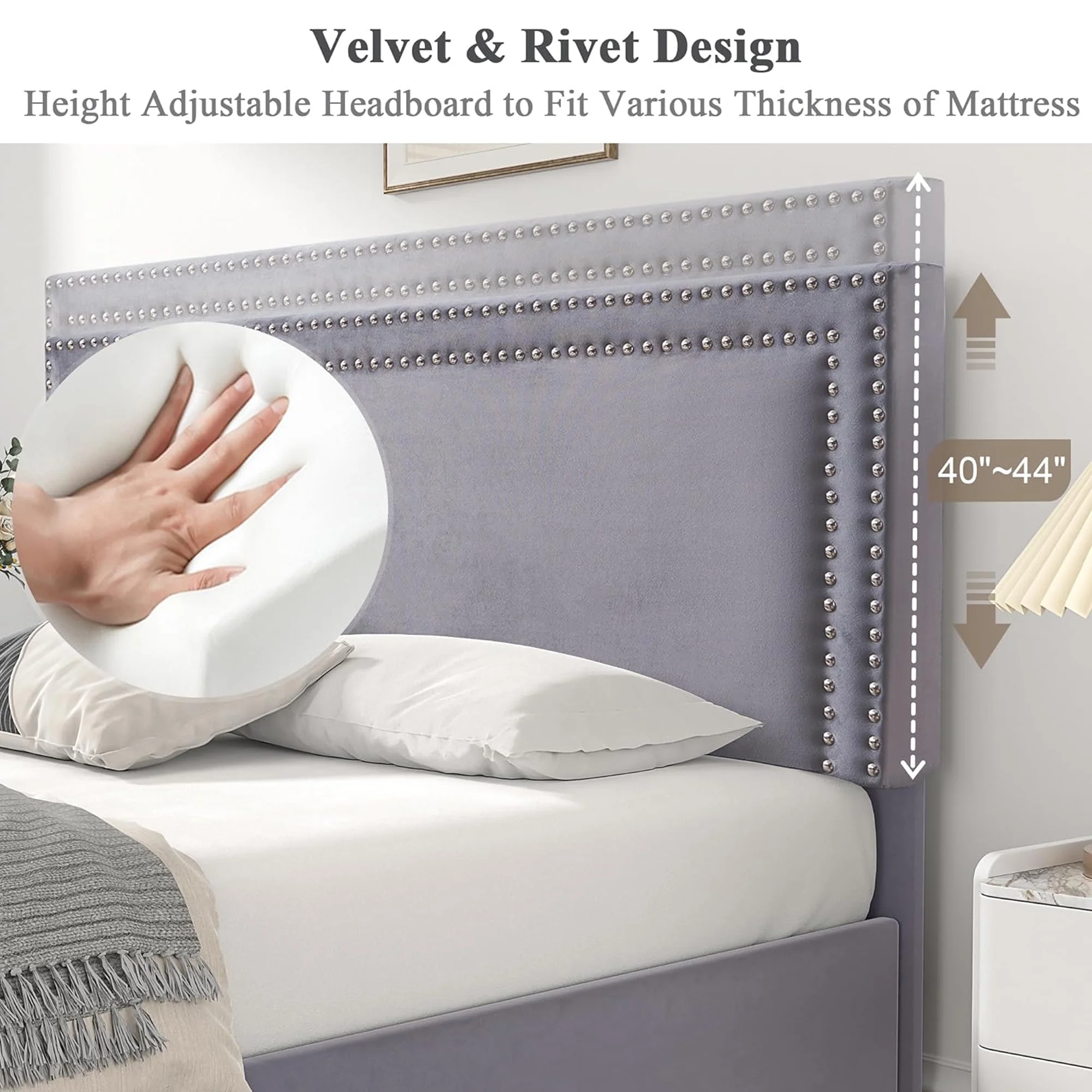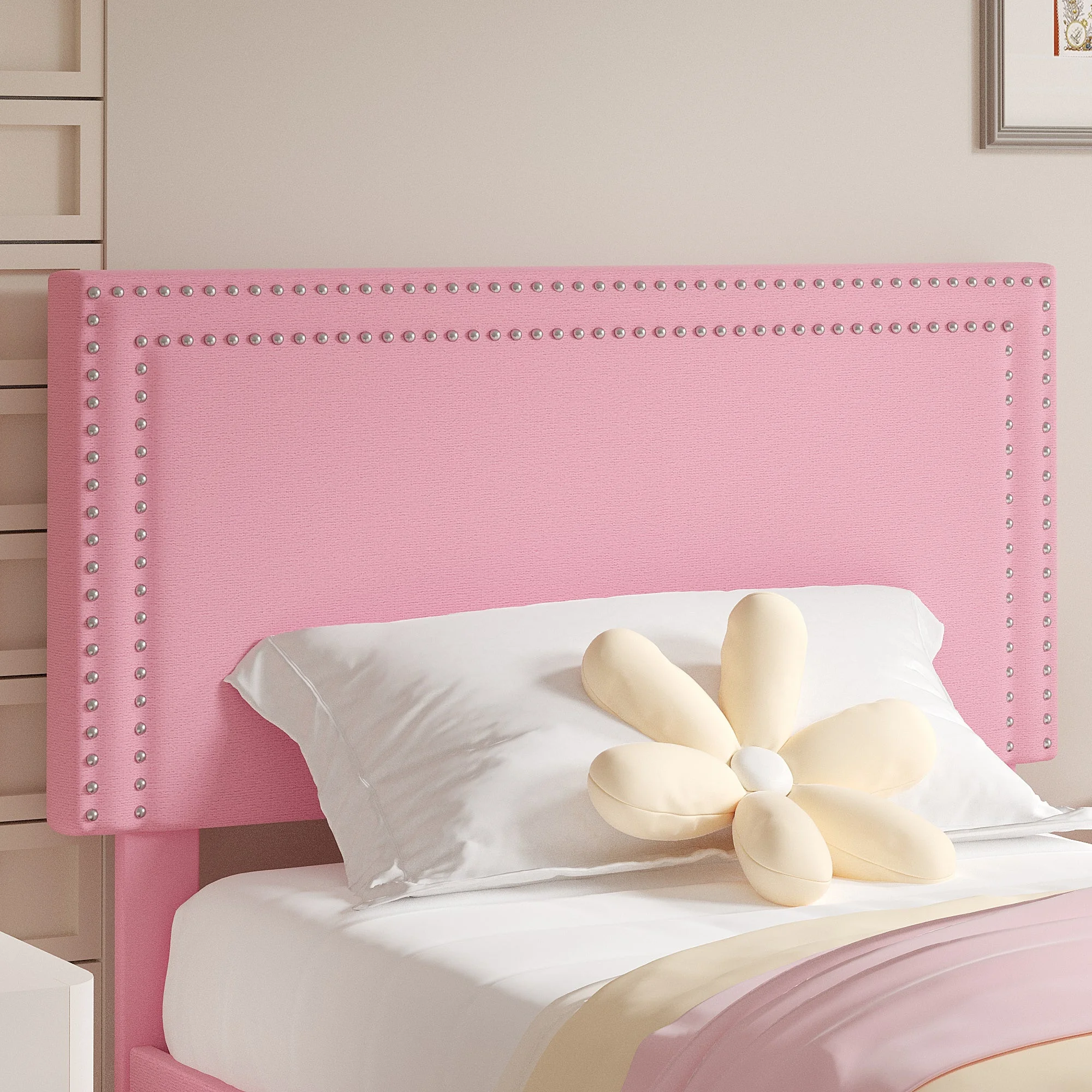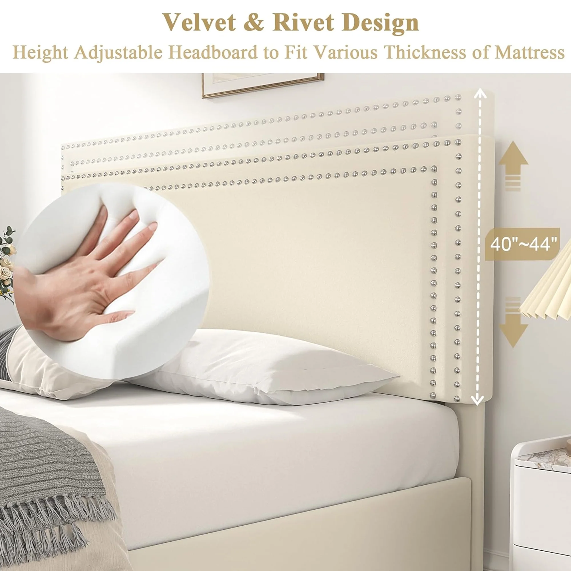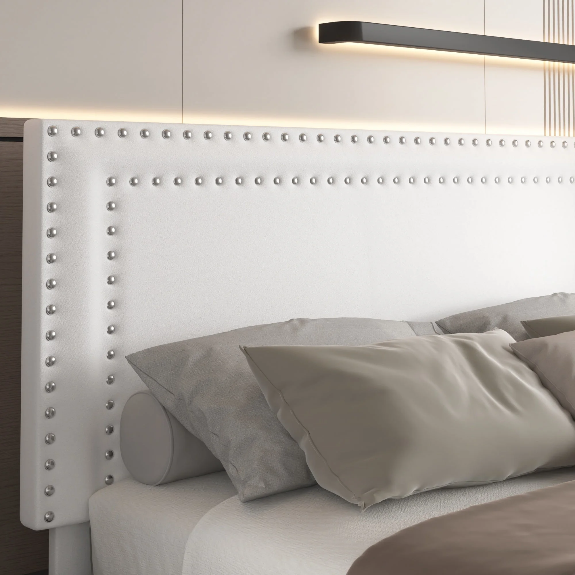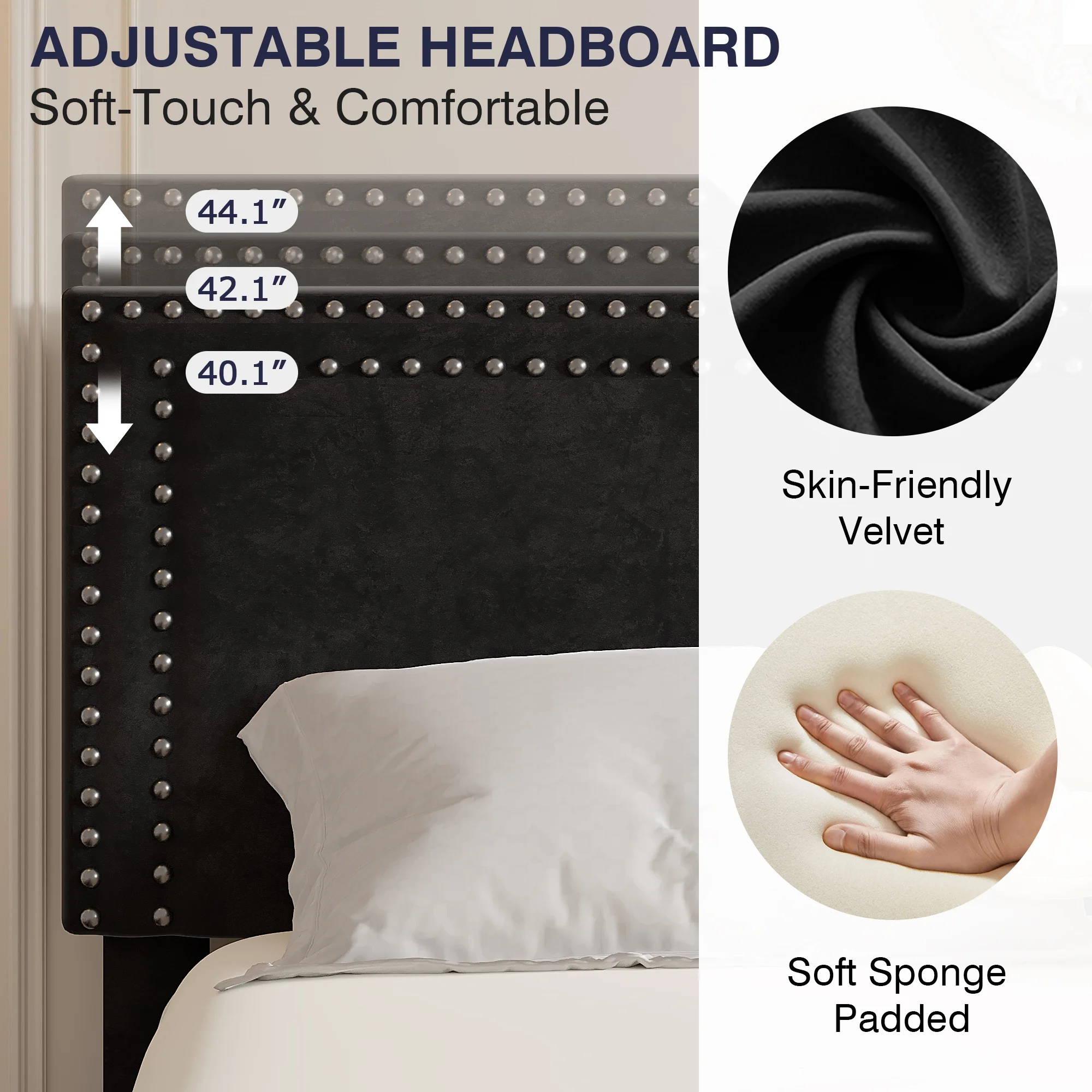 - [Upholstered Adjustable Headboard]: The curved button tufted headboard with nailhead trim can be adjusted different heights to suit your different mattress better. Perfect for reading or watching TV in bed while leaning on it comfortably. Covered with linen fabric which is breathable for long time use.
