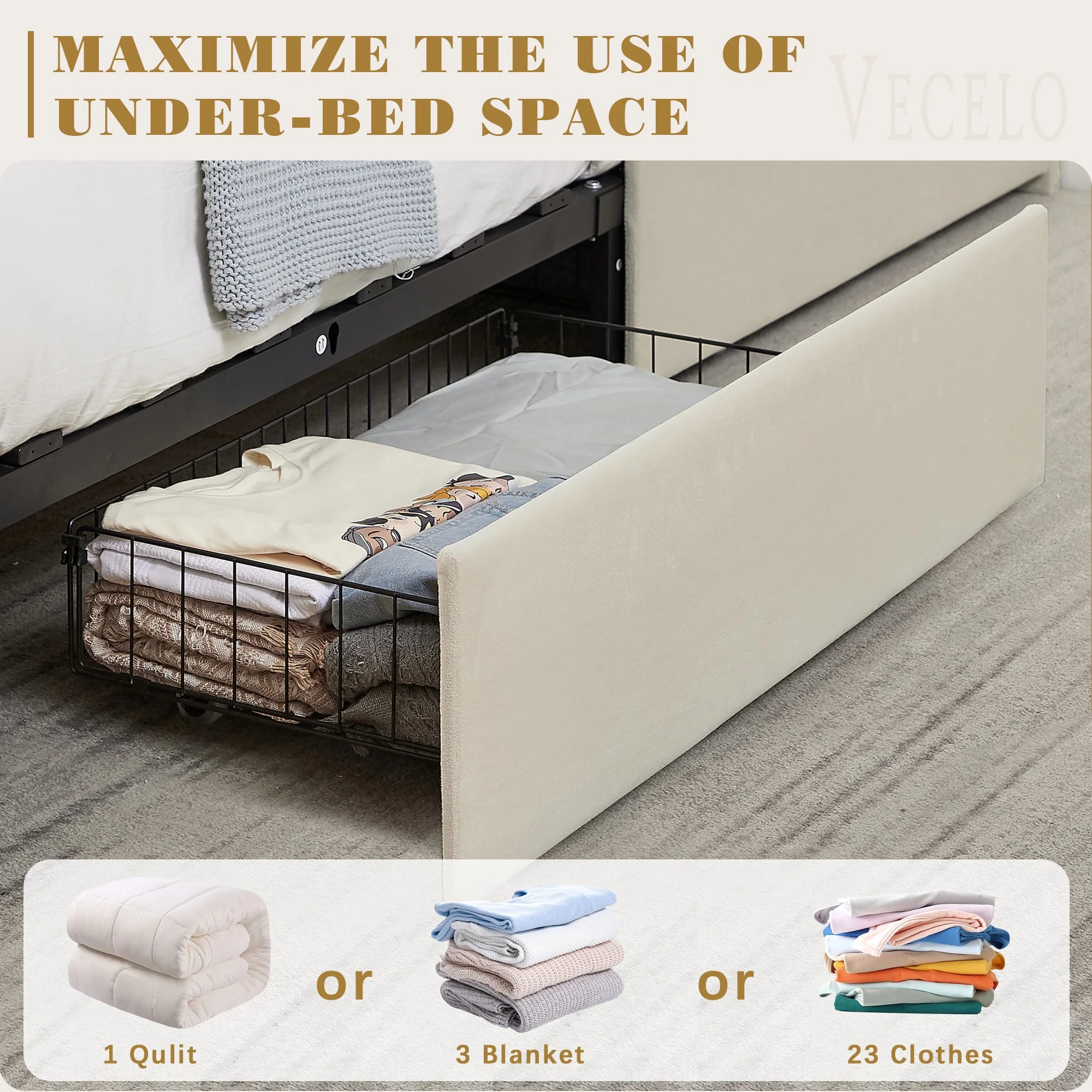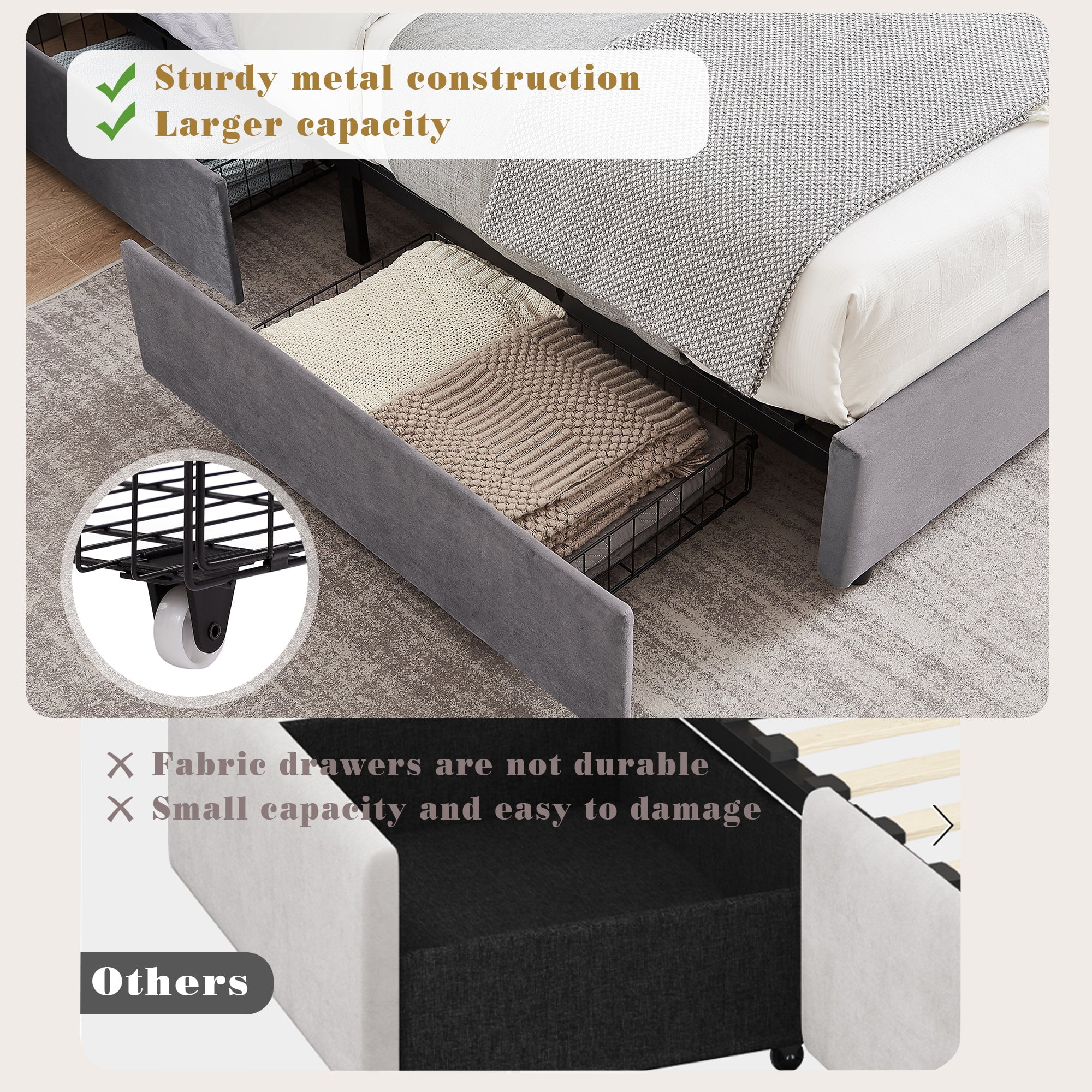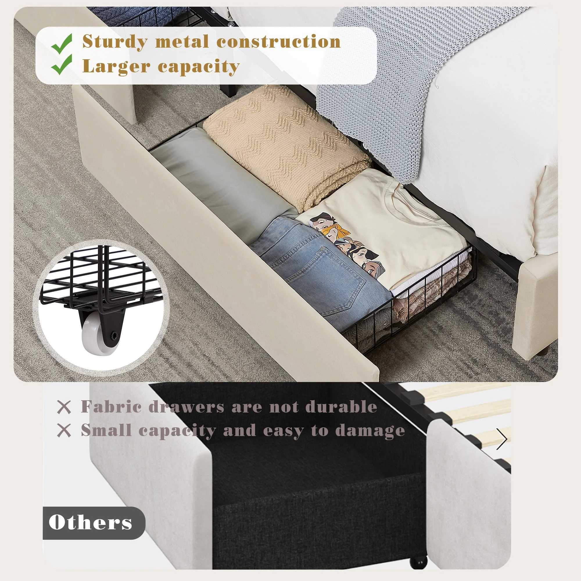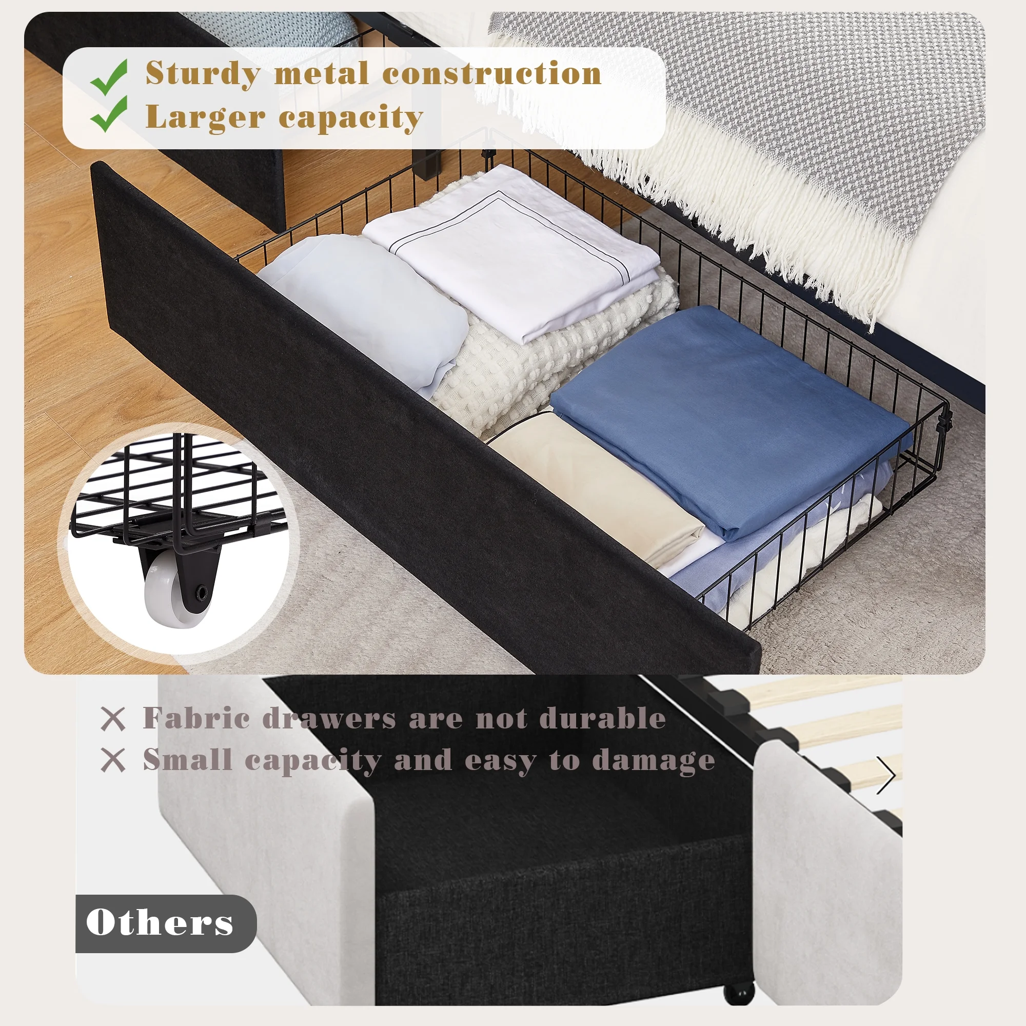 - [Storage Bed with 4 Large Drawers]: Four large slide-out drawers underneath the bed frame provide the perfect storage space for bed linen, clothing, etc. Each drawer is equipped with wheels for easy sliding in and out.