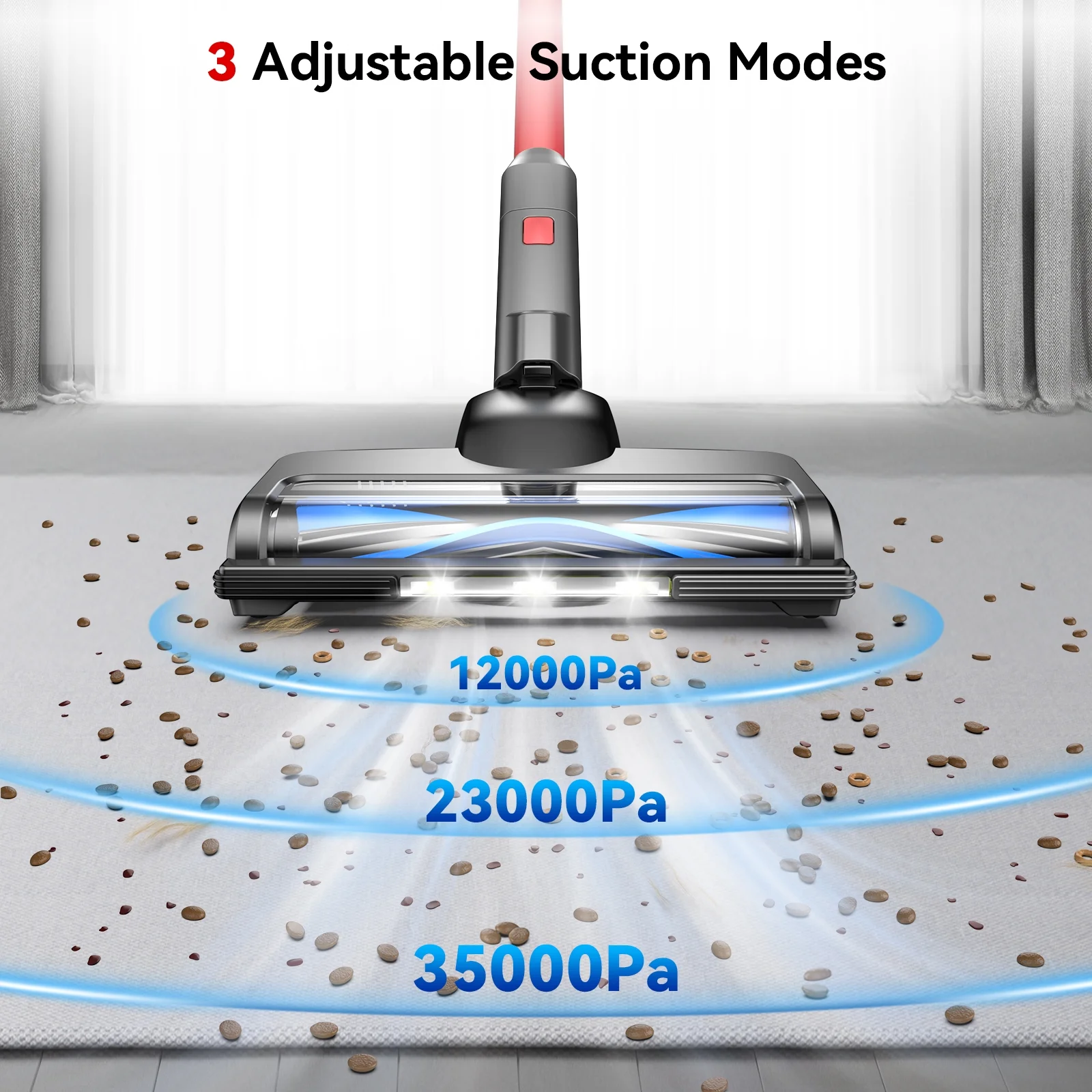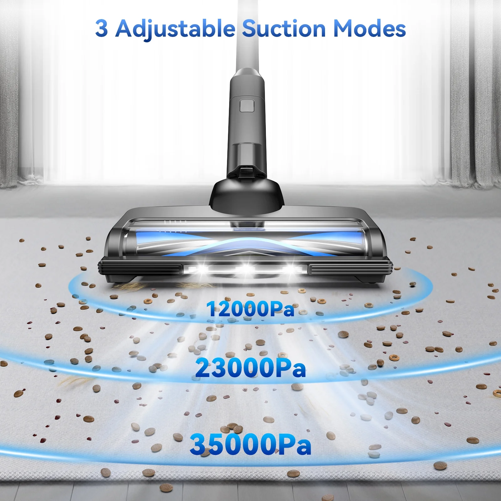 - ?�� 35KPA Ultra-Strong Suction ���C Deep cleans carpets, pet hair, and stubborn debris (dog food, cereal) with 3 adjustable modes (12KPa/23KPa/35KPa). Max mode tackles embedded dirt, while min mode extends runtime to 50 mins for daily dusting.