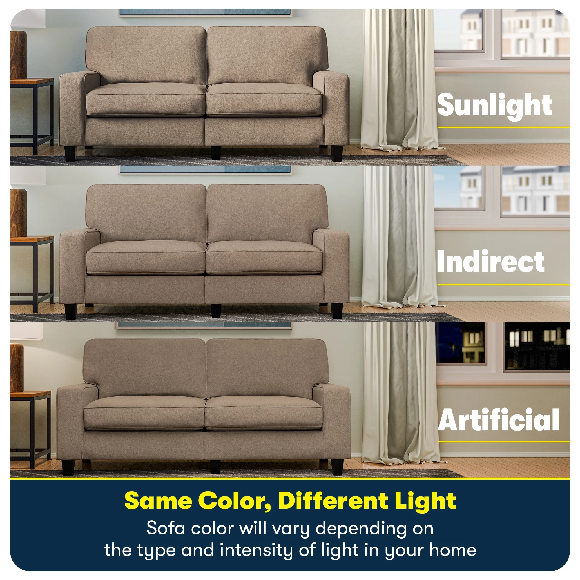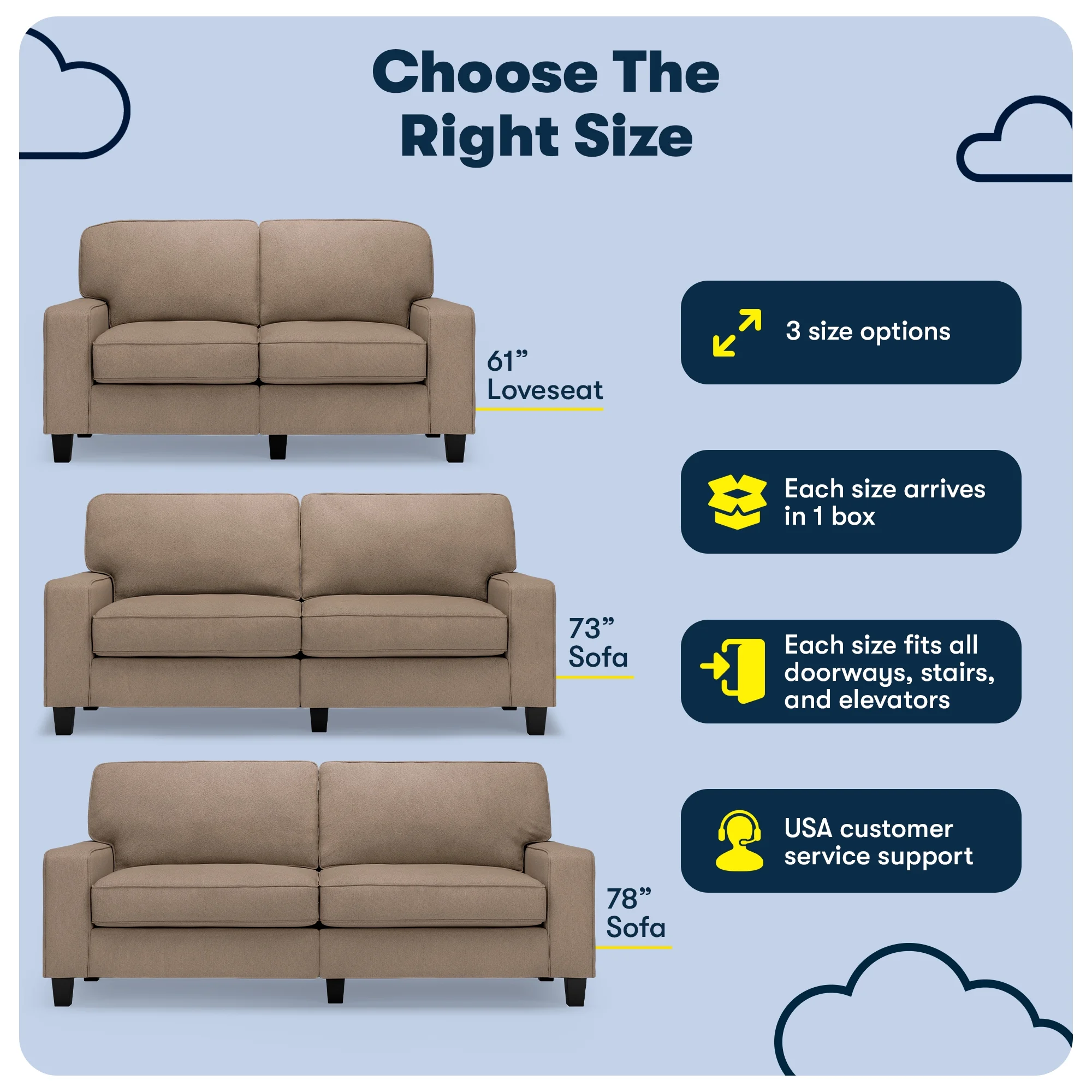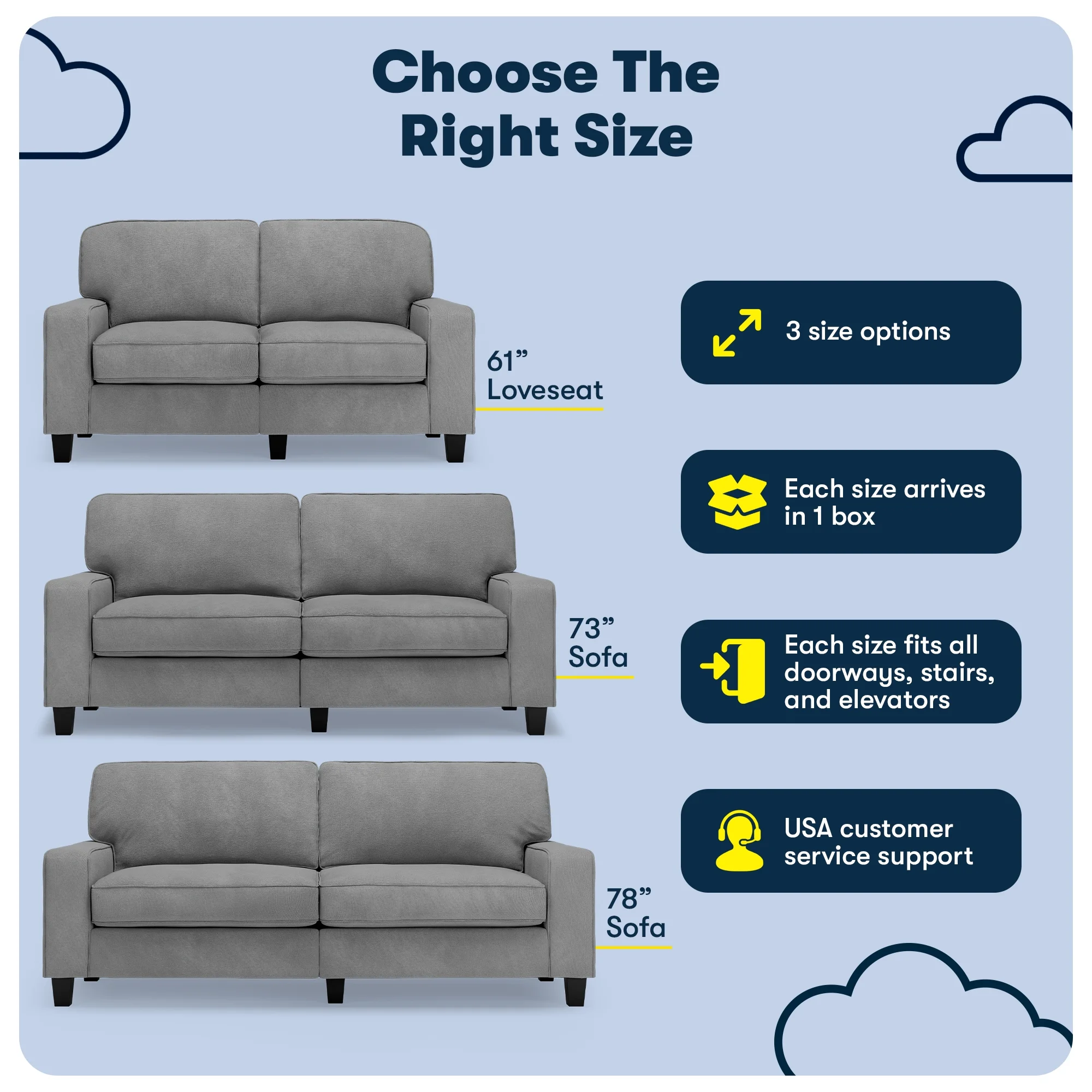 Whether you're furnishing your first home or seeking a space-saving solution for your existing space, Serta delivers. Our conveniently packaged sofas arrive directly at your door in one carton, and they provide the perfect blend of style and comfort you've come to expect from Serta. Don't let living in a modestly sized apartment, or being on a managed budget, be the limiting factors to creating a welcoming home. The Serta Palisades collection is designed specifically for smaller living spaces, offering 61", 73" and 78" length options. With a seat depth of 20.5" you can still relax comfortably without the sofa taking up too much space. However, this means the sofa's proportions are better-suited for users under 6 feet tall. The unopened box will fit any doorway, hall, stairwell, or elevator. Once in your home, it will thrive in smaller living rooms or home offices, but is a versatile choice for dorms, kid��s rooms, den, and family rooms. Plus, its low-profile will make any smaller space feel open and airy, giving the freedom to mix and match with other furniture pieces. This inviting sofa features clean lines and track arms for a timeless look. Upholstered in an anti-pilling polyester fabric or durable bonded leather, the Palisades is easy to care for and spills are simple to clean. 16 color options are available to complement your d��cor. Please note that the actual color may differ slightly from what appears online depending on the amount of light and the positioning of the sofa in any space. Soft pillow backs, generously filled with soft fibers, rest against a backrest with structured webbing to keep things comfortable and supportive. The seat cushions are filled with high-density, non-recycled Serta quality foam, which cover individually wrapped pocket coils for a supportive core and semi-plush sit. Welcome the Serta Palisades Sofa into your home for modern style and comfort with space-saving functionality. Lounging or relaxing has never been so convenient.
