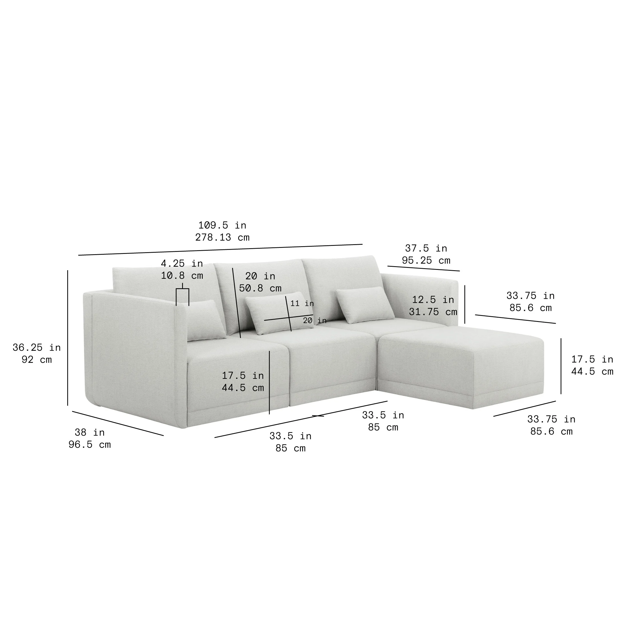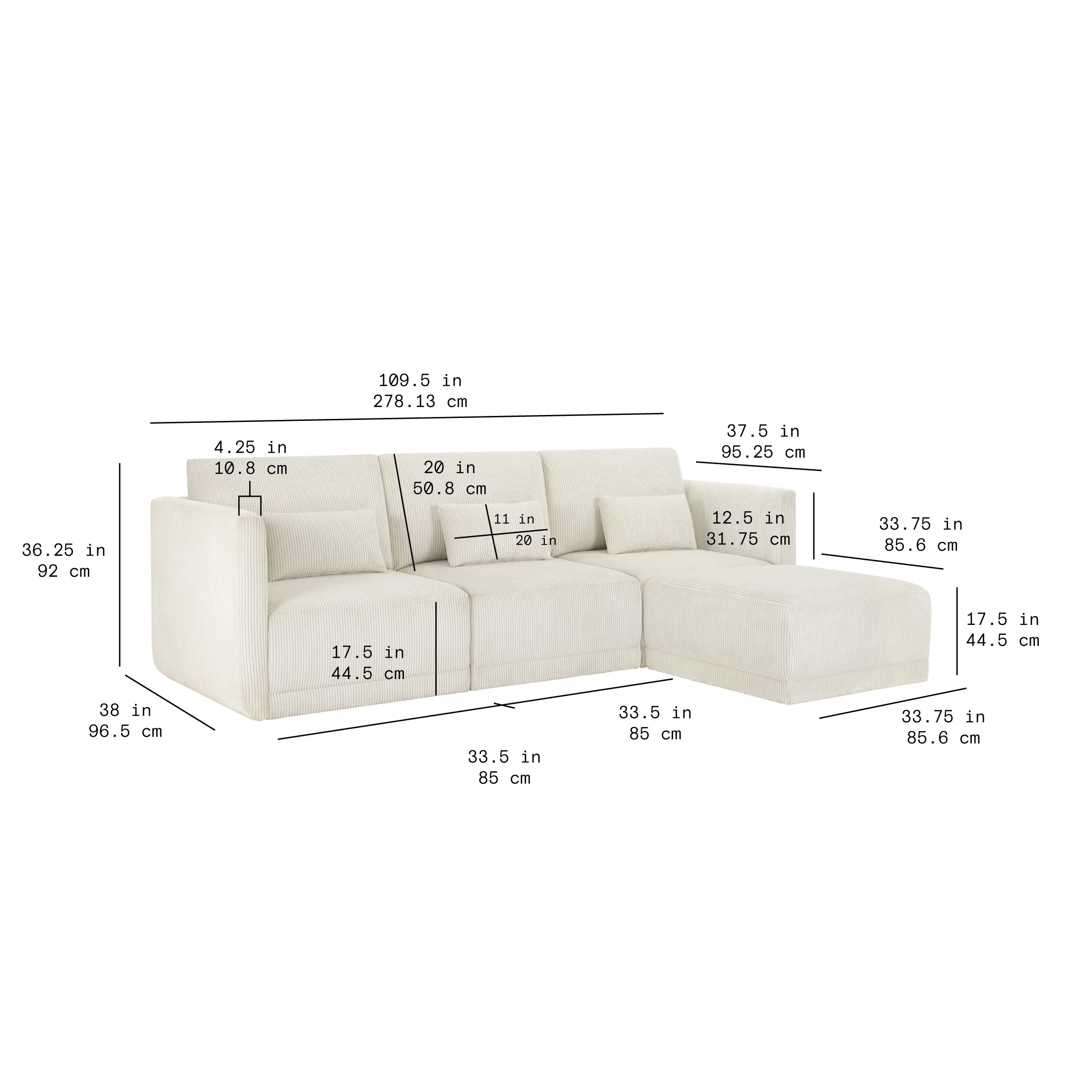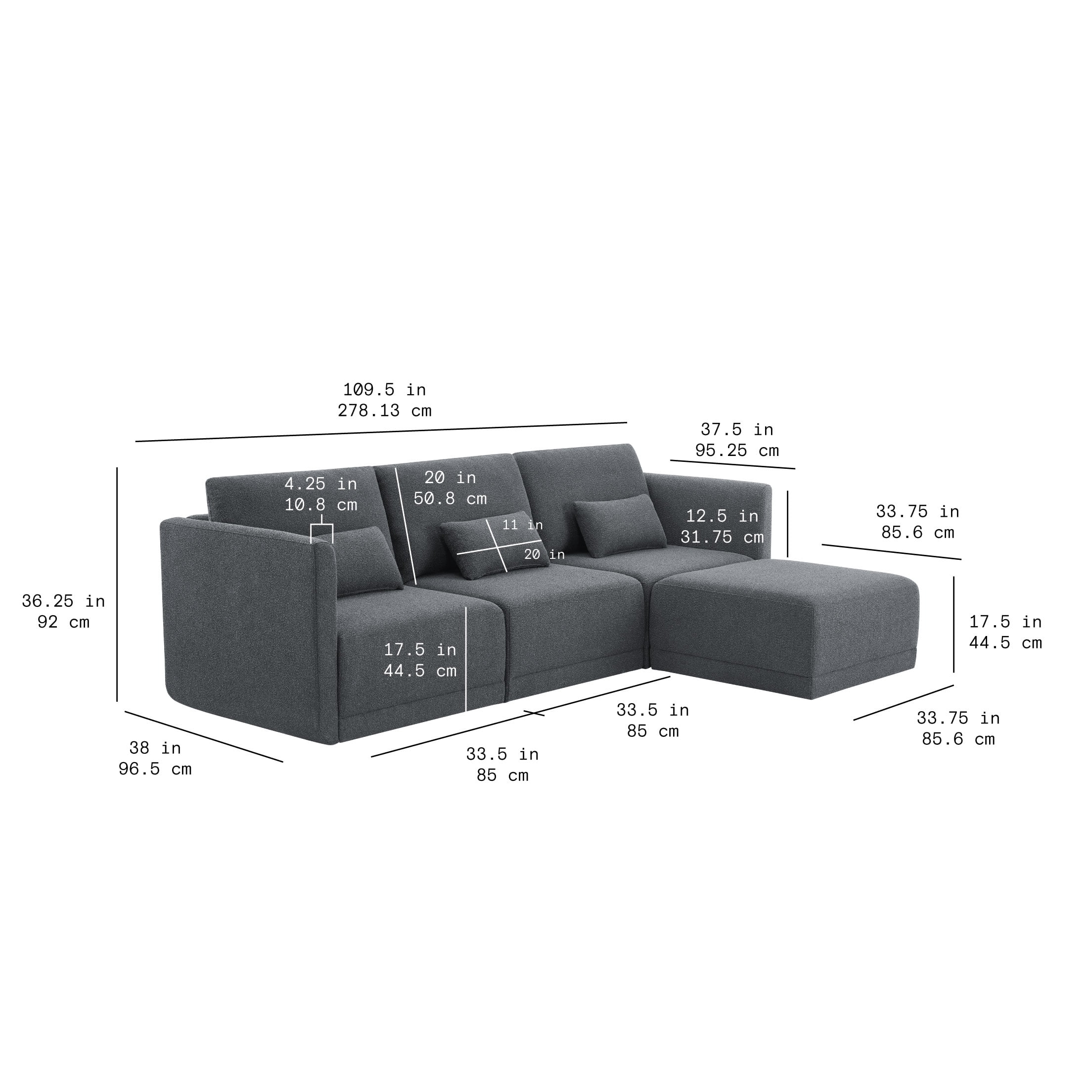 - Sofa Dimensions: 109.5 in W x 38 in D x 36.25 in H