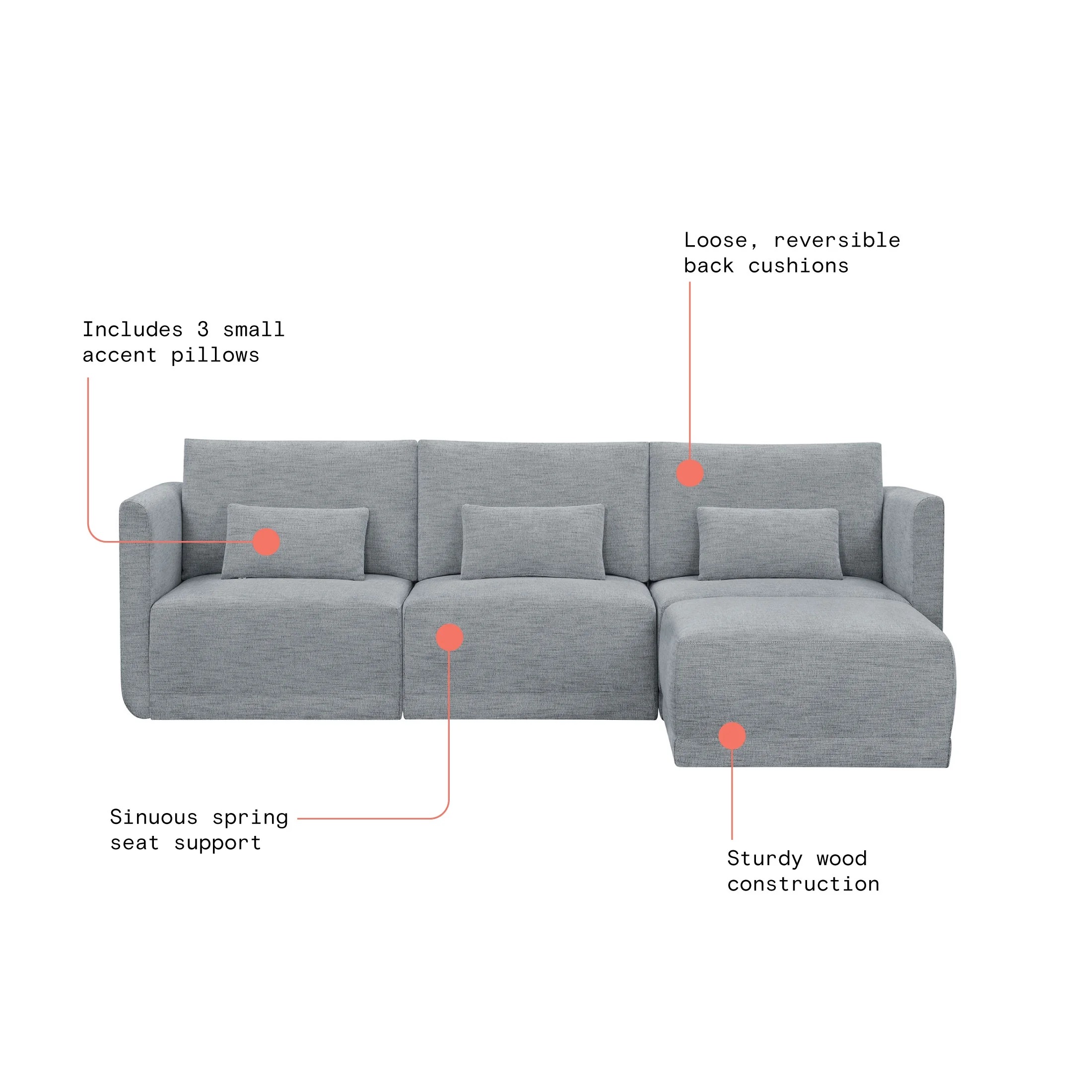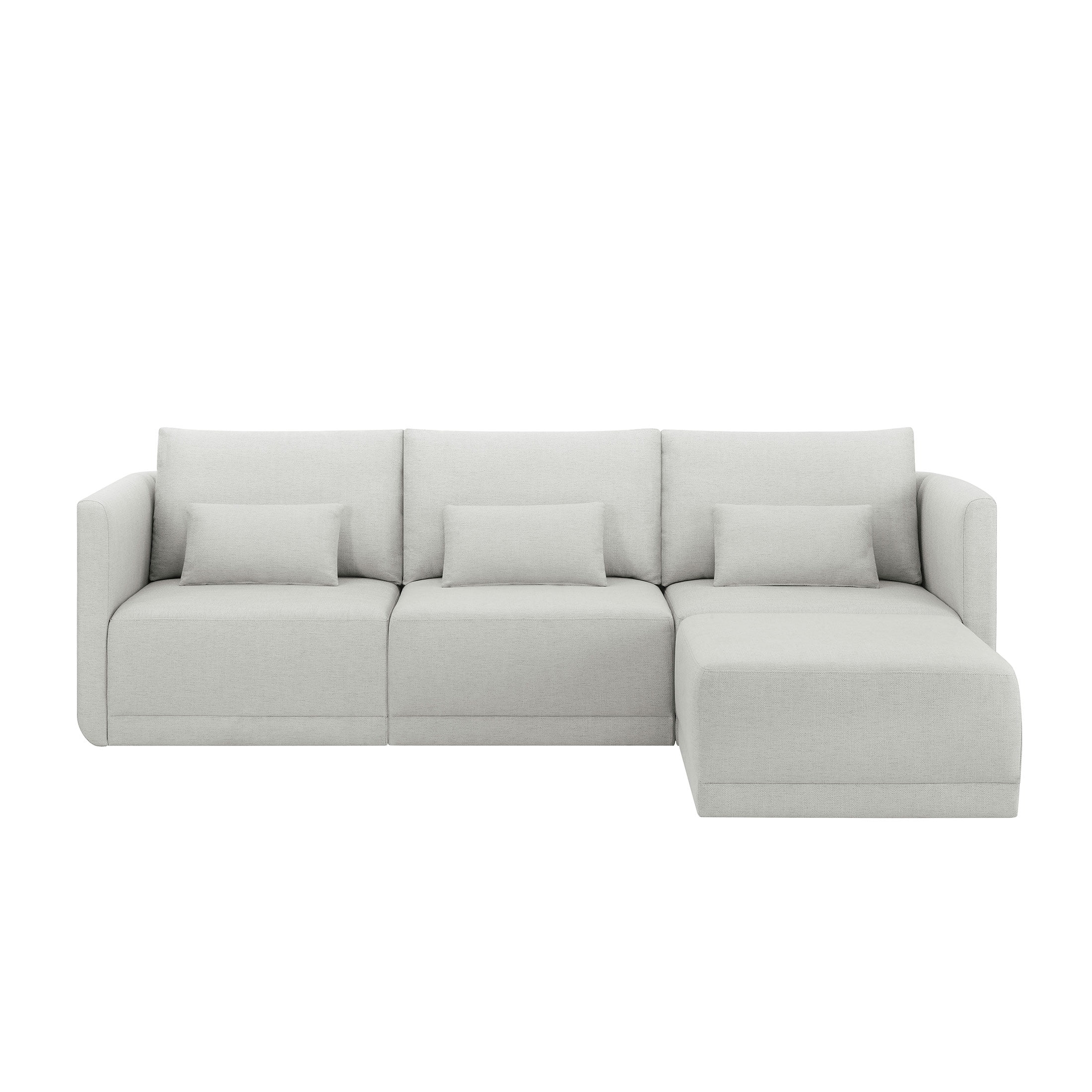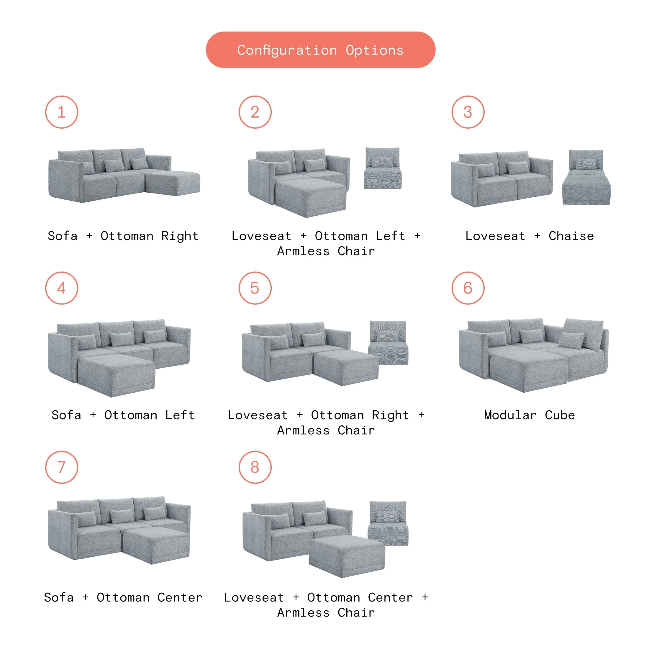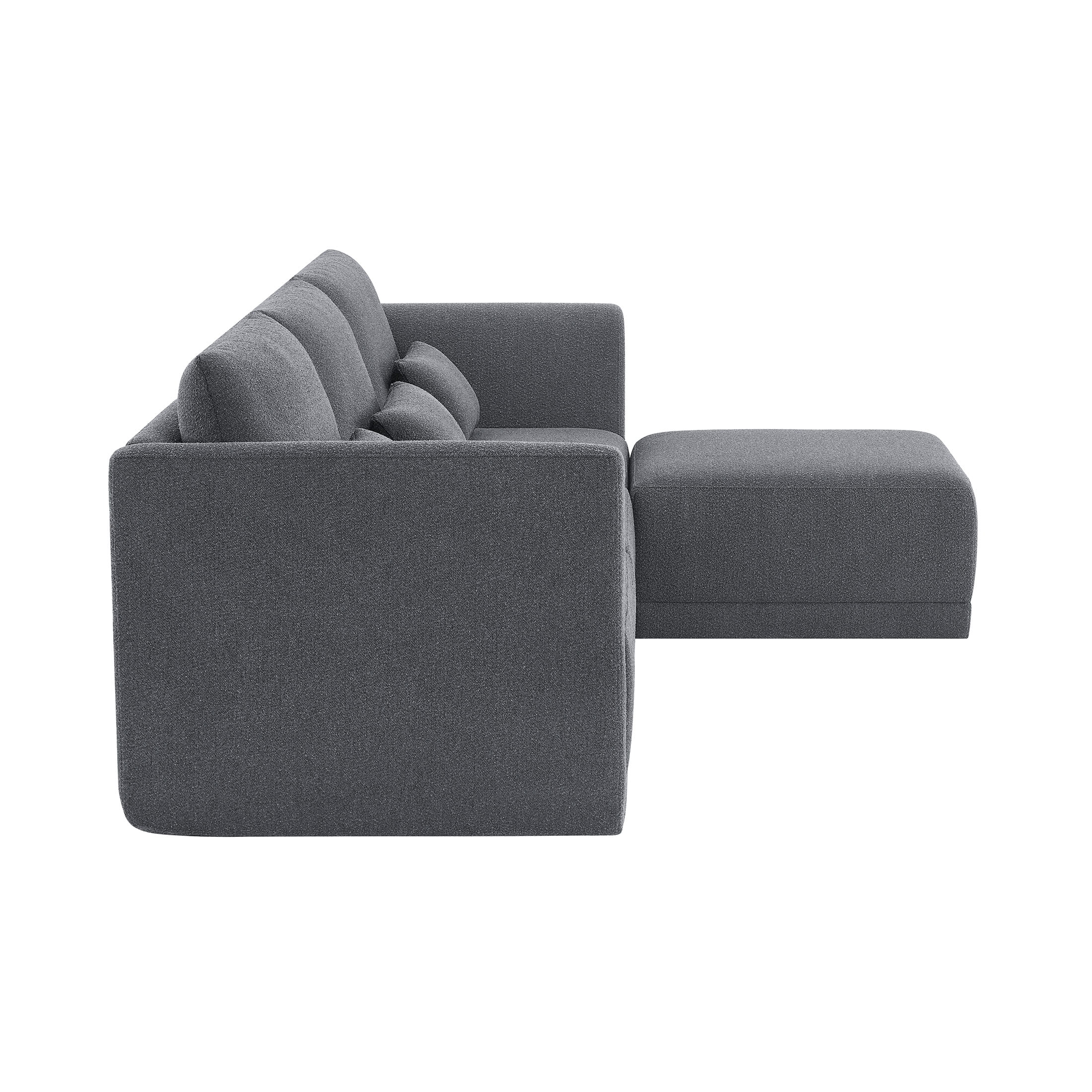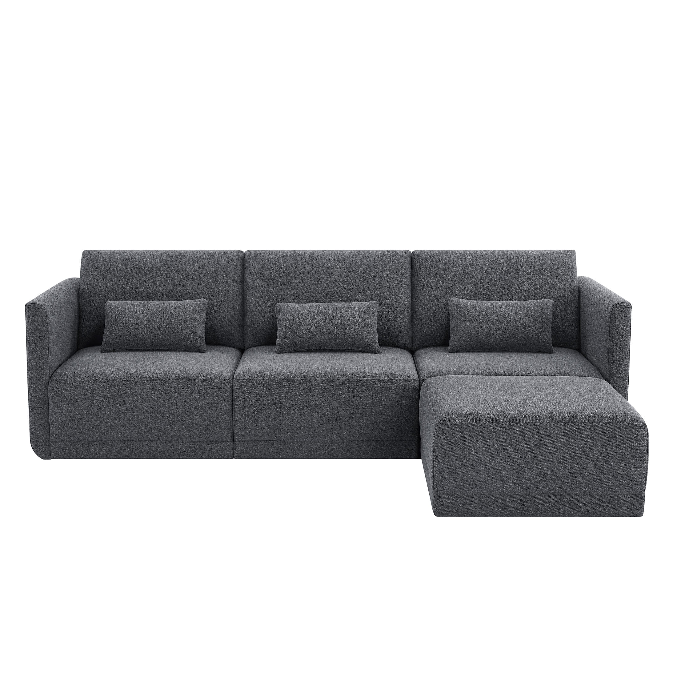 - Includes left wedge, armless chair, right wedge, ottoman and 3 small gray accent pillows
