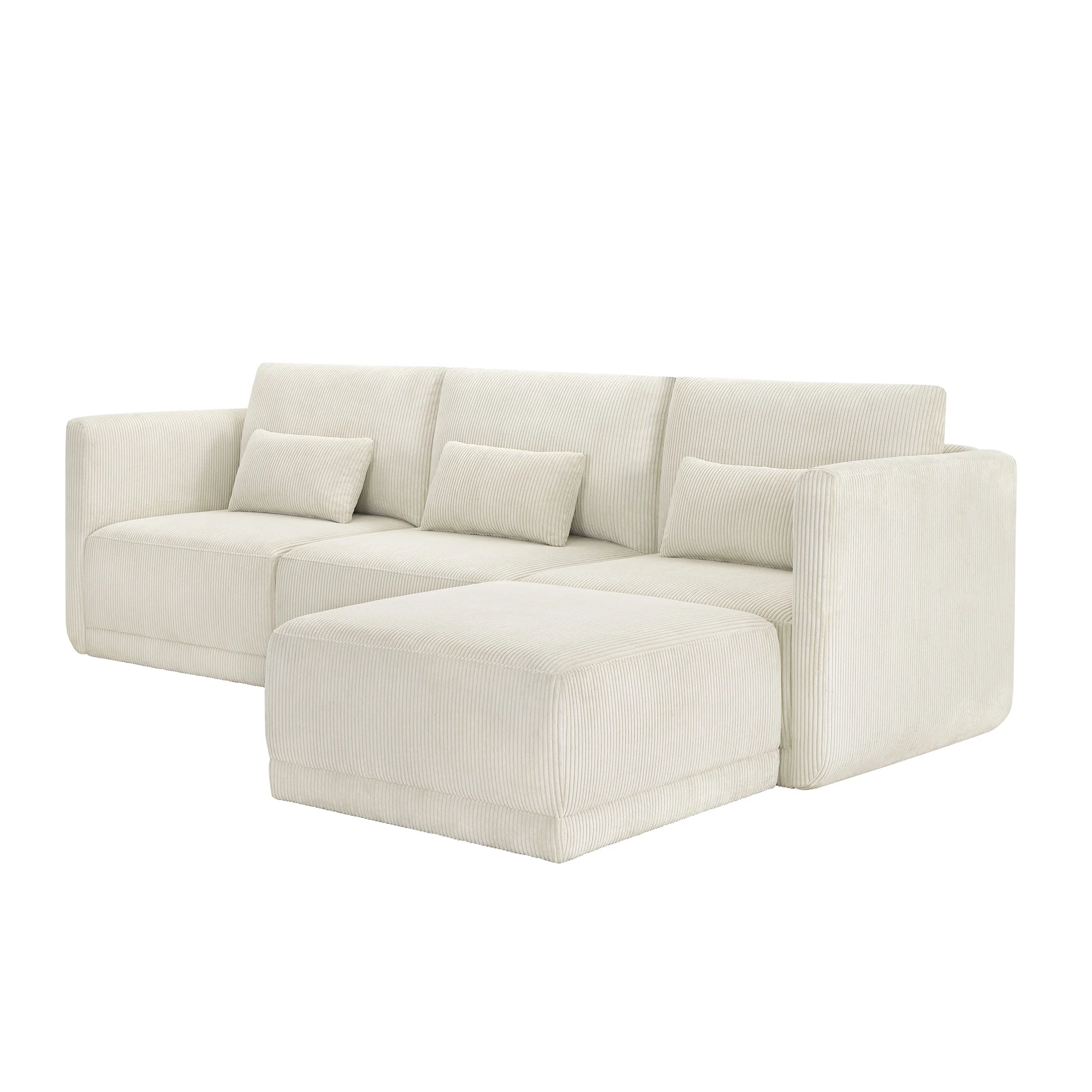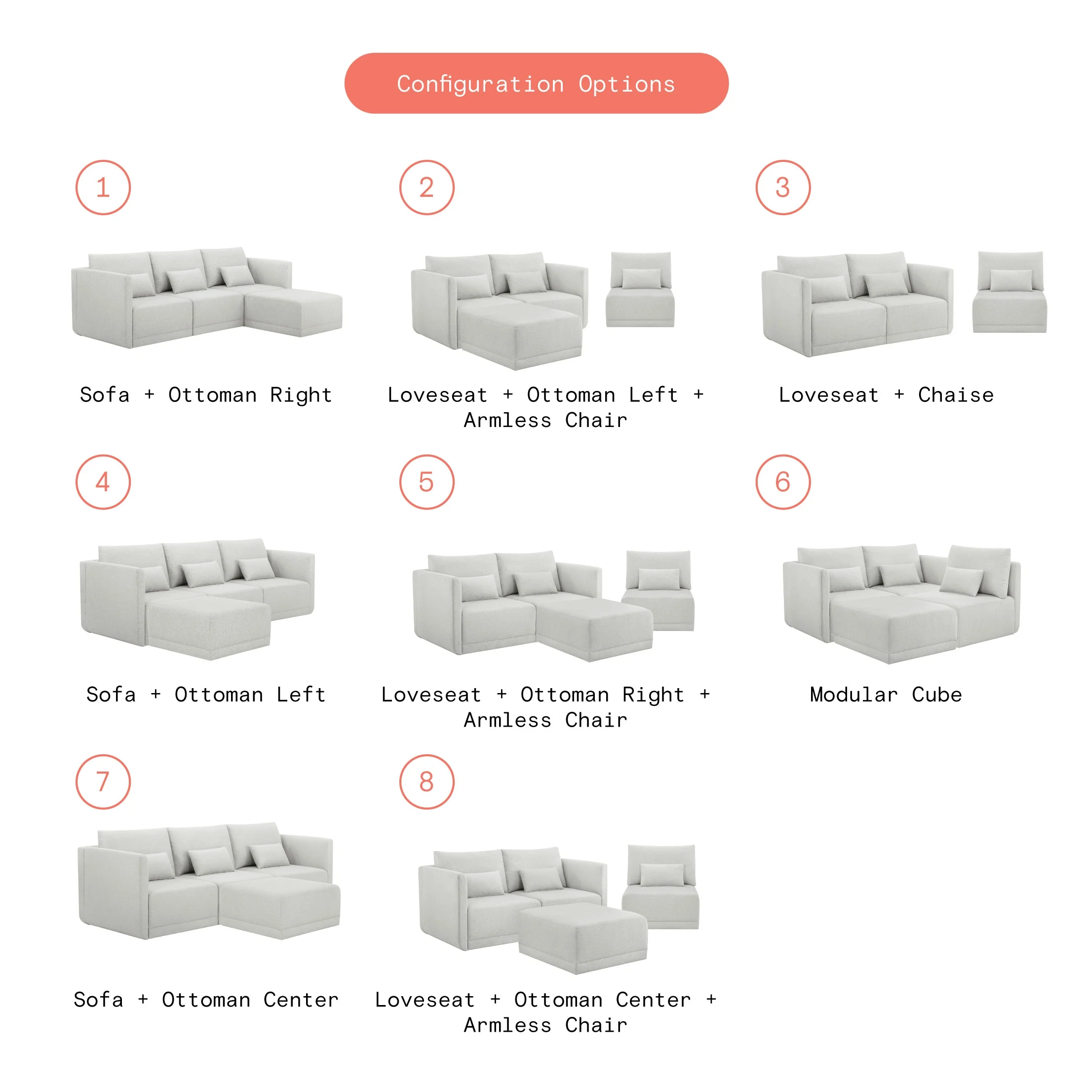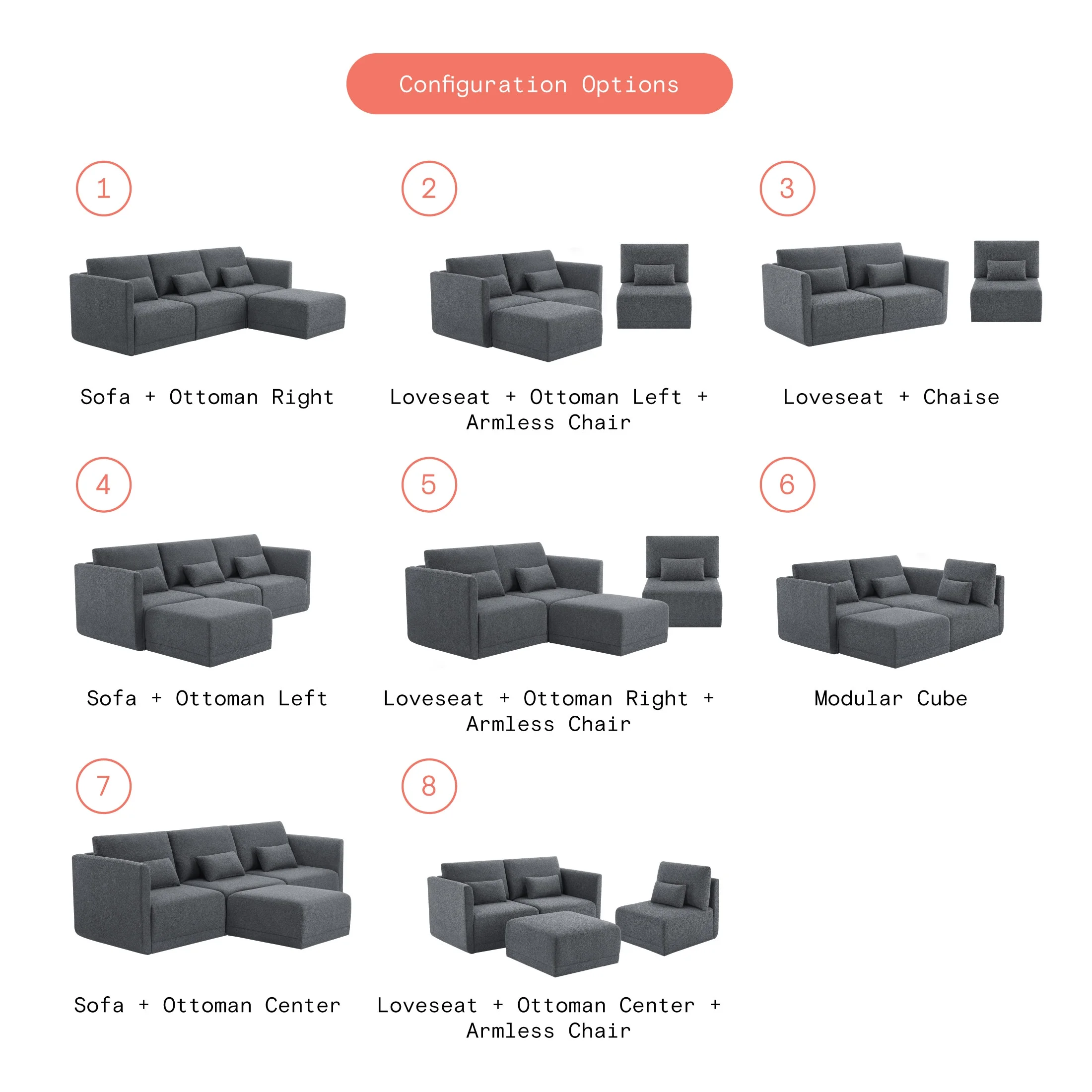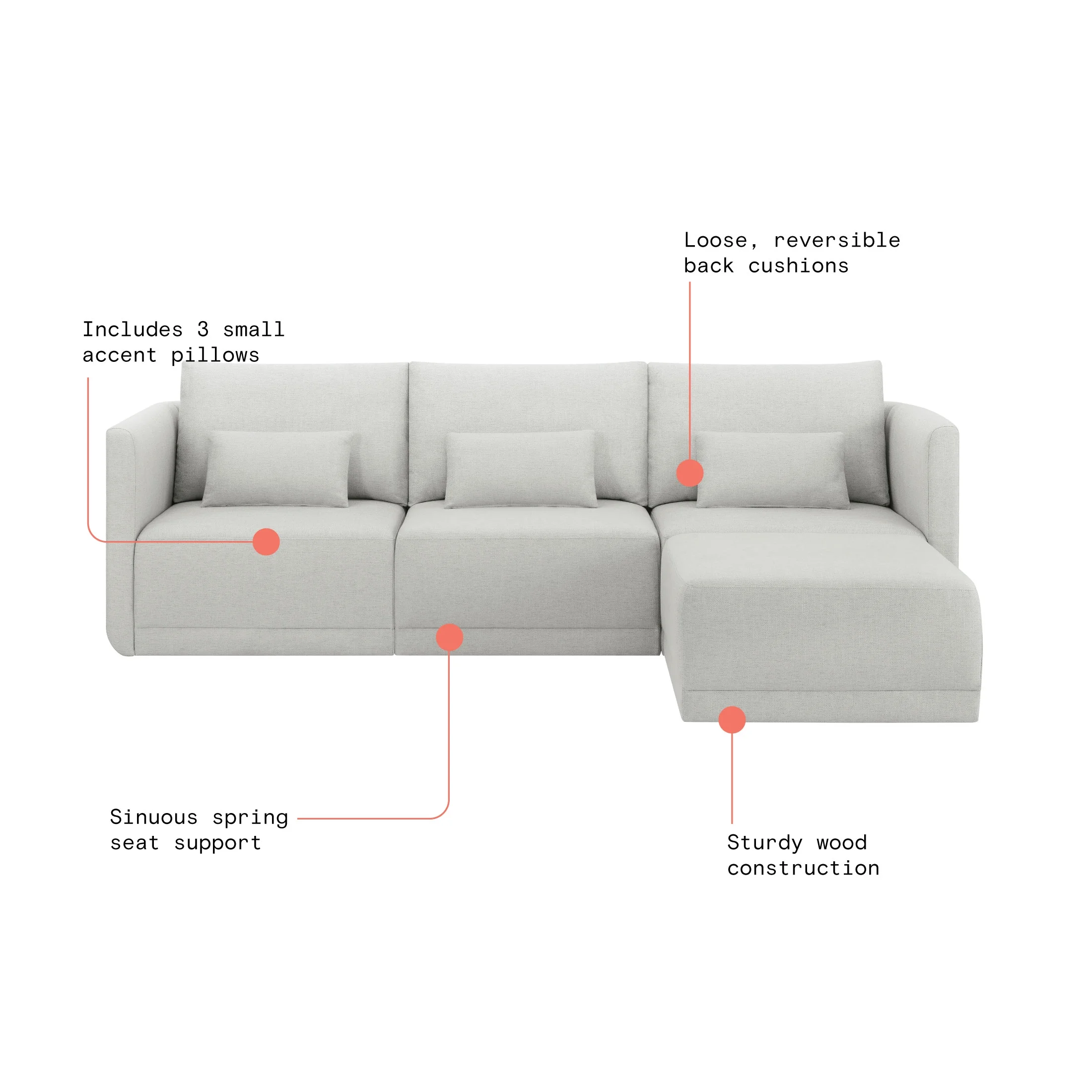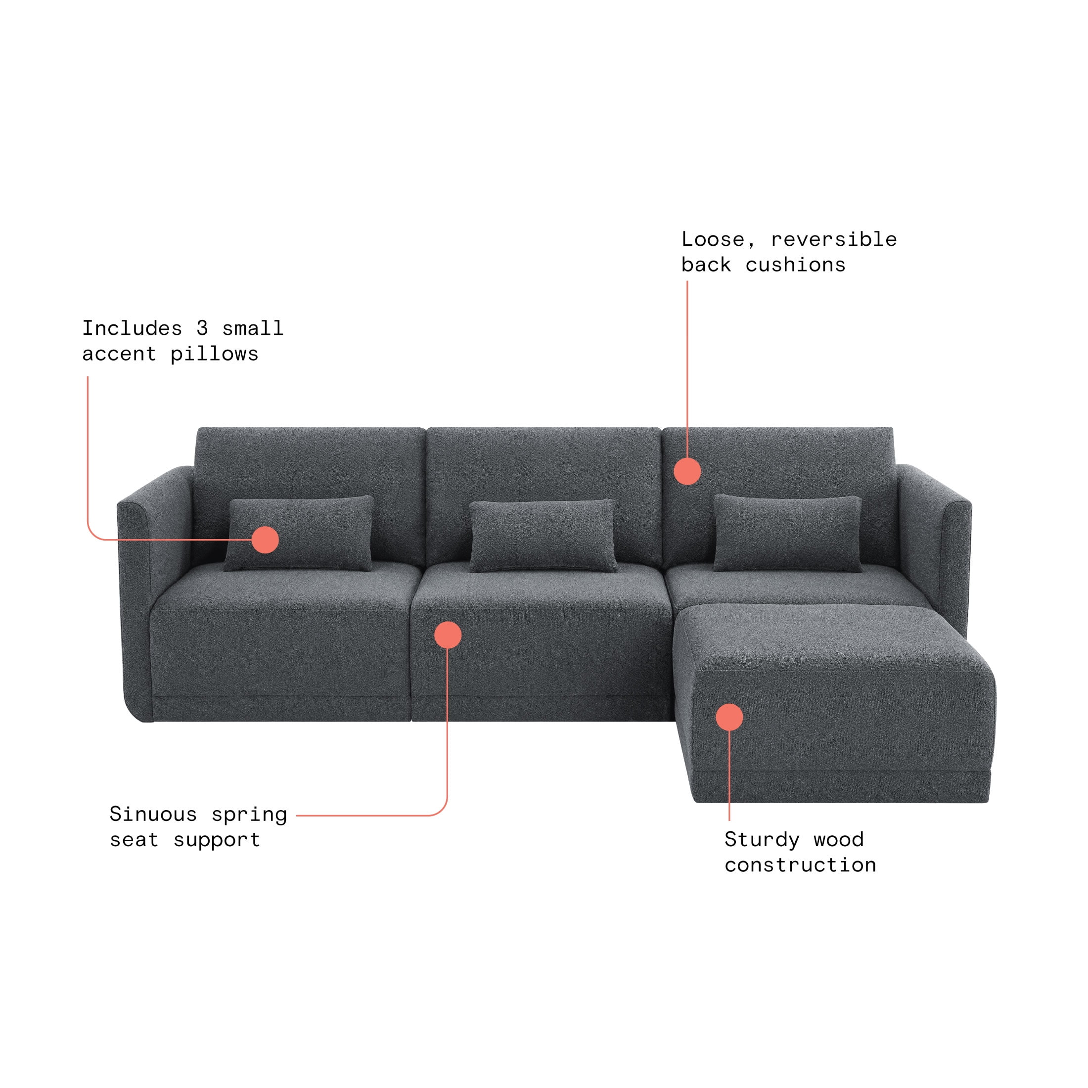 - Includes left wedge, armless chair, right wedge, ottoman and 3 small gray accent pillows