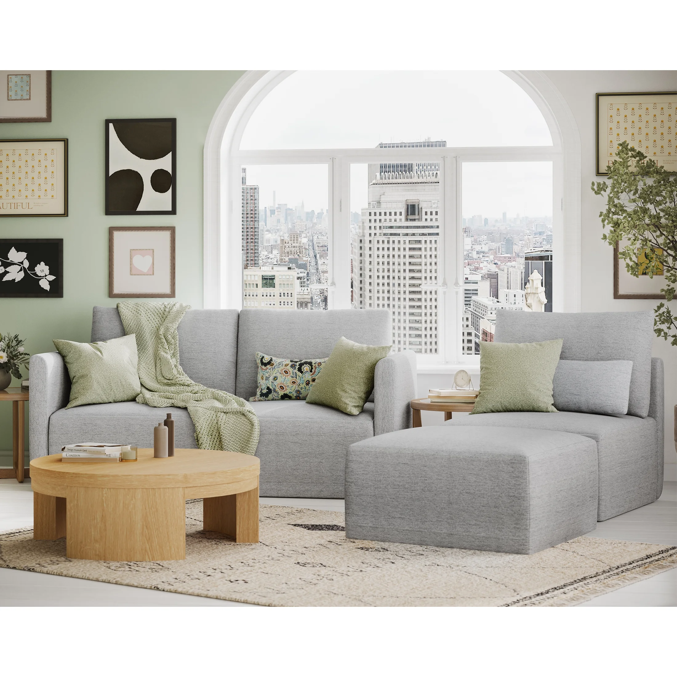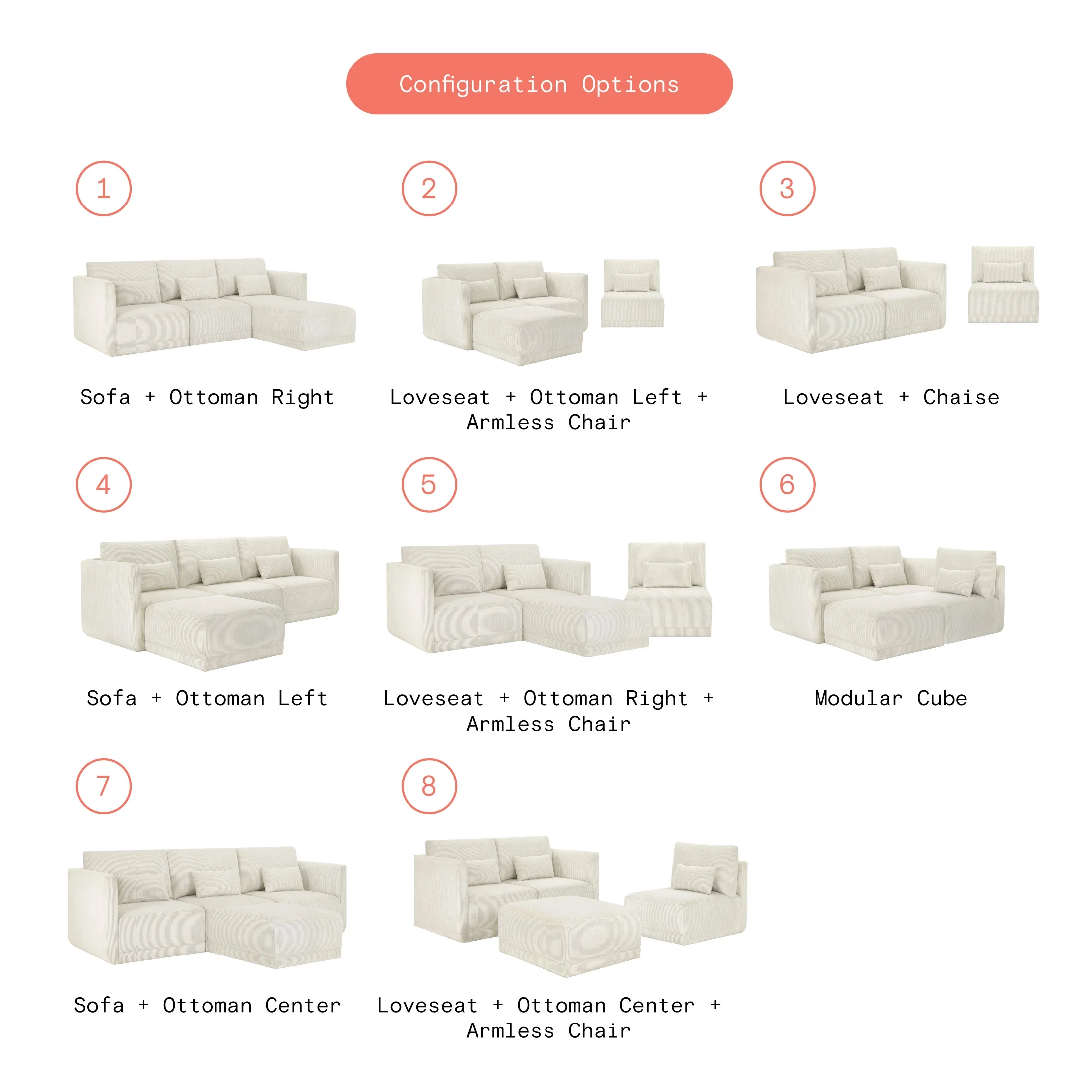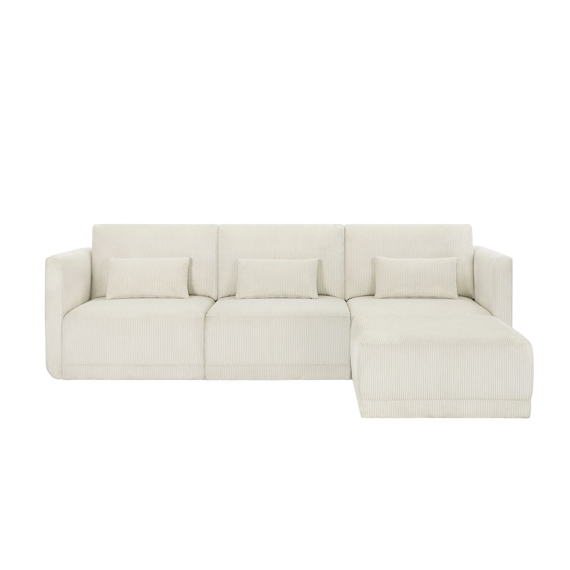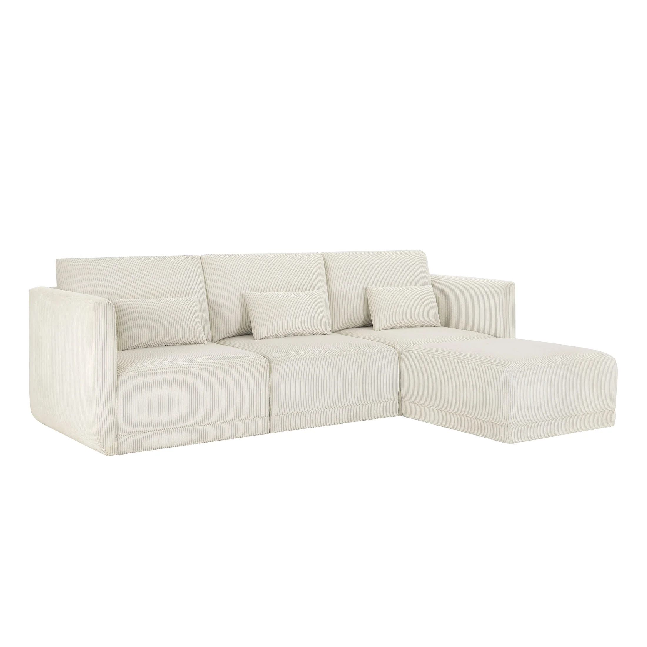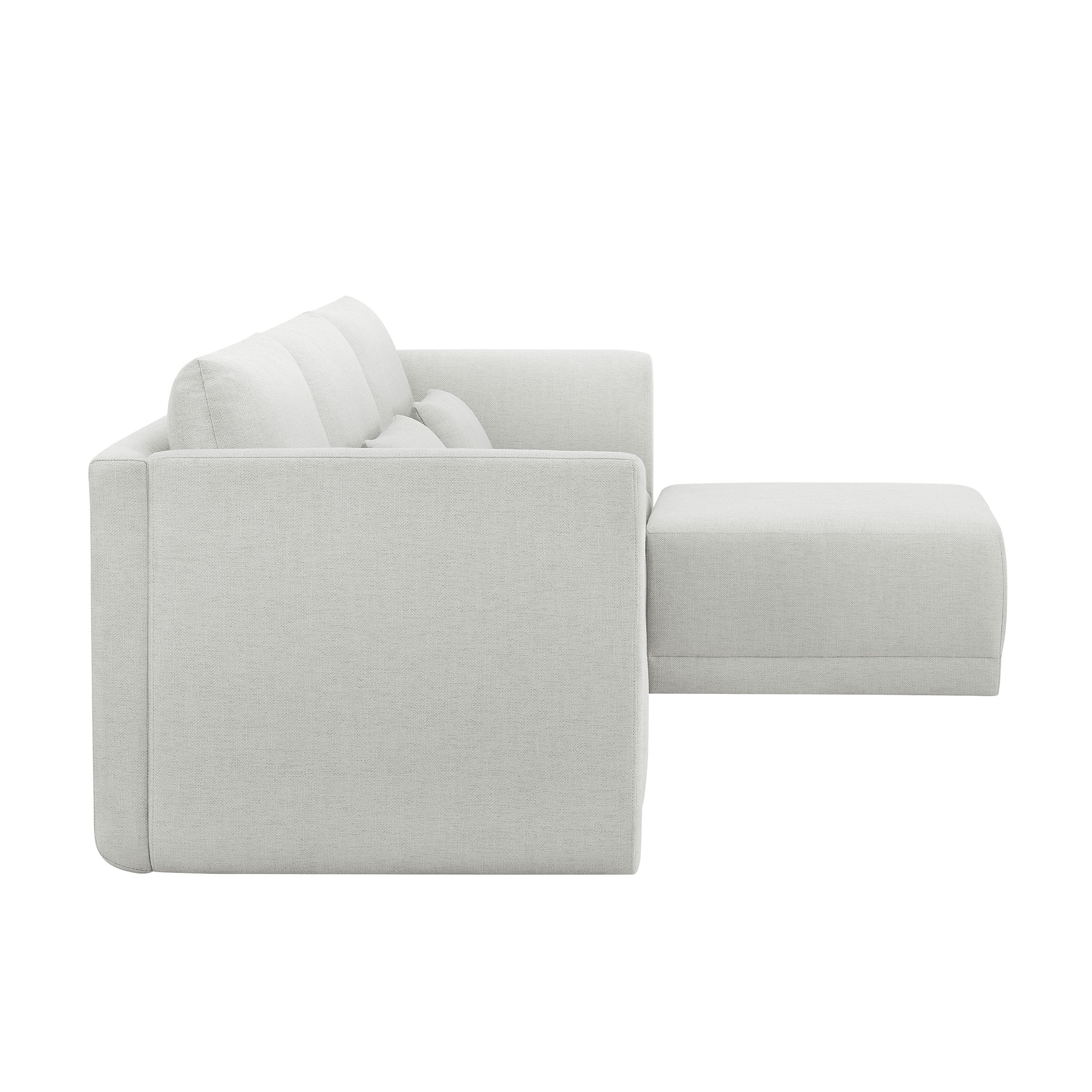 - Includes left wedge, armless chair, right wedge, ottoman and 3 small gray accent pillows