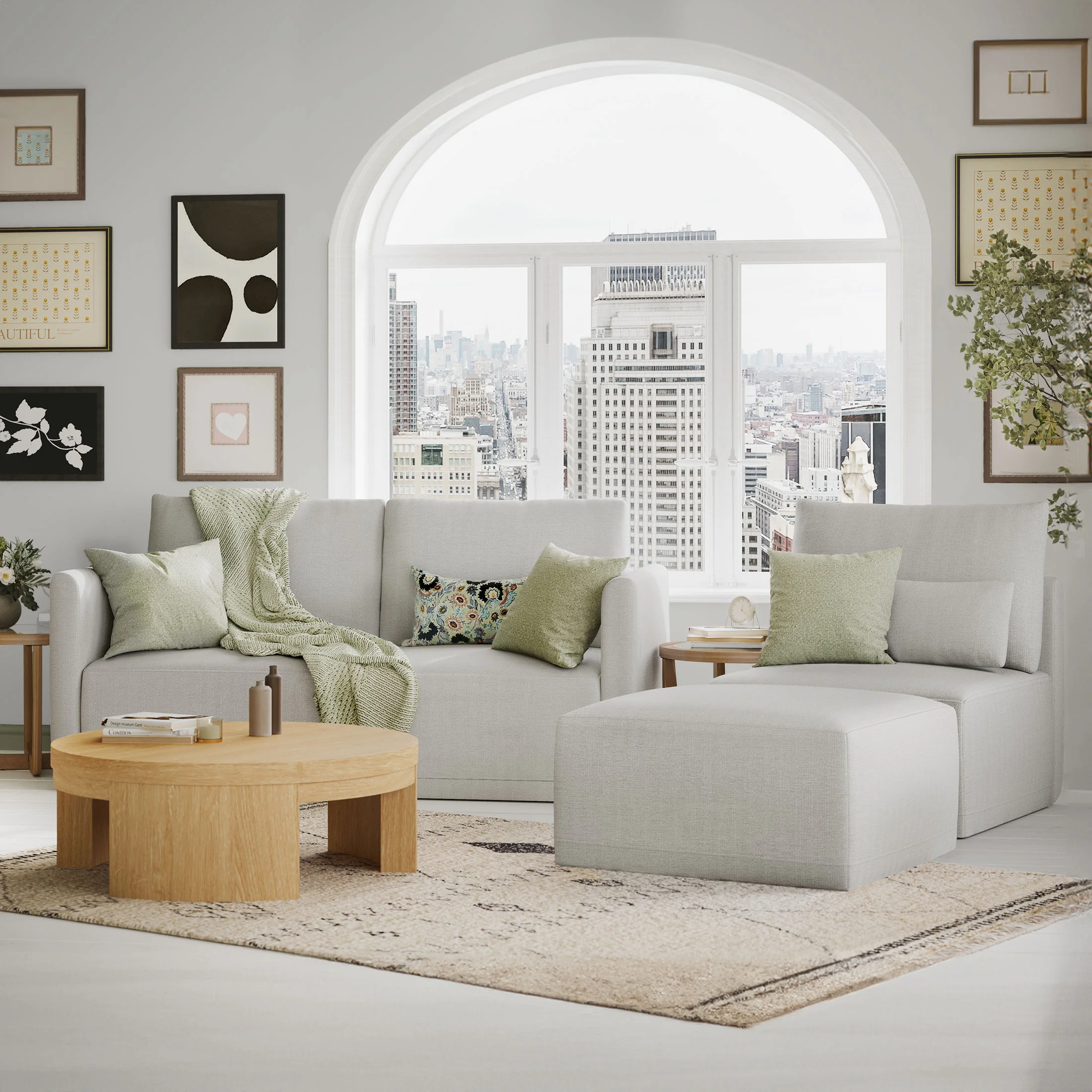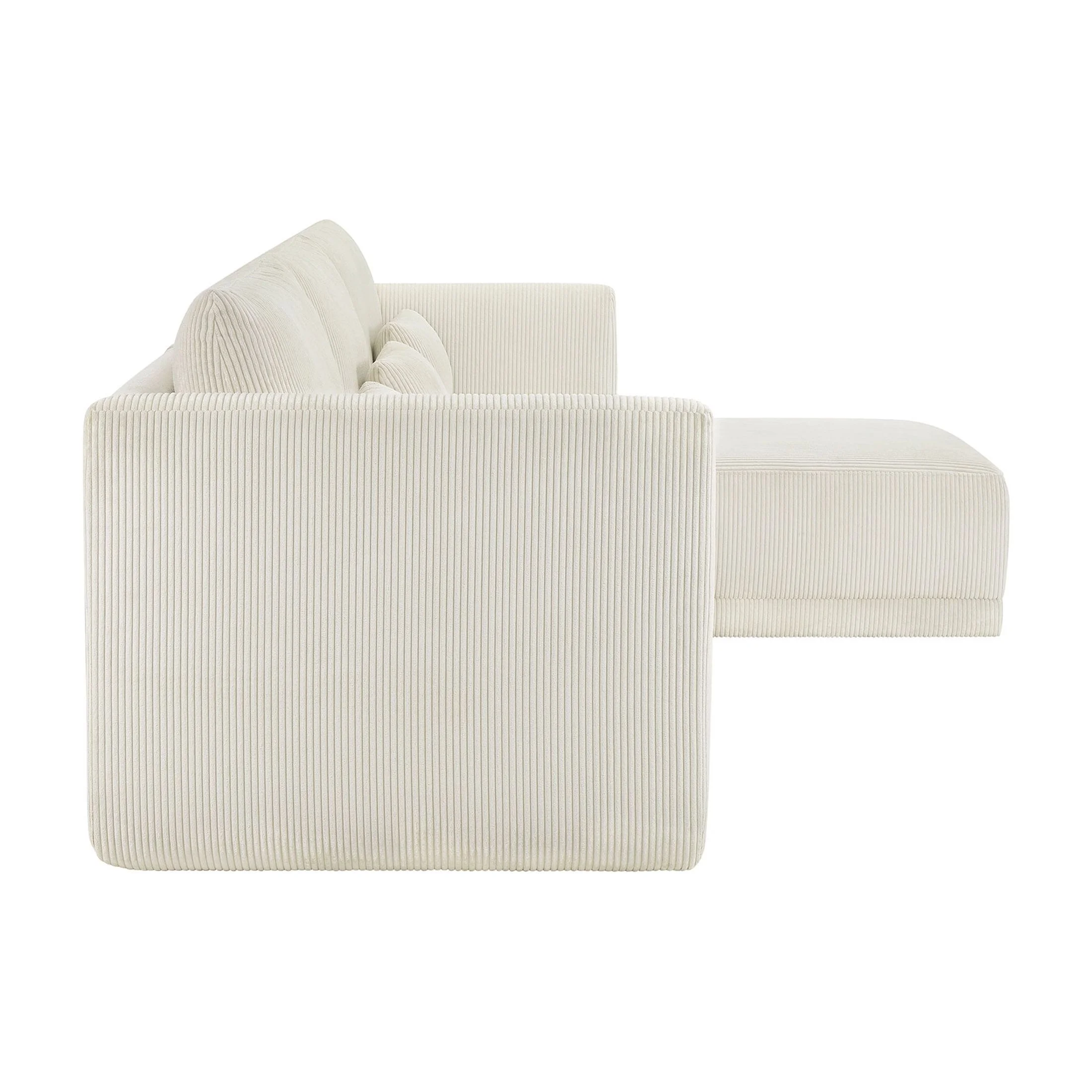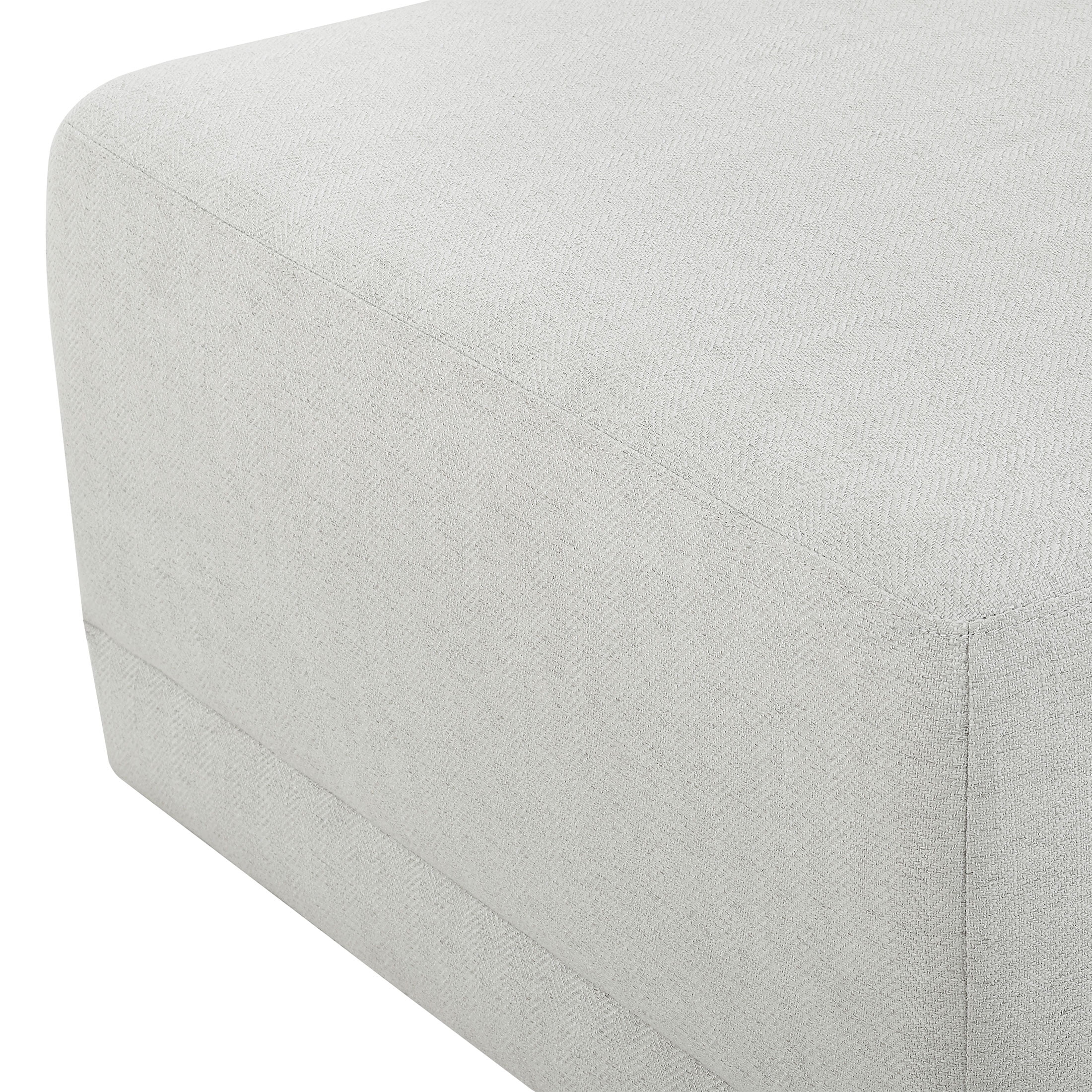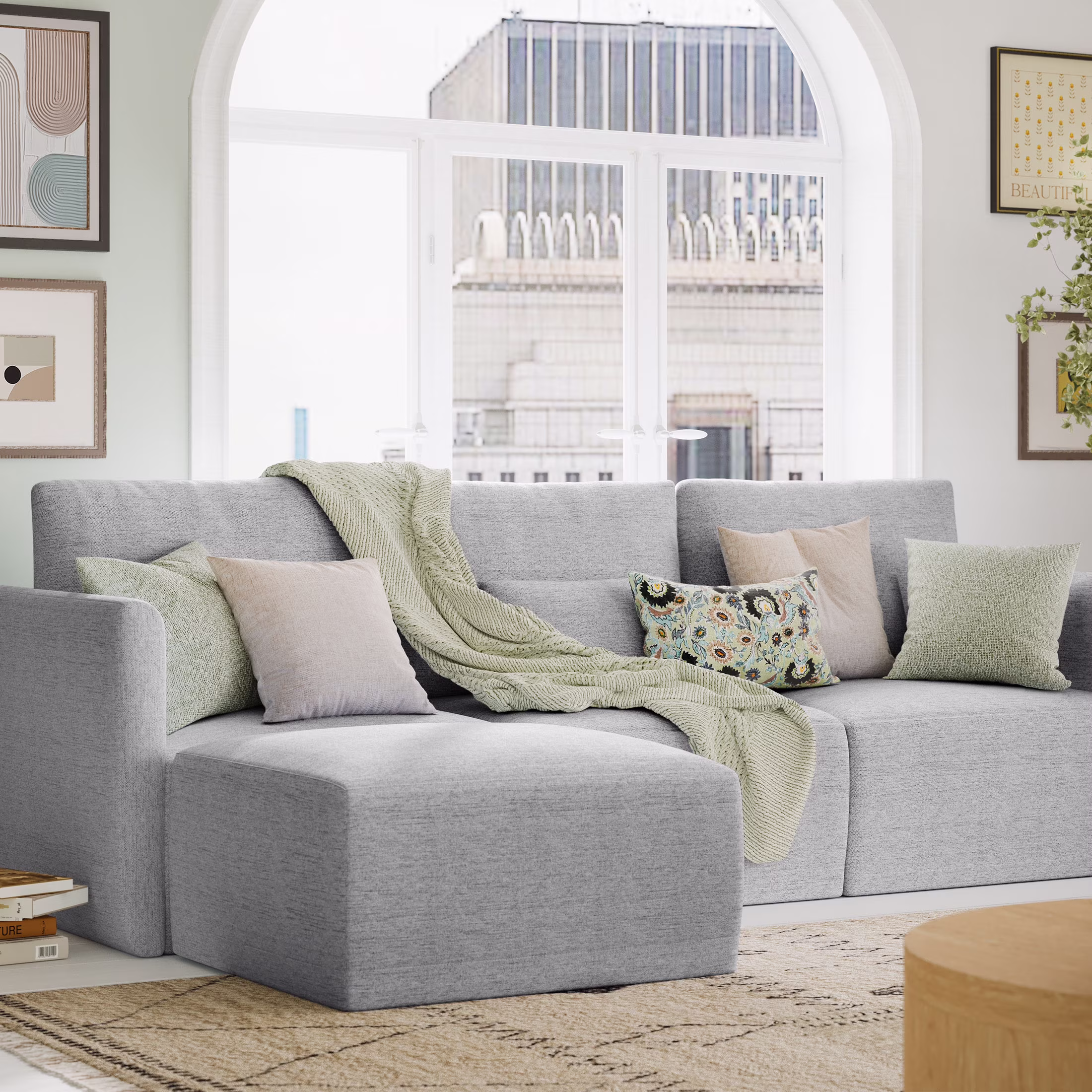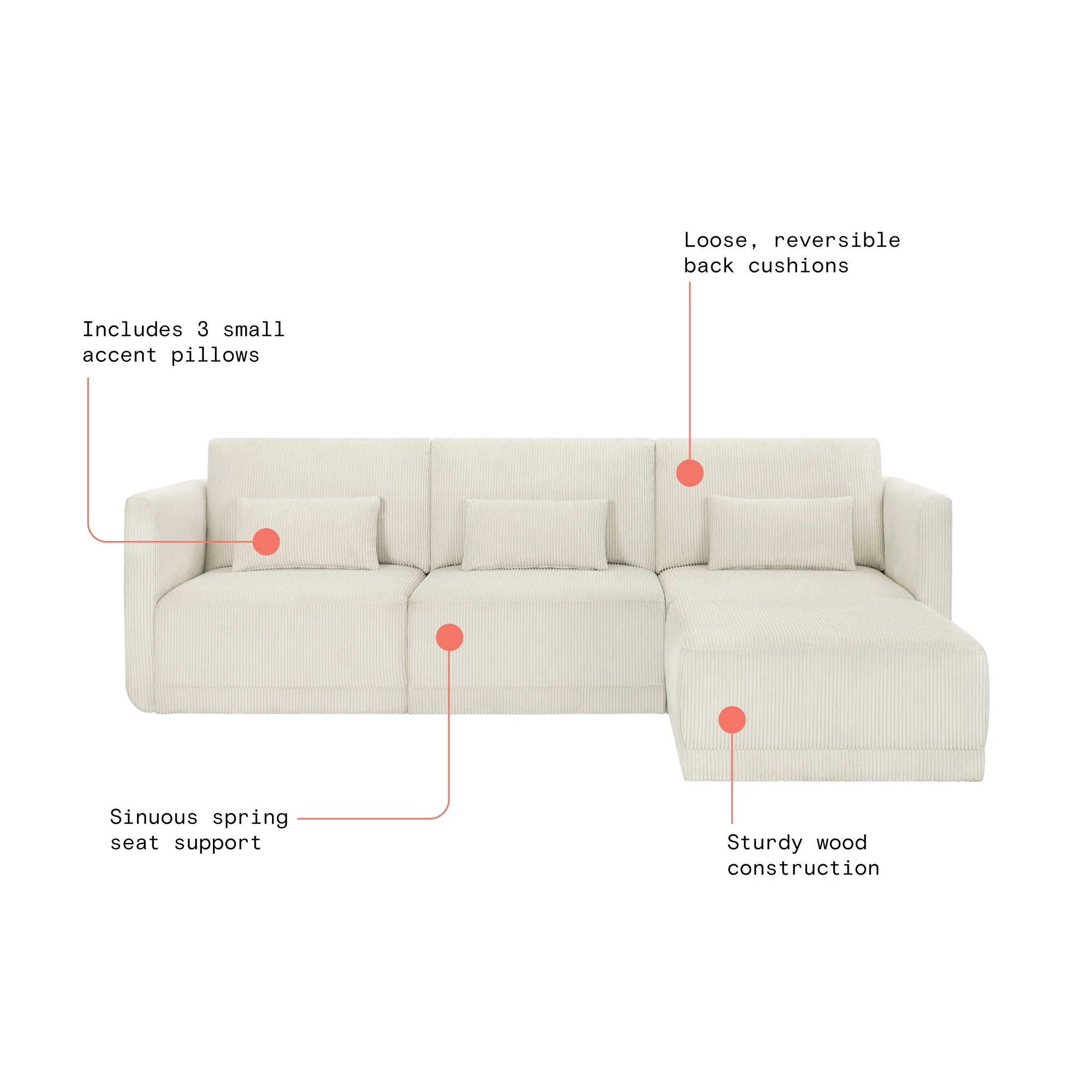 - Includes left wedge, armless chair, right wedge, ottoman and 3 small gray accent pillows