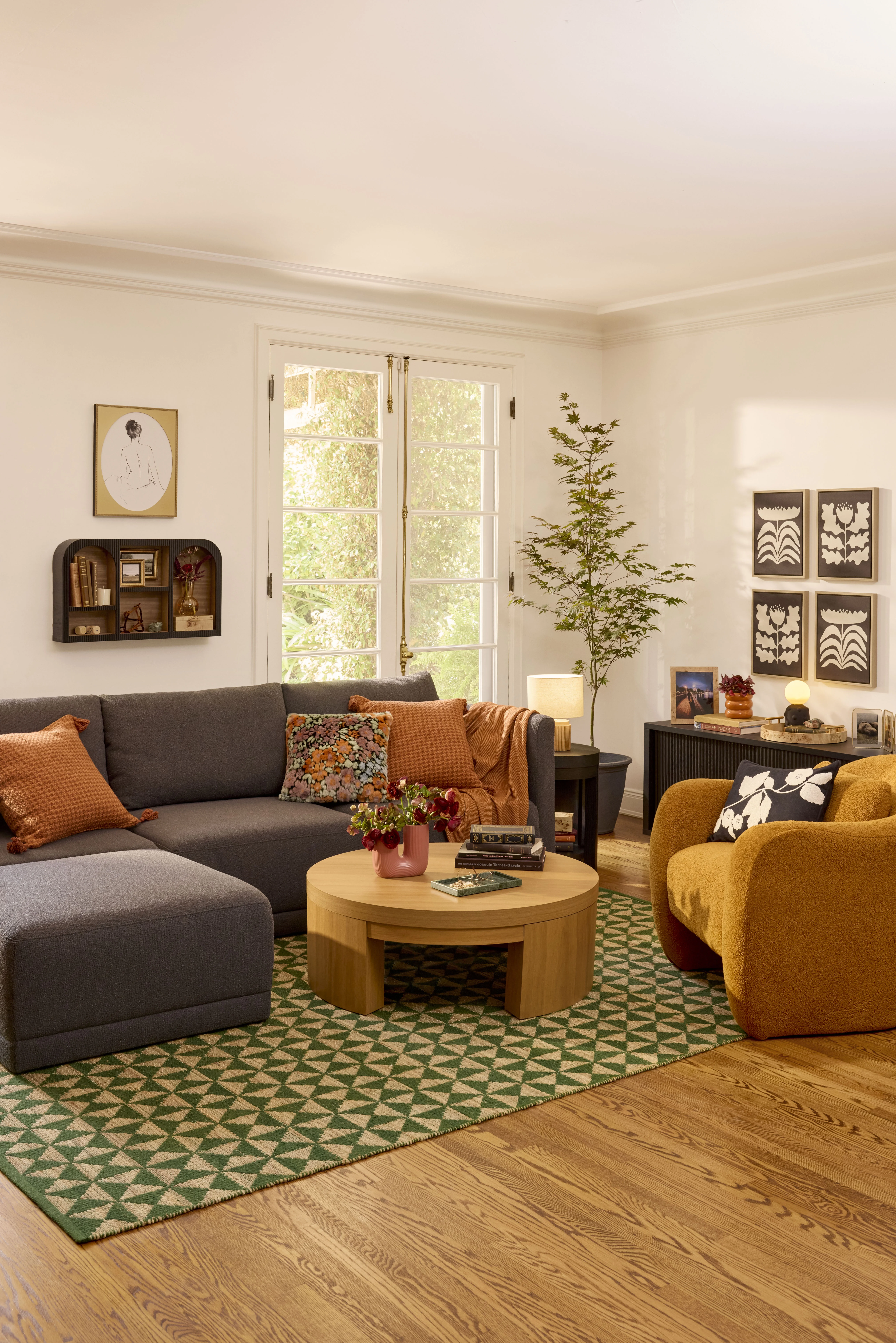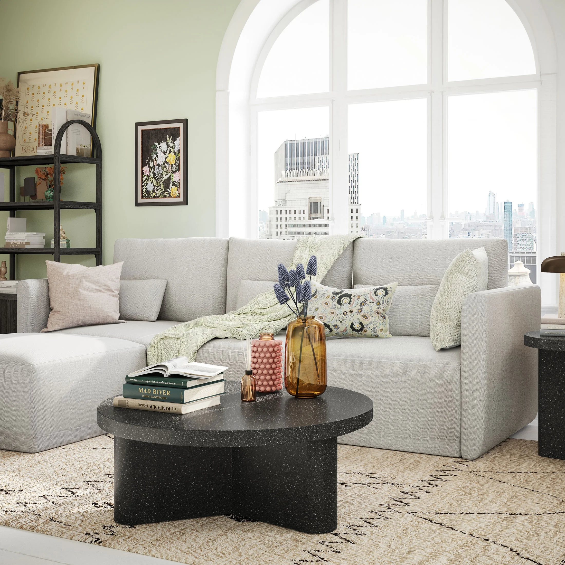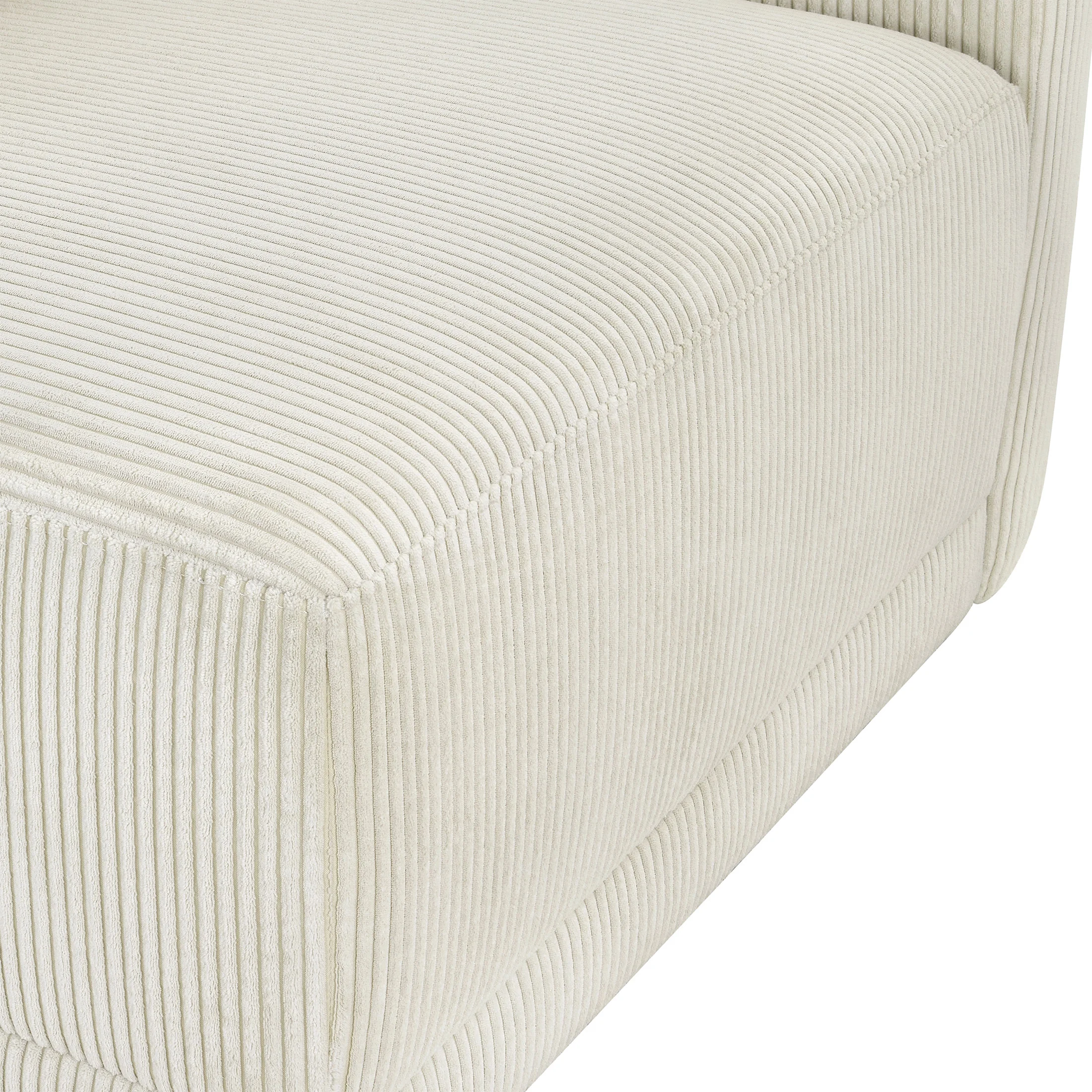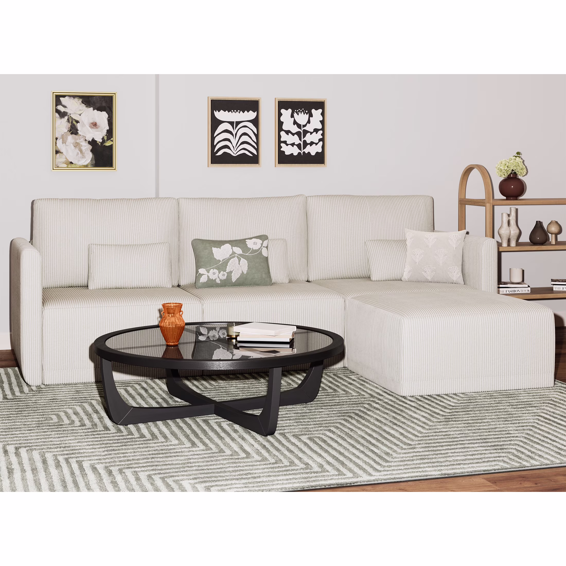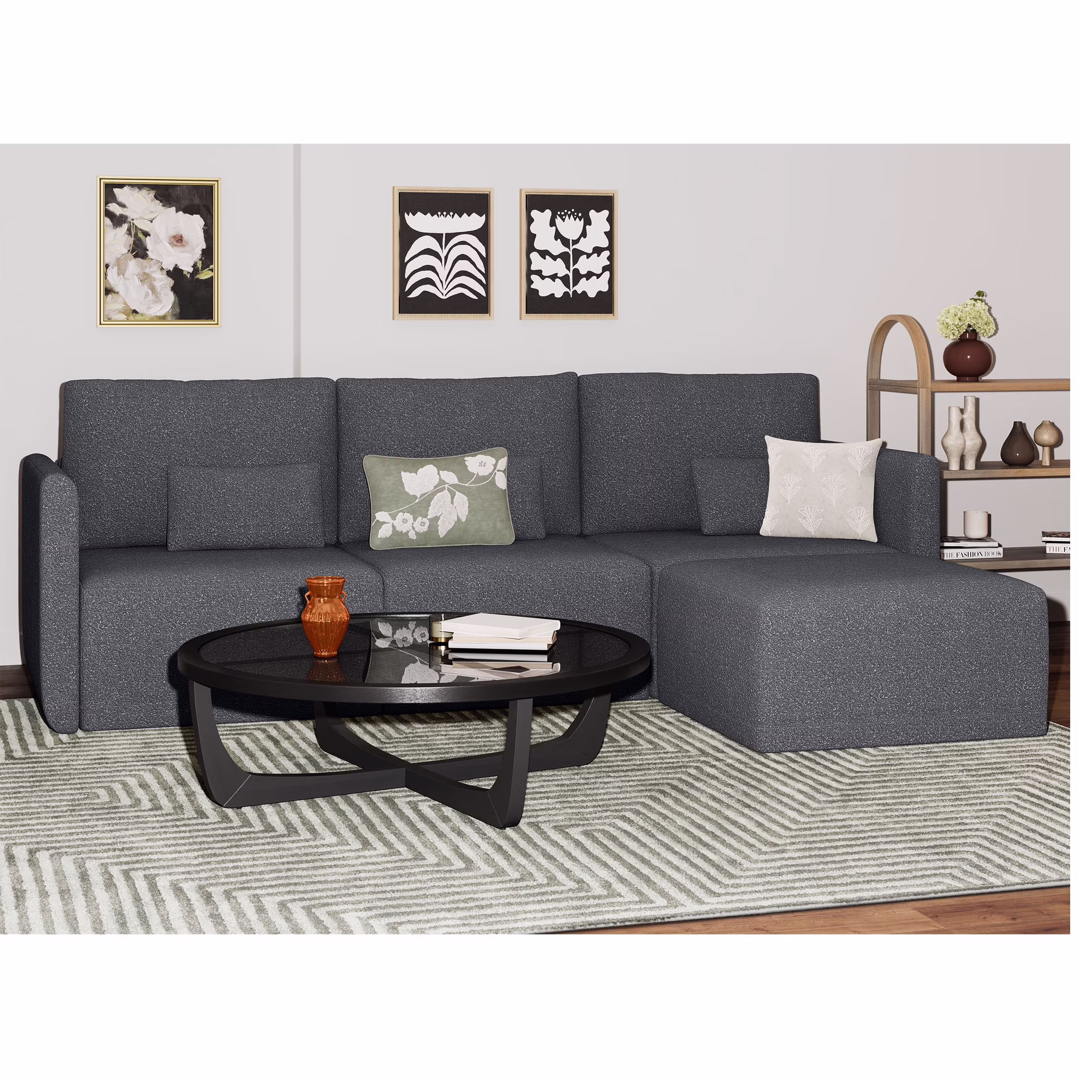 - Includes left wedge, armless chair, right wedge, ottoman and 3 small gray accent pillows
