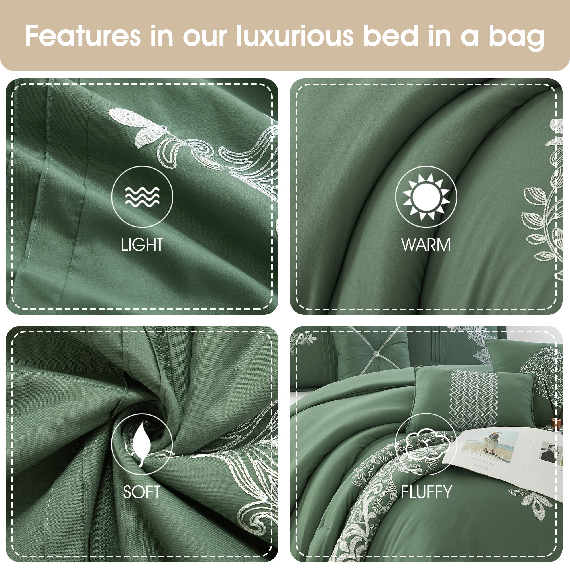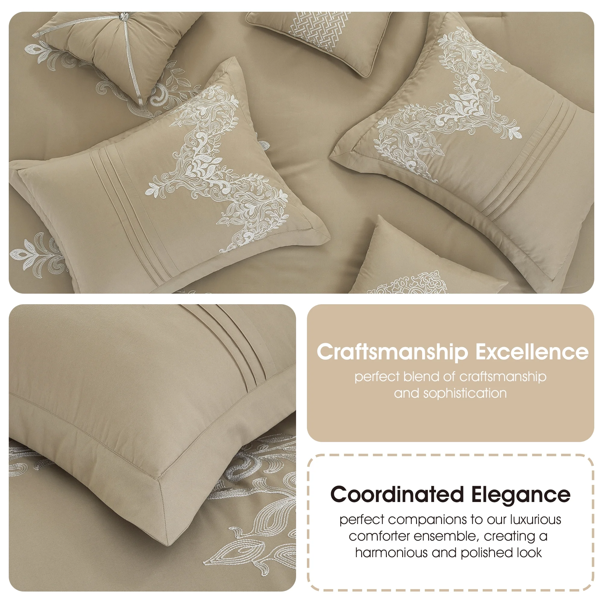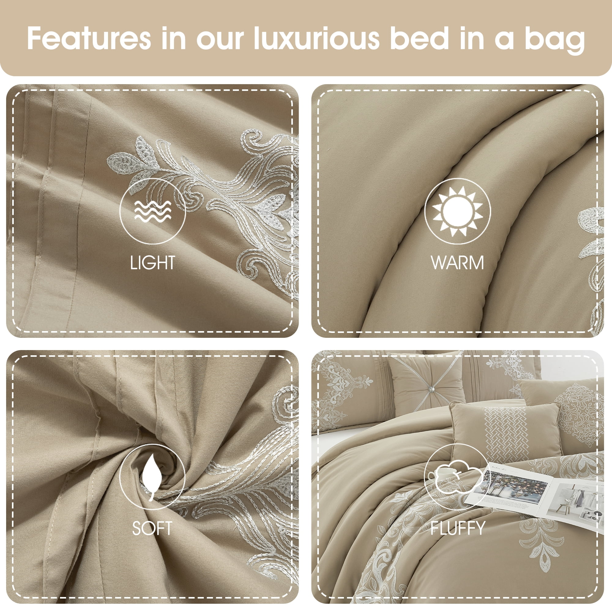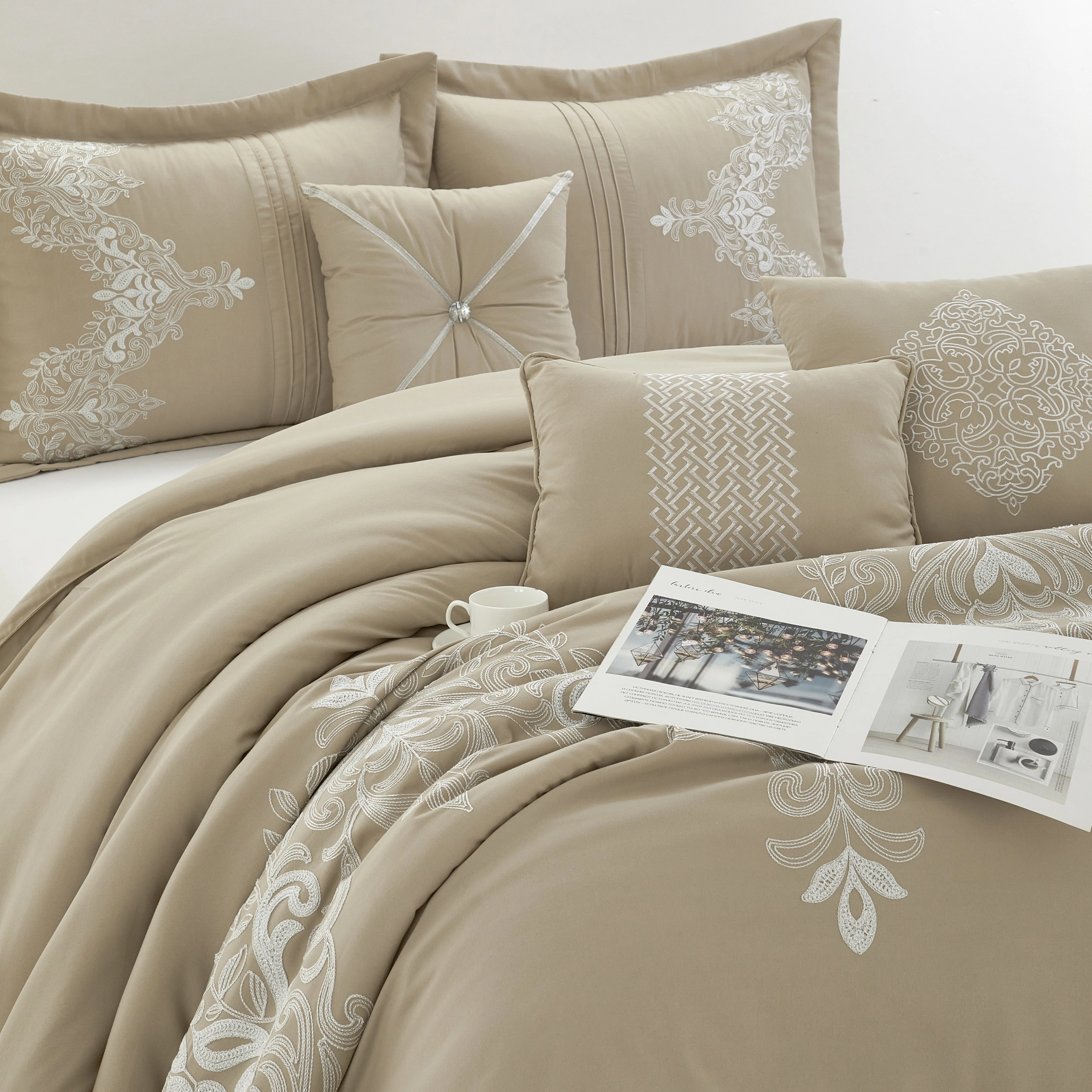 - [Exquisite and Exclusive Design] Elegant color with chain stitched embroidery makes set sophisticated and luxury looking. Color and design well match together. Shams and decorative pillows included. This comforter set is made with premium quality brush microfiber for an amazing night��s sleep.