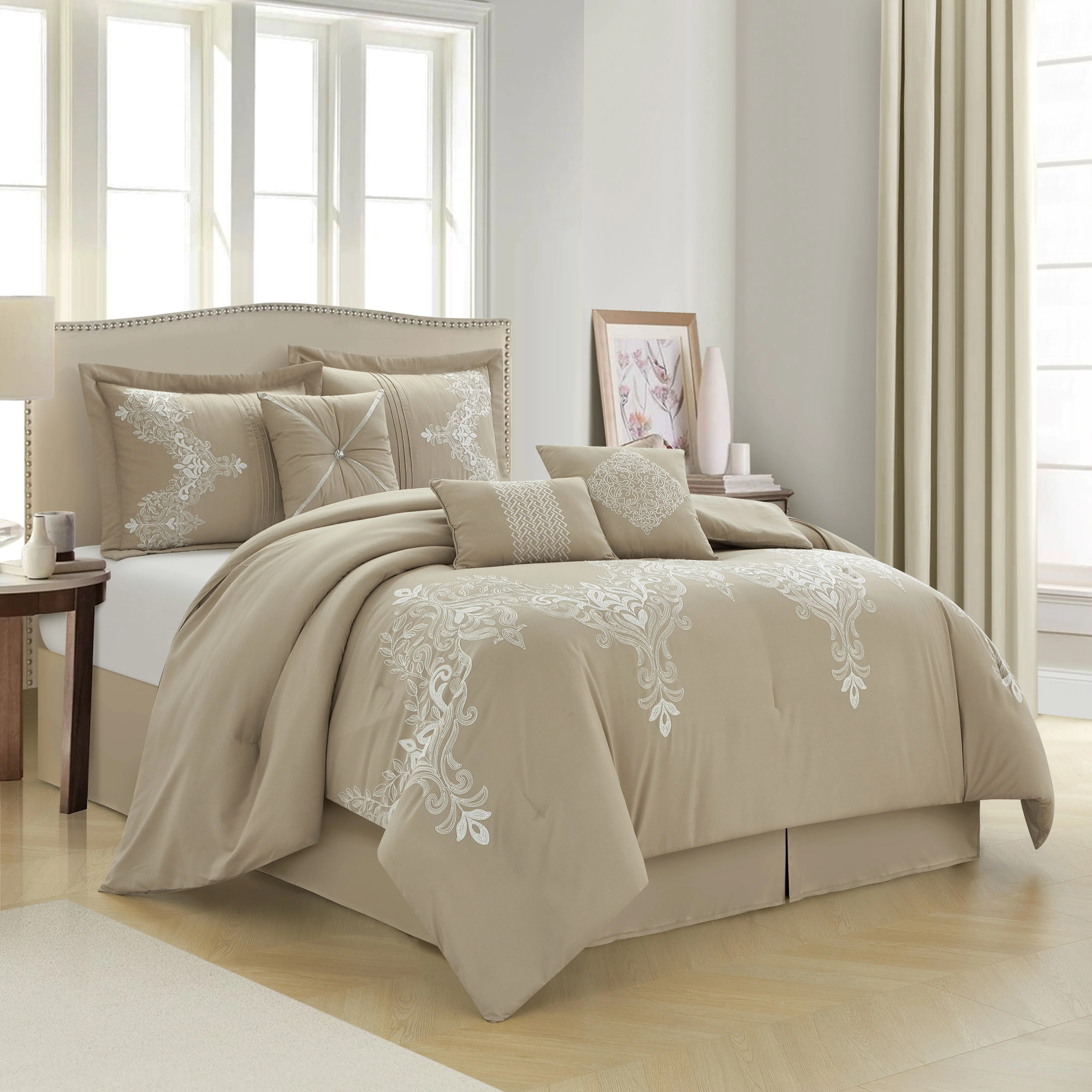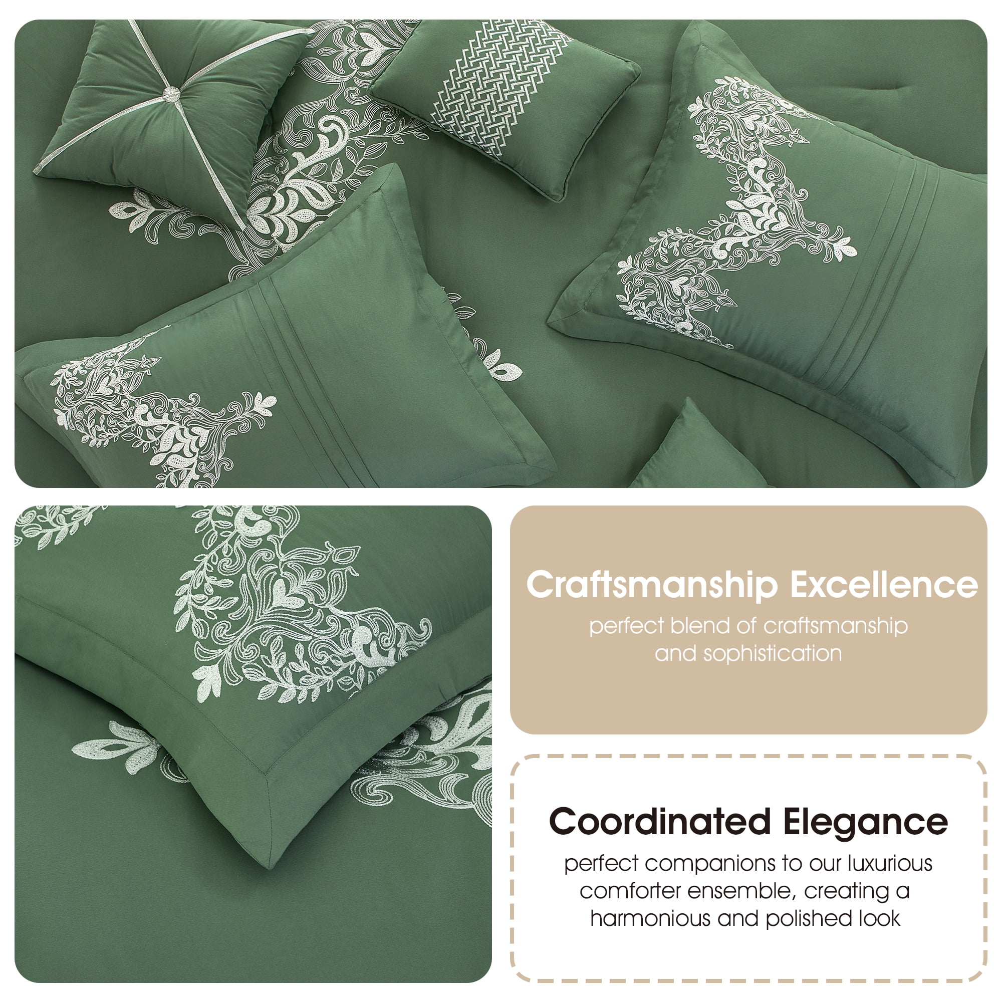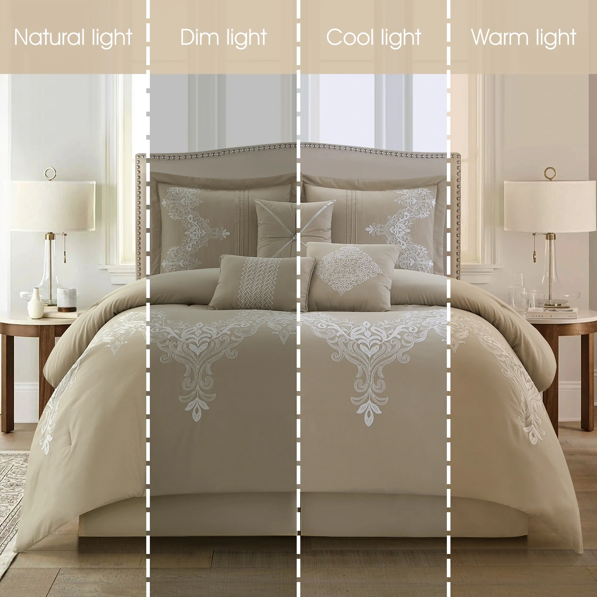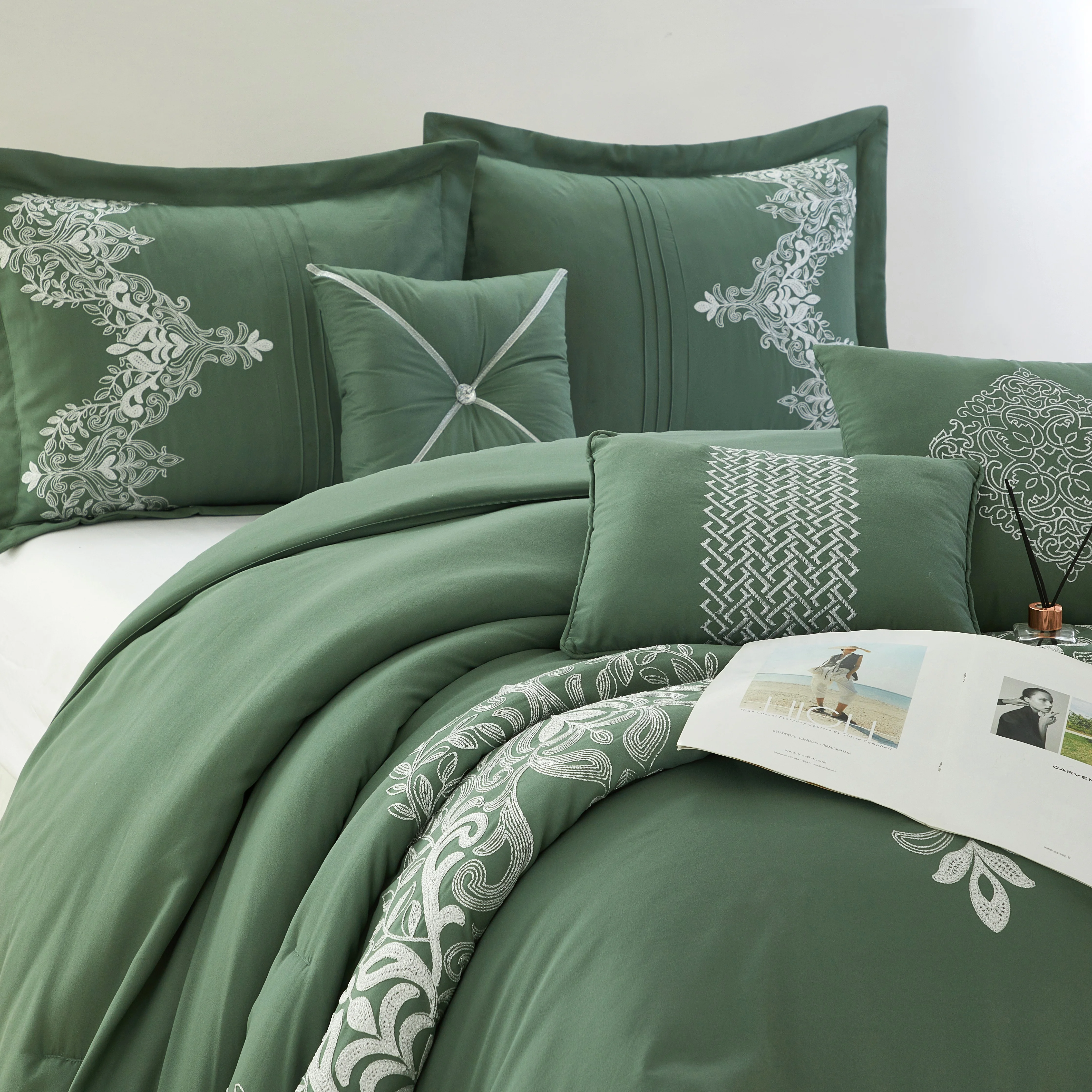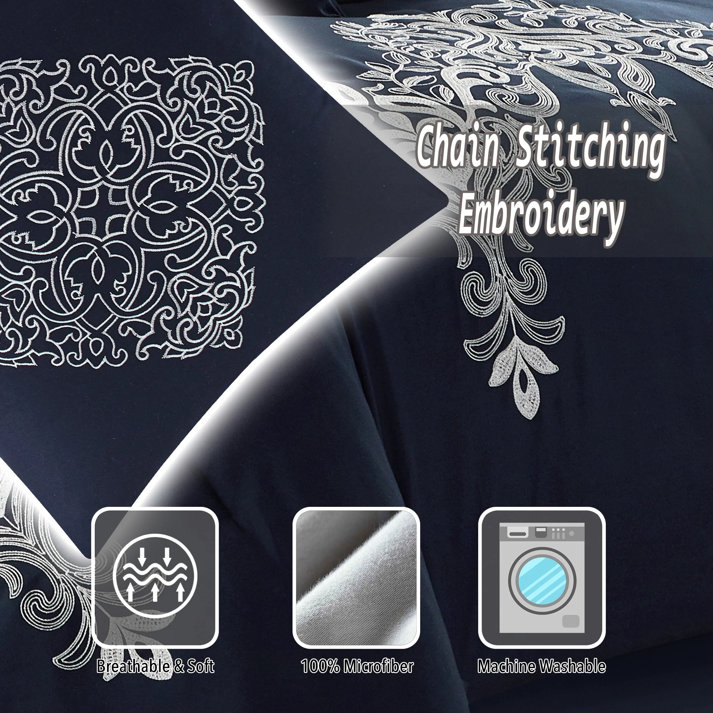 - [Exquisite and Exclusive Design] Elegant color with chain stitched embroidery makes set sophisticated and luxury looking. Color and design well match together. Shams and decorative pillows included. This comforter set is made with premium quality brush microfiber for an amazing night��s sleep.