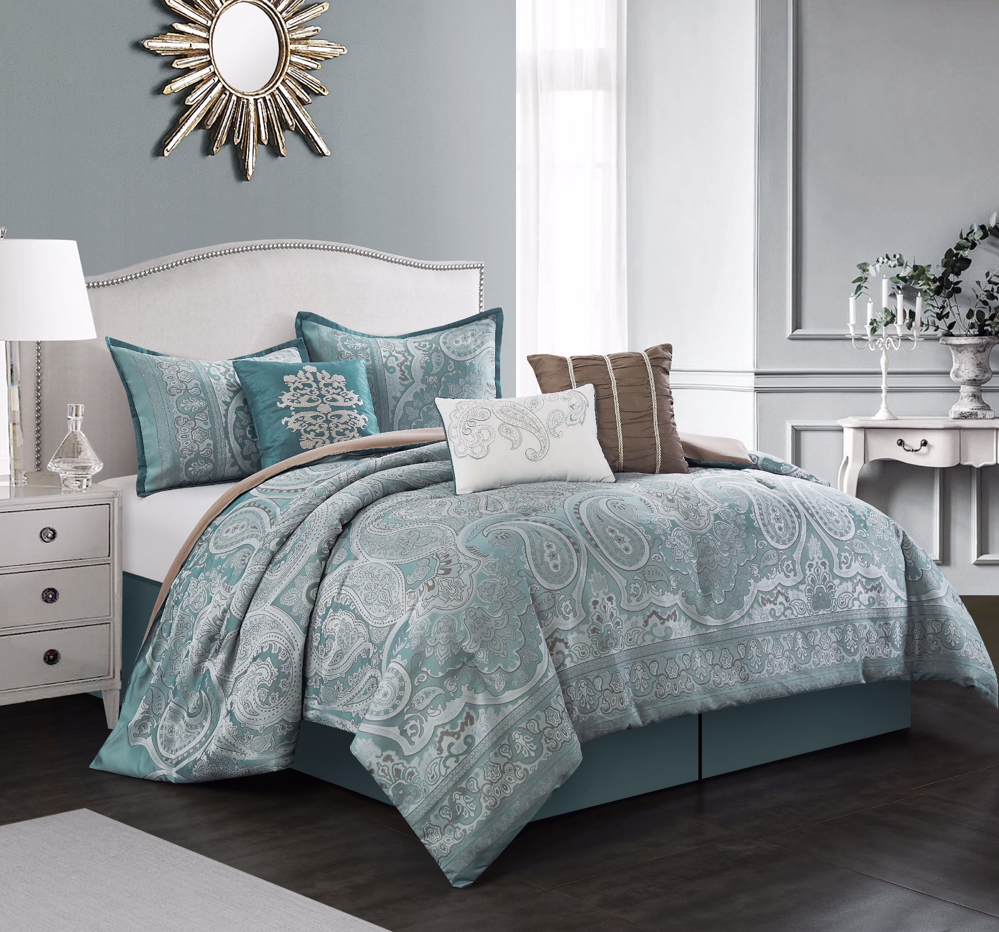 - [What You Can Get] 1 Comforter - 90 inches x 90 inches, 1 Bedskirt - 60 inches x 80 inches + 14 inch drop, 2 Pillow Shams - 26 inches x 20 inches, 2 - Decorative Pillows - 16 inches x 16 inches, 1 Decorative Pillow - 12 inches x 16 inches