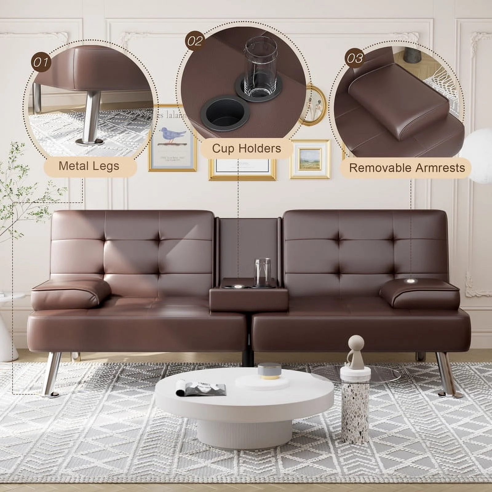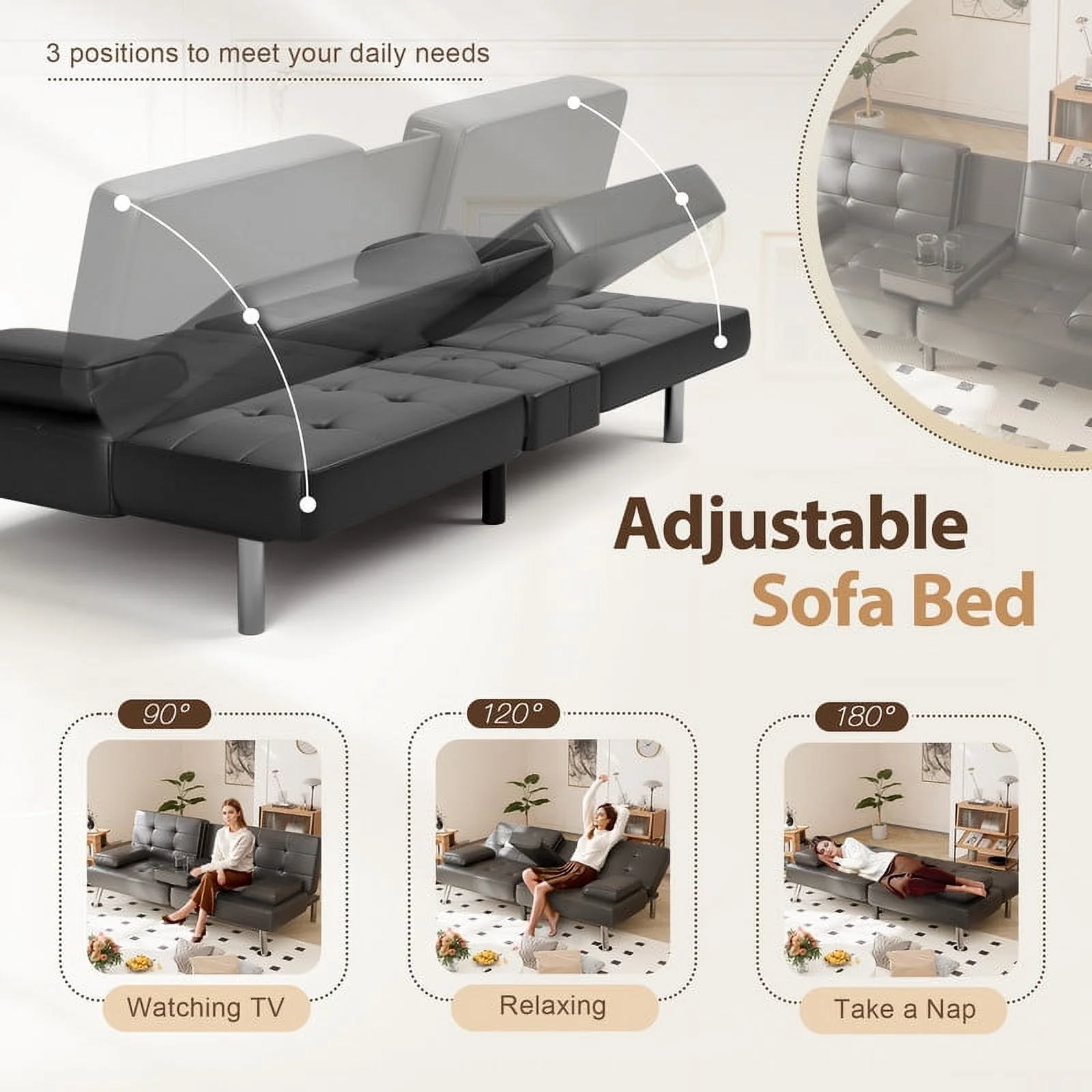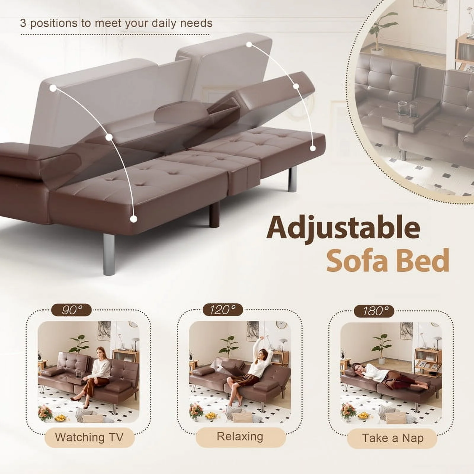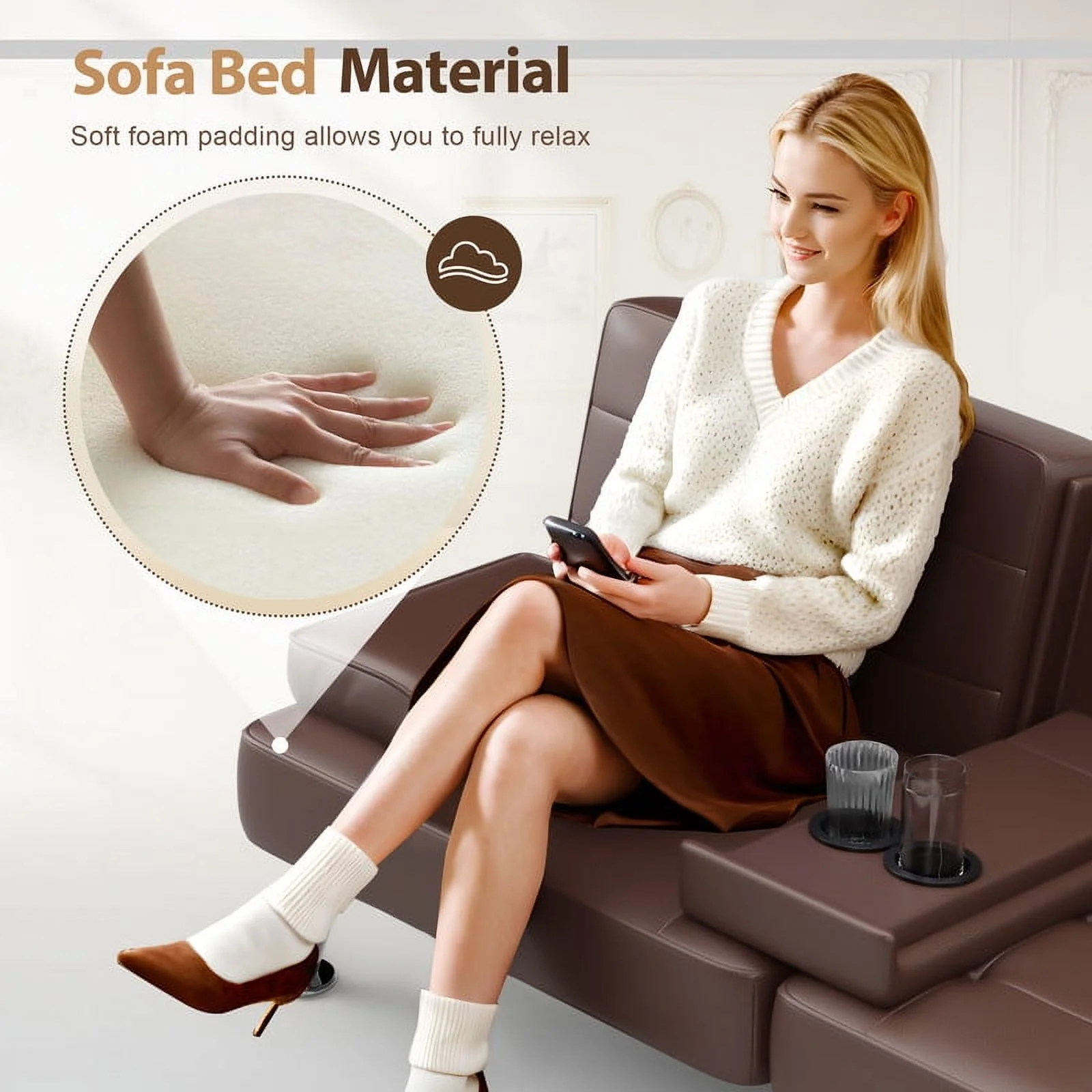 - Versatile and Functional Design : Designed to cater to various needs, this sofa includes built-in hidden cup holders, perfect for a relaxing drink or a movie night. The backrest, covered in the same leatherette, folds down effortlessly, with removable armrest cushions that serve as soft pillows for a peaceful night��s sleep.