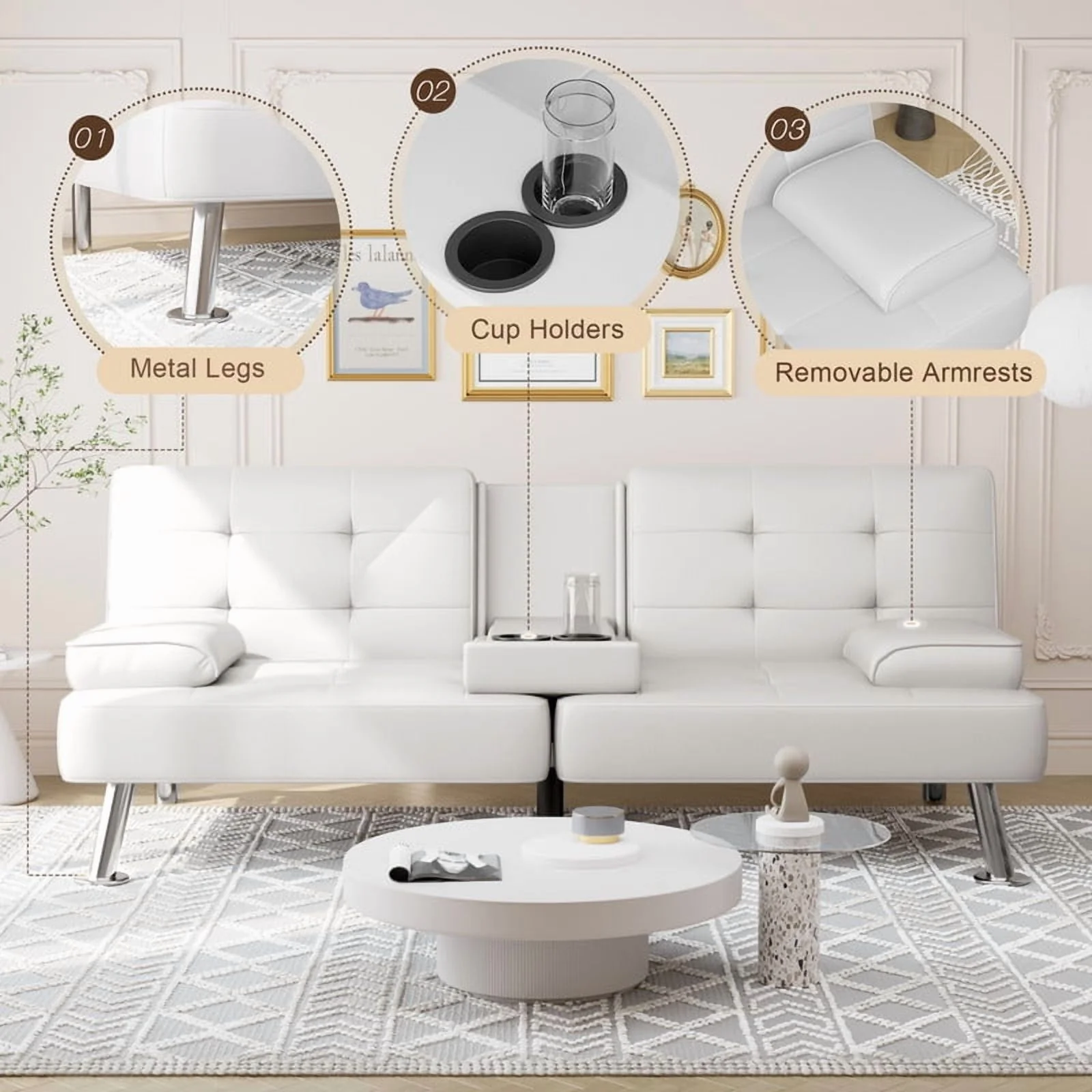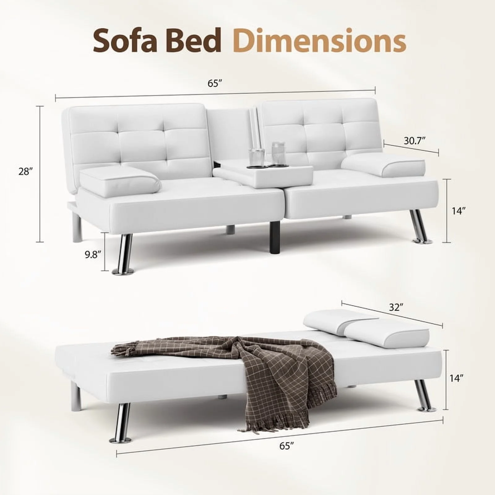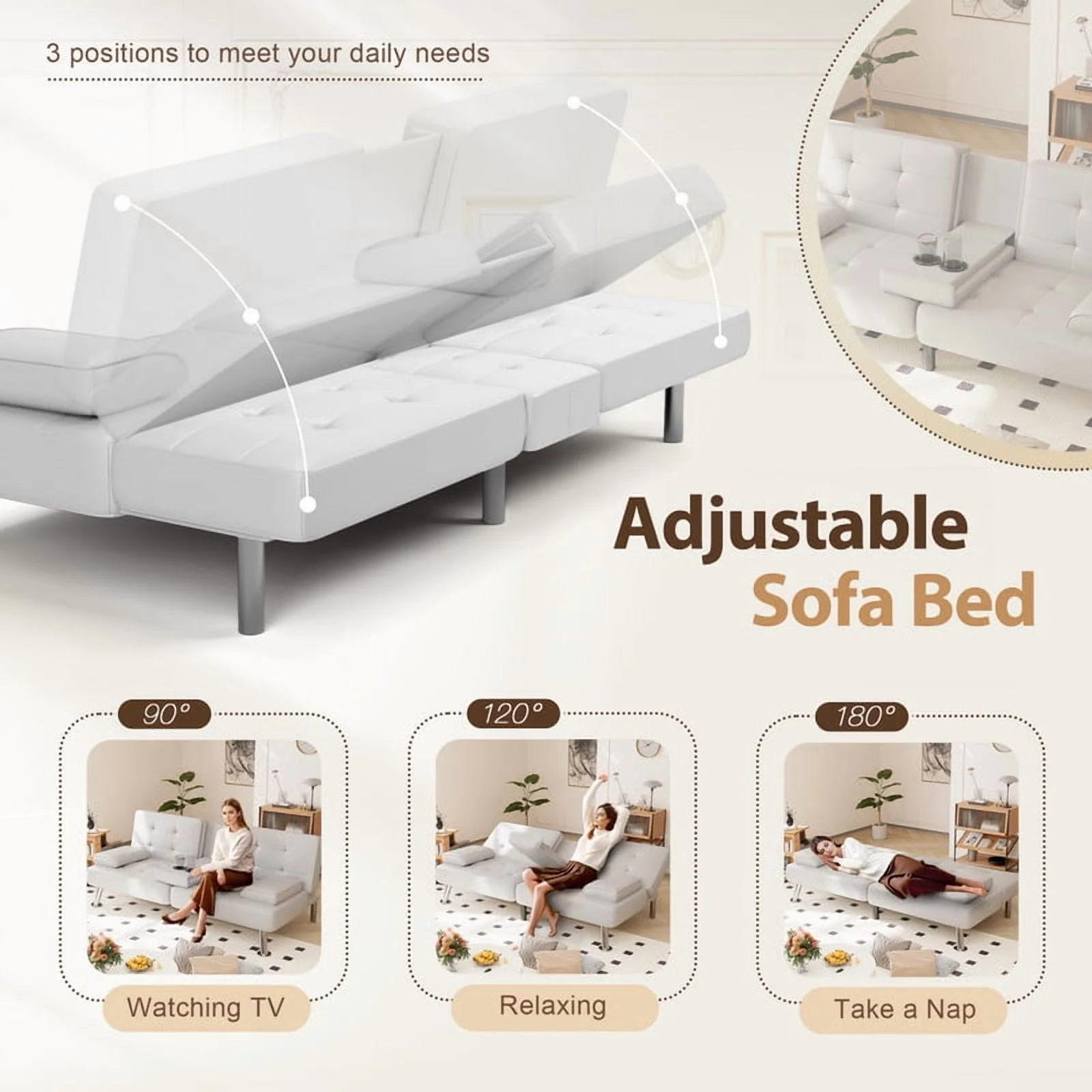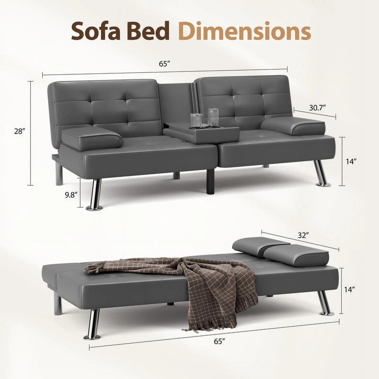 - Versatile and Functional Design : Designed to cater to various needs, this sofa includes built-in hidden cup holders, perfect for a relaxing drink or a movie night. The backrest, covered in the same leatherette, folds down effortlessly, with removable armrest cushions that serve as soft pillows for a peaceful night��s sleep.