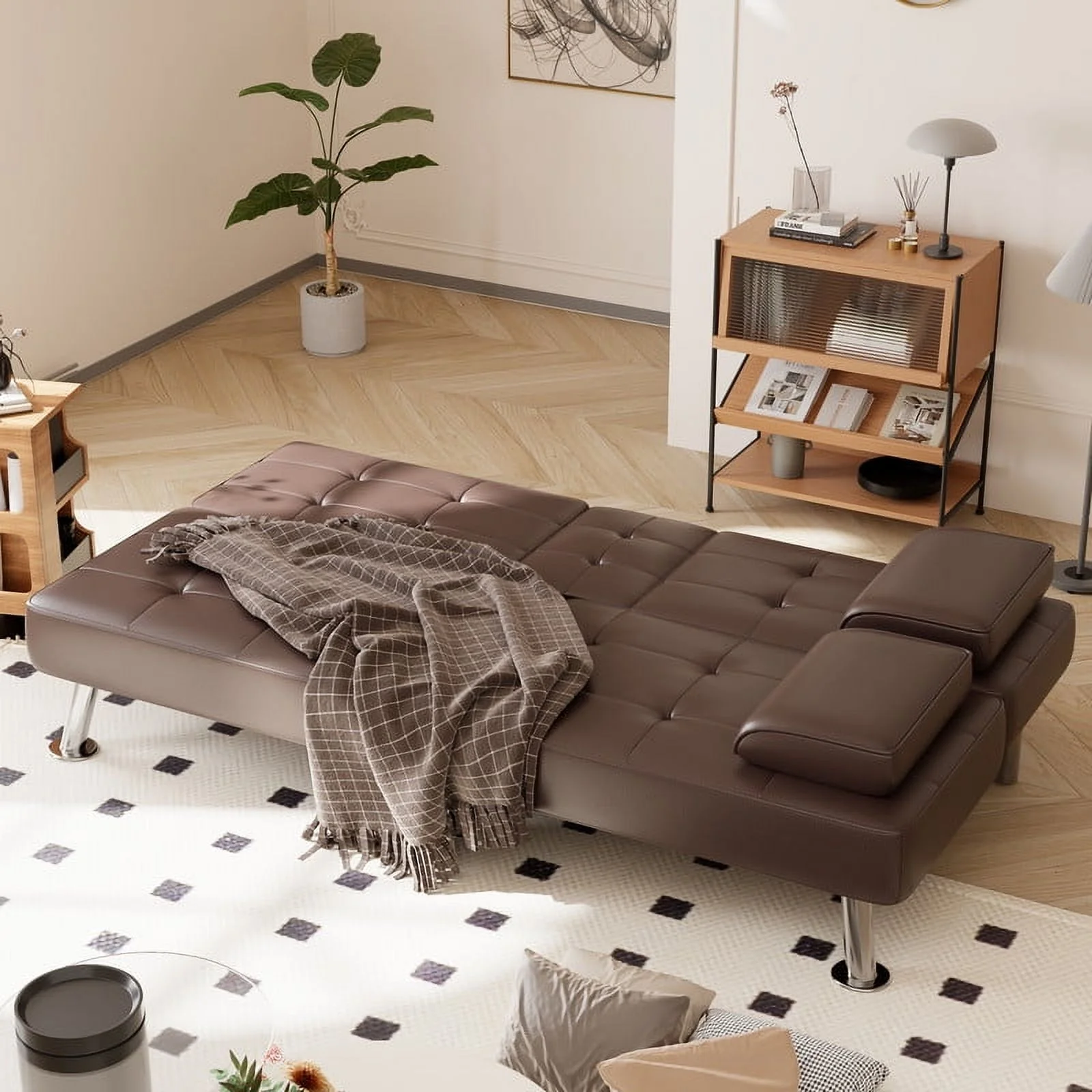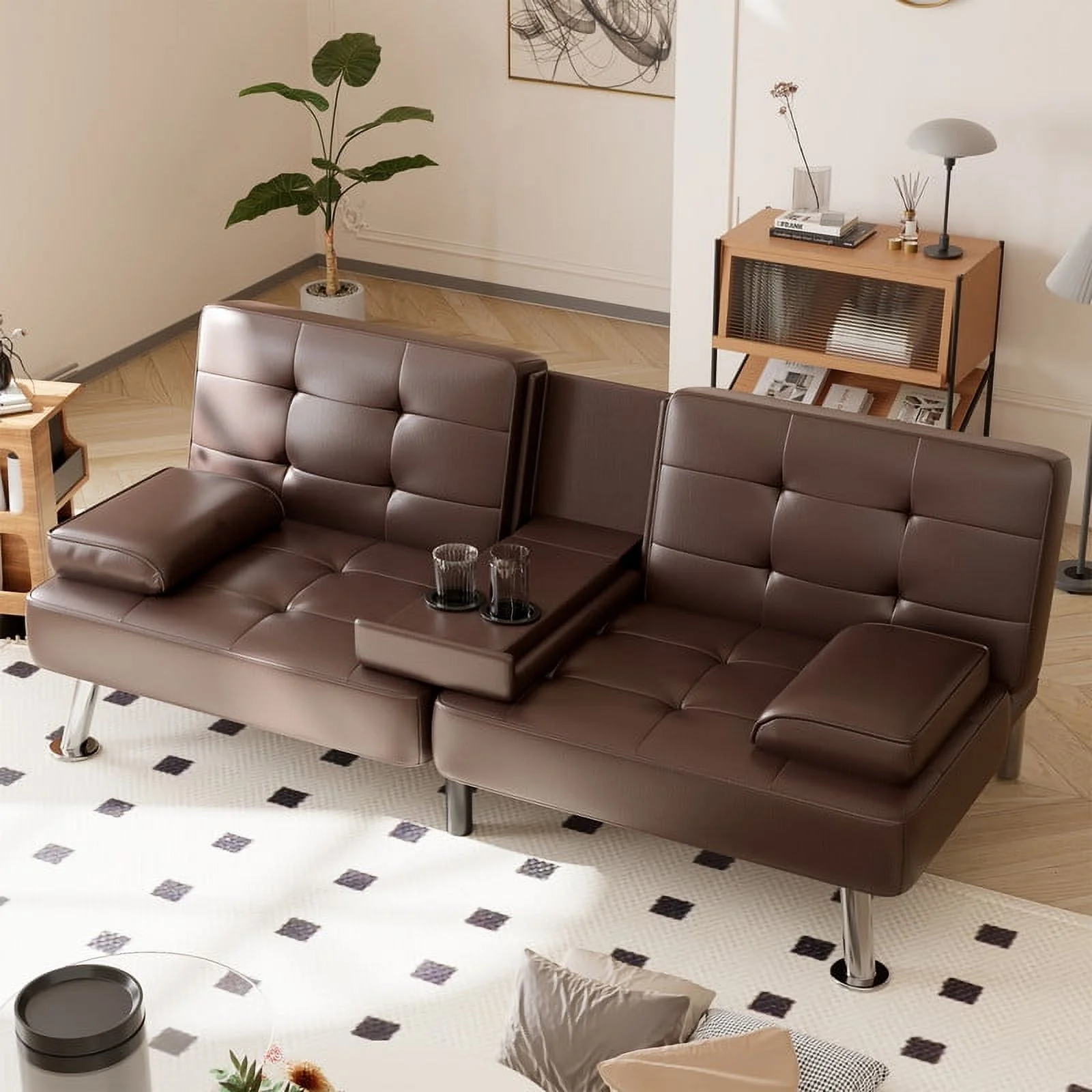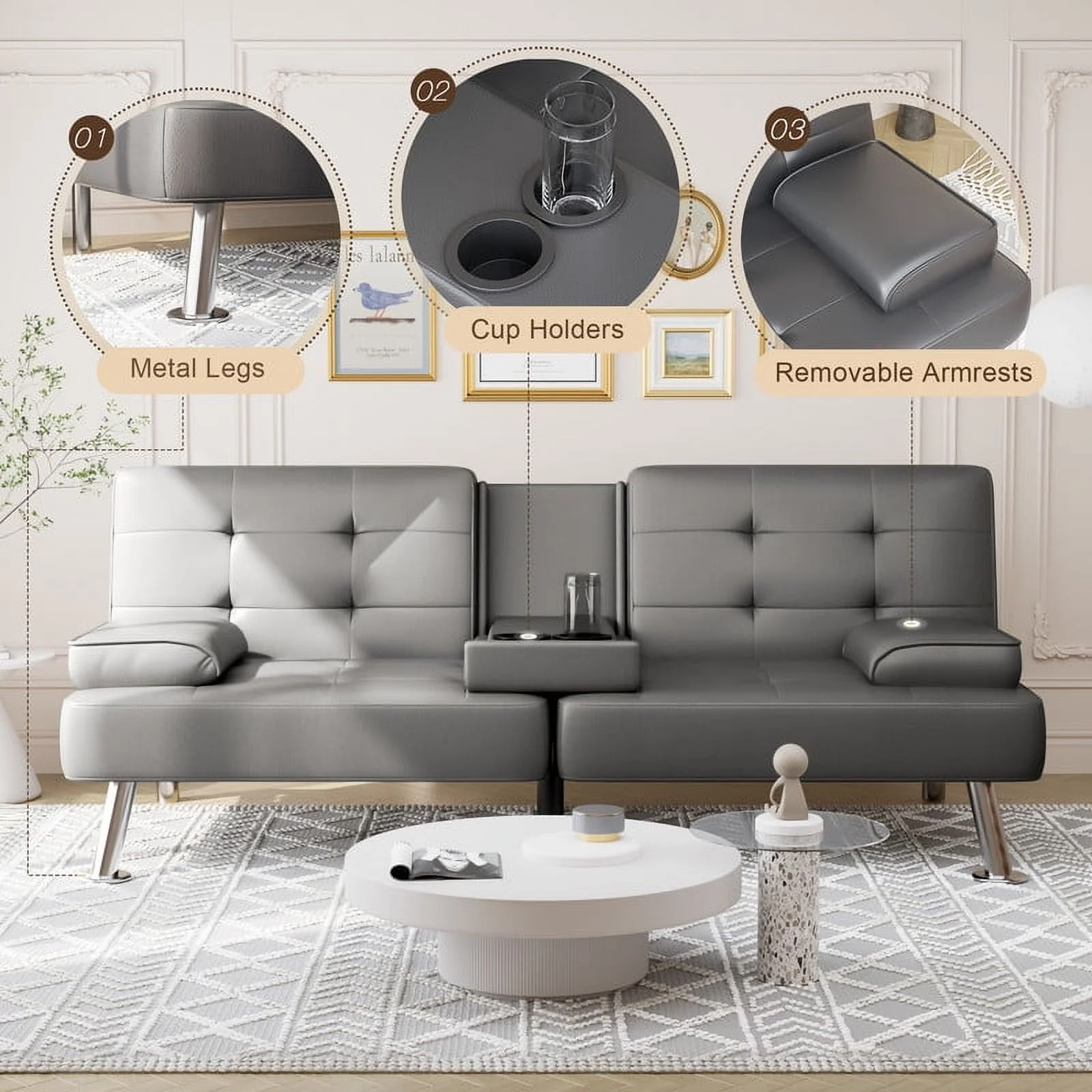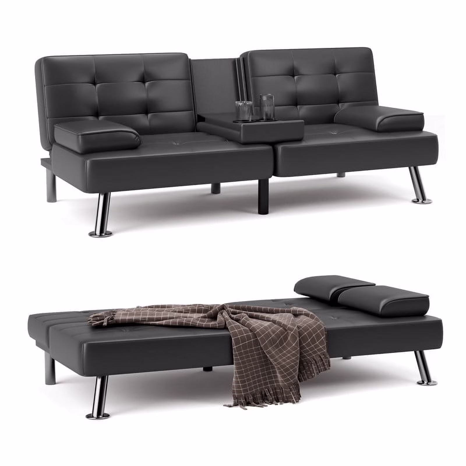 - Versatile and Functional Design : Designed to cater to various needs, this sofa includes built-in hidden cup holders, perfect for a relaxing drink or a movie night. The backrest, covered in the same leatherette, folds down effortlessly, with removable armrest cushions that serve as soft pillows for a peaceful night��s sleep.
