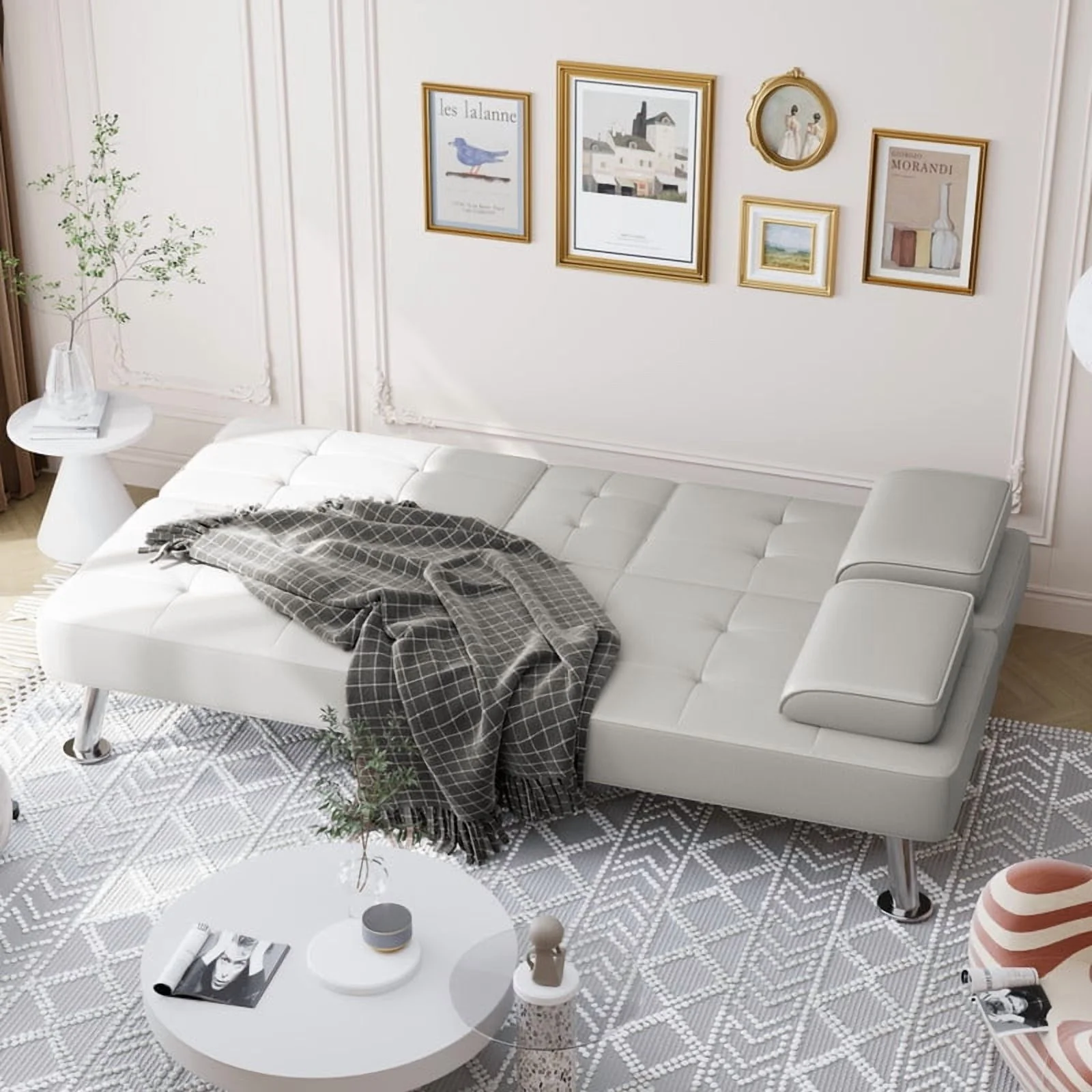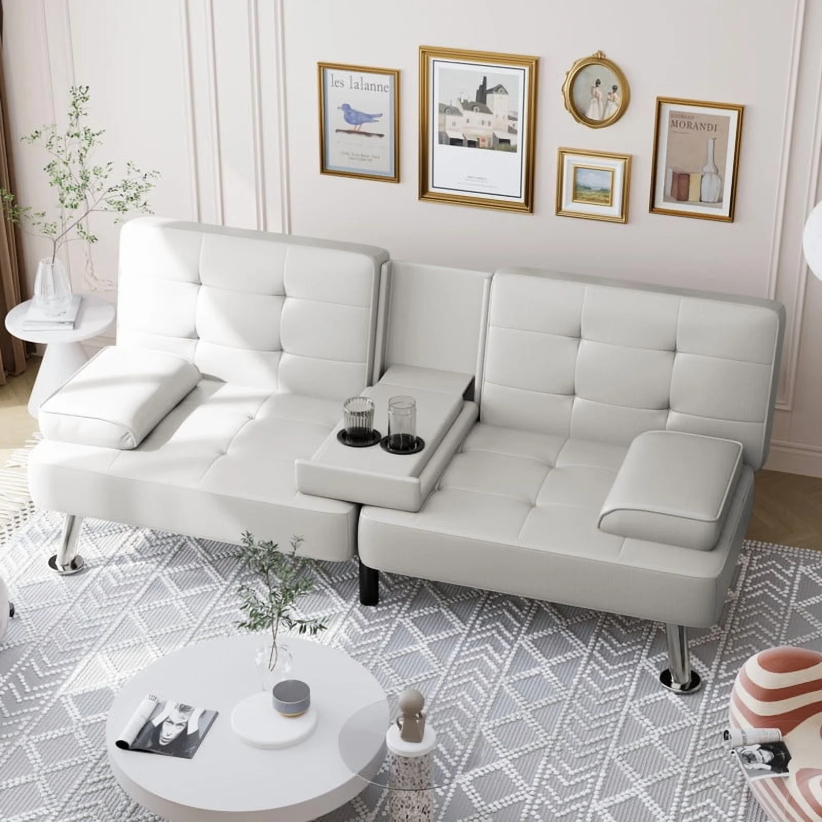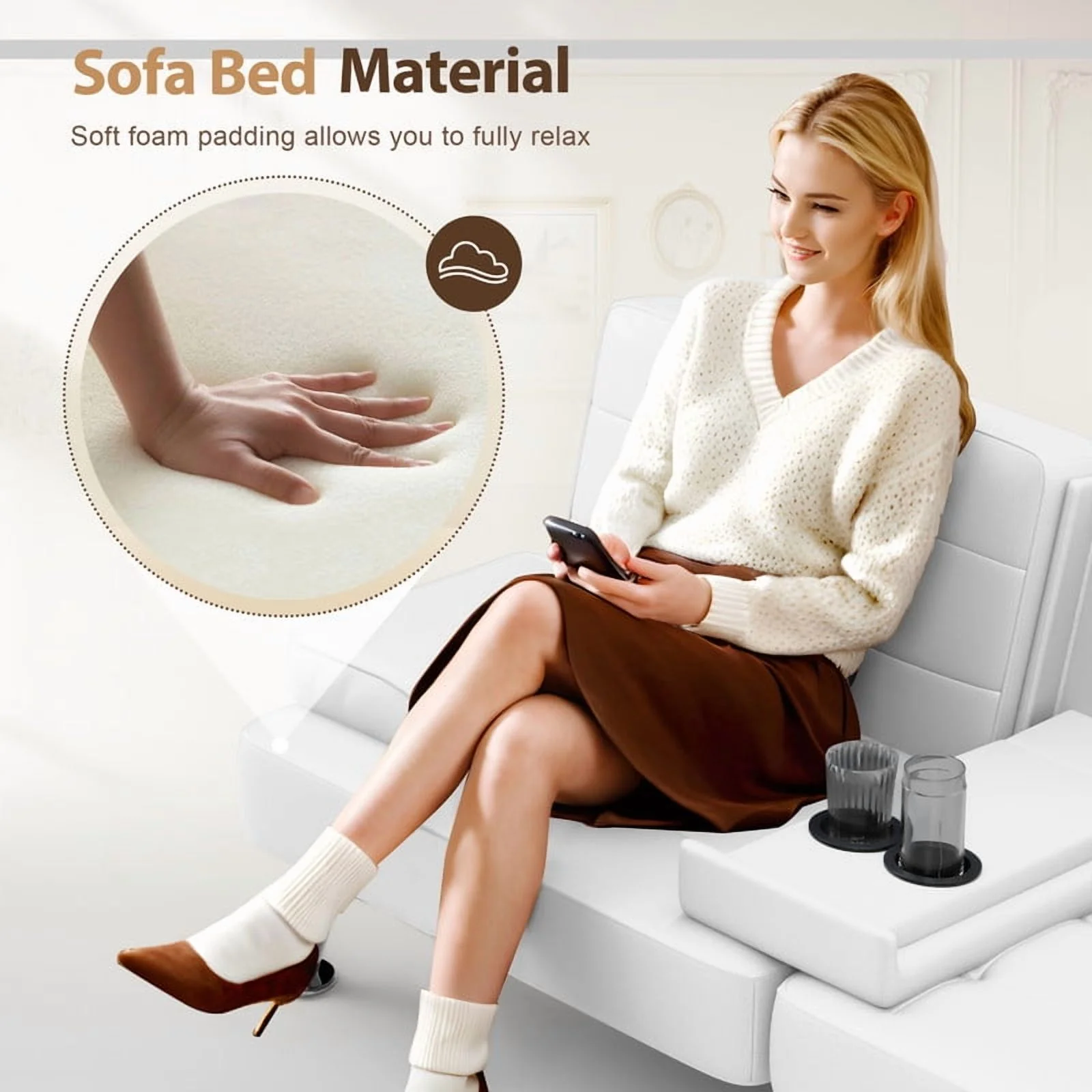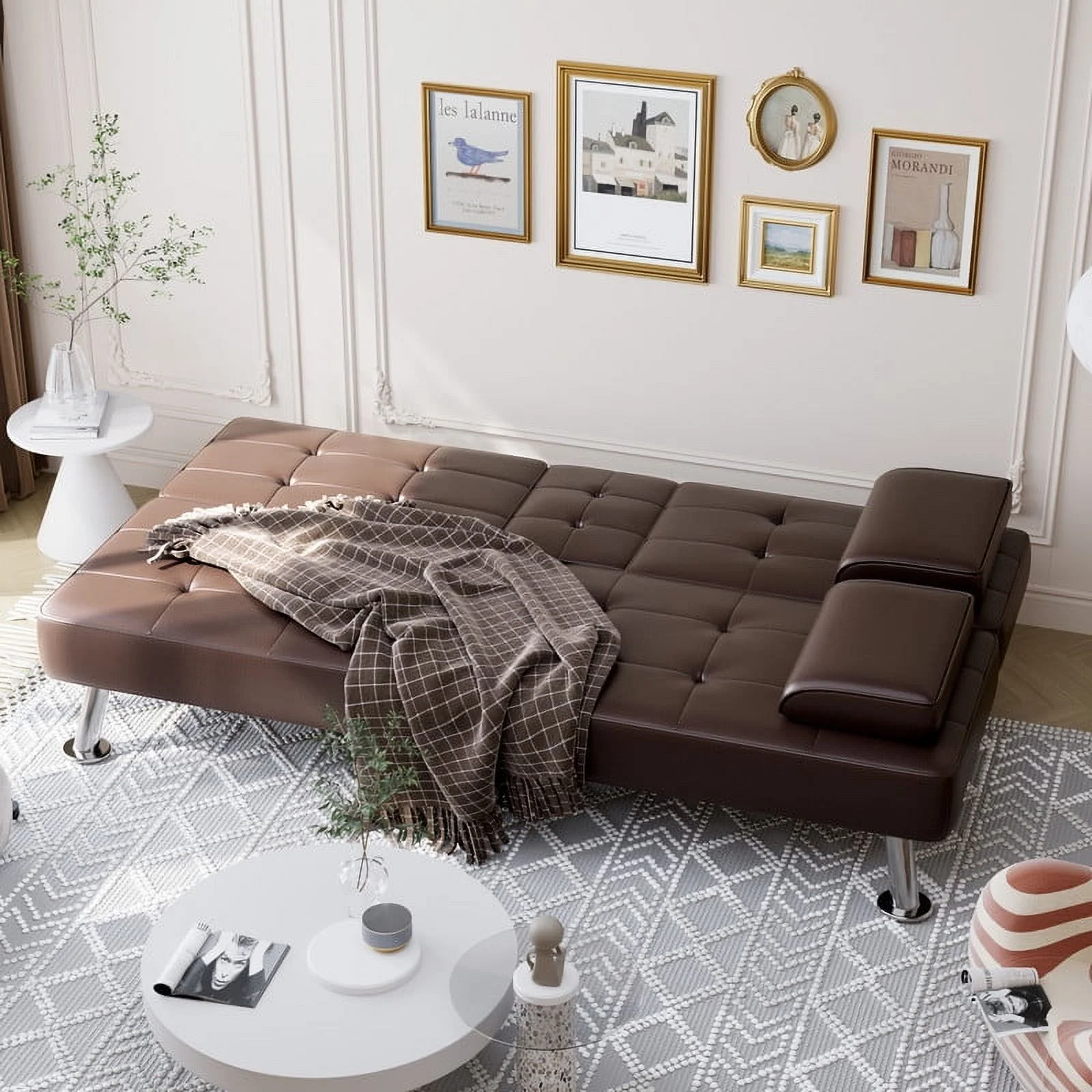 - Versatile and Functional Design : Designed to cater to various needs, this sofa includes built-in hidden cup holders, perfect for a relaxing drink or a movie night. The backrest, covered in the same leatherette, folds down effortlessly, with removable armrest cushions that serve as soft pillows for a peaceful night��s sleep.