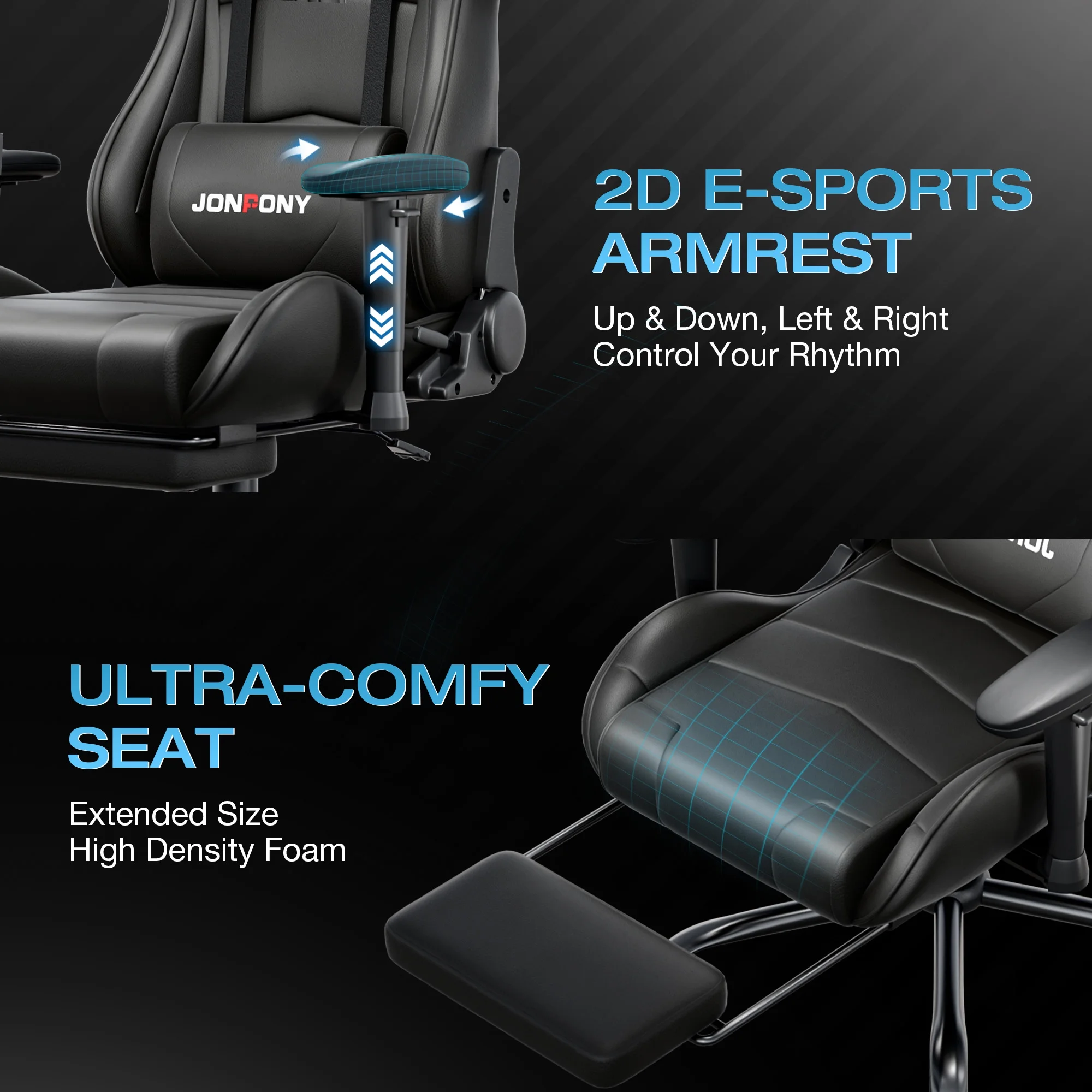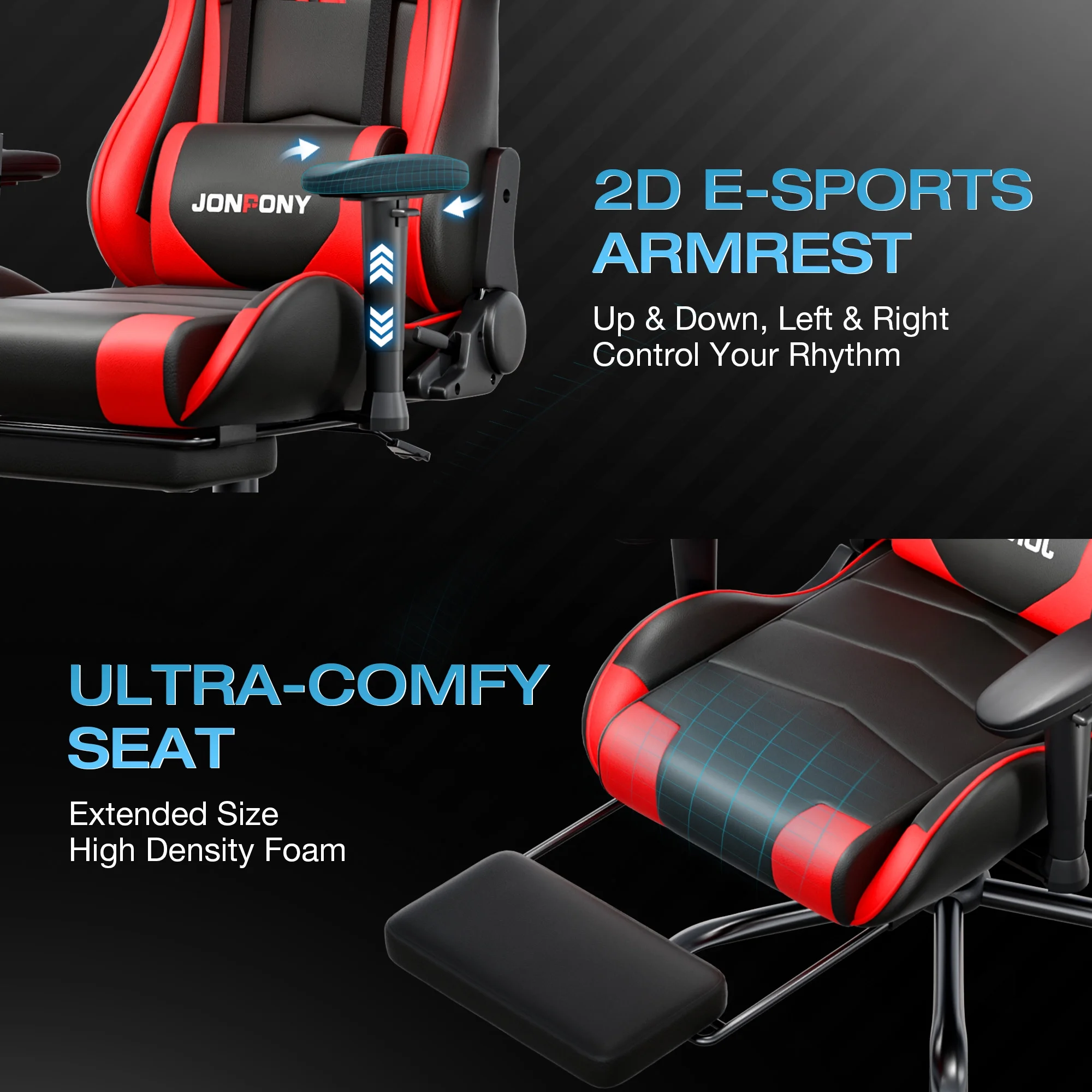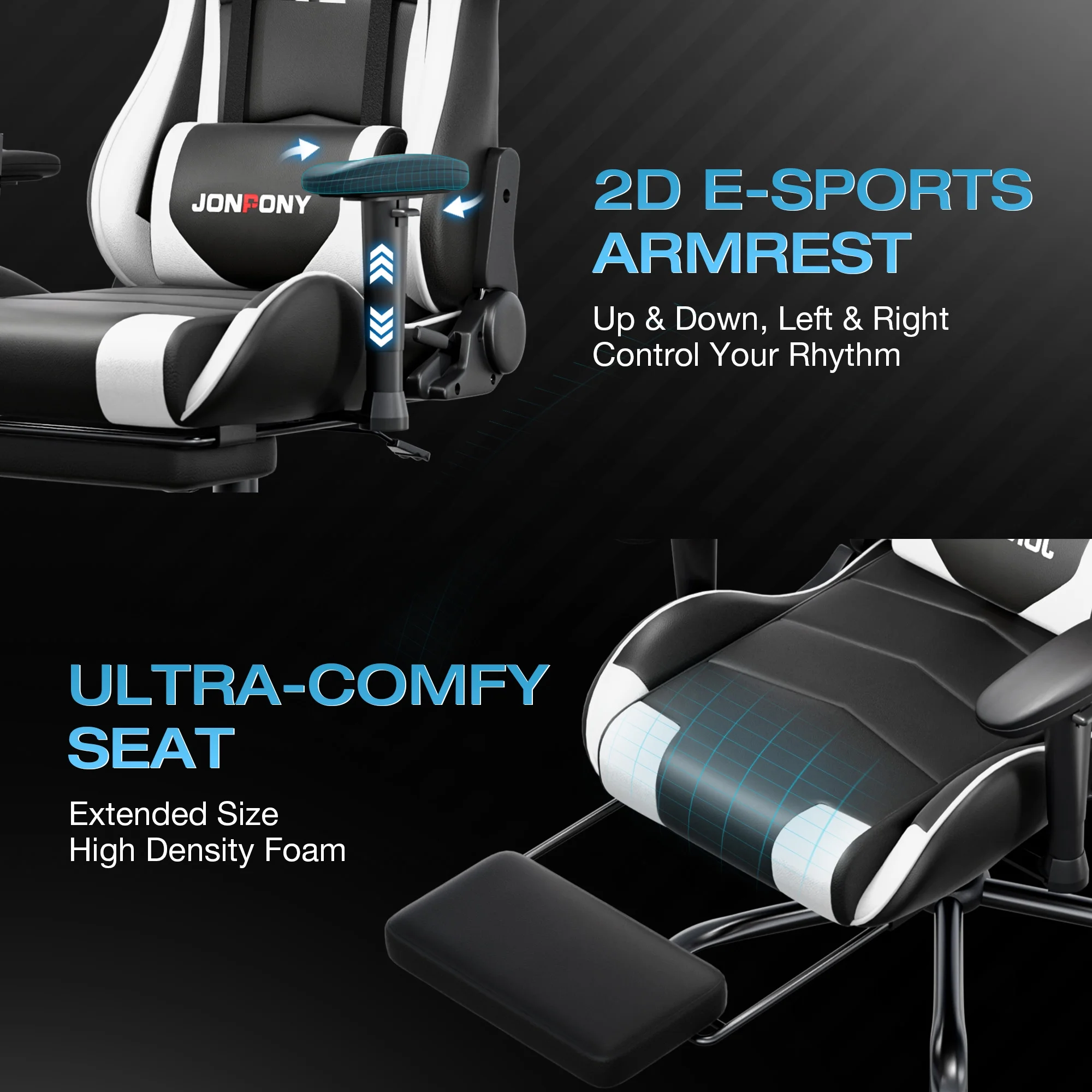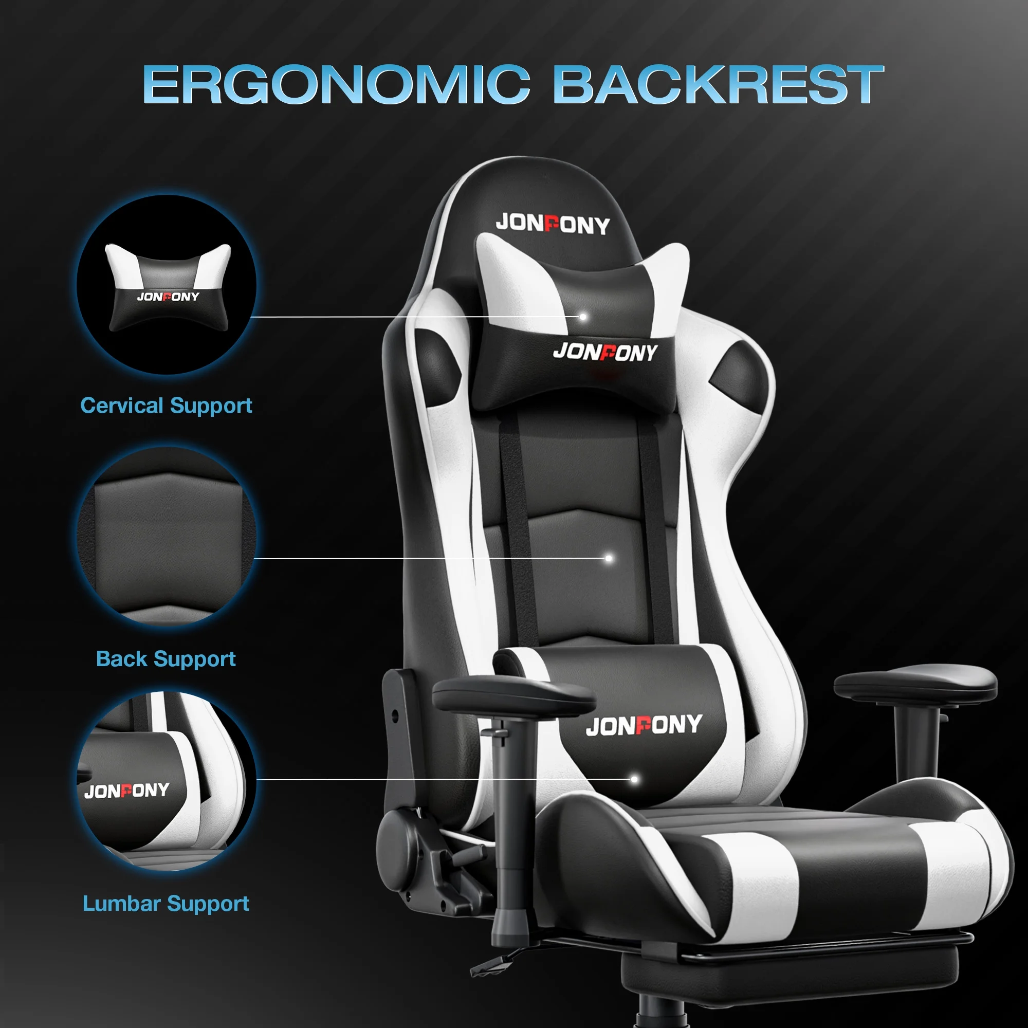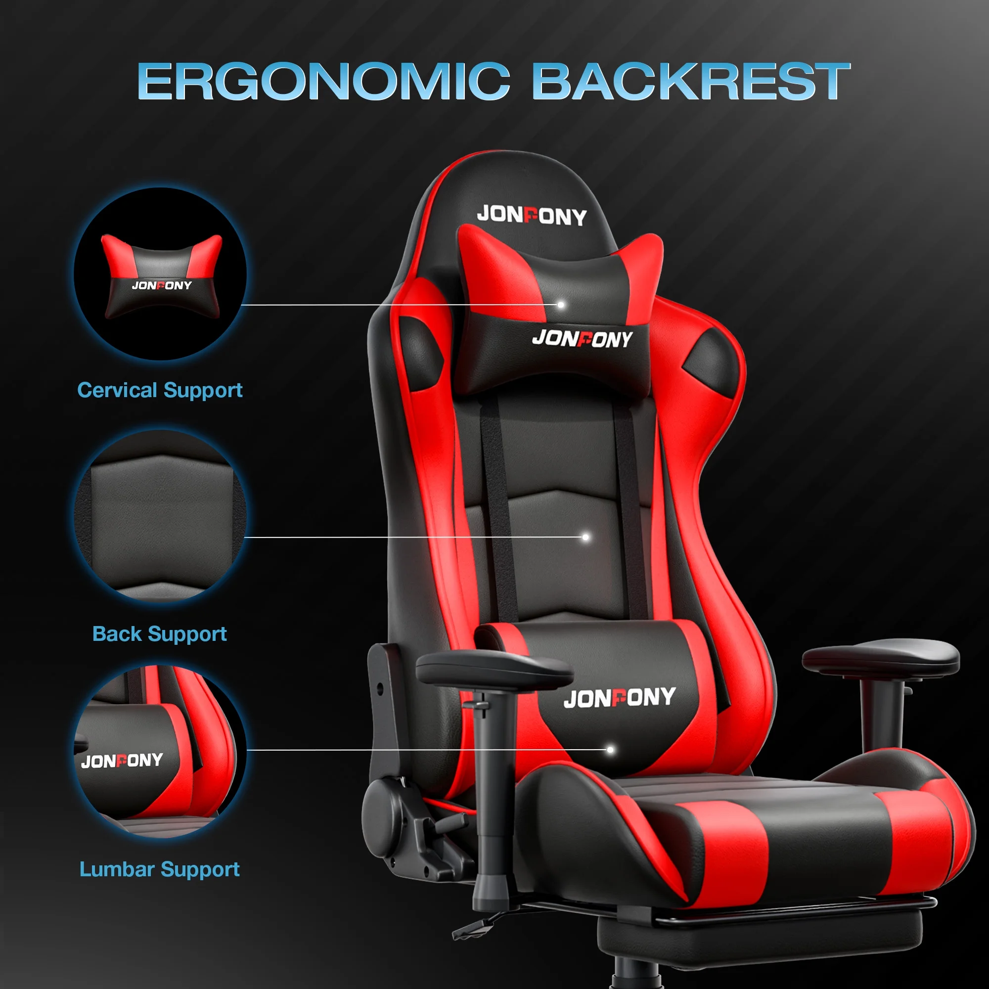 - ��Advanced Spring Cushioning��- The JONPONY gaming chair features advanced spring cushioning that elevates the user experience by balancing hip pressure distribution during seating. It also incorporates high-density foam sponge with exceptional rebound properties, adapting seamlessly to changes in sitting posture. The premium cushion material ensures long-lasting elasticity, transforming your gaming sessions into moments of pure enjoyment and relaxation.