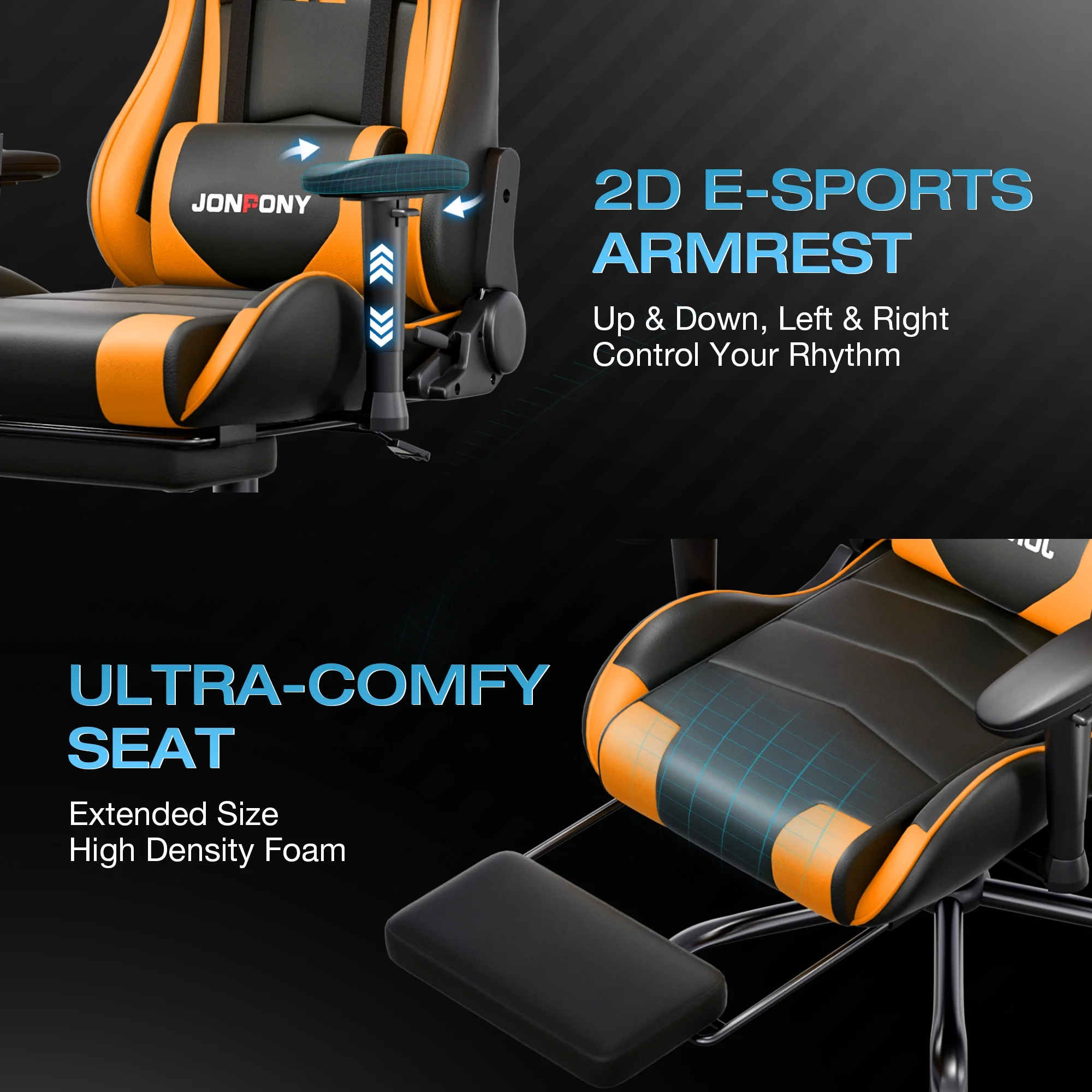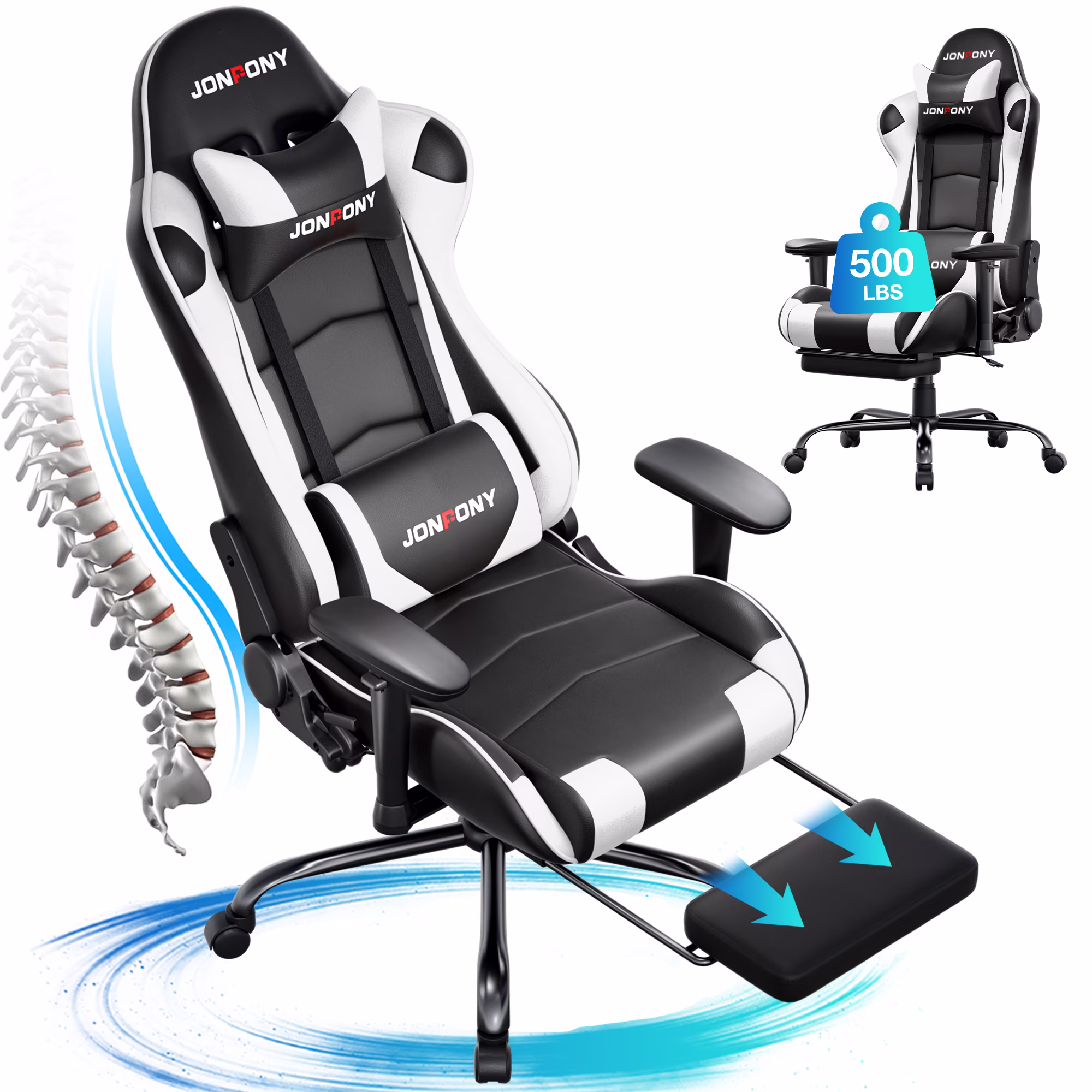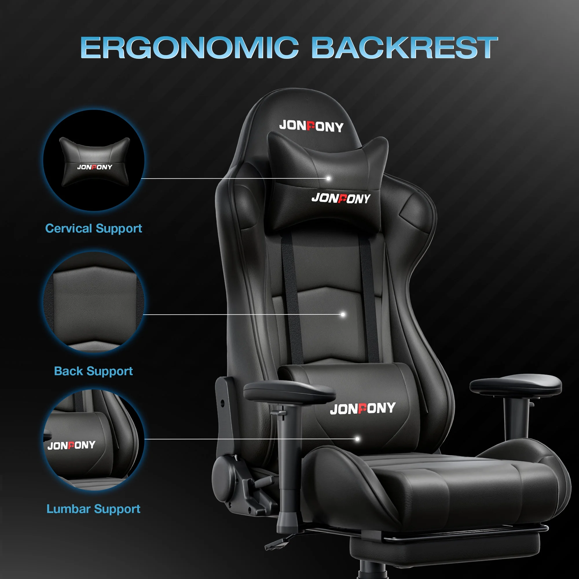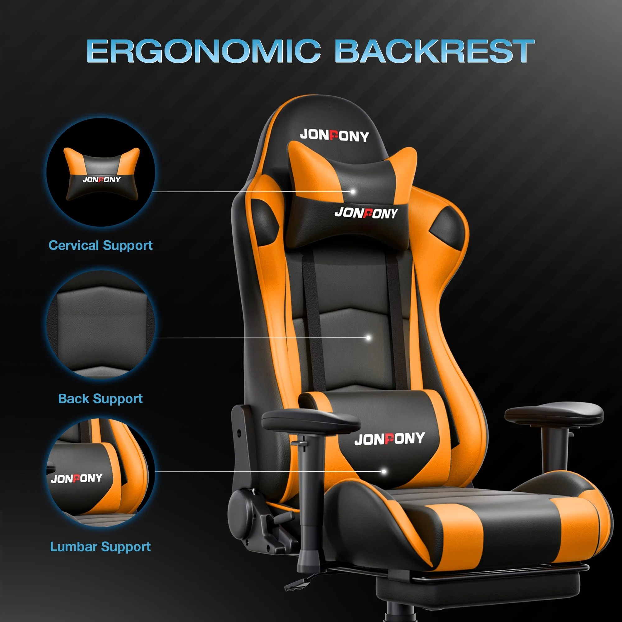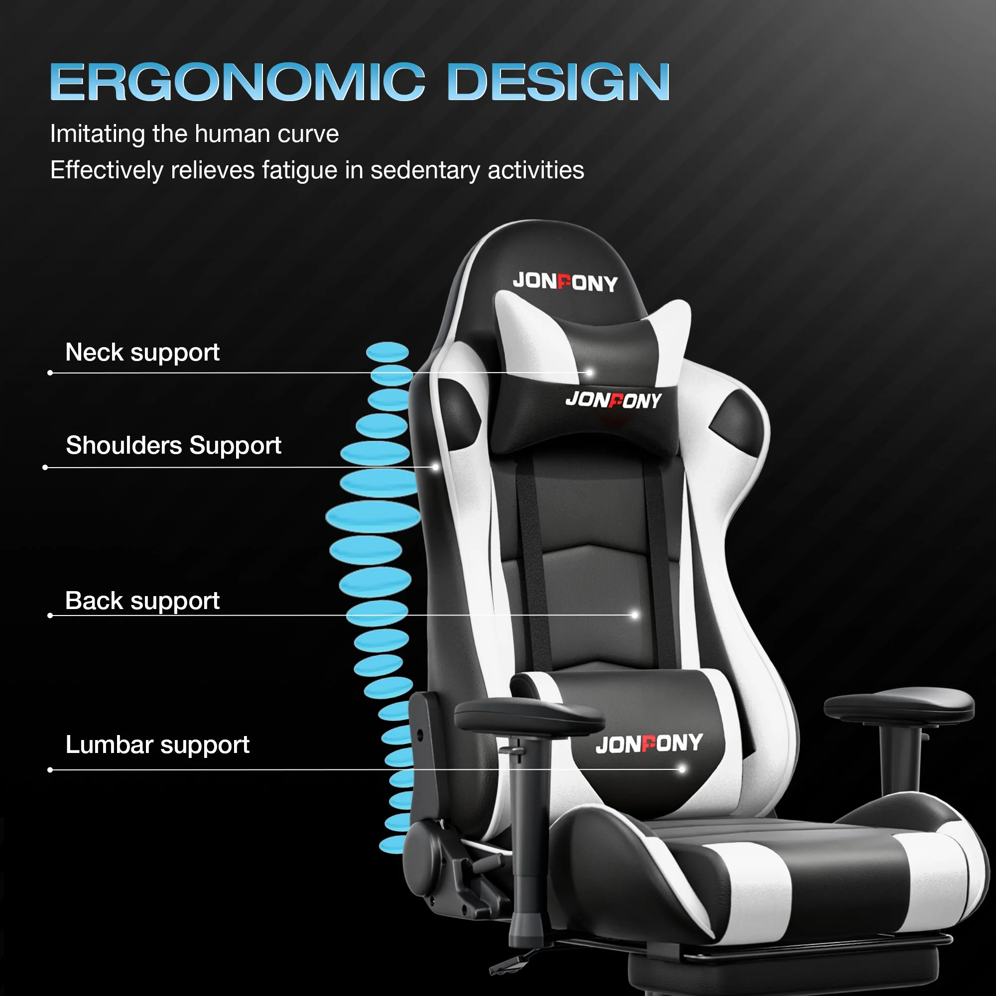 - ��Advanced Spring Cushioning��- The JONPONY gaming chair features advanced spring cushioning that elevates the user experience by balancing hip pressure distribution during seating. It also incorporates high-density foam sponge with exceptional rebound properties, adapting seamlessly to changes in sitting posture. The premium cushion material ensures long-lasting elasticity, transforming your gaming sessions into moments of pure enjoyment and relaxation.