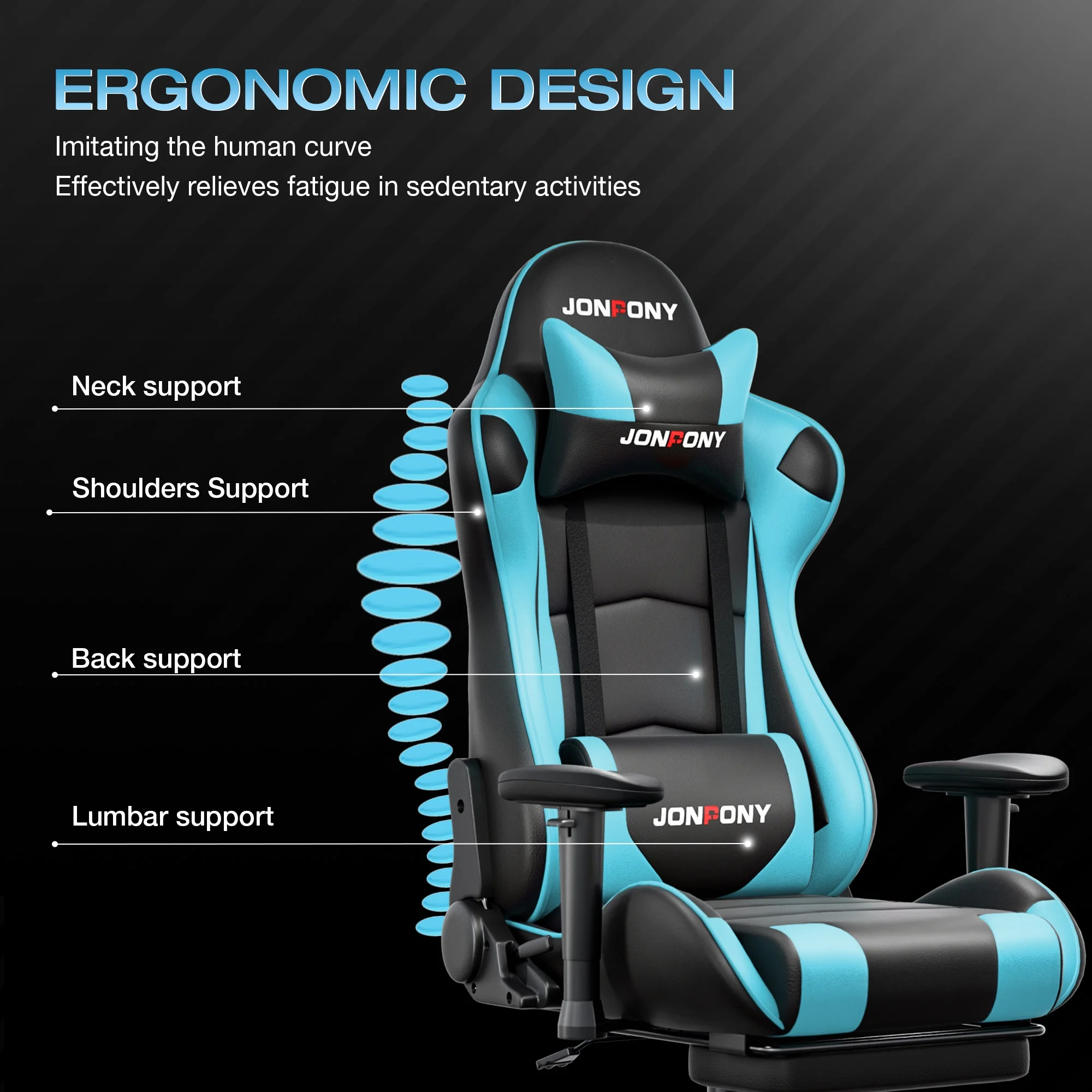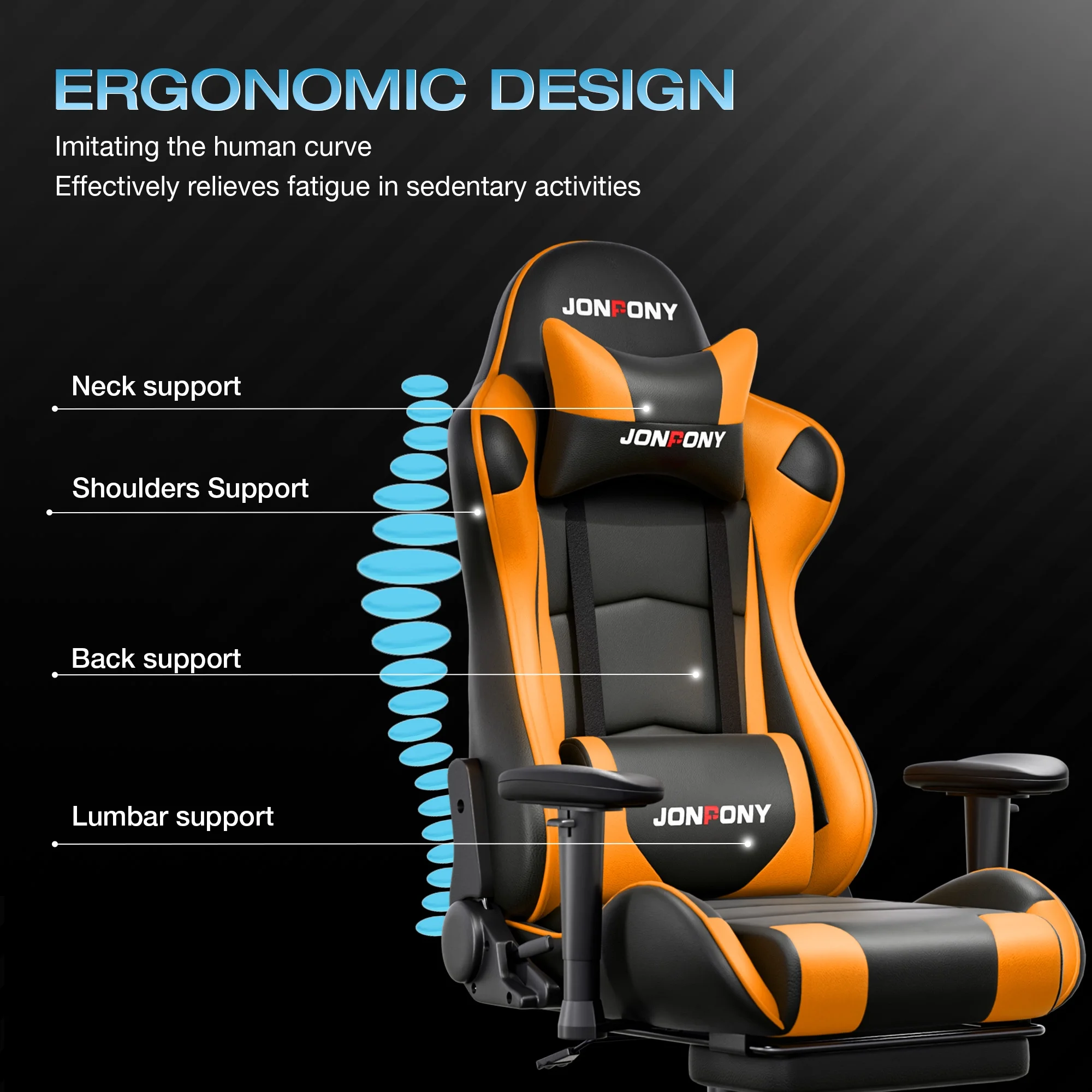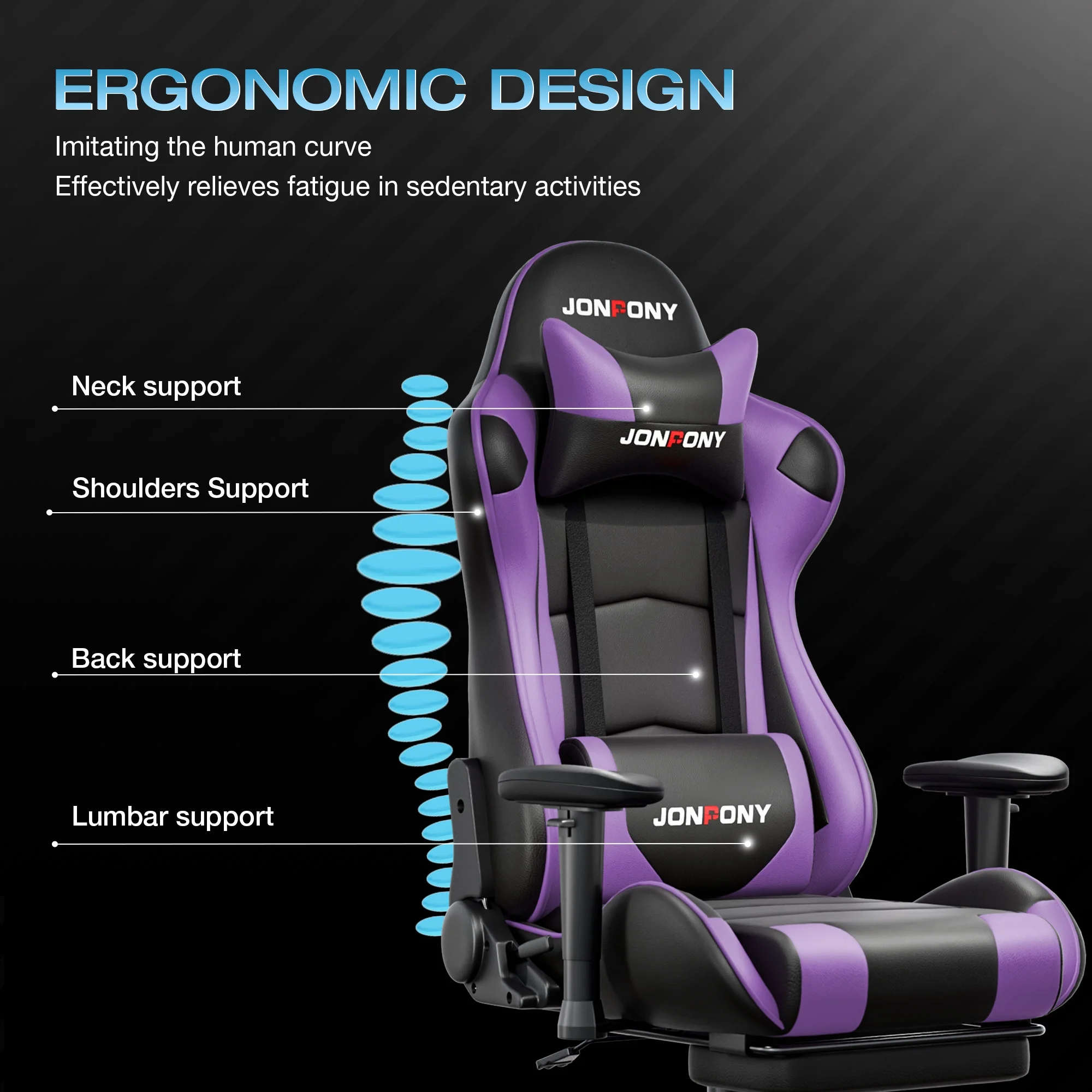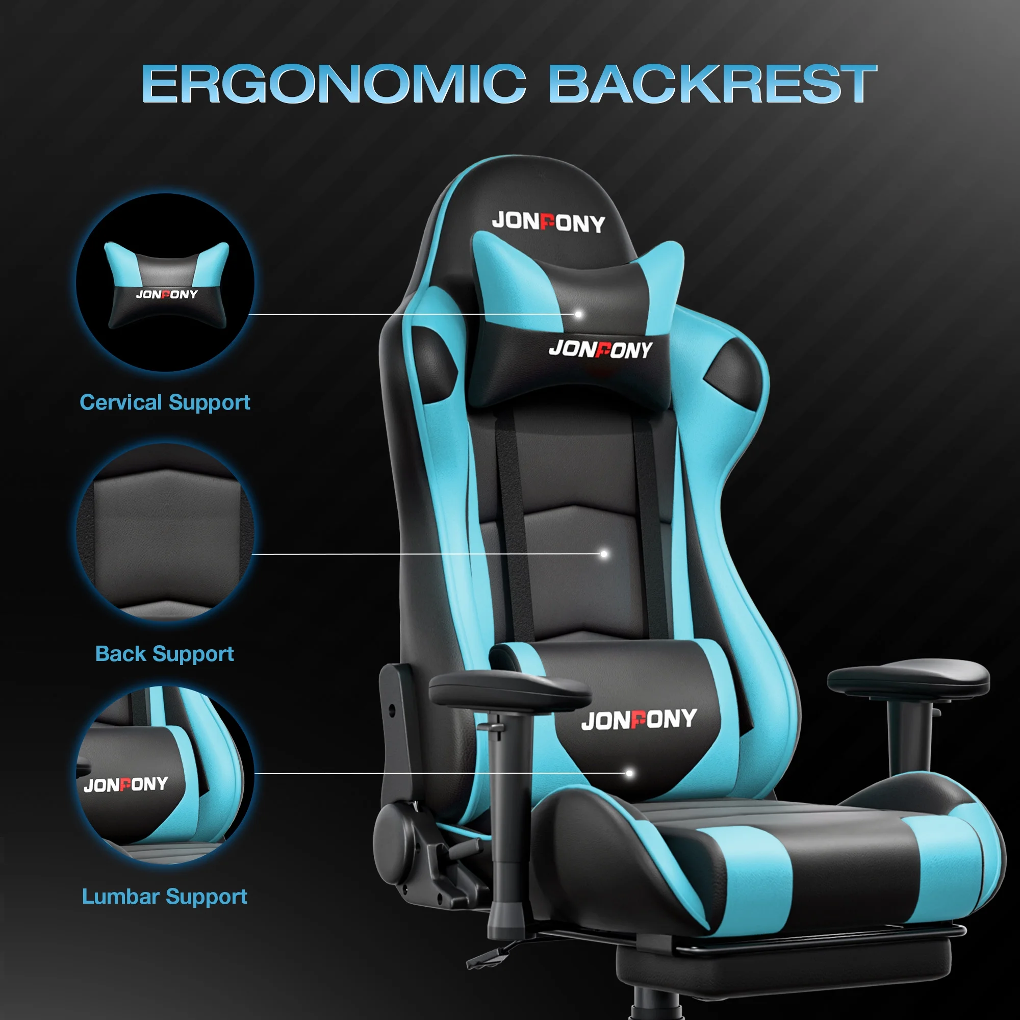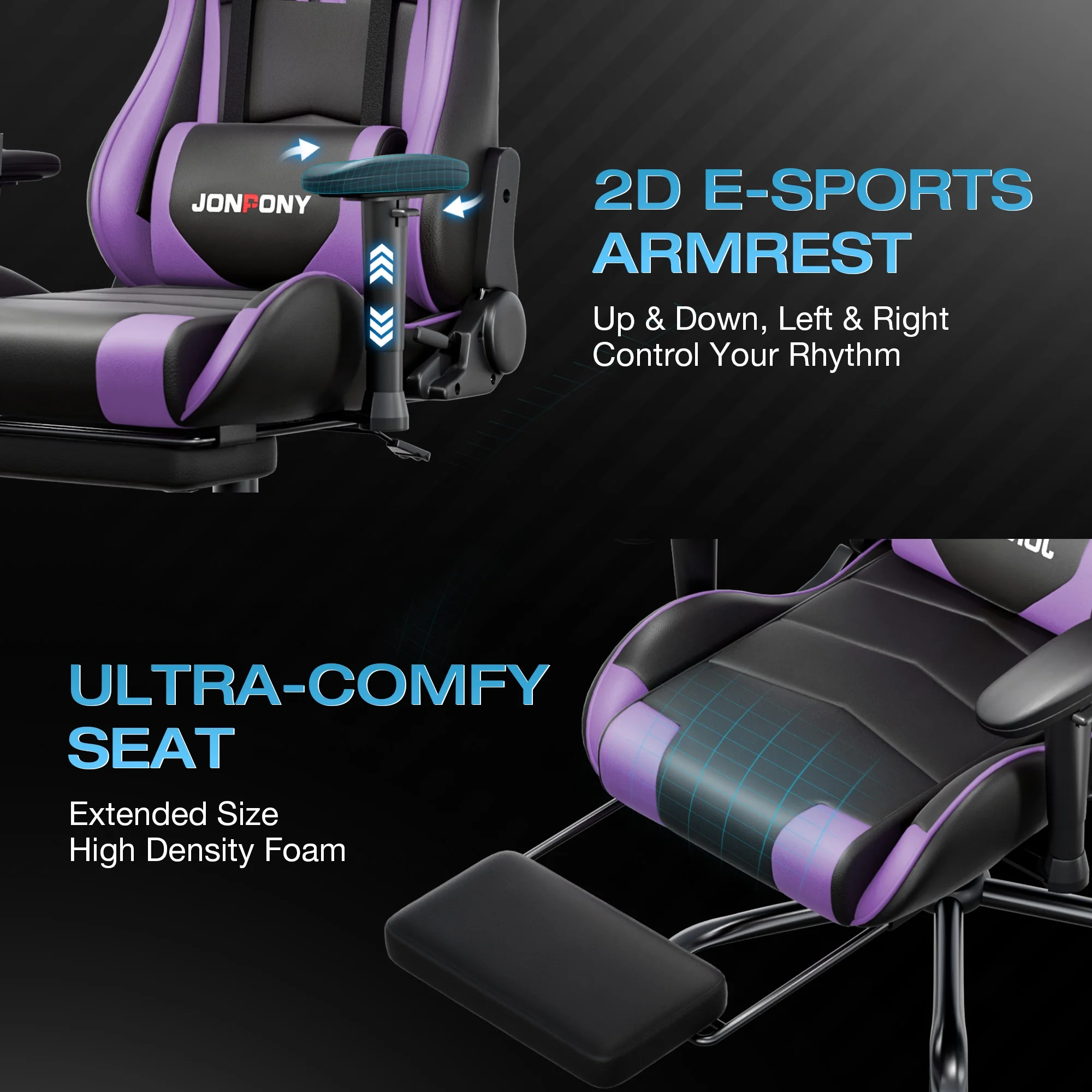 - ��Advanced Spring Cushioning��- The JONPONY gaming chair features advanced spring cushioning that elevates the user experience by balancing hip pressure distribution during seating. It also incorporates high-density foam sponge with exceptional rebound properties, adapting seamlessly to changes in sitting posture. The premium cushion material ensures long-lasting elasticity, transforming your gaming sessions into moments of pure enjoyment and relaxation.