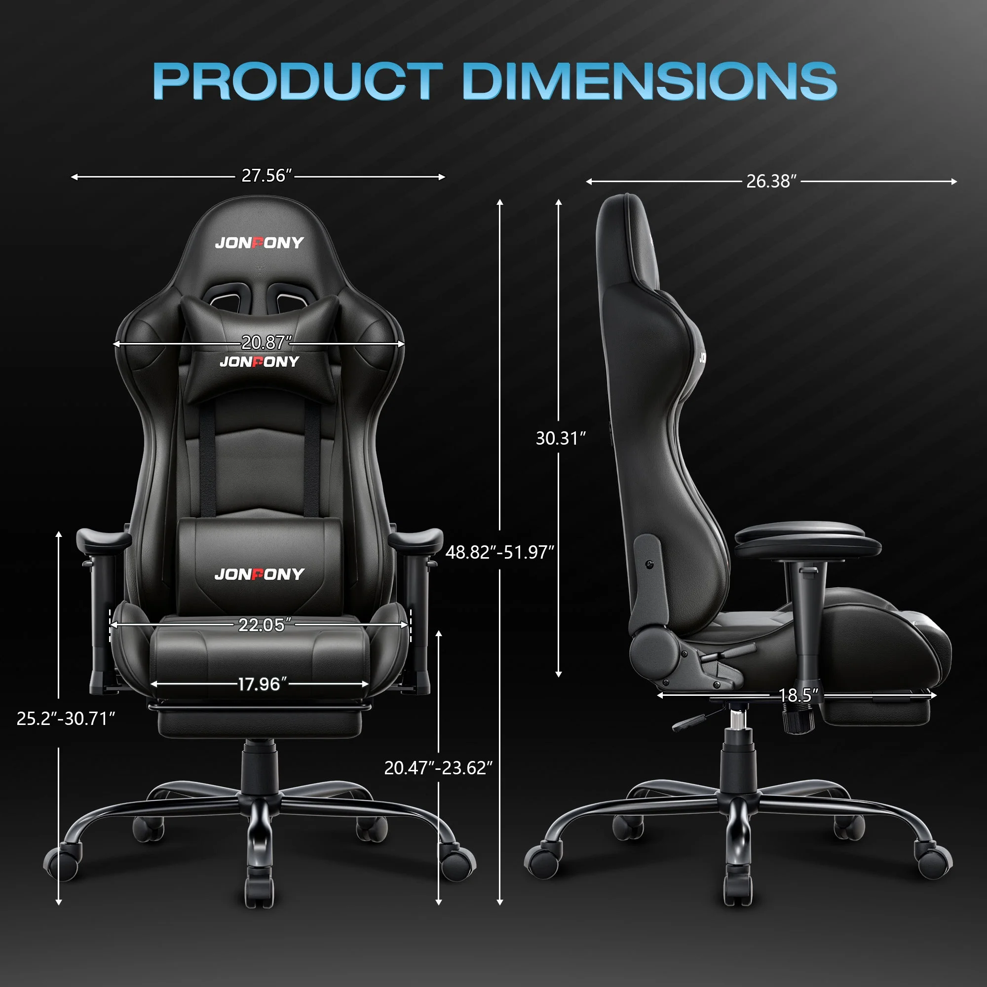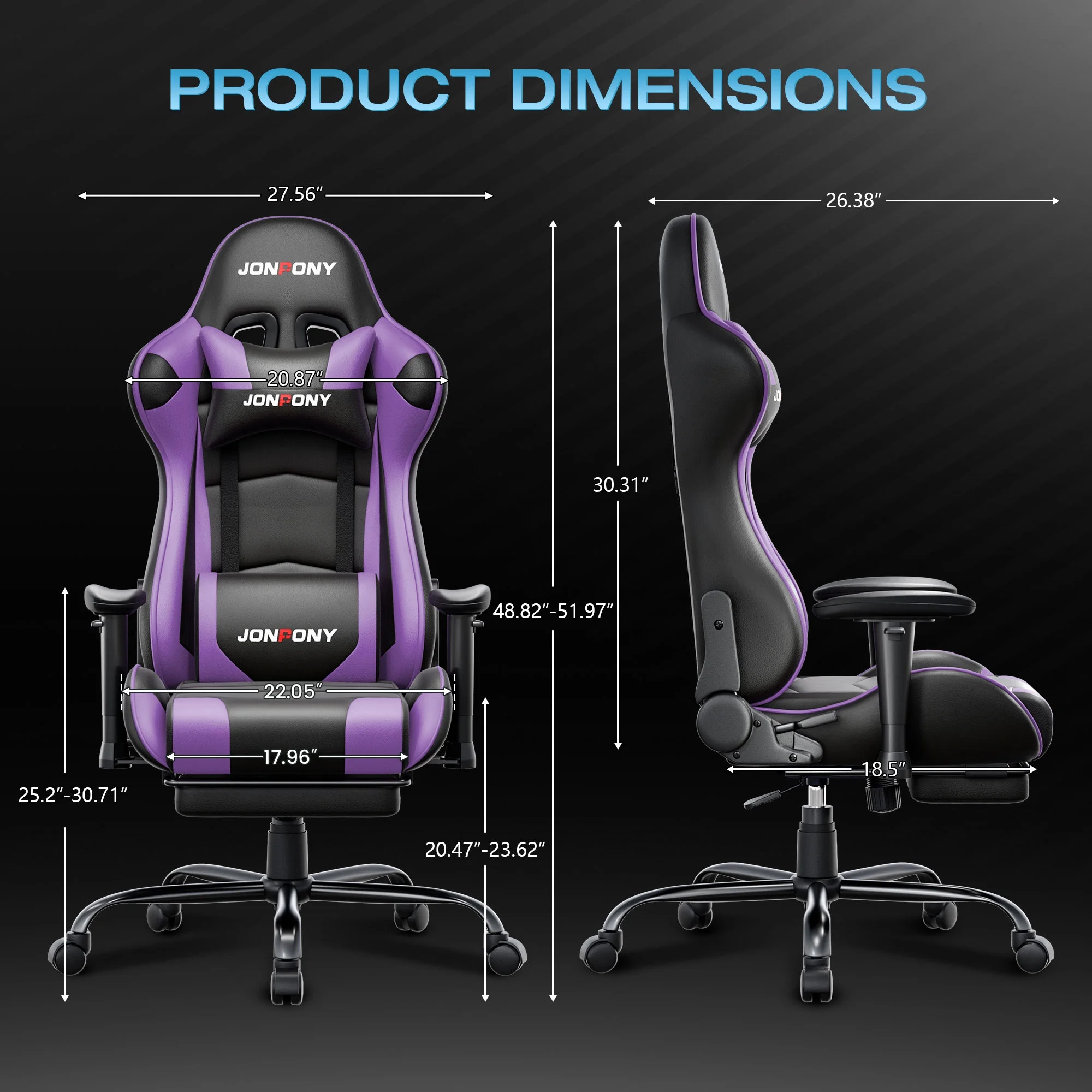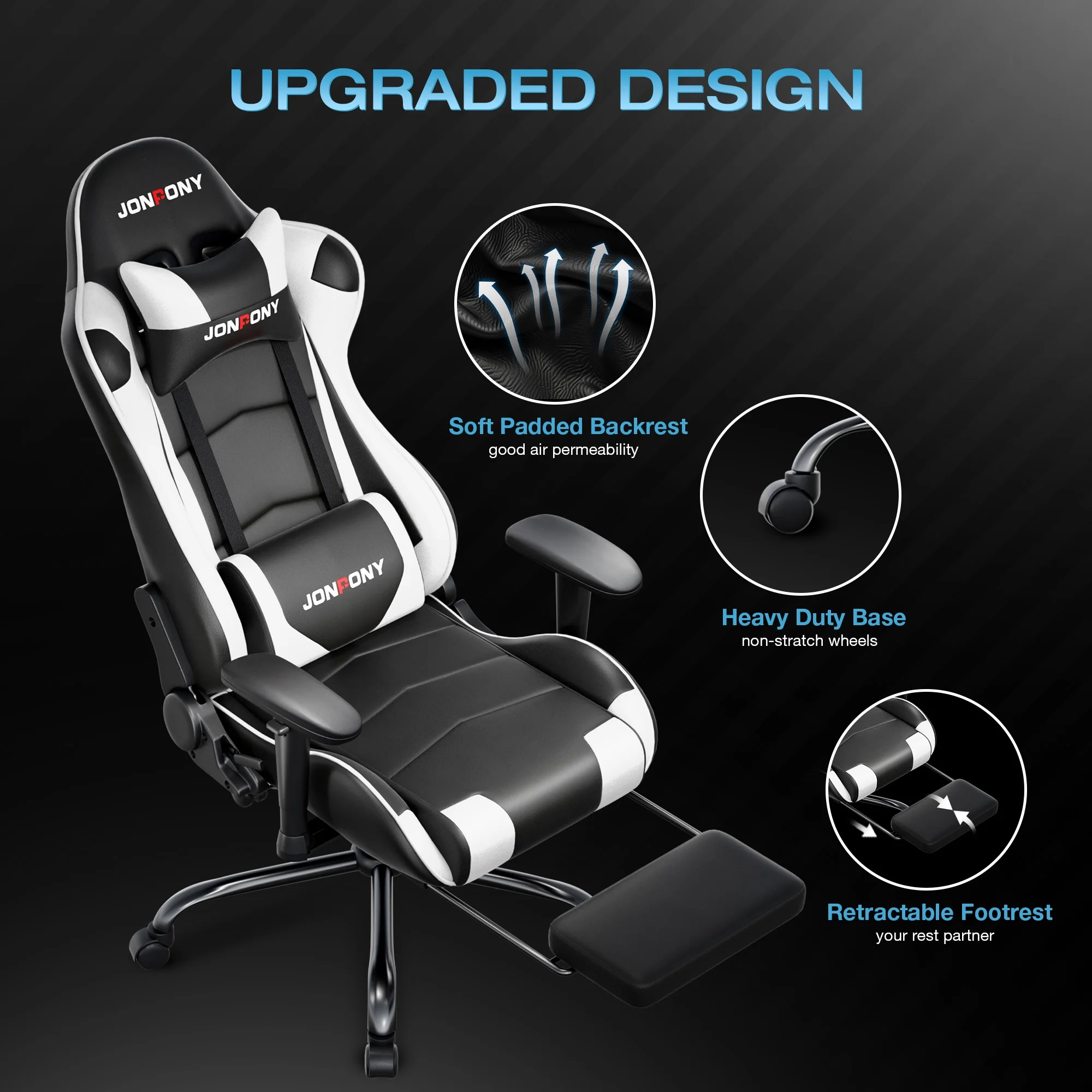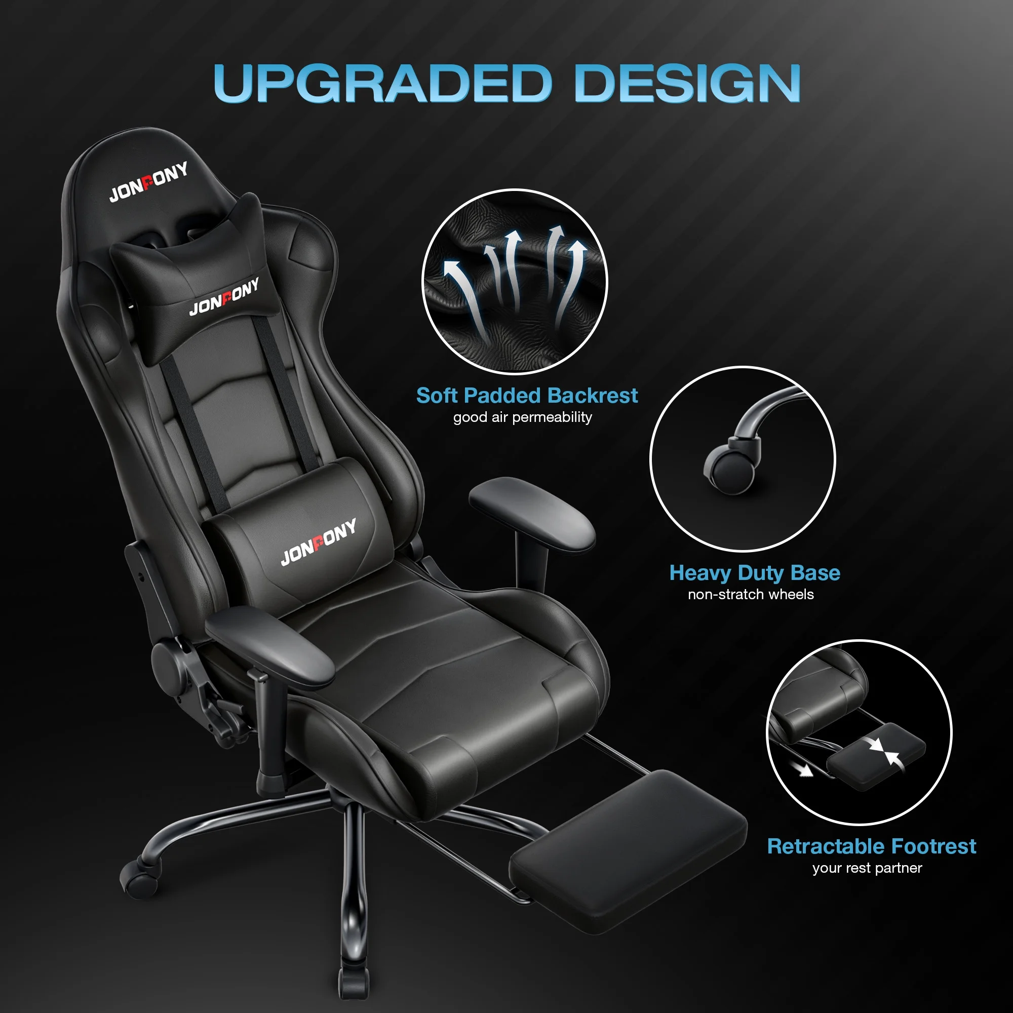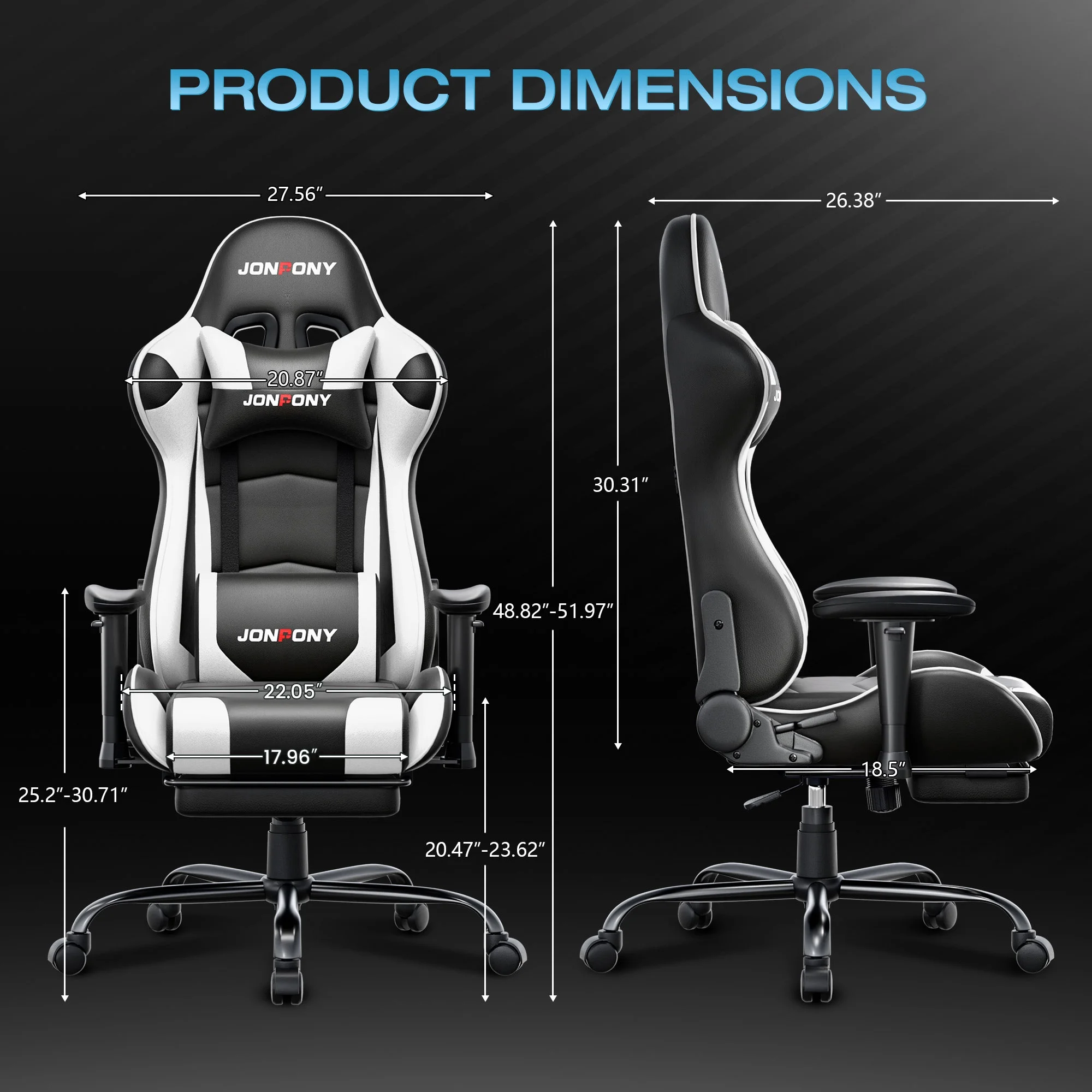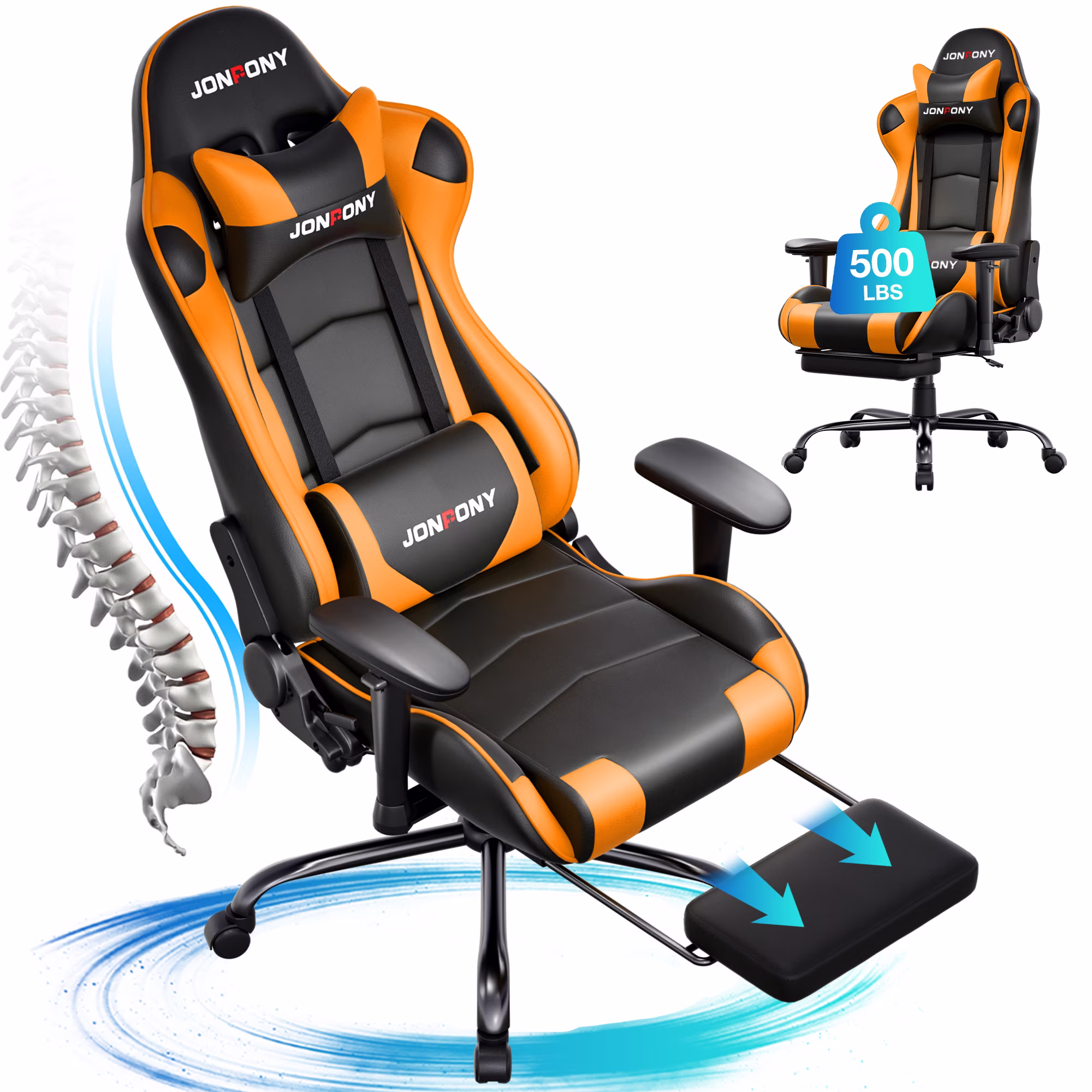 - ��Advanced Spring Cushioning��- The JONPONY gaming chair features advanced spring cushioning that elevates the user experience by balancing hip pressure distribution during seating. It also incorporates high-density foam sponge with exceptional rebound properties, adapting seamlessly to changes in sitting posture. The premium cushion material ensures long-lasting elasticity, transforming your gaming sessions into moments of pure enjoyment and relaxation.
