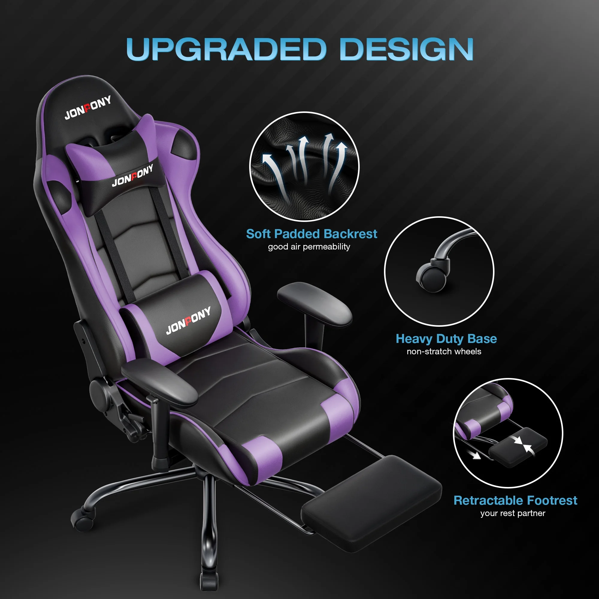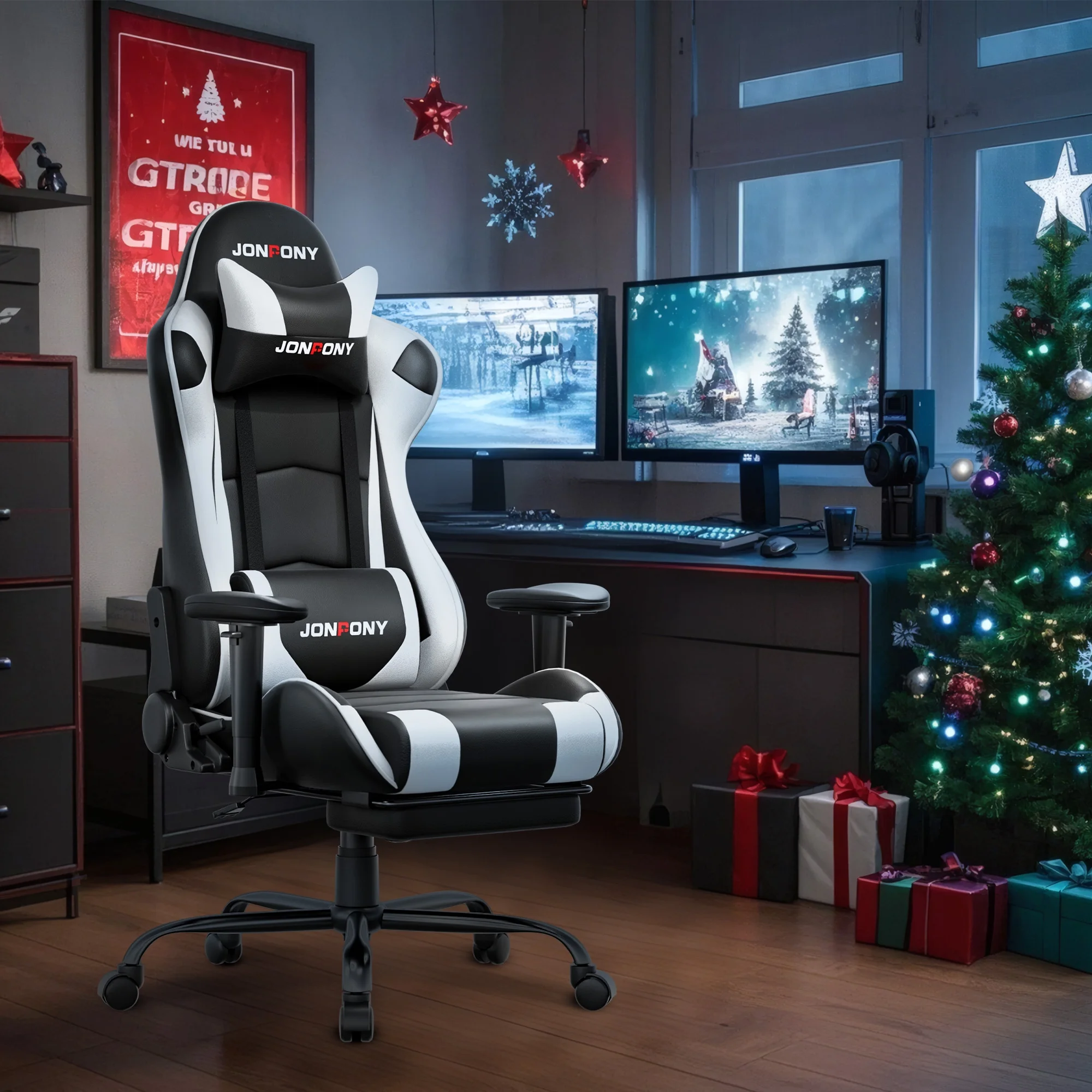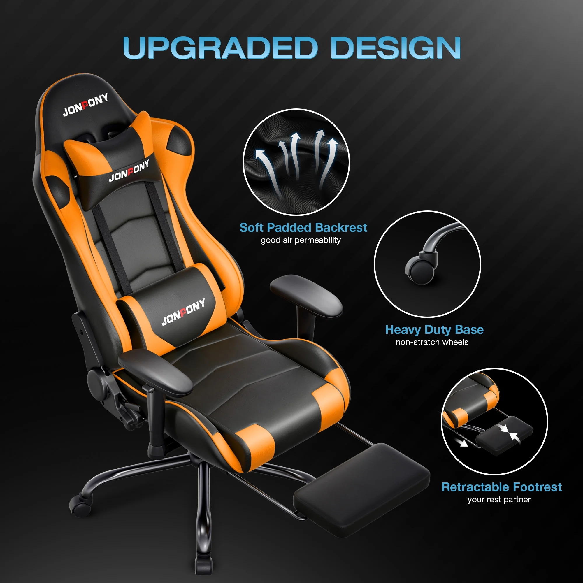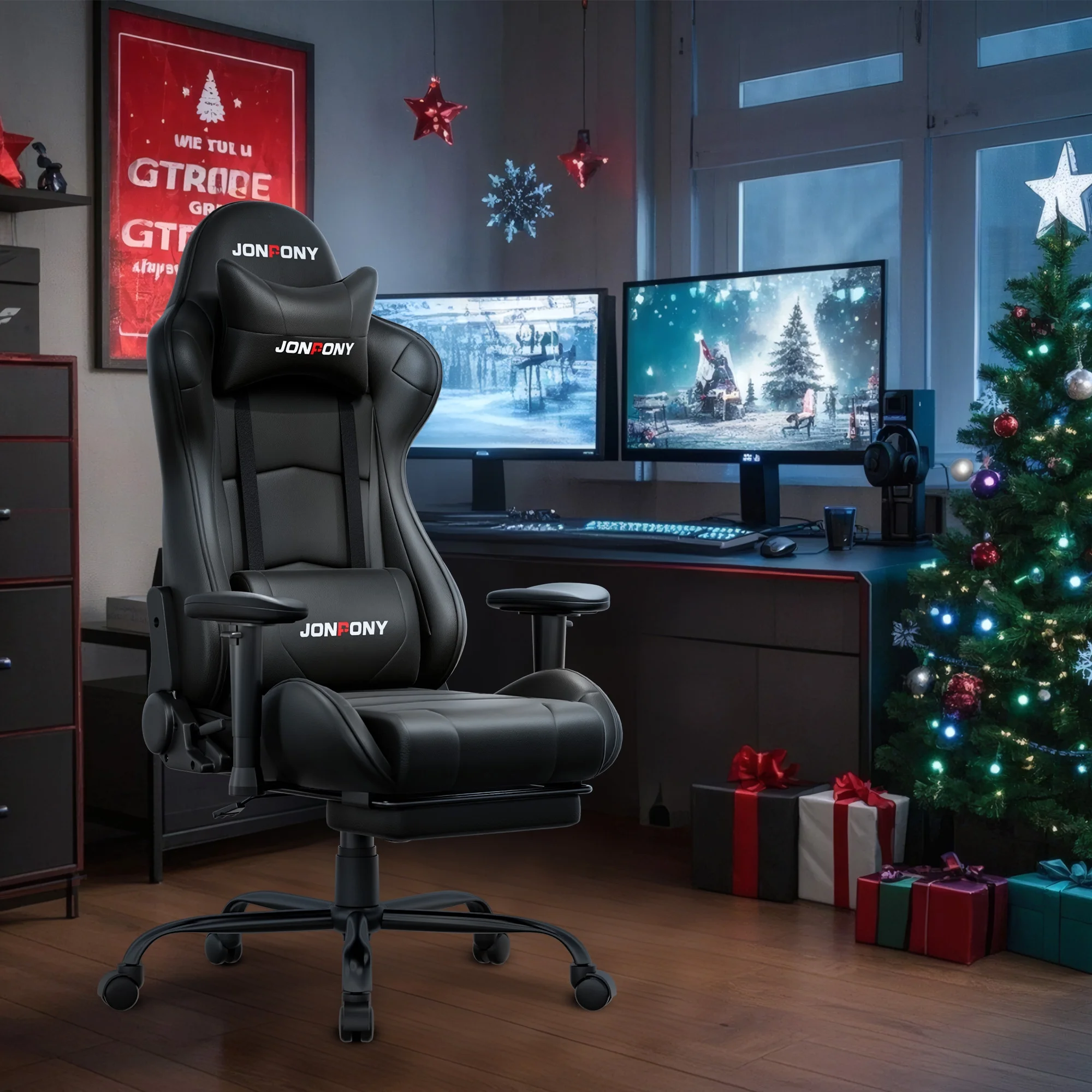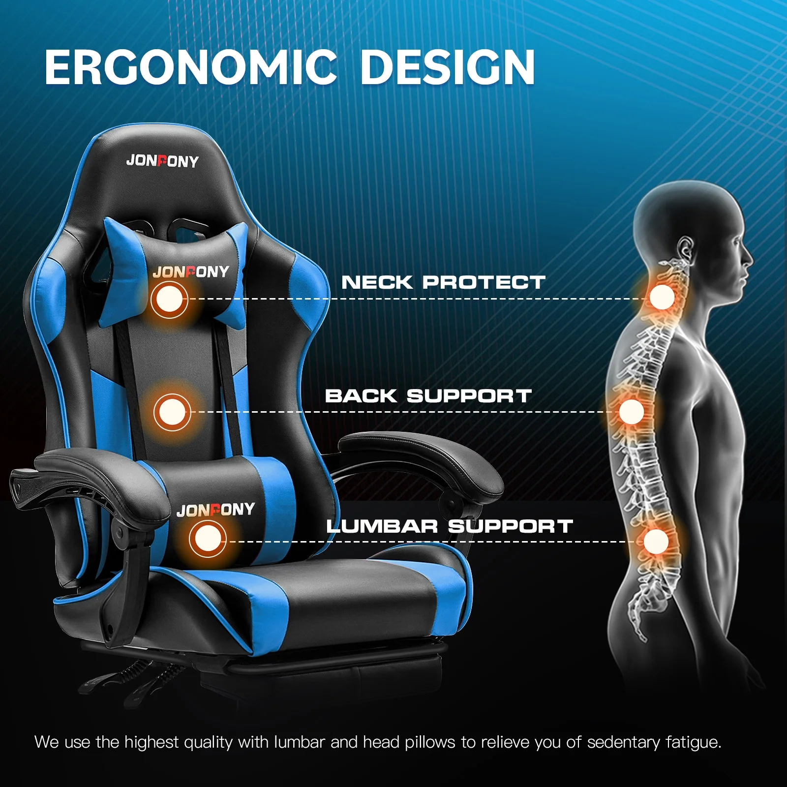 - ��Advanced Spring Cushioning��- The JONPONY gaming chair features advanced spring cushioning that elevates the user experience by balancing hip pressure distribution during seating. It also incorporates high-density foam sponge with exceptional rebound properties, adapting seamlessly to changes in sitting posture. The premium cushion material ensures long-lasting elasticity, transforming your gaming sessions into moments of pure enjoyment and relaxation.